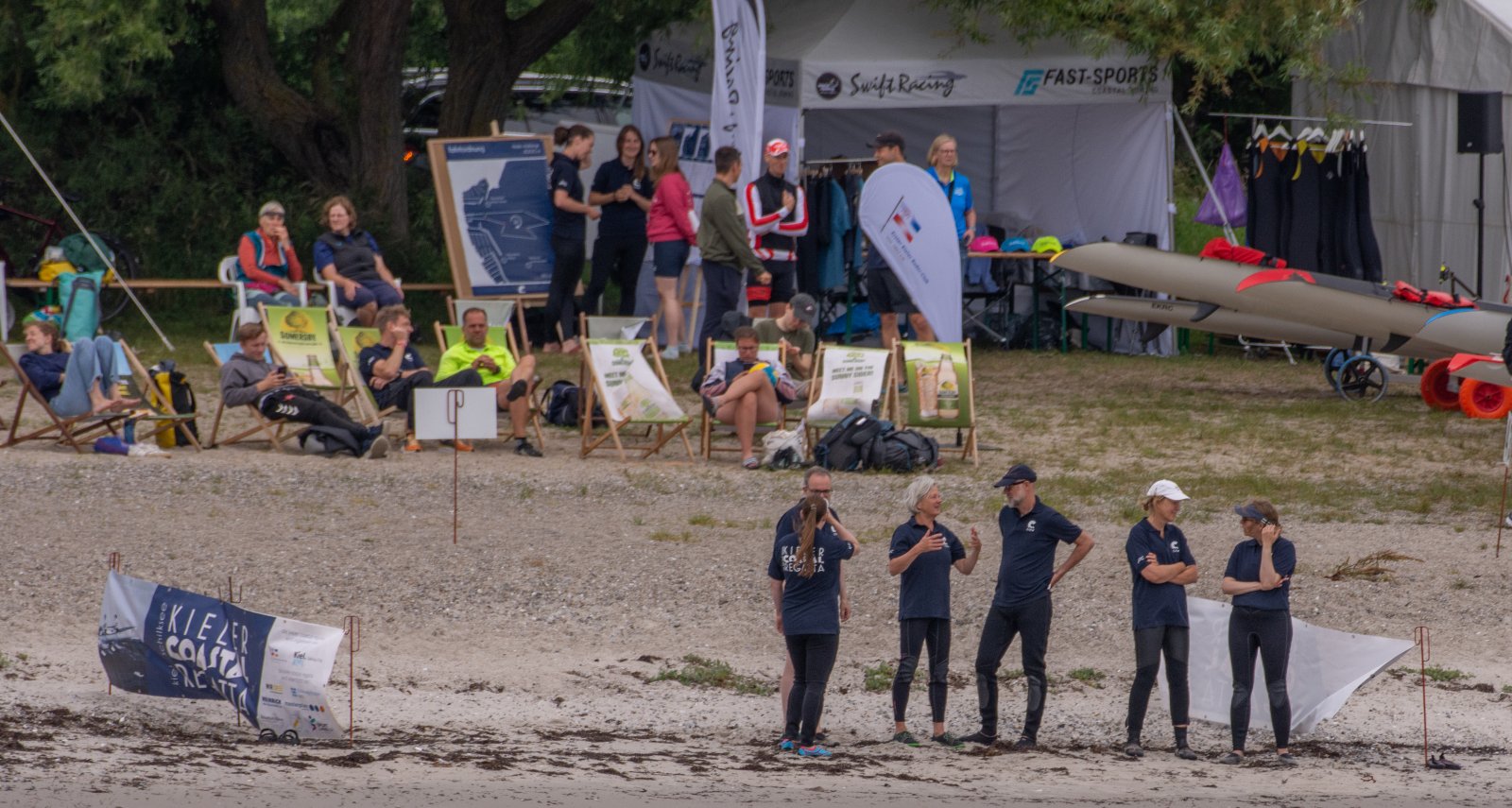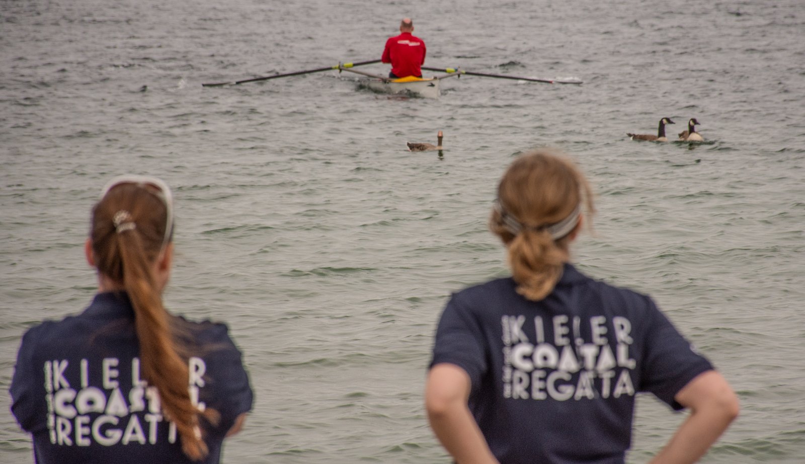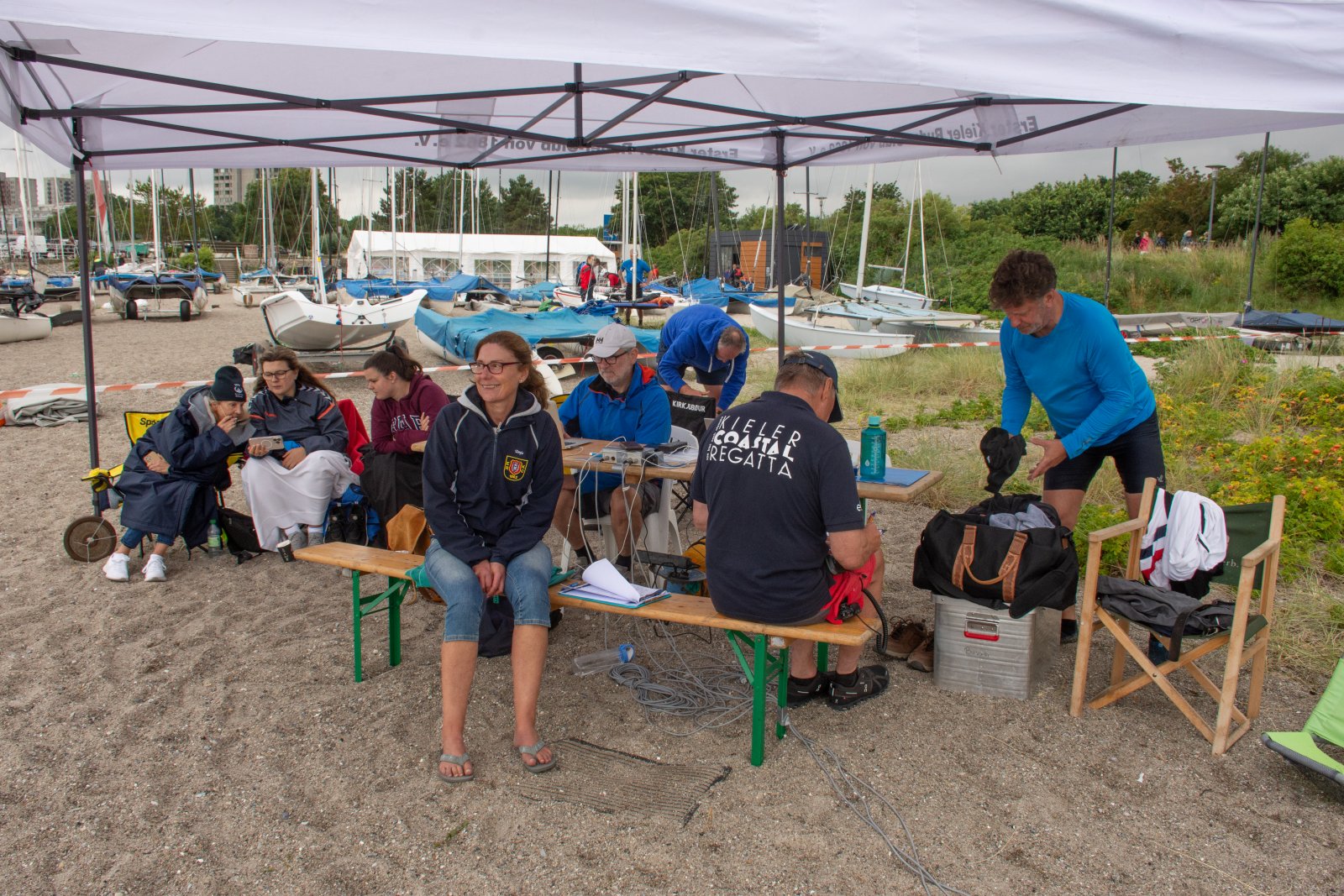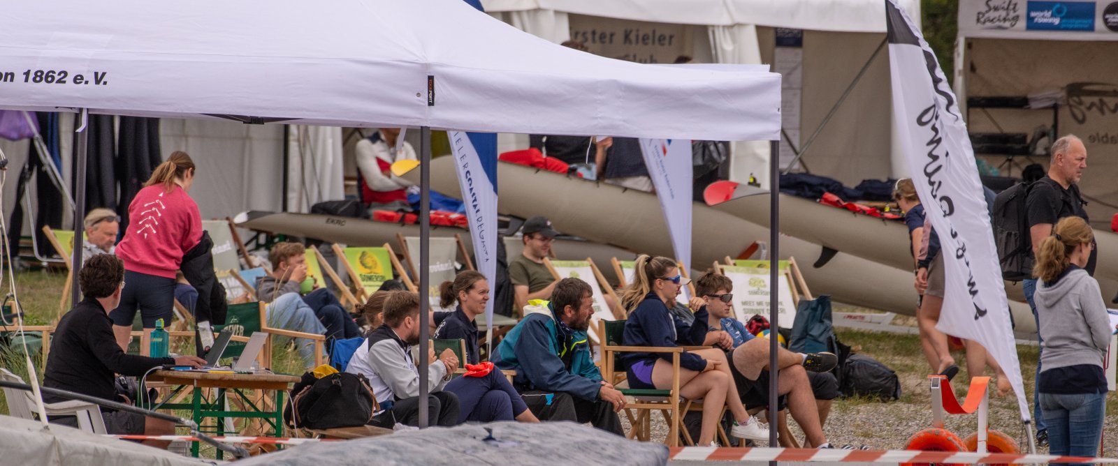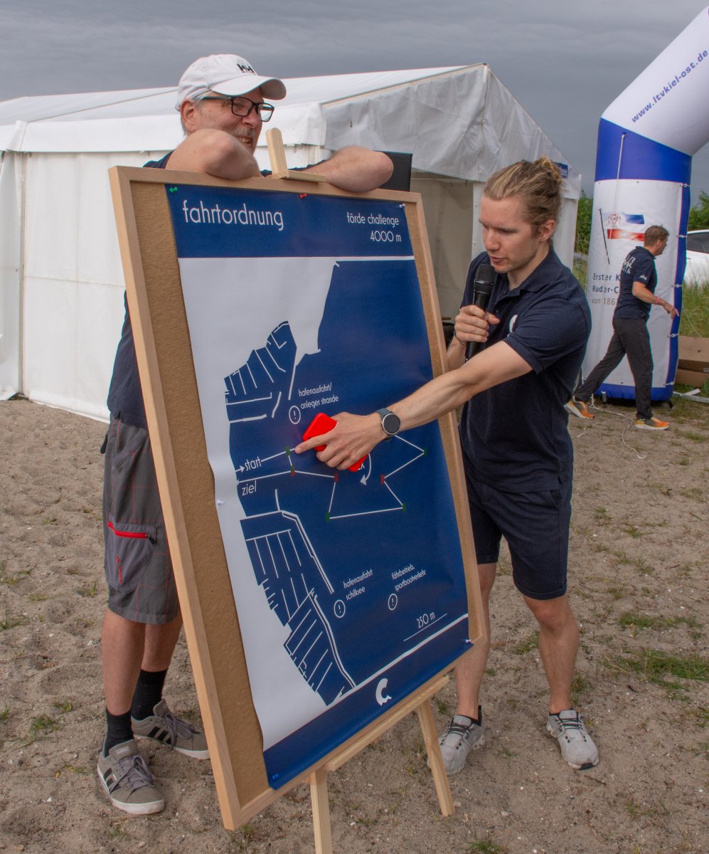 Die ungewöhnlichen Aktivitäten in der Strander Bucht bleiben bei den Sonntagsspaziergängern auf der Promenade nicht unbemerkt. Immer wieder beobachten Neugierige das Treiben und lassen sich das Geschehen erklären. Doch wir wollen ja größeres Publikum – und dies erreicht man heute natürlich über das Internet. Ein Livestream, professionell aufbereitet mit verschiedenen Kamerapositionen und einer Drohne liefern packende Livebilder vom Geschehen auf der Förde in das Teilnehmerzelt sowie in die ganze Welt. Doch ein Livestream ohne Worte ist wie Sahne ohne Torte. Also kommentiert das Kieler Ruderurgestein Kim Dibbern wieder das Geschehen, dieses Mal begleitet von Elisa Trog und Anna Fischbach, die mit ihrer langjährigen, internationalen Coastalwettkampferfahrung die Analysen fundiert ergänzen. Ihre Liveinterviews mit den Aktiven bescheren uns darüber hinaus weitere Stimmungsbilder von der Regattabahn.