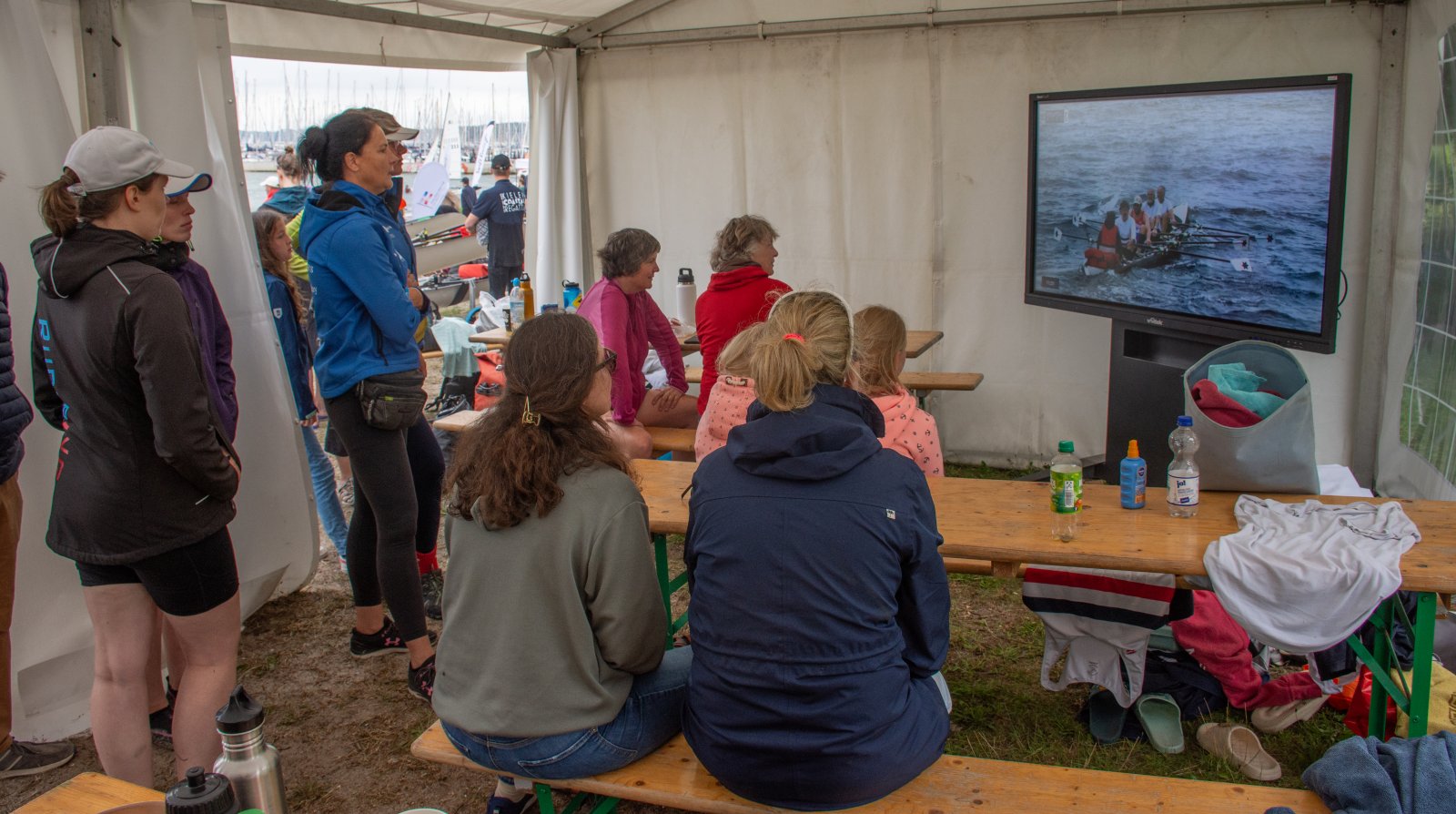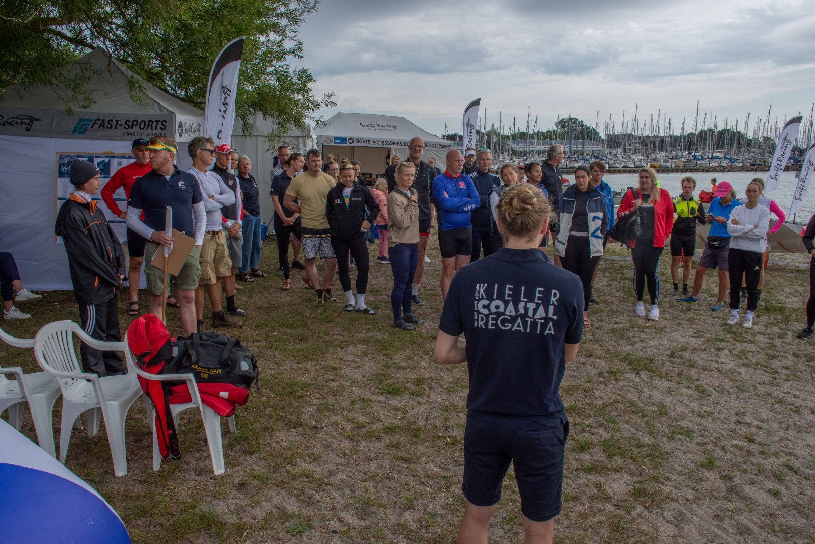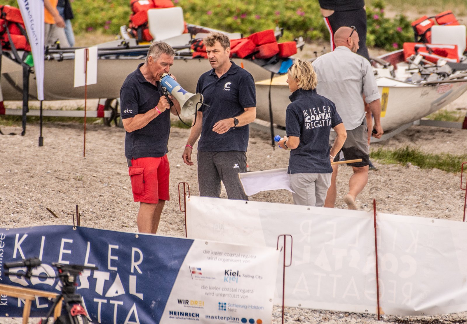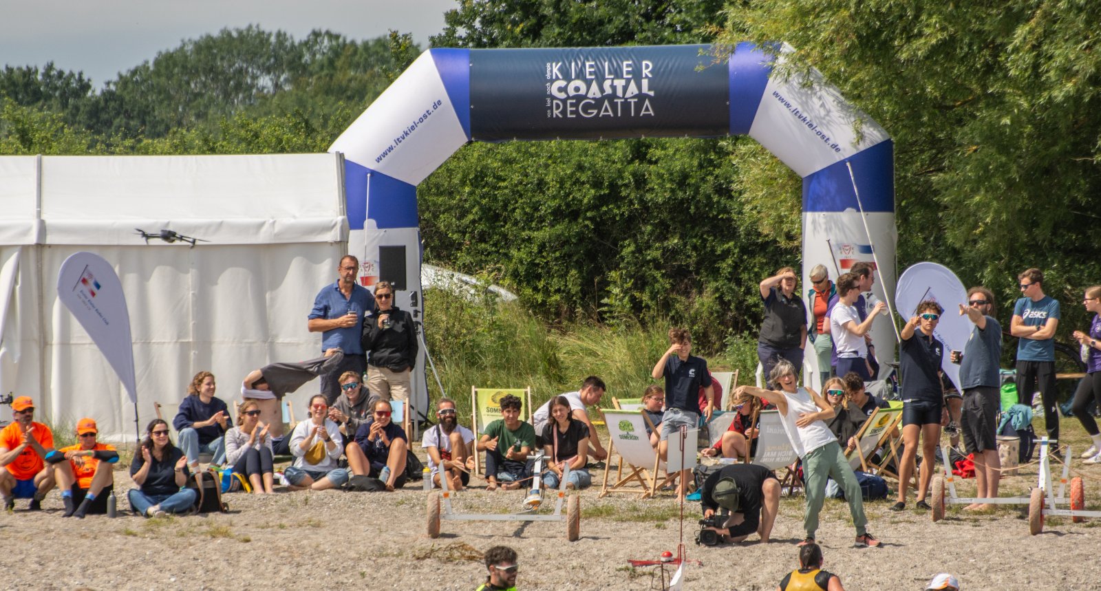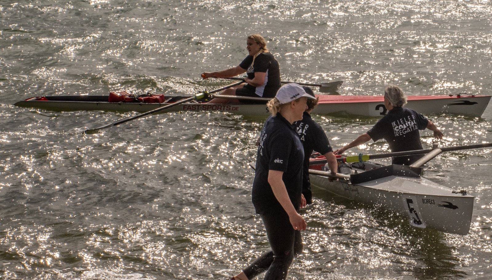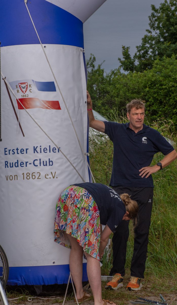 Die ungewöhnlichen Aktivitäten in der Strander Bucht bleiben bei den Sonntagsspaziergängern auf der Promenade nicht unbemerkt. Immer wieder beobachten Neugierige das Treiben und lassen sich das Geschehen erklären. Doch wir wollen ja größeres Publikum – und dies erreicht man heute natürlich über das Internet. Ein Livestream, professionell aufbereitet mit verschiedenen Kamerapositionen und einer Drohne liefern packende Livebilder vom Geschehen auf der Förde in das Teilnehmerzelt sowie in die ganze Welt. Doch ein Livestream ohne Worte ist wie Sahne ohne Torte. Also kommentiert das Kieler Ruderurgestein Kim Dibbern wieder das Geschehen, dieses Mal begleitet von Elisa Trog und Anna Fischbach, die mit ihrer langjährigen, internationalen Coastalwettkampferfahrung die Analysen fundiert ergänzen. Ihre Liveinterviews mit den Aktiven bescheren uns darüber hinaus weitere Stimmungsbilder von der Regattabahn.