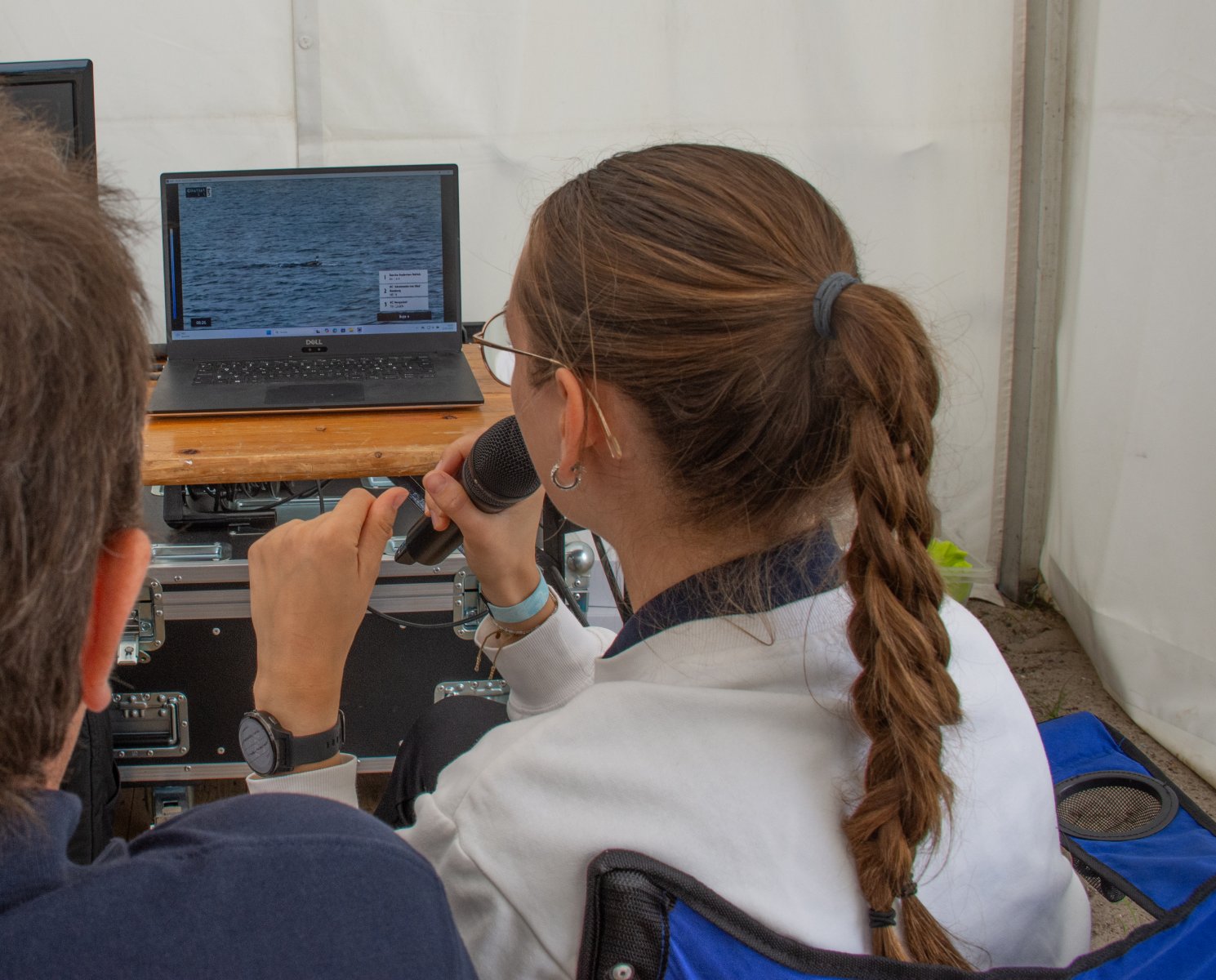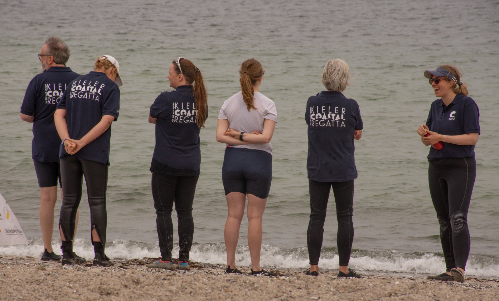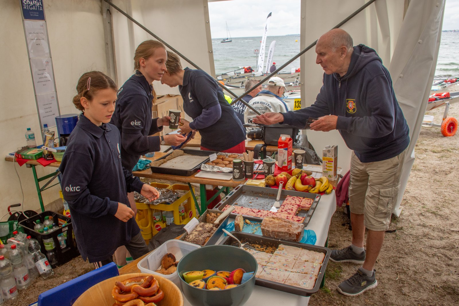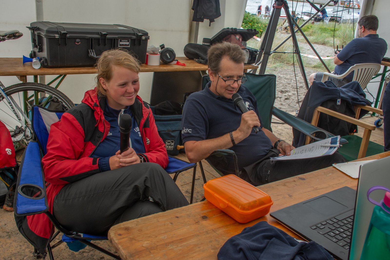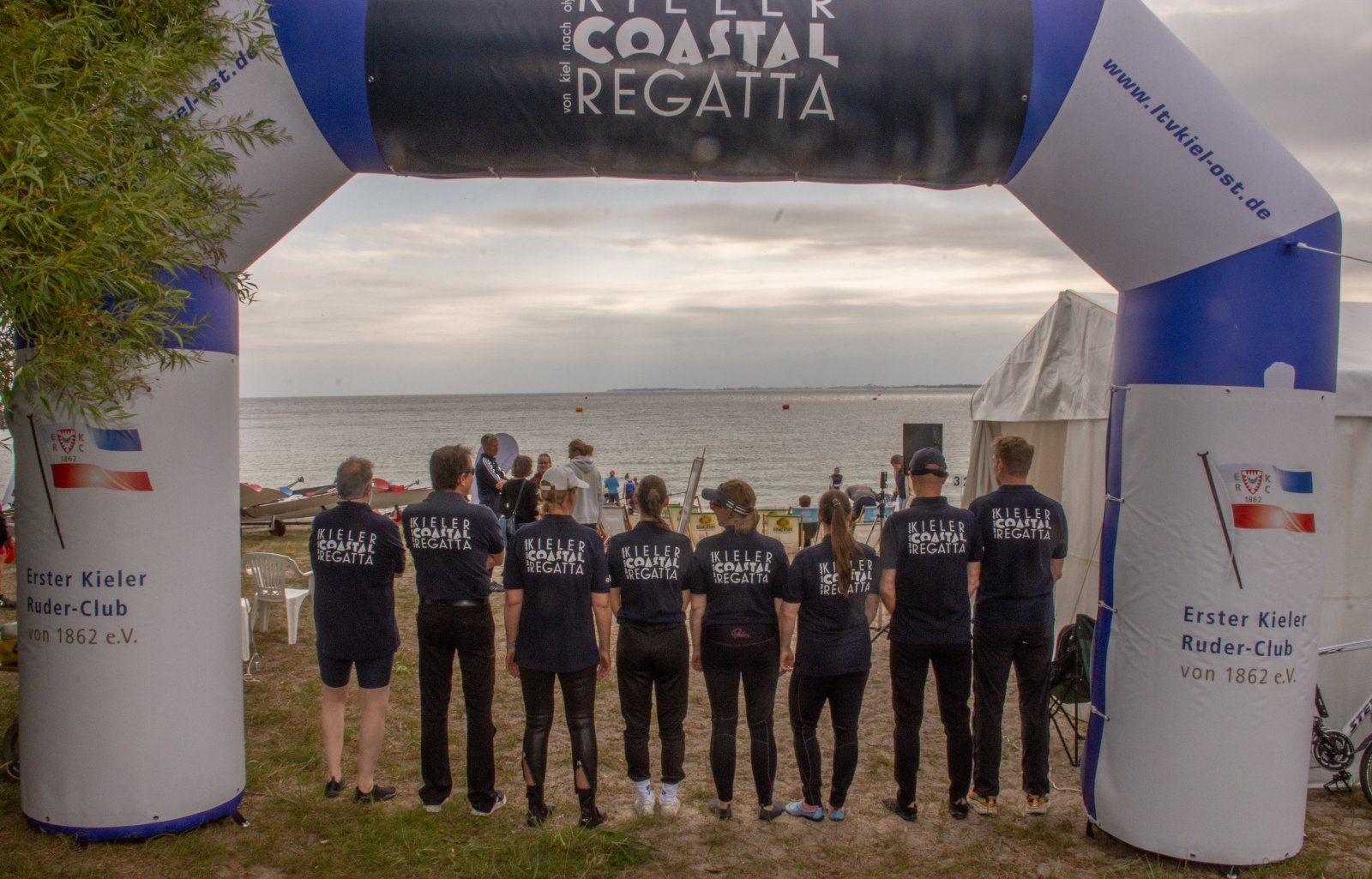 Die ungewöhnlichen Aktivitäten in der Strander Bucht bleiben bei den Sonntagsspaziergängern auf der Promenade nicht unbemerkt. Immer wieder beobachten Neugierige das Treiben und lassen sich das Geschehen erklären. Doch wir wollen ja größeres Publikum – und dies erreicht man heute natürlich über das Internet. Ein Livestream, professionell aufbereitet mit verschiedenen Kamerapositionen und einer Drohne liefern packende Livebilder vom Geschehen auf der Förde in das Teilnehmerzelt sowie in die ganze Welt. Doch ein Livestream ohne Worte ist wie Sahne ohne Torte. Also kommentiert das Kieler Ruderurgestein Kim Dibbern wieder das Geschehen, dieses Mal begleitet von Elisa Trog und Anna Fischbach, die mit ihrer langjährigen, internationalen Coastalwettkampferfahrung die Analysen fundiert ergänzen. Ihre Liveinterviews mit den Aktiven bescheren uns darüber hinaus weitere Stimmungsbilder von der Regattabahn.