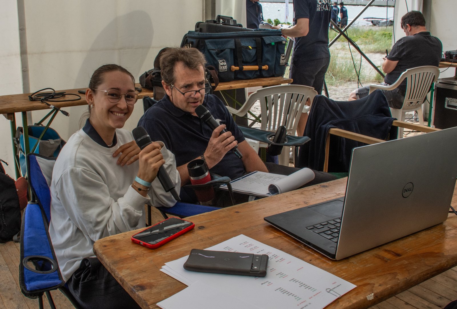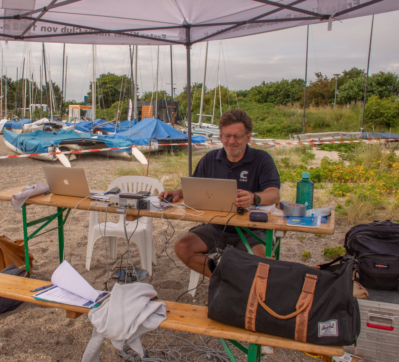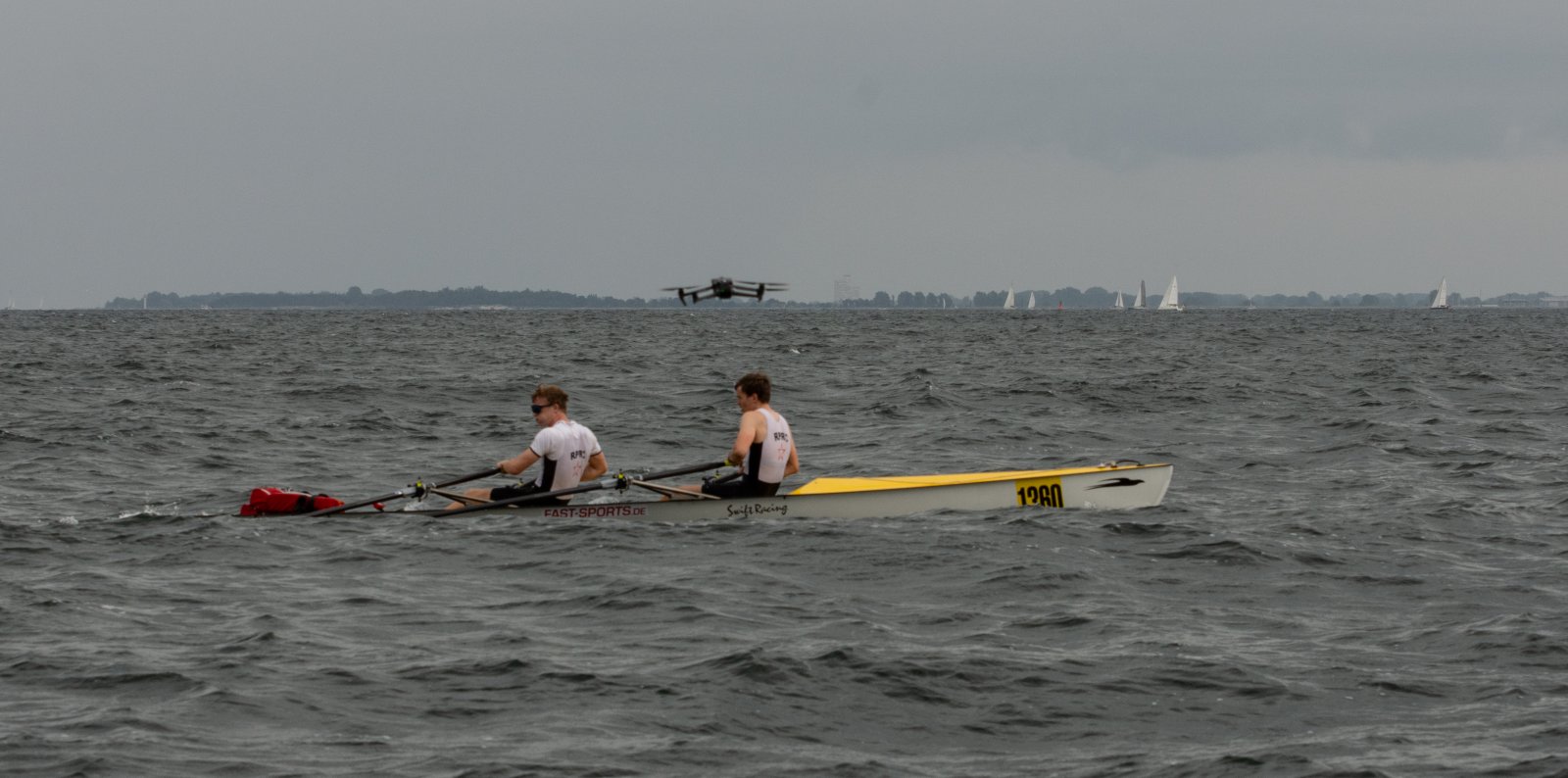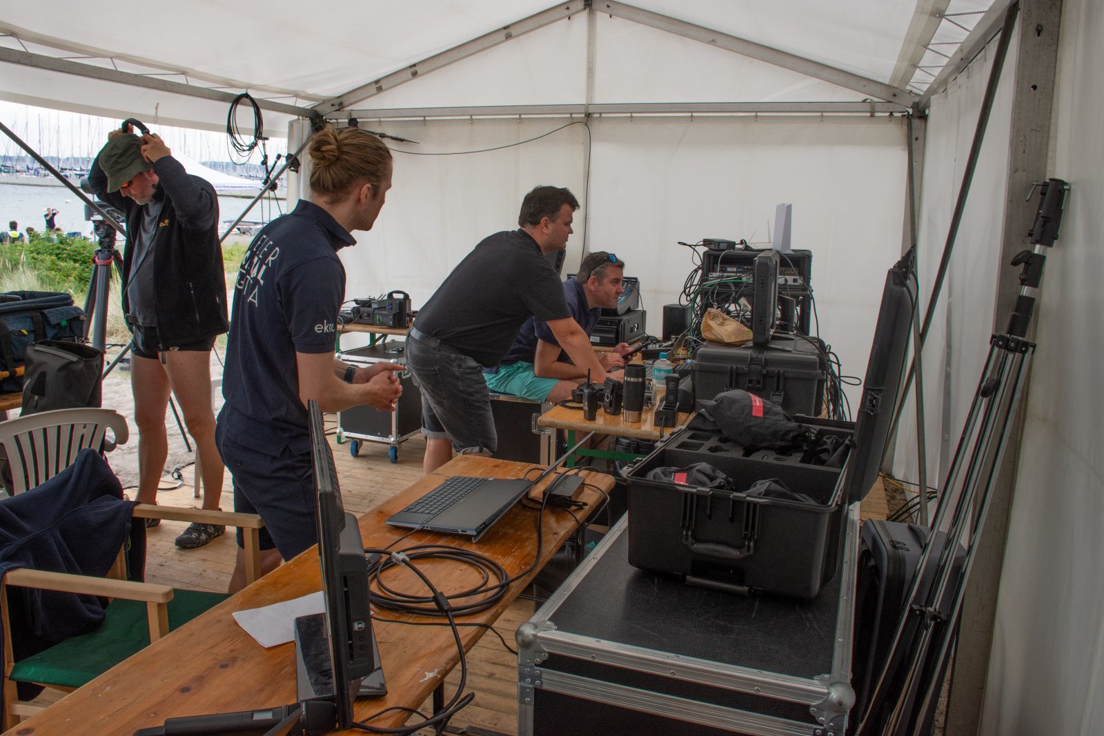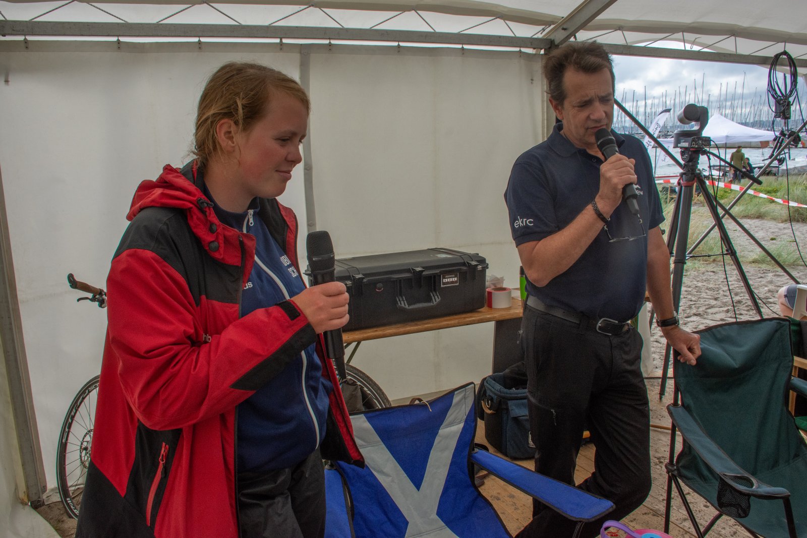 Die ungewöhnlichen Aktivitäten in der Strander Bucht bleiben bei den Sonntagsspaziergängern auf der Promenade nicht unbemerkt. Immer wieder beobachten Neugierige das Treiben und lassen sich das Geschehen erklären. Doch wir wollen ja größeres Publikum – und dies erreicht man heute natürlich über das Internet. Ein Livestream, professionell aufbereitet mit verschiedenen Kamerapositionen und einer Drohne liefern packende Livebilder vom Geschehen auf der Förde in das Teilnehmerzelt sowie in die ganze Welt. Doch ein Livestream ohne Worte ist wie Sahne ohne Torte. Also kommentiert das Kieler Ruderurgestein Kim Dibbern wieder das Geschehen, dieses Mal begleitet von Elisa Trog und Anna Fischbach, die mit ihrer langjährigen, internationalen Coastalwettkampferfahrung die Analysen fundiert ergänzen. Ihre Liveinterviews mit den Aktiven bescheren uns darüber hinaus weitere Stimmungsbilder von der Regattabahn.