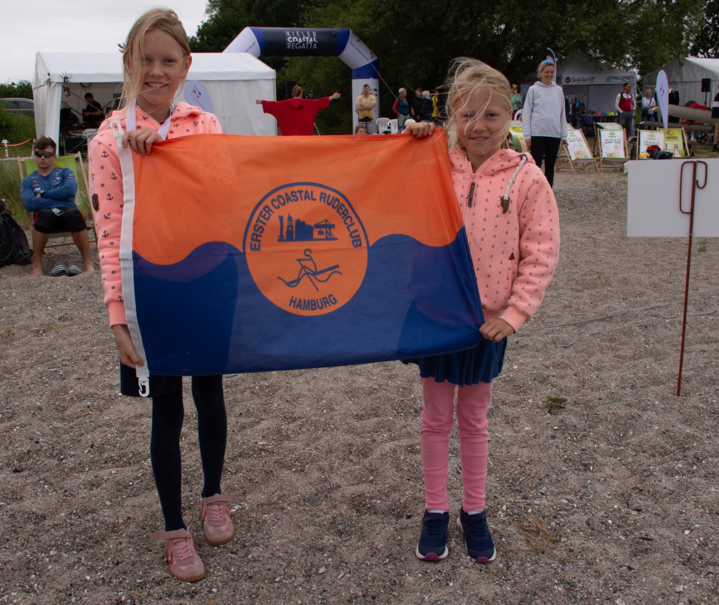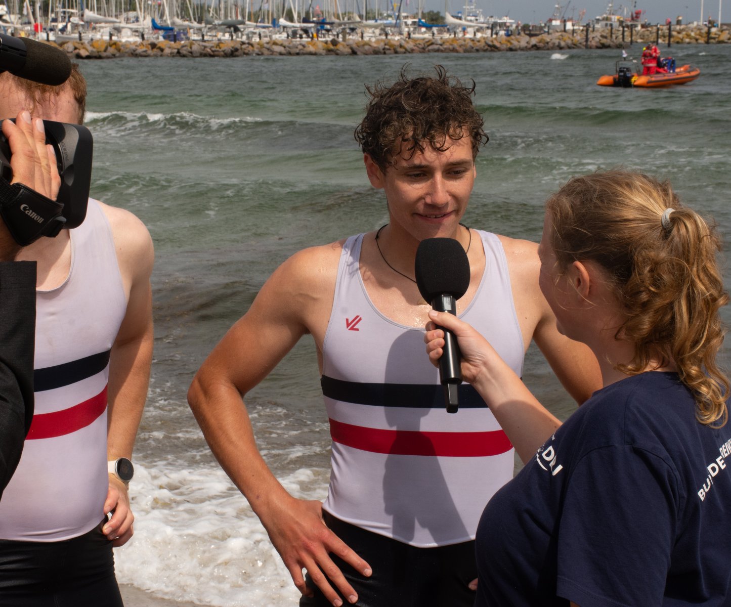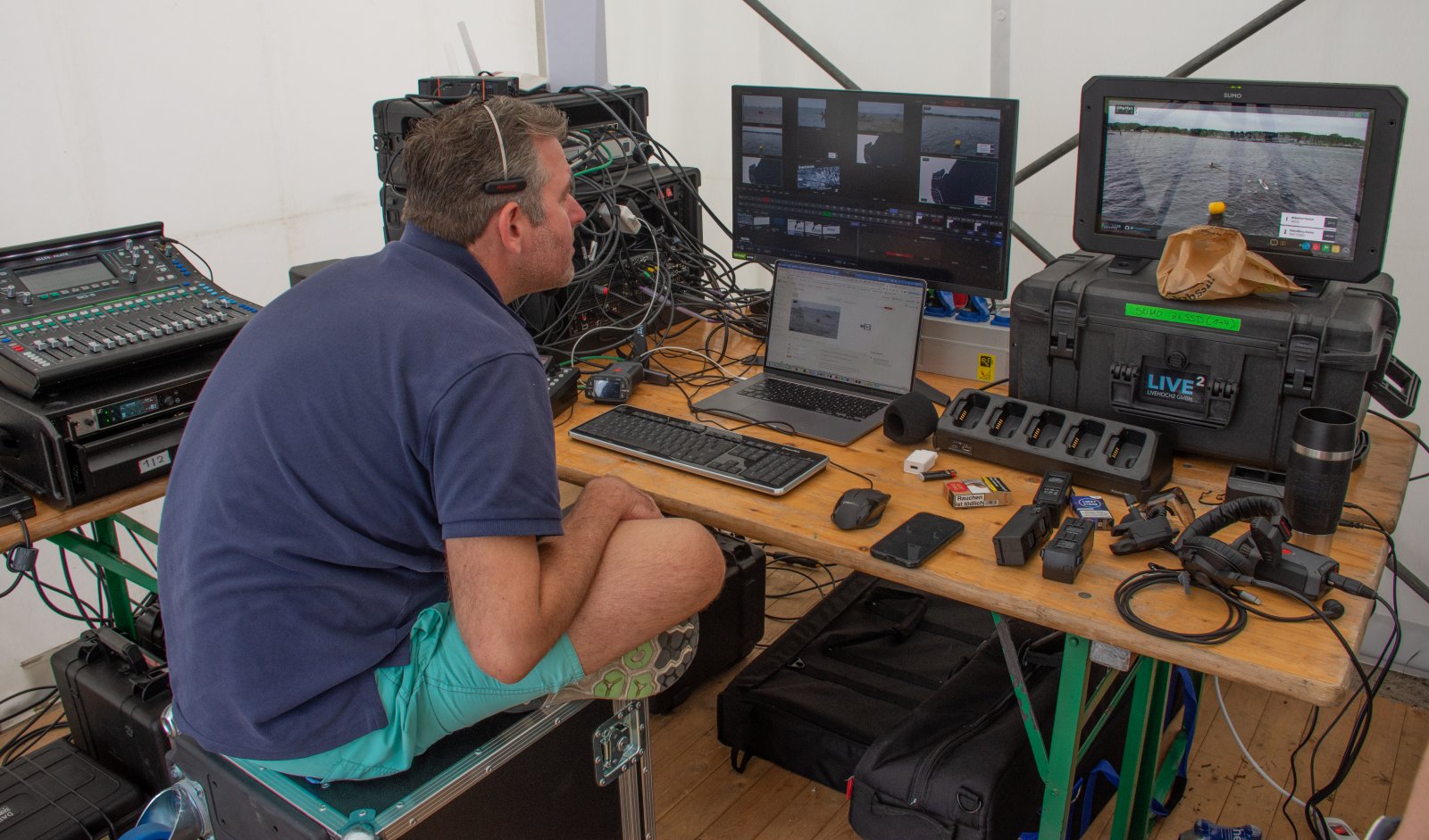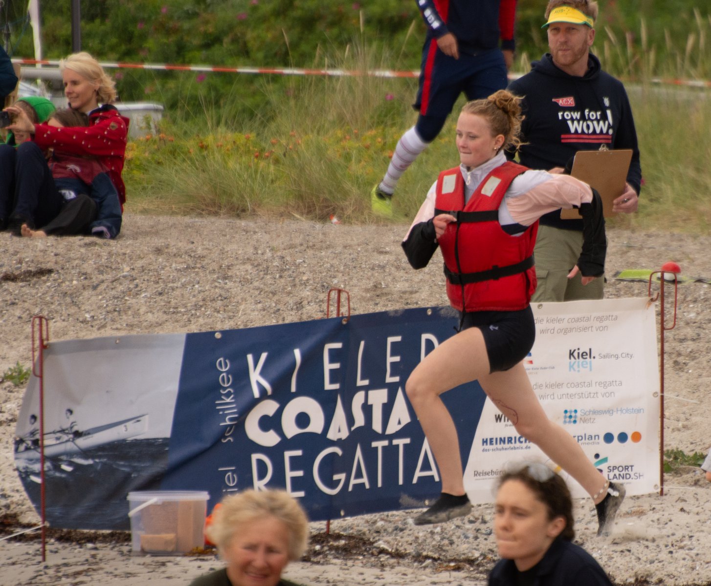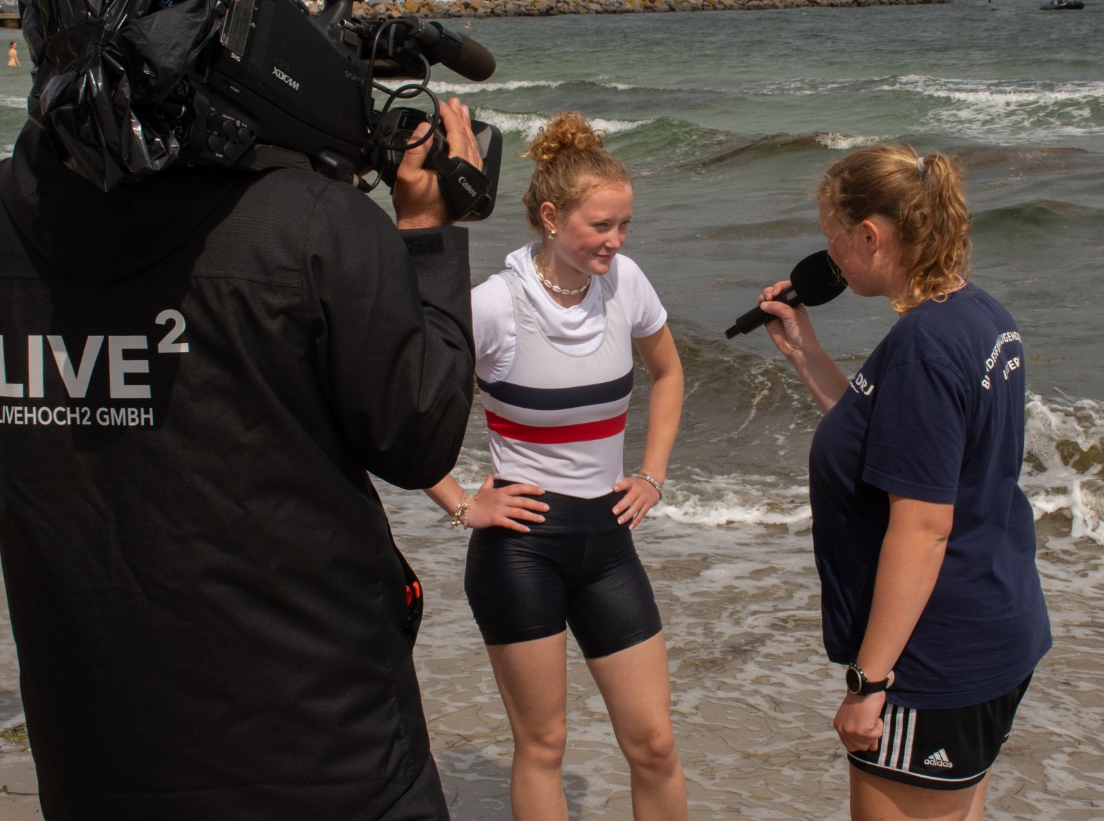 Die ungewöhnlichen Aktivitäten in der Strander Bucht bleiben bei den Sonntagsspaziergängern auf der Promenade nicht unbemerkt. Immer wieder beobachten Neugierige das Treiben und lassen sich das Geschehen erklären. Doch wir wollen ja größeres Publikum – und dies erreicht man heute natürlich über das Internet. Ein Livestream, professionell aufbereitet mit verschiedenen Kamerapositionen und einer Drohne liefern packende Livebilder vom Geschehen auf der Förde in das Teilnehmerzelt sowie in die ganze Welt. Doch ein Livestream ohne Worte ist wie Sahne ohne Torte. Also kommentiert das Kieler Ruderurgestein Kim Dibbern wieder das Geschehen, dieses Mal begleitet von Elisa Trog und Anna Fischbach, die mit ihrer langjährigen, internationalen Coastalwettkampferfahrung die Analysen fundiert ergänzen. Ihre Liveinterviews mit den Aktiven bescheren uns darüber hinaus weitere Stimmungsbilder von der Regattabahn.