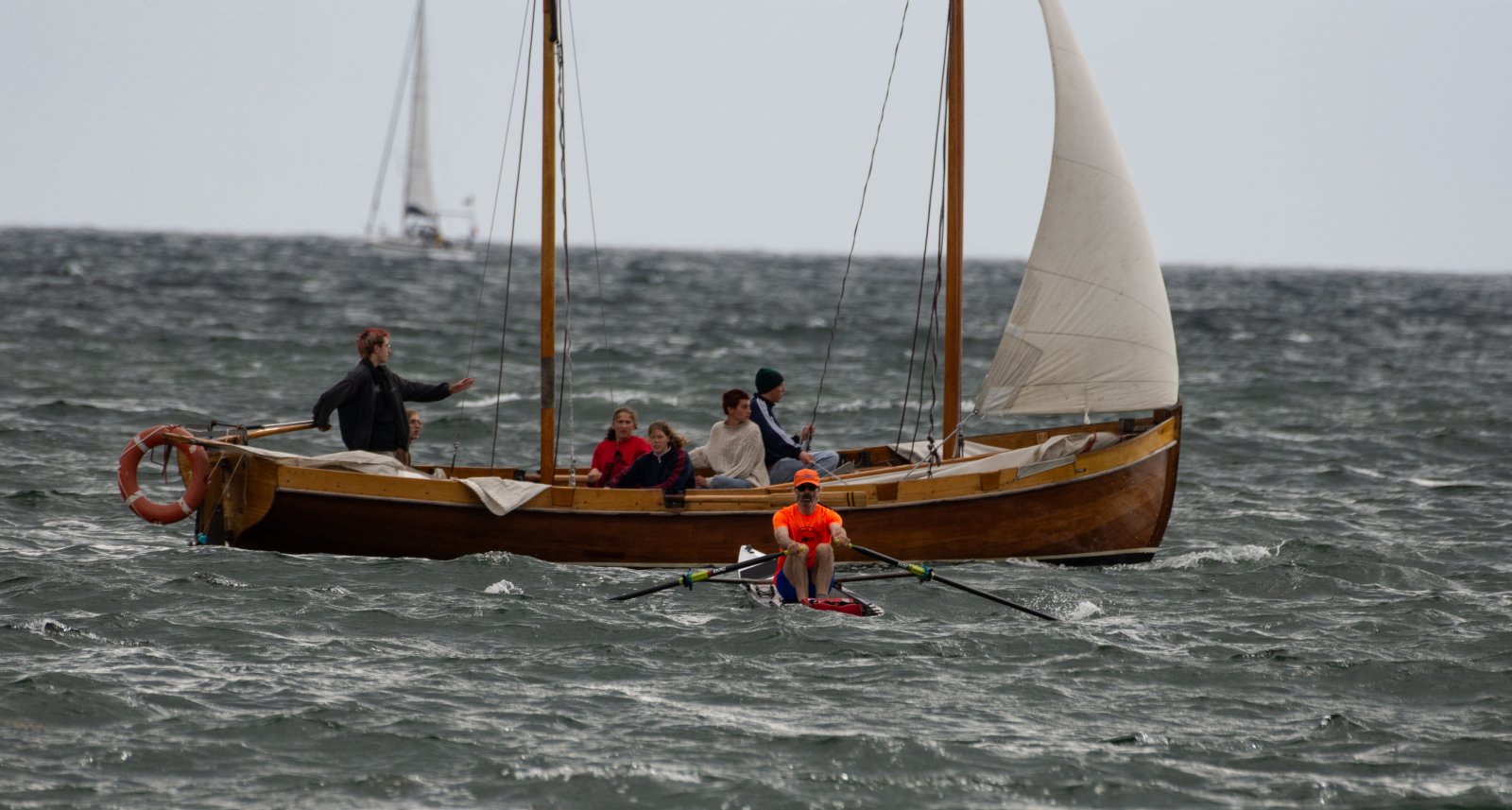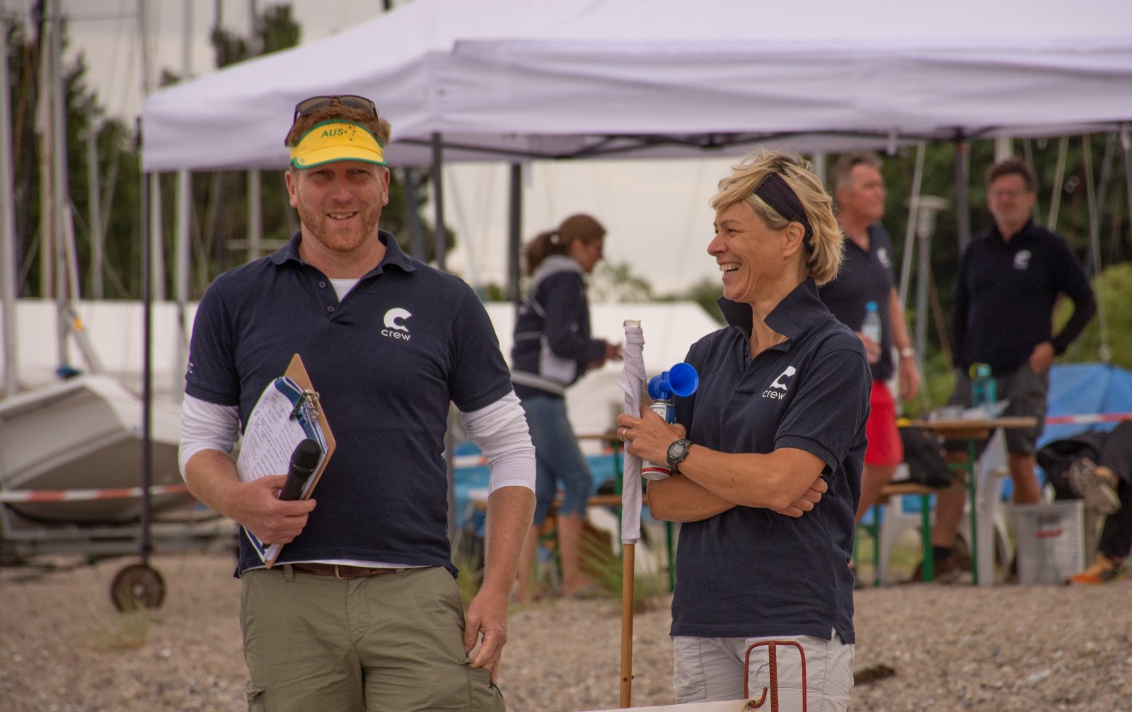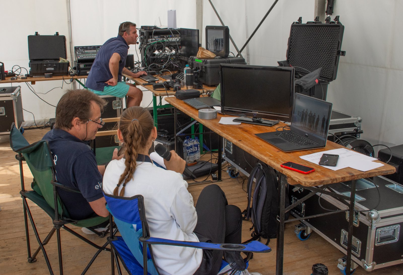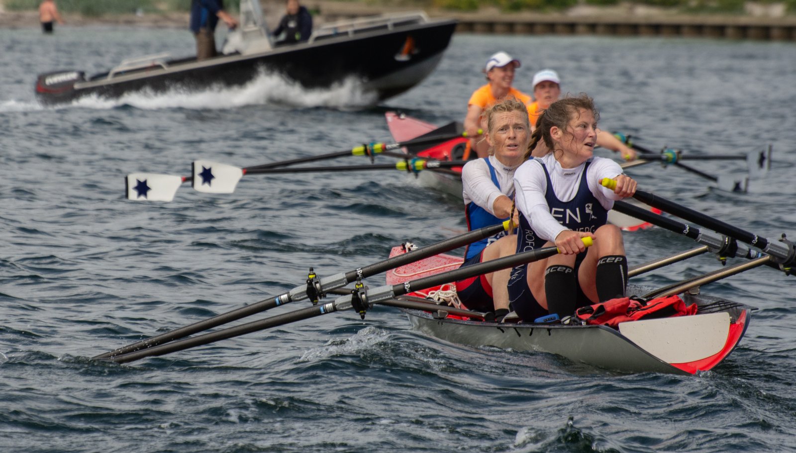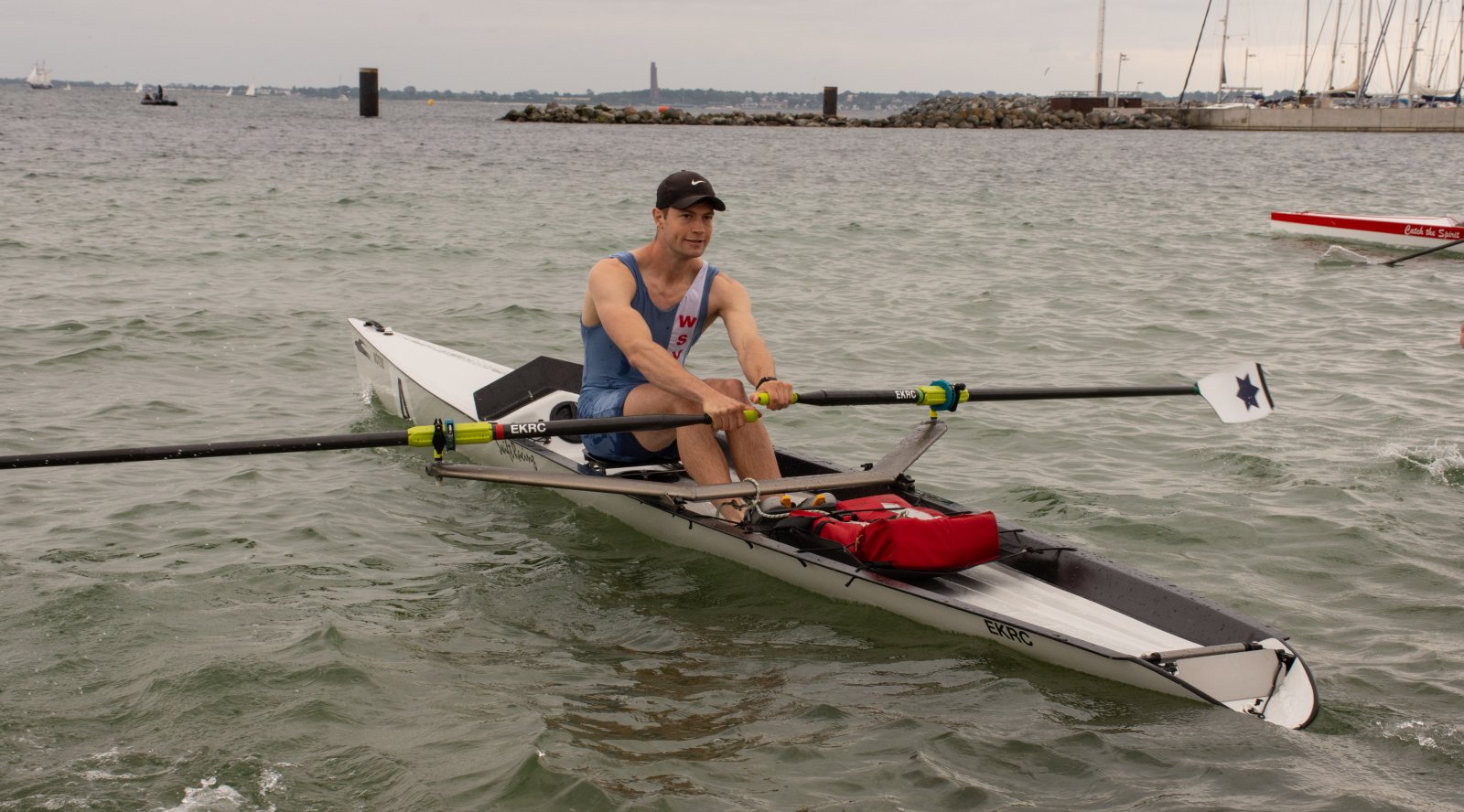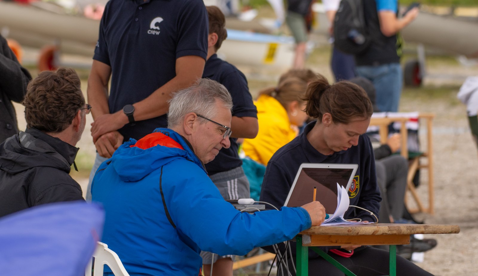 Die ungewöhnlichen Aktivitäten in der Strander Bucht bleiben bei den Sonntagsspaziergängern auf der Promenade nicht unbemerkt. Immer wieder beobachten Neugierige das Treiben und lassen sich das Geschehen erklären. Doch wir wollen ja größeres Publikum – und dies erreicht man heute natürlich über das Internet. Ein Livestream, professionell aufbereitet mit verschiedenen Kamerapositionen und einer Drohne liefern packende Livebilder vom Geschehen auf der Förde in das Teilnehmerzelt sowie in die ganze Welt. Doch ein Livestream ohne Worte ist wie Sahne ohne Torte. Also kommentiert das Kieler Ruderurgestein Kim Dibbern wieder das Geschehen, dieses Mal begleitet von Elisa Trog und Anna Fischbach, die mit ihrer langjährigen, internationalen Coastalwettkampferfahrung die Analysen fundiert ergänzen. Ihre Liveinterviews mit den Aktiven bescheren uns darüber hinaus weitere Stimmungsbilder von der Regattabahn.