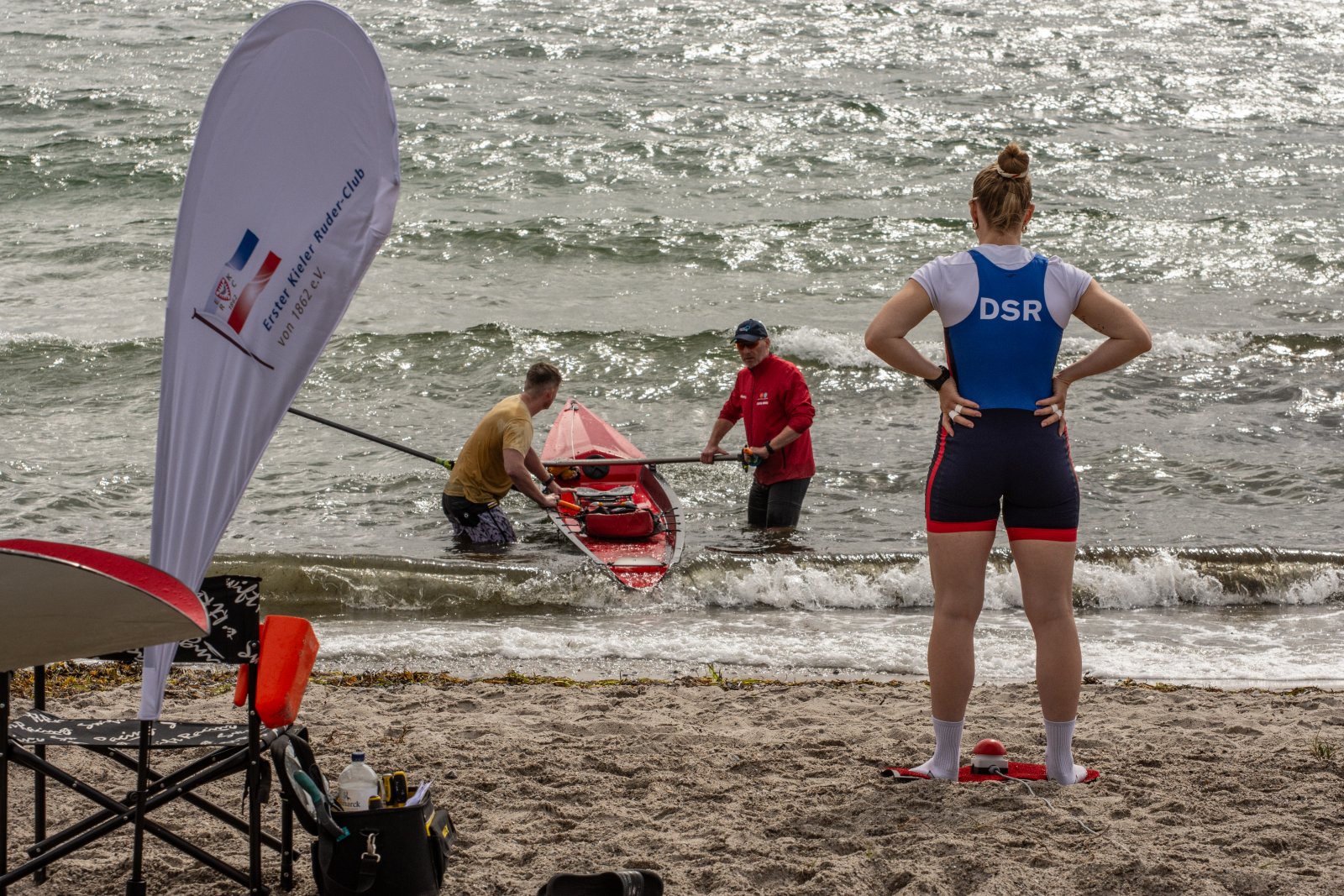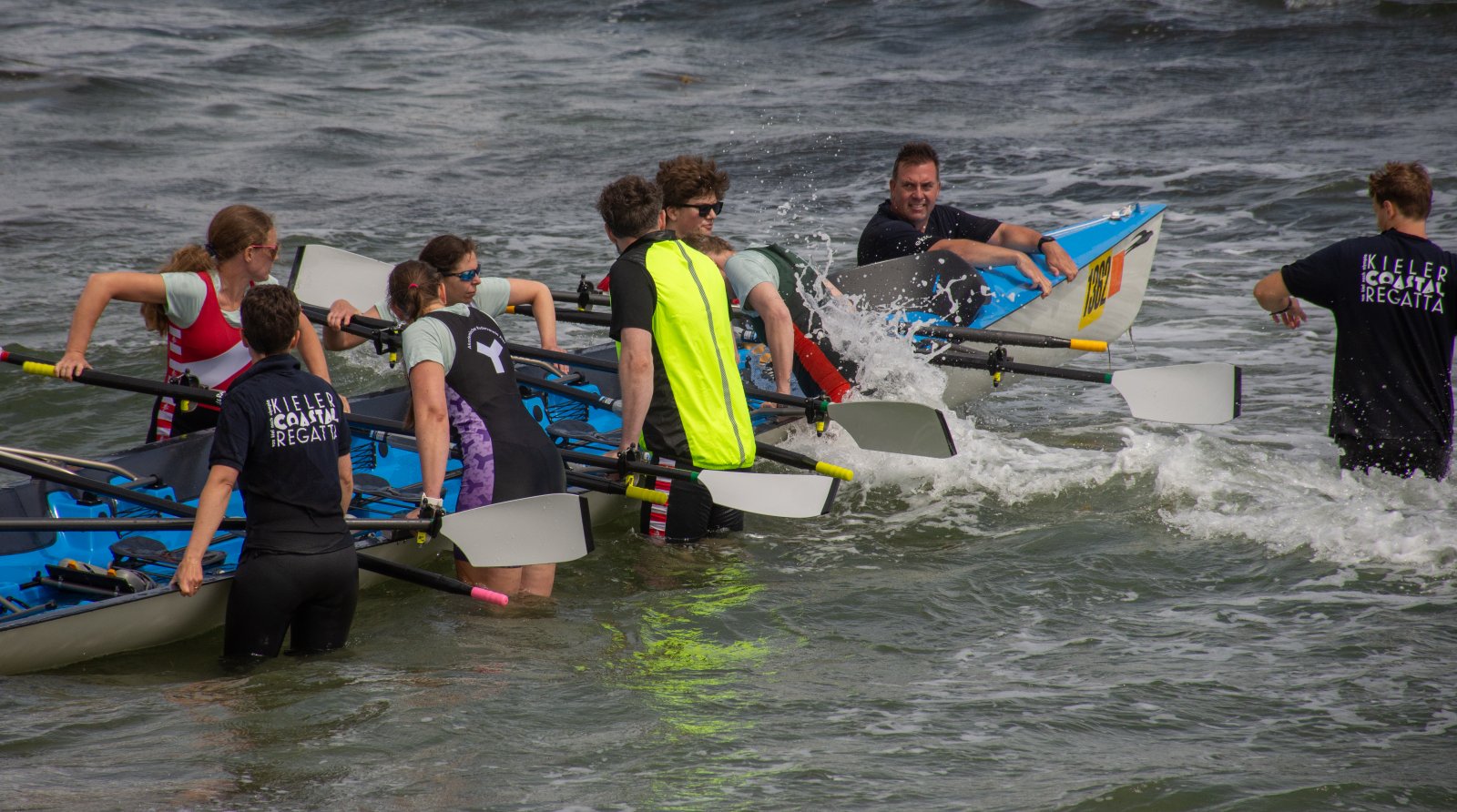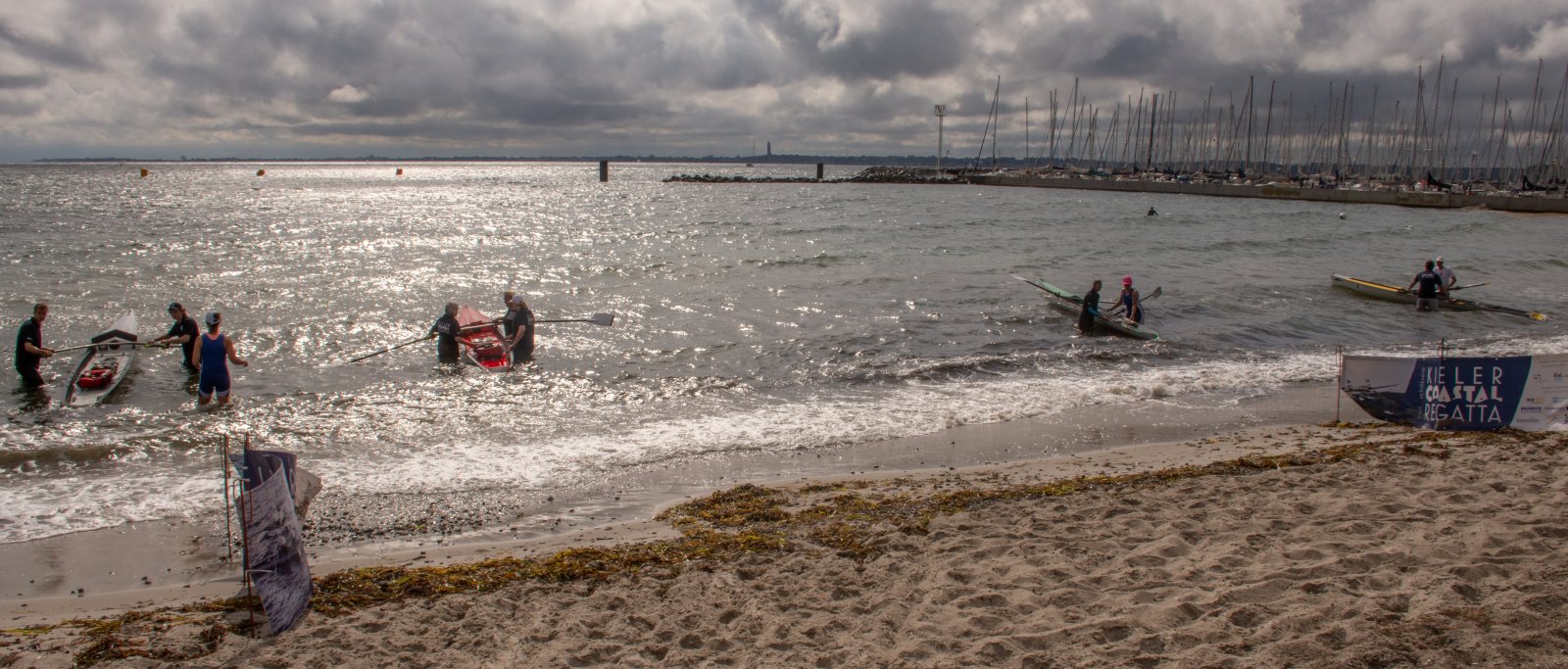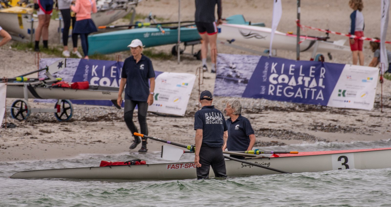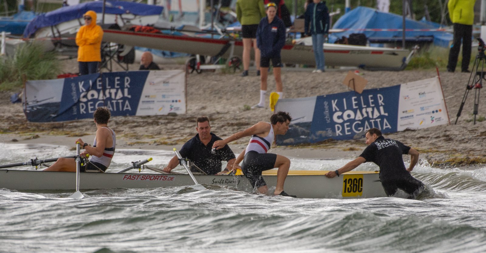 Action oder Abbruch? Diese Frage schwebt am Sonntag über der 4. Kieler Coastal-Regatta, als im Laufe des Tages die Bedingungen von freundlich über zunehmend coastalfreundlich hin zu ungemütlich zu kippen drohen. Ein frischer Ostwind beschert uns Brandung direkt am Strand, welche den Job der Bootshandler am Start zunehmend beschwerlicher werden lassen. Um einen kompletten Abbruch zu umgehen, verkündet die Regattaleitung zum Nachmittag einige Änderungen im Austragungsmodus: Auf den Beachstart wird verzichtet, die Vierrennen werden jeweils auf Zweierfelder gestreckt um das Risiko von Kollisionen zu vermeiden und die Einerstaffeln werden im Vierer ausgefahren – die häufigen Wechsel im Einer bergen zu große Risiken.