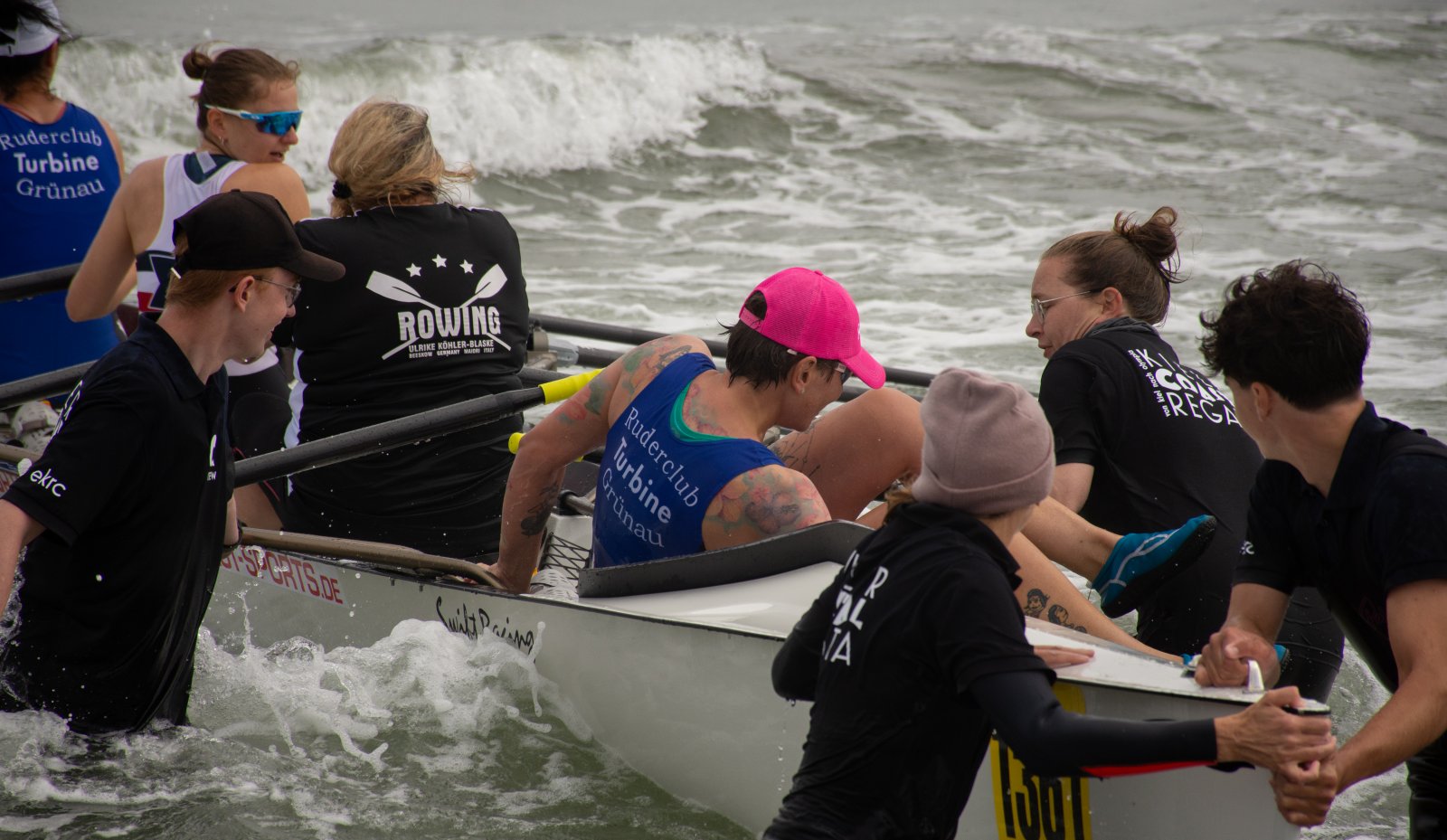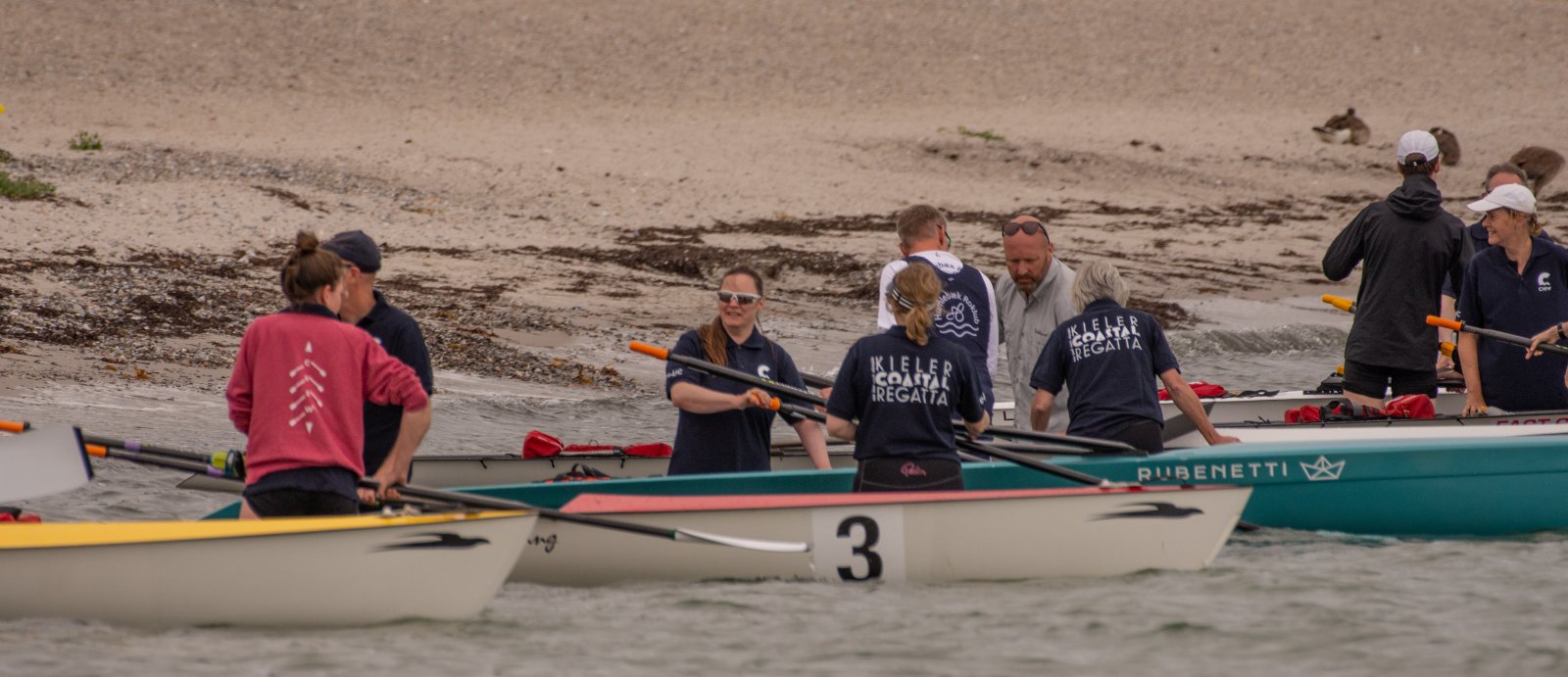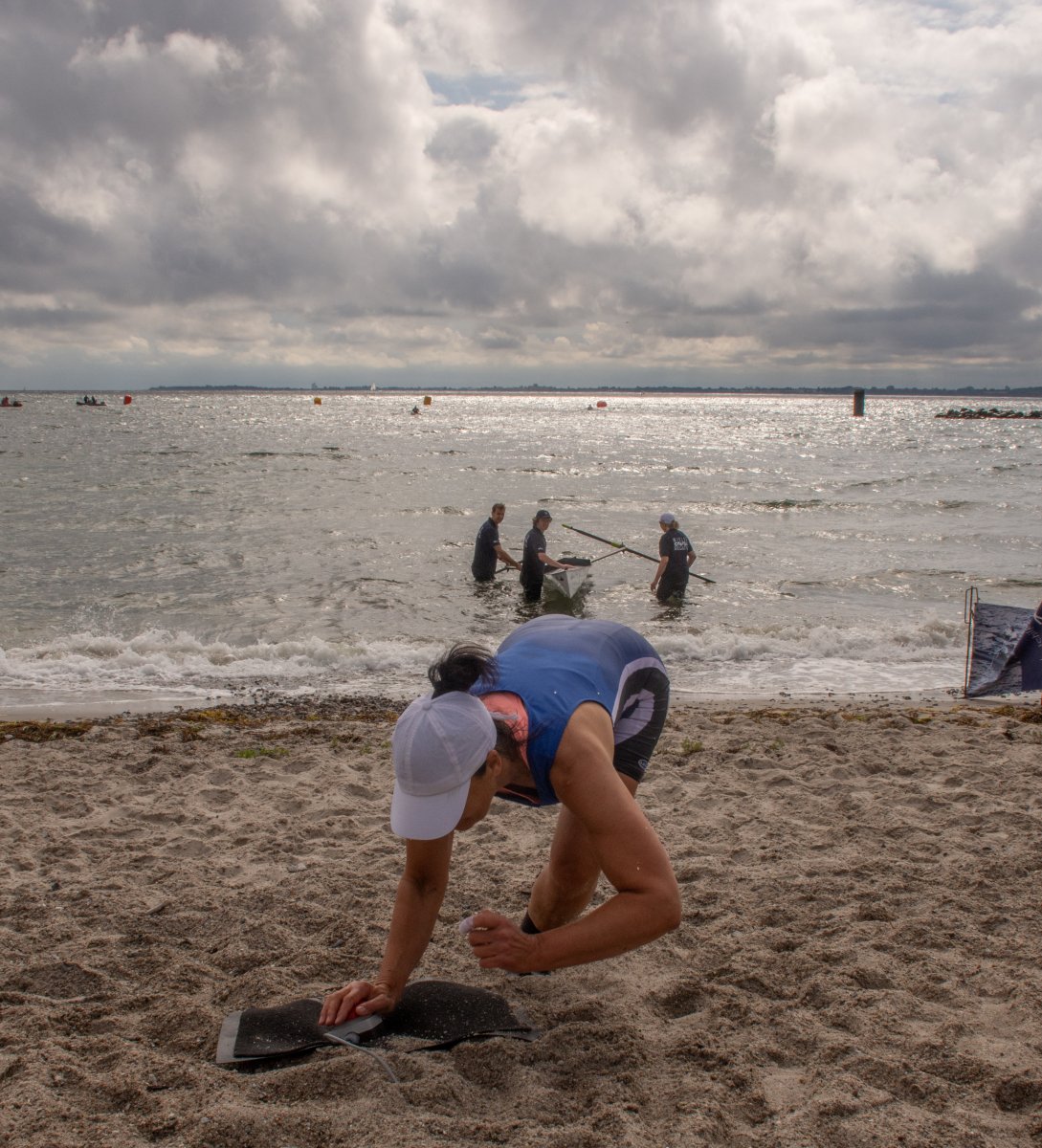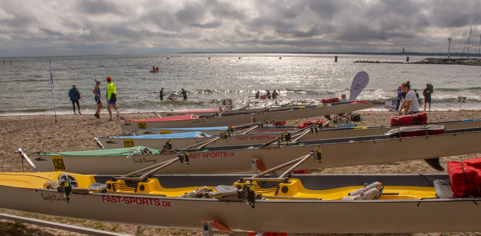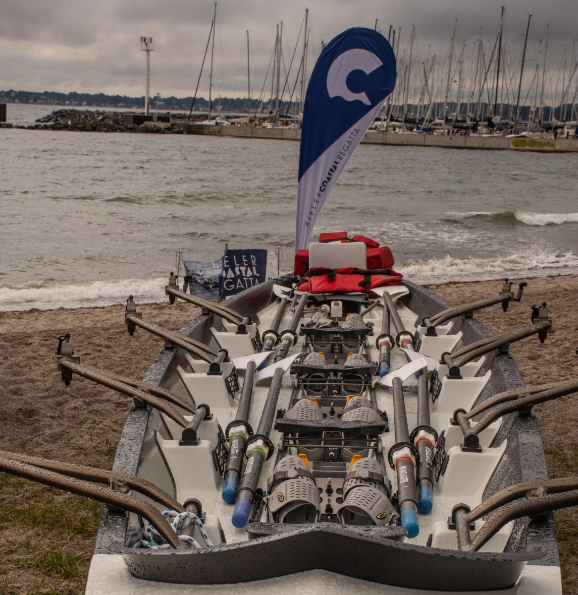 Action oder Abbruch? Diese Frage schwebt am Sonntag über der 4. Kieler Coastal-Regatta, als im Laufe des Tages die Bedingungen von freundlich über zunehmend coastalfreundlich hin zu ungemütlich zu kippen drohen. Ein frischer Ostwind beschert uns Brandung direkt am Strand, welche den Job der Bootshandler am Start zunehmend beschwerlicher werden lassen. Um einen kompletten Abbruch zu umgehen, verkündet die Regattaleitung zum Nachmittag einige Änderungen im Austragungsmodus: Auf den Beachstart wird verzichtet, die Vierrennen werden jeweils auf Zweierfelder gestreckt um das Risiko von Kollisionen zu vermeiden und die Einerstaffeln werden im Vierer ausgefahren – die häufigen Wechsel im Einer bergen zu große Risiken.