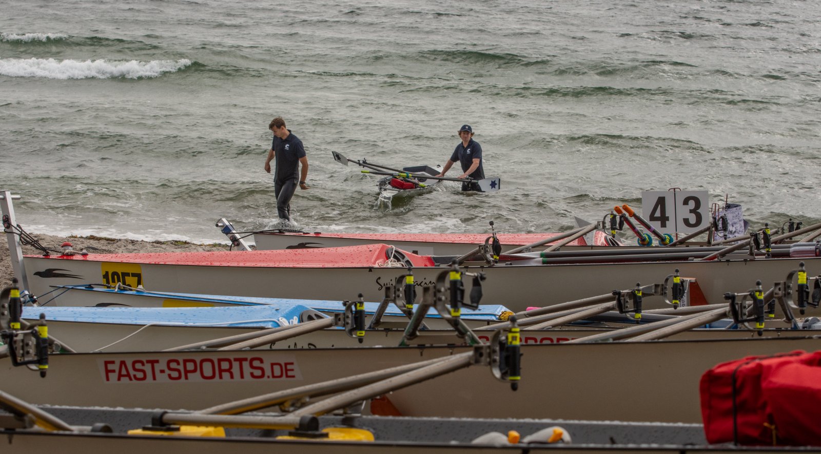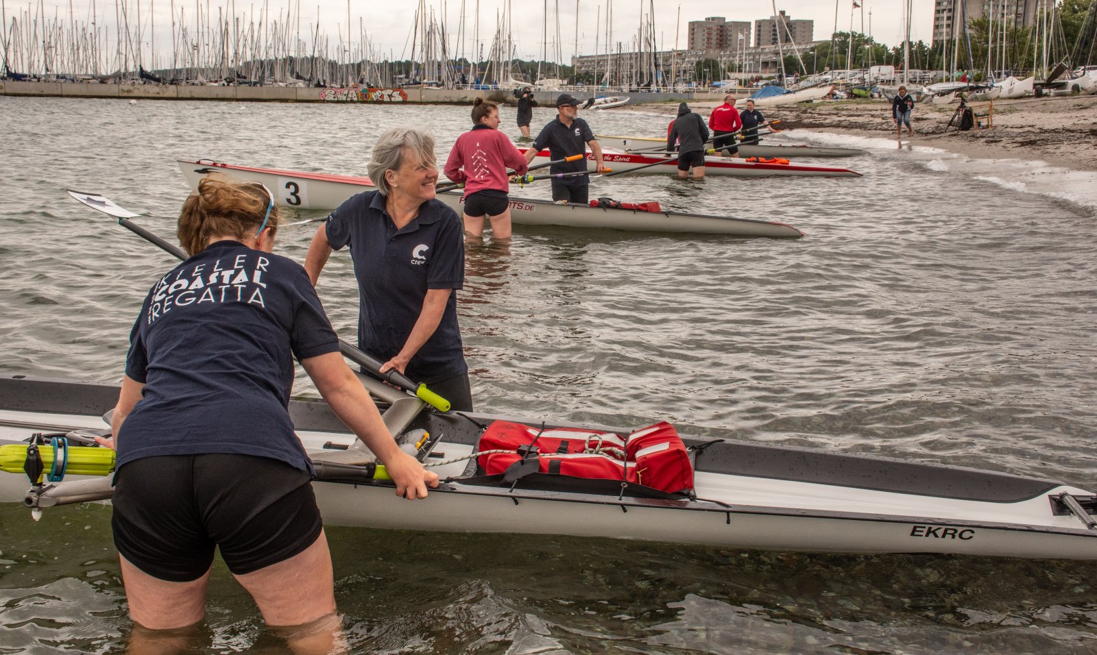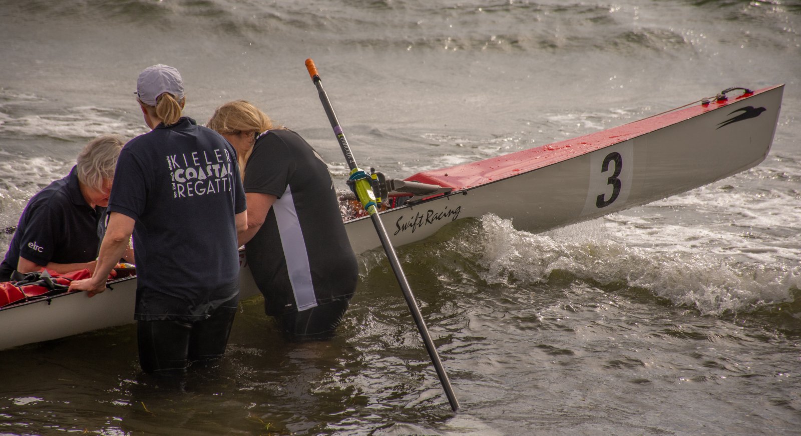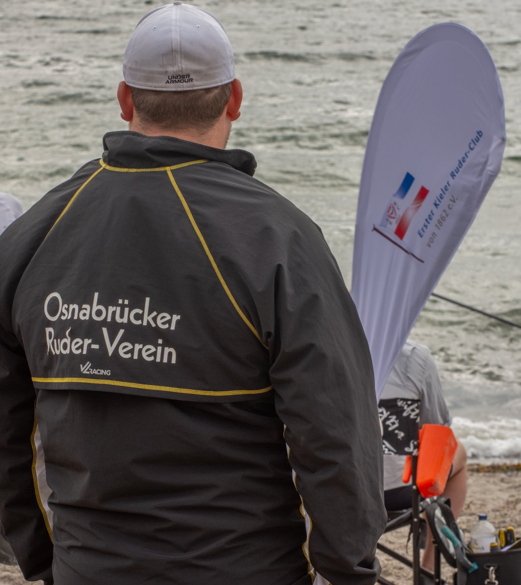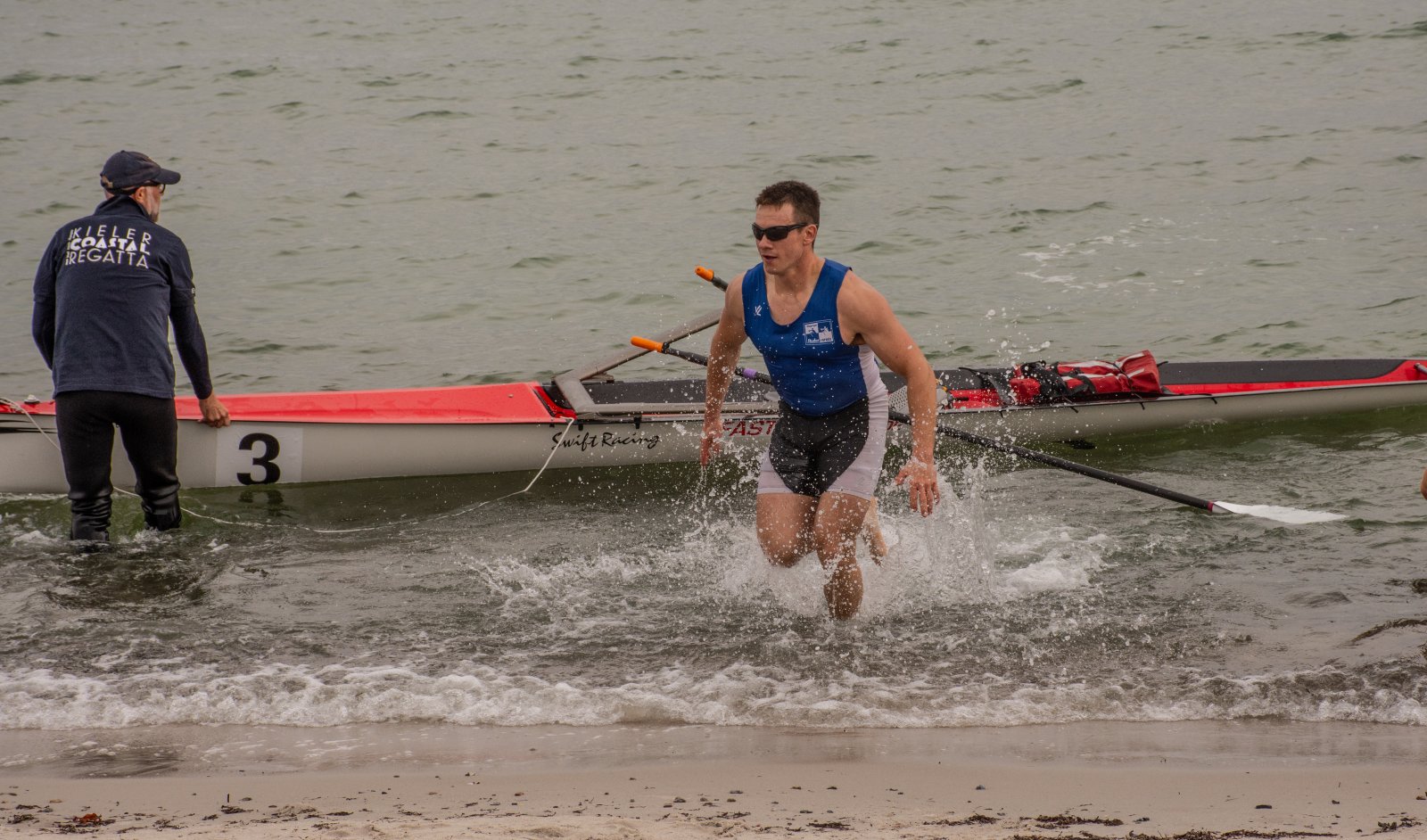 Action oder Abbruch? Diese Frage schwebt am Sonntag über der 4. Kieler Coastal-Regatta, als im Laufe des Tages die Bedingungen von freundlich über zunehmend coastalfreundlich hin zu ungemütlich zu kippen drohen. Ein frischer Ostwind beschert uns Brandung direkt am Strand, welche den Job der Bootshandler am Start zunehmend beschwerlicher werden lassen. Um einen kompletten Abbruch zu umgehen, verkündet die Regattaleitung zum Nachmittag einige Änderungen im Austragungsmodus: Auf den Beachstart wird verzichtet, die Vierrennen werden jeweils auf Zweierfelder gestreckt um das Risiko von Kollisionen zu vermeiden und die Einerstaffeln werden im Vierer ausgefahren – die häufigen Wechsel im Einer bergen zu große Risiken.
