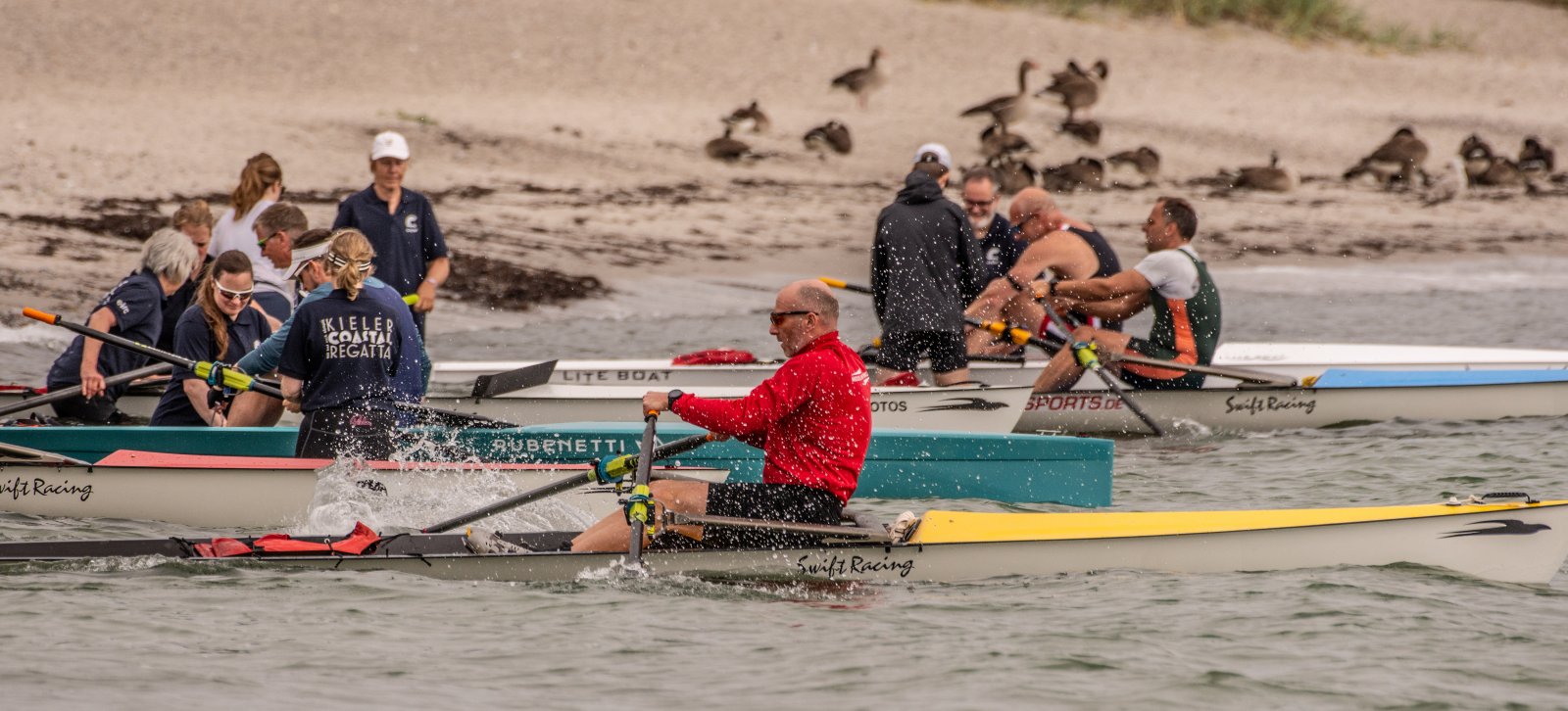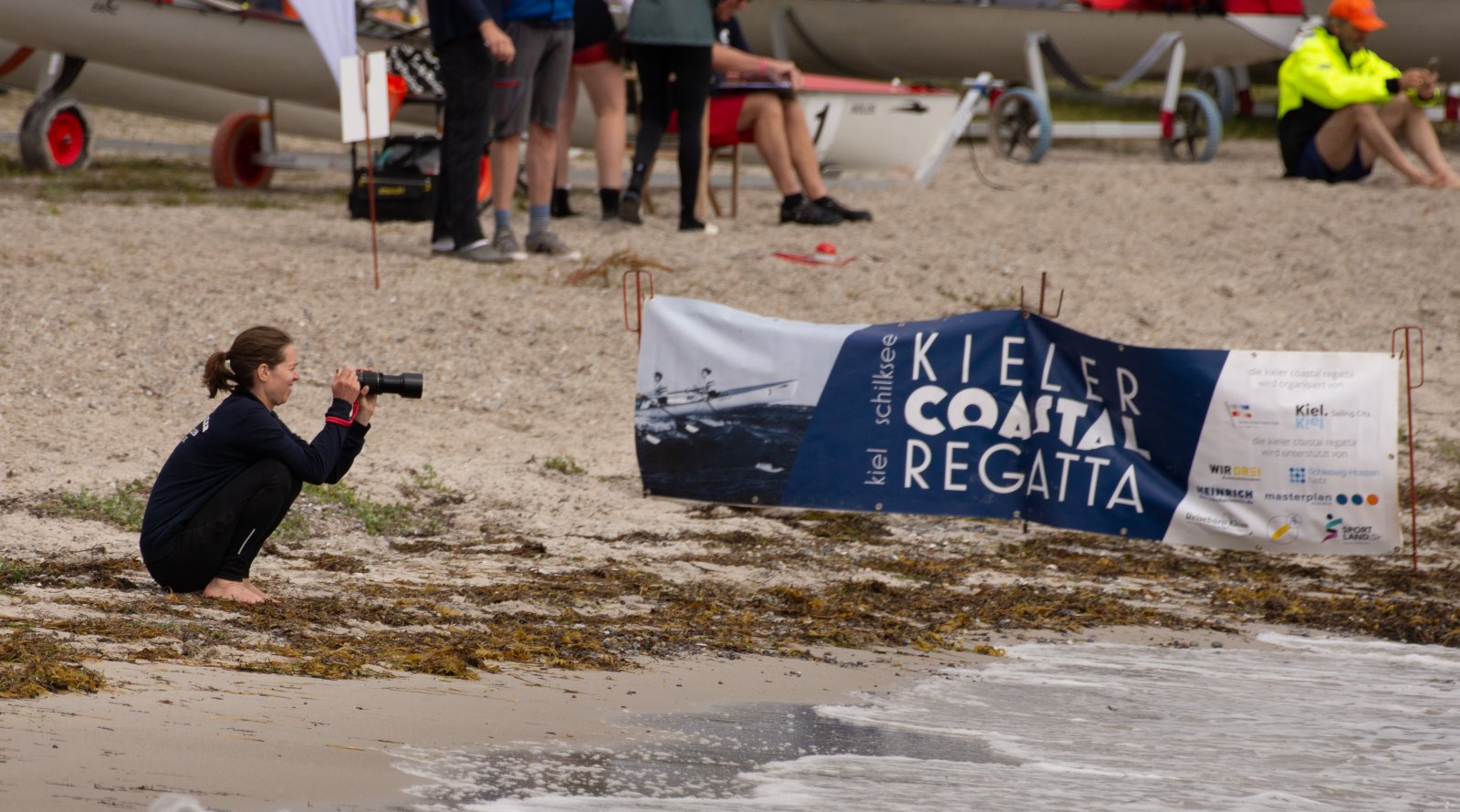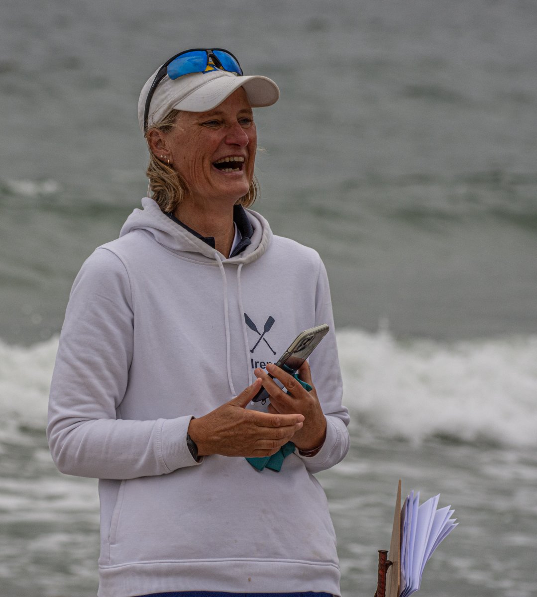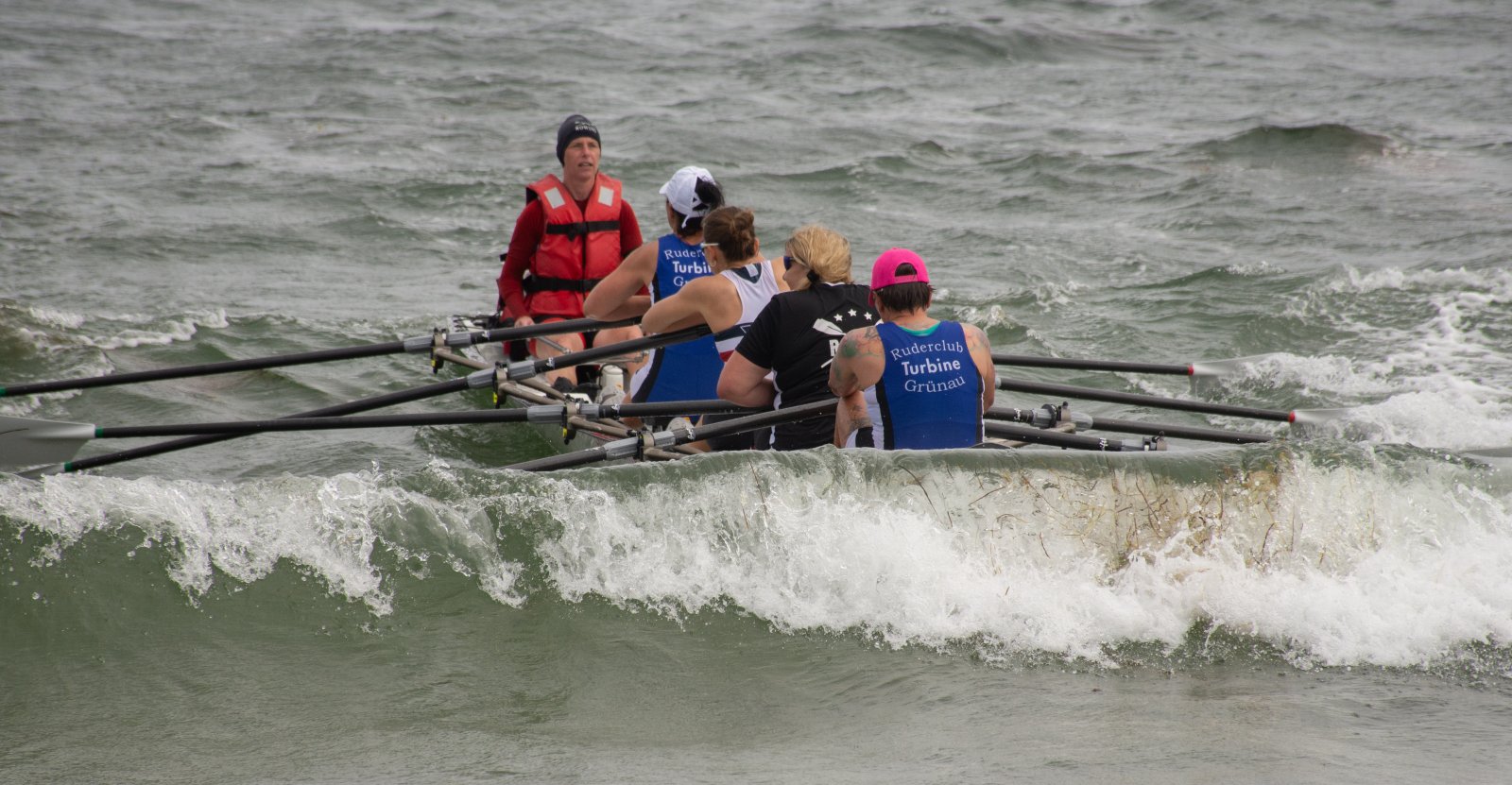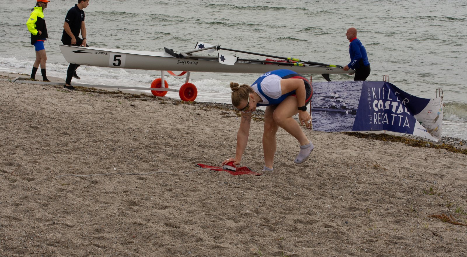 Action oder Abbruch? Diese Frage schwebt am Sonntag über der 4. Kieler Coastal-Regatta, als im Laufe des Tages die Bedingungen von freundlich über zunehmend coastalfreundlich hin zu ungemütlich zu kippen drohen. Ein frischer Ostwind beschert uns Brandung direkt am Strand, welche den Job der Bootshandler am Start zunehmend beschwerlicher werden lassen. Um einen kompletten Abbruch zu umgehen, verkündet die Regattaleitung zum Nachmittag einige Änderungen im Austragungsmodus: Auf den Beachstart wird verzichtet, die Vierrennen werden jeweils auf Zweierfelder gestreckt um das Risiko von Kollisionen zu vermeiden und die Einerstaffeln werden im Vierer ausgefahren – die häufigen Wechsel im Einer bergen zu große Risiken.
