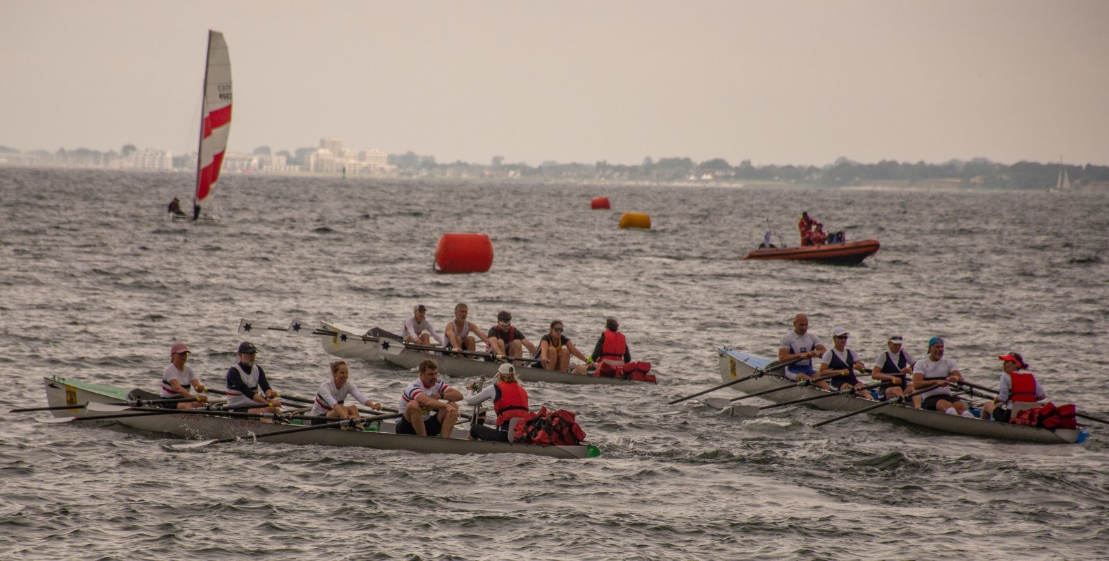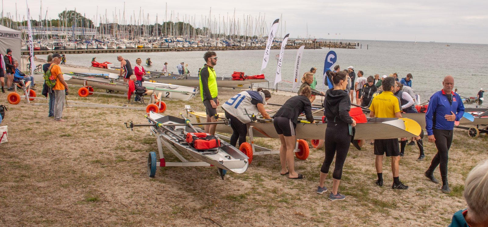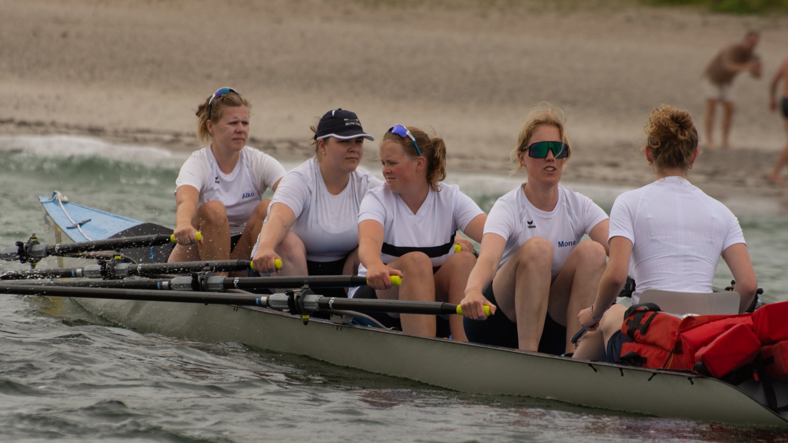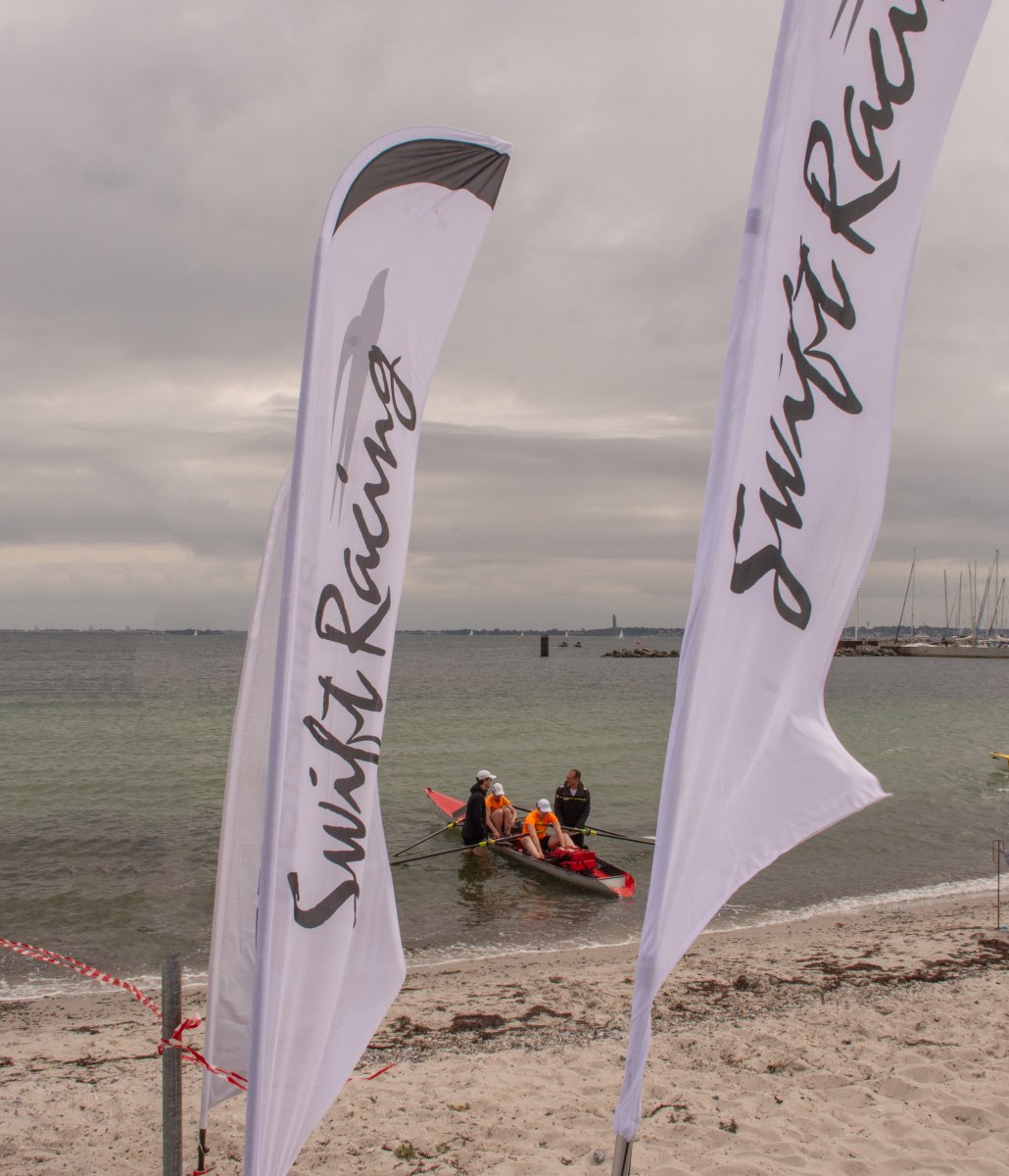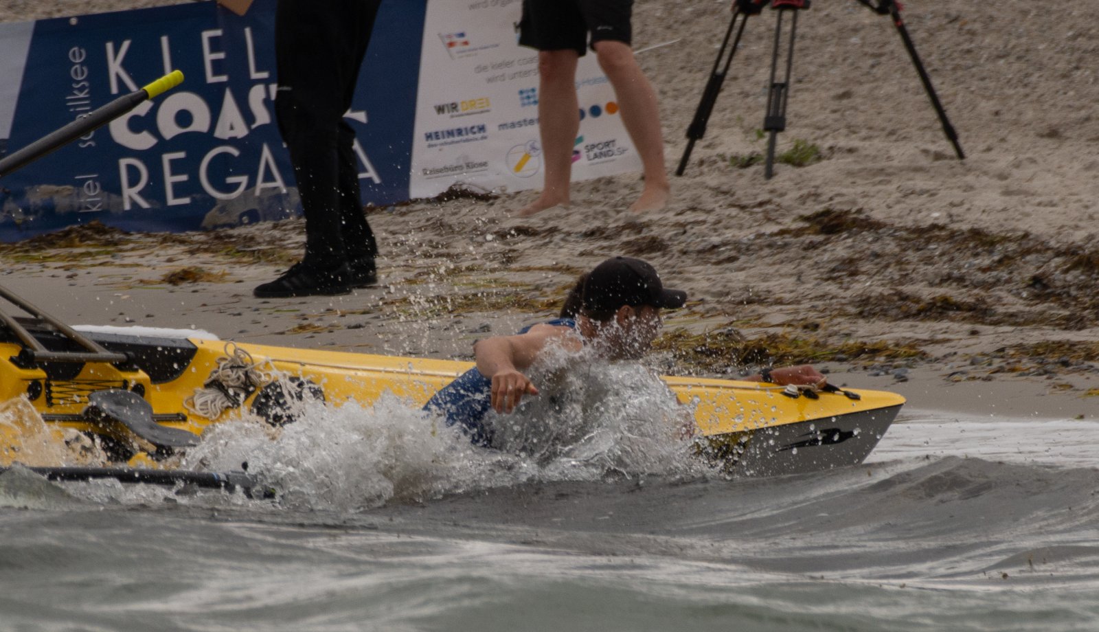 Action oder Abbruch? Diese Frage schwebt am Sonntag über der 4. Kieler Coastal-Regatta, als im Laufe des Tages die Bedingungen von freundlich über zunehmend coastalfreundlich hin zu ungemütlich zu kippen drohen. Ein frischer Ostwind beschert uns Brandung direkt am Strand, welche den Job der Bootshandler am Start zunehmend beschwerlicher werden lassen. Um einen kompletten Abbruch zu umgehen, verkündet die Regattaleitung zum Nachmittag einige Änderungen im Austragungsmodus: Auf den Beachstart wird verzichtet, die Vierrennen werden jeweils auf Zweierfelder gestreckt um das Risiko von Kollisionen zu vermeiden und die Einerstaffeln werden im Vierer ausgefahren – die häufigen Wechsel im Einer bergen zu große Risiken.