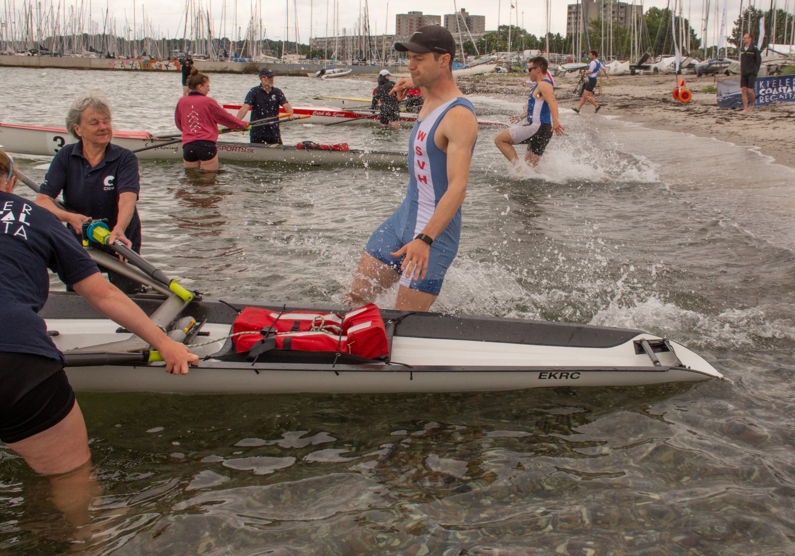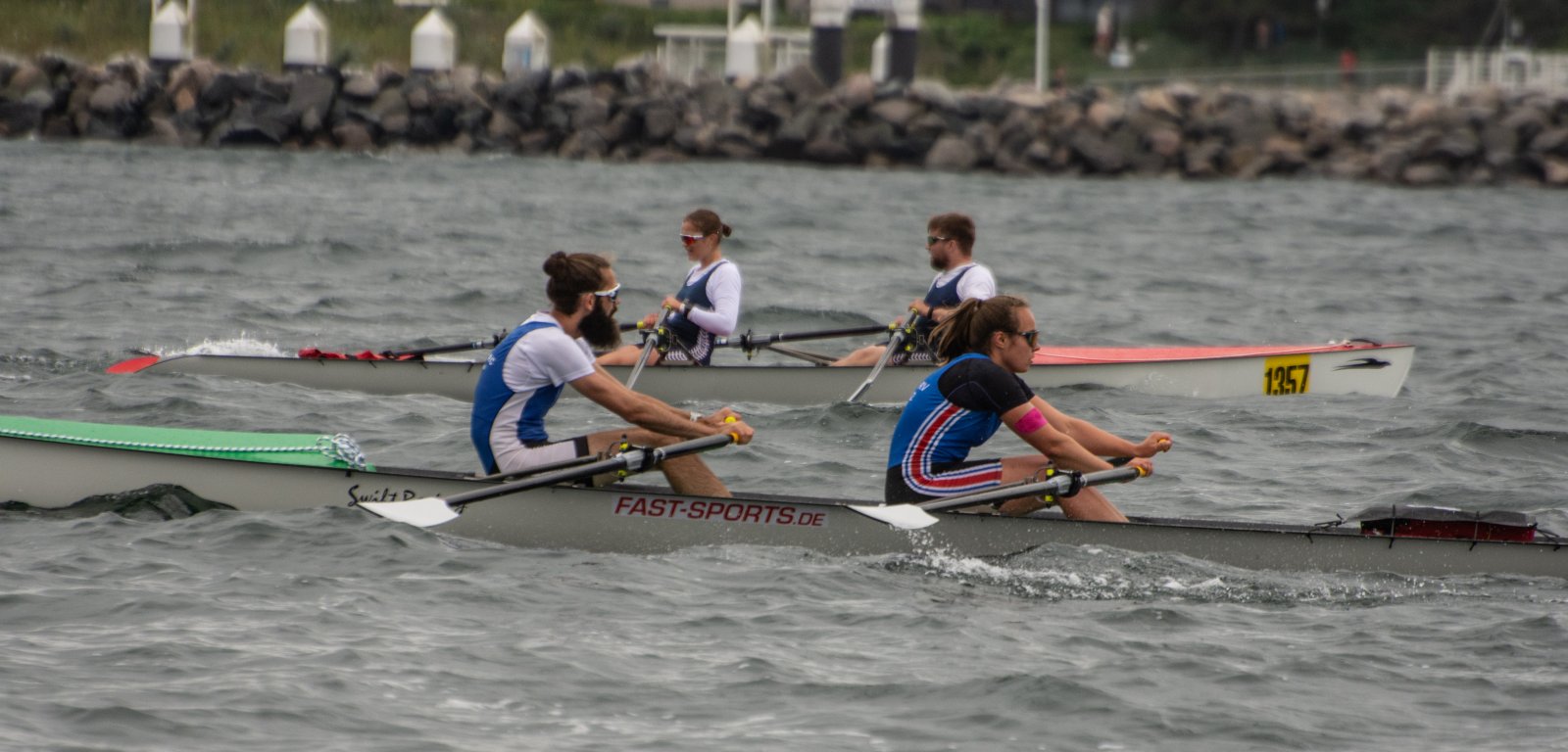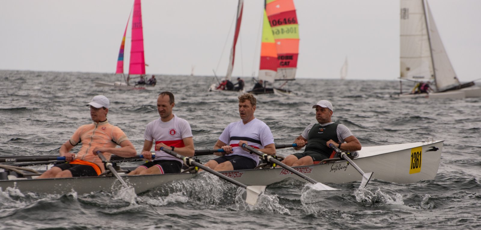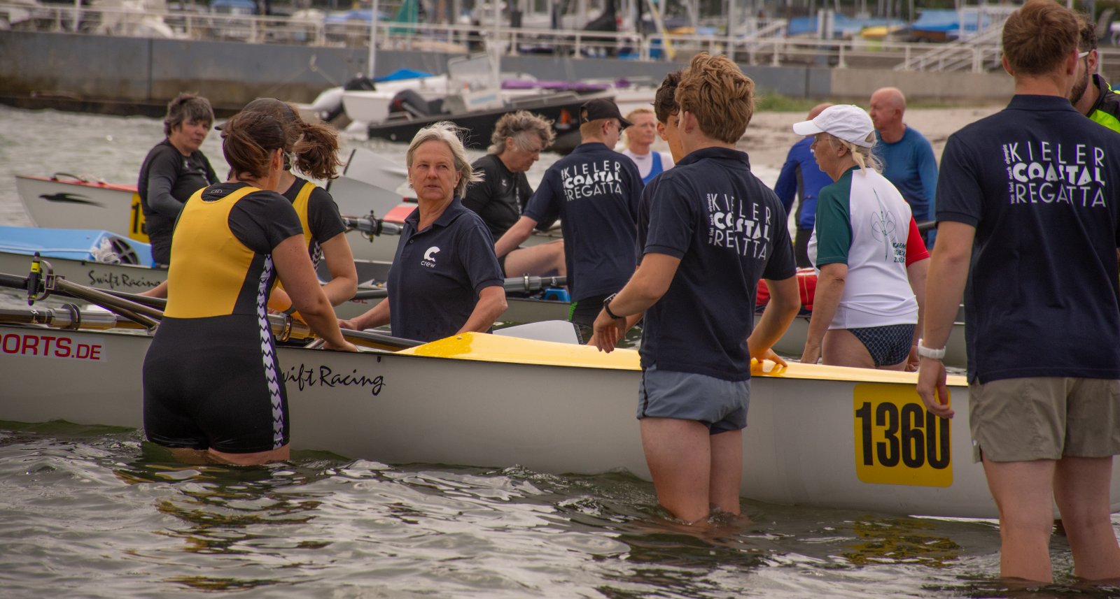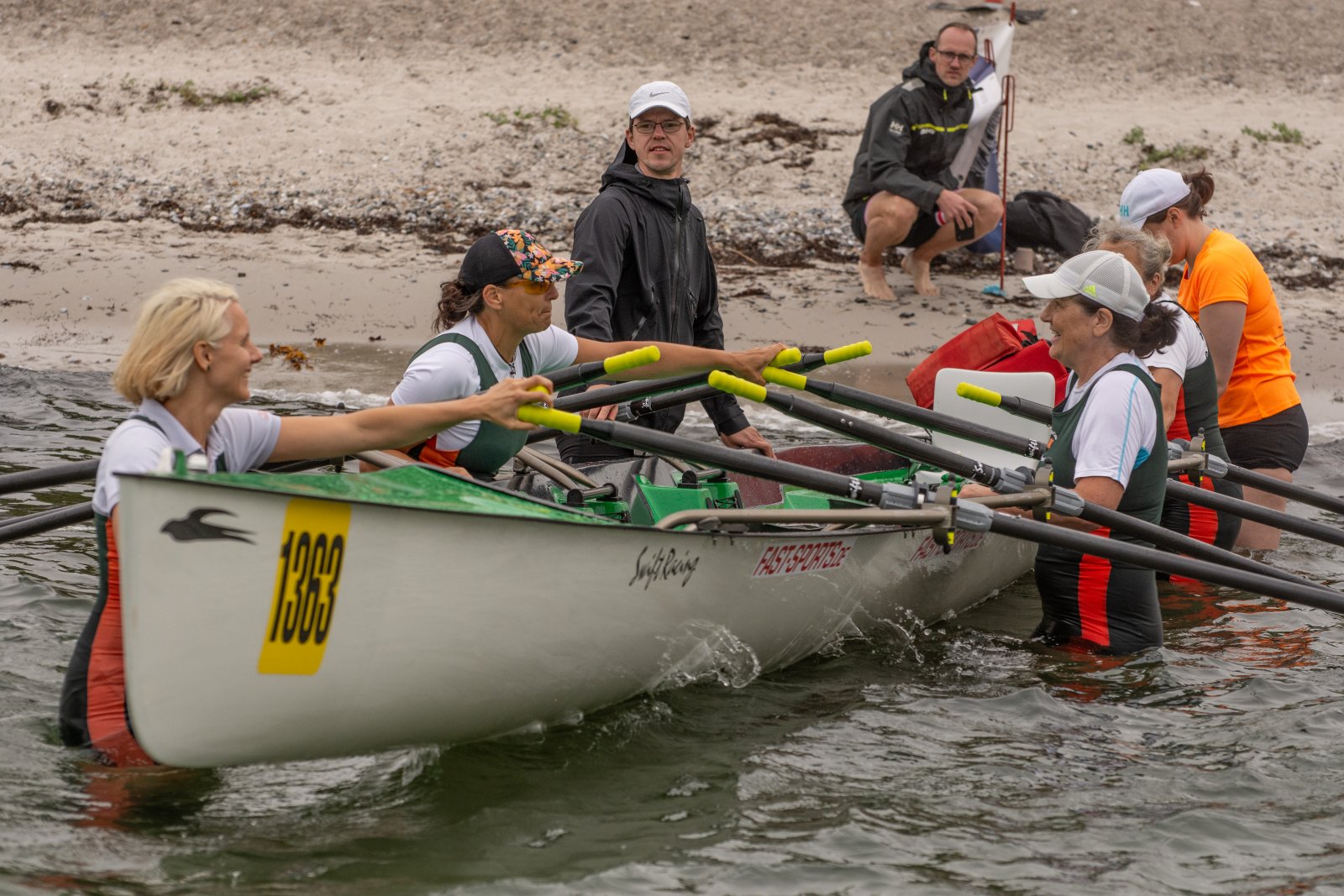 Action oder Abbruch? Diese Frage schwebt am Sonntag über der 4. Kieler Coastal-Regatta, als im Laufe des Tages die Bedingungen von freundlich über zunehmend coastalfreundlich hin zu ungemütlich zu kippen drohen. Ein frischer Ostwind beschert uns Brandung direkt am Strand, welche den Job der Bootshandler am Start zunehmend beschwerlicher werden lassen. Um einen kompletten Abbruch zu umgehen, verkündet die Regattaleitung zum Nachmittag einige Änderungen im Austragungsmodus: Auf den Beachstart wird verzichtet, die Vierrennen werden jeweils auf Zweierfelder gestreckt um das Risiko von Kollisionen zu vermeiden und die Einerstaffeln werden im Vierer ausgefahren – die häufigen Wechsel im Einer bergen zu große Risiken.