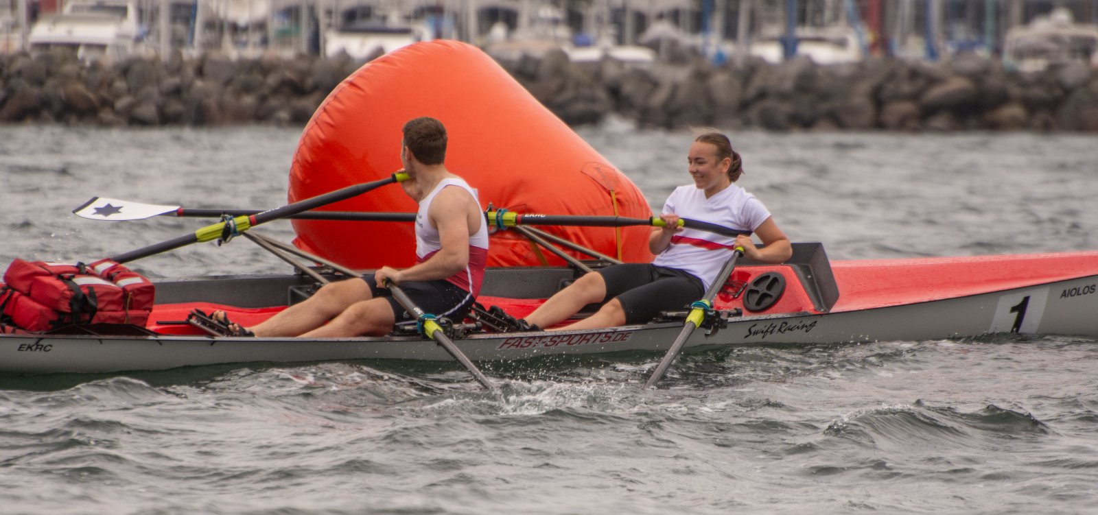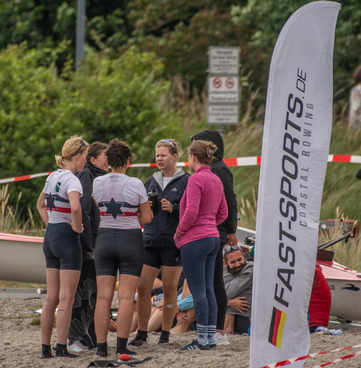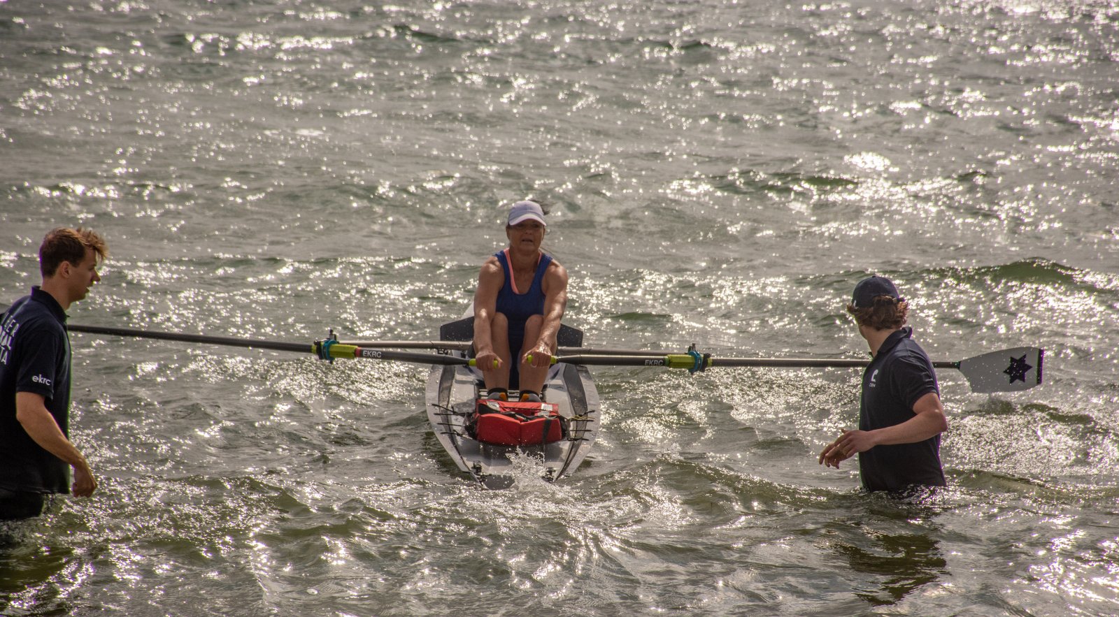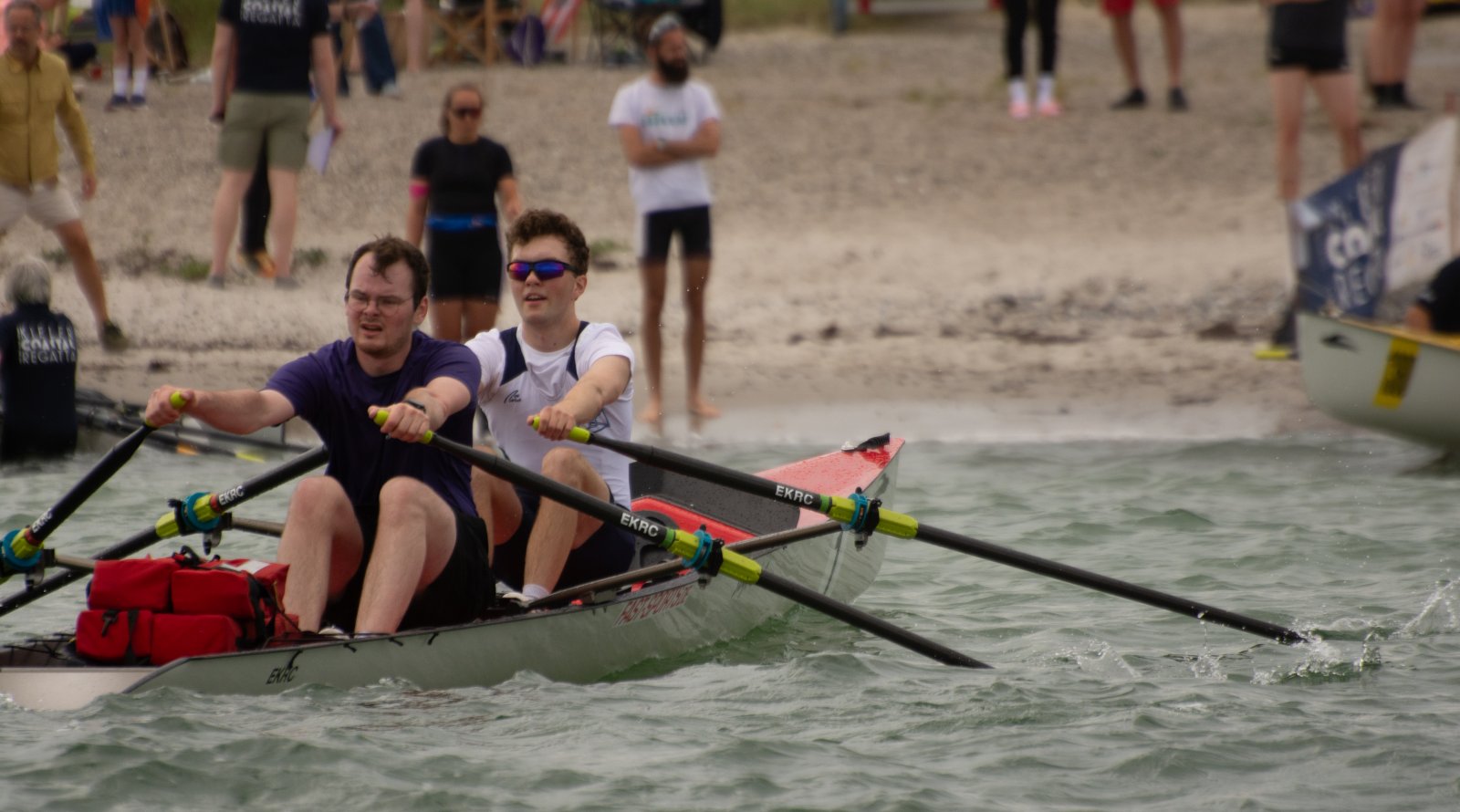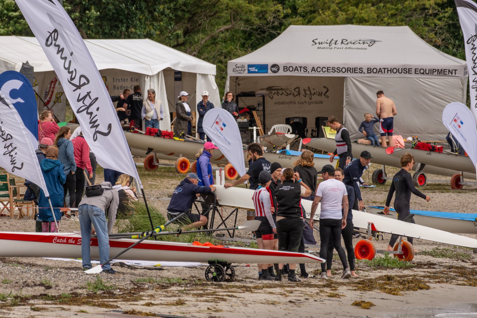 Action oder Abbruch? Diese Frage schwebt am Sonntag über der 4. Kieler Coastal-Regatta, als im Laufe des Tages die Bedingungen von freundlich über zunehmend coastalfreundlich hin zu ungemütlich zu kippen drohen. Ein frischer Ostwind beschert uns Brandung direkt am Strand, welche den Job der Bootshandler am Start zunehmend beschwerlicher werden lassen. Um einen kompletten Abbruch zu umgehen, verkündet die Regattaleitung zum Nachmittag einige Änderungen im Austragungsmodus: Auf den Beachstart wird verzichtet, die Vierrennen werden jeweils auf Zweierfelder gestreckt um das Risiko von Kollisionen zu vermeiden und die Einerstaffeln werden im Vierer ausgefahren – die häufigen Wechsel im Einer bergen zu große Risiken.