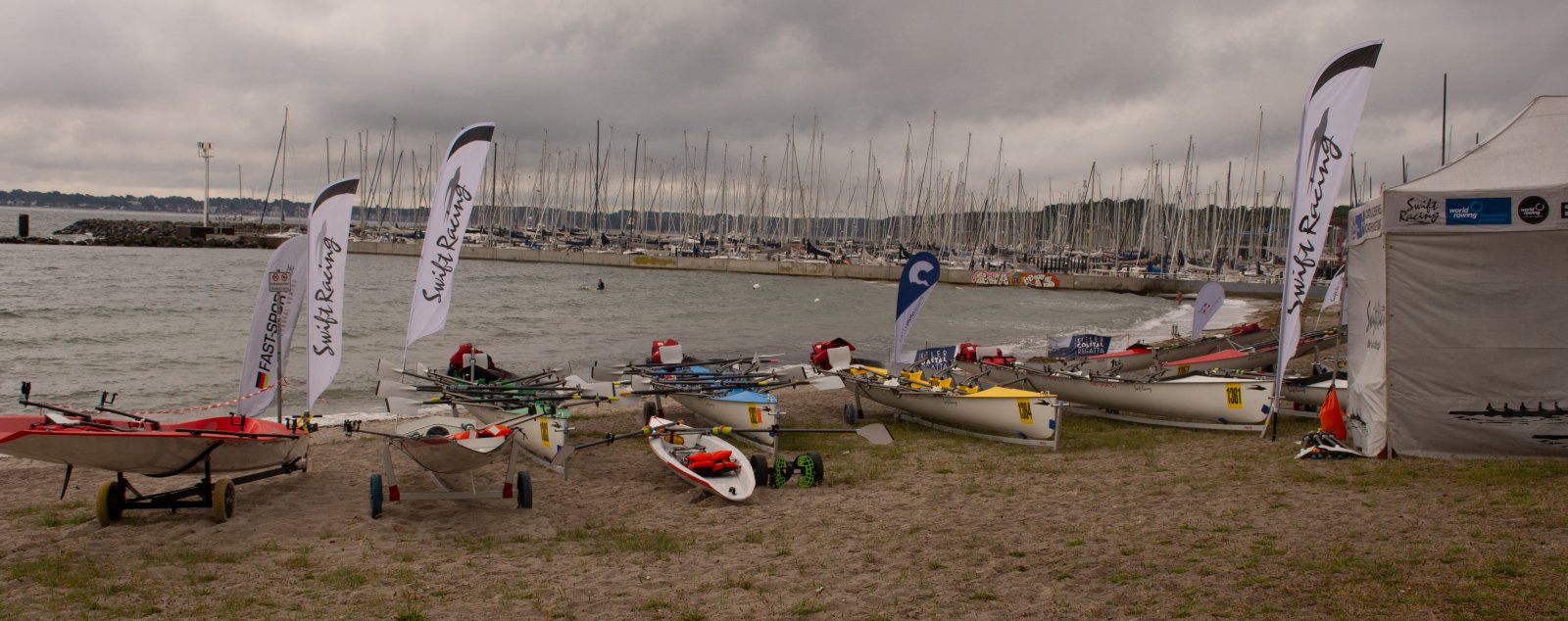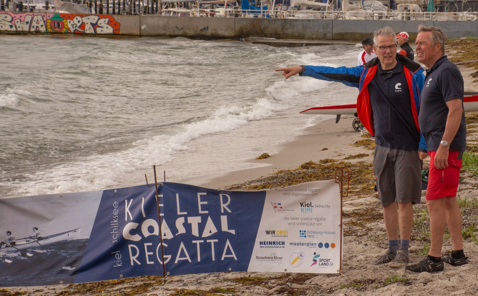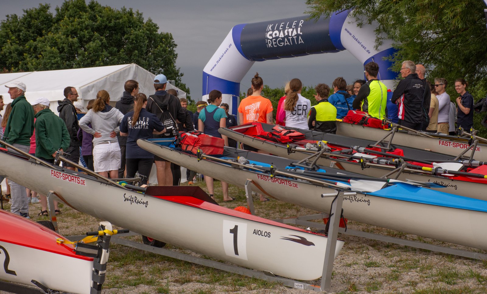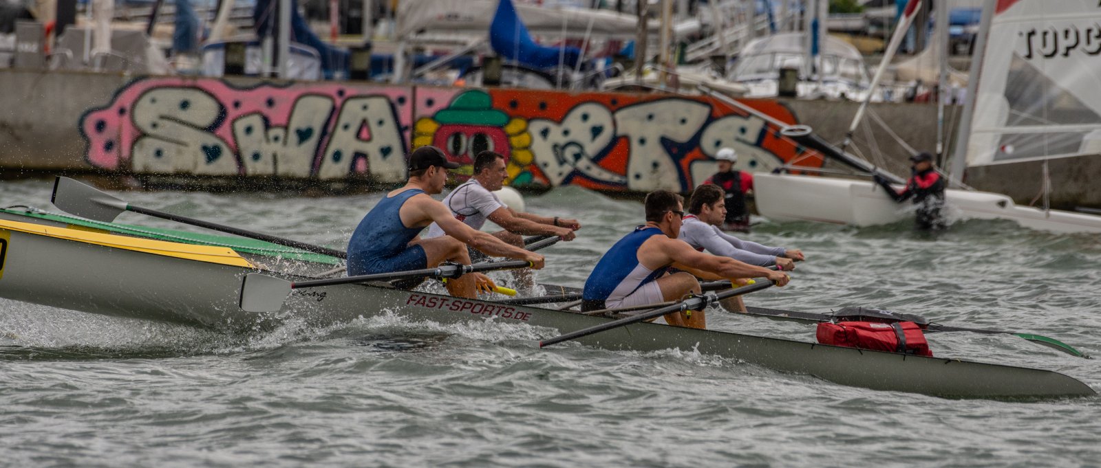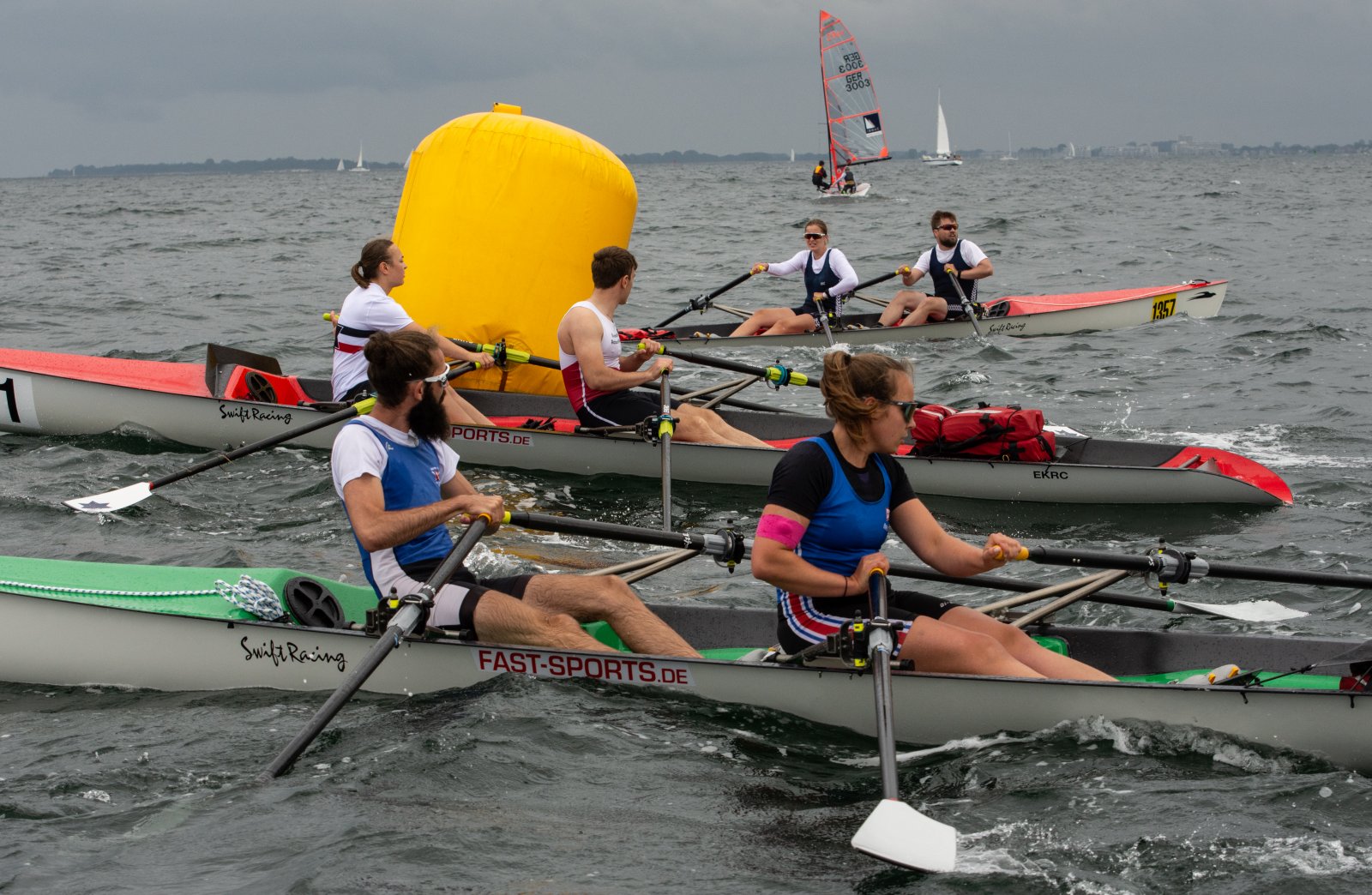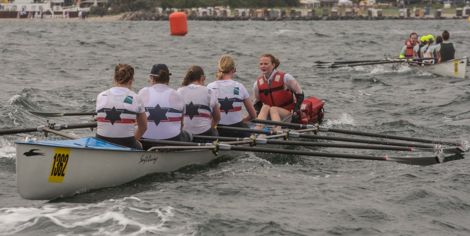 Action oder Abbruch? Diese Frage schwebt am Sonntag über der 4. Kieler Coastal-Regatta, als im Laufe des Tages die Bedingungen von freundlich über zunehmend coastalfreundlich hin zu ungemütlich zu kippen drohen. Ein frischer Ostwind beschert uns Brandung direkt am Strand, welche den Job der Bootshandler am Start zunehmend beschwerlicher werden lassen. Um einen kompletten Abbruch zu umgehen, verkündet die Regattaleitung zum Nachmittag einige Änderungen im Austragungsmodus: Auf den Beachstart wird verzichtet, die Vierrennen werden jeweils auf Zweierfelder gestreckt um das Risiko von Kollisionen zu vermeiden und die Einerstaffeln werden im Vierer ausgefahren – die häufigen Wechsel im Einer bergen zu große Risiken.