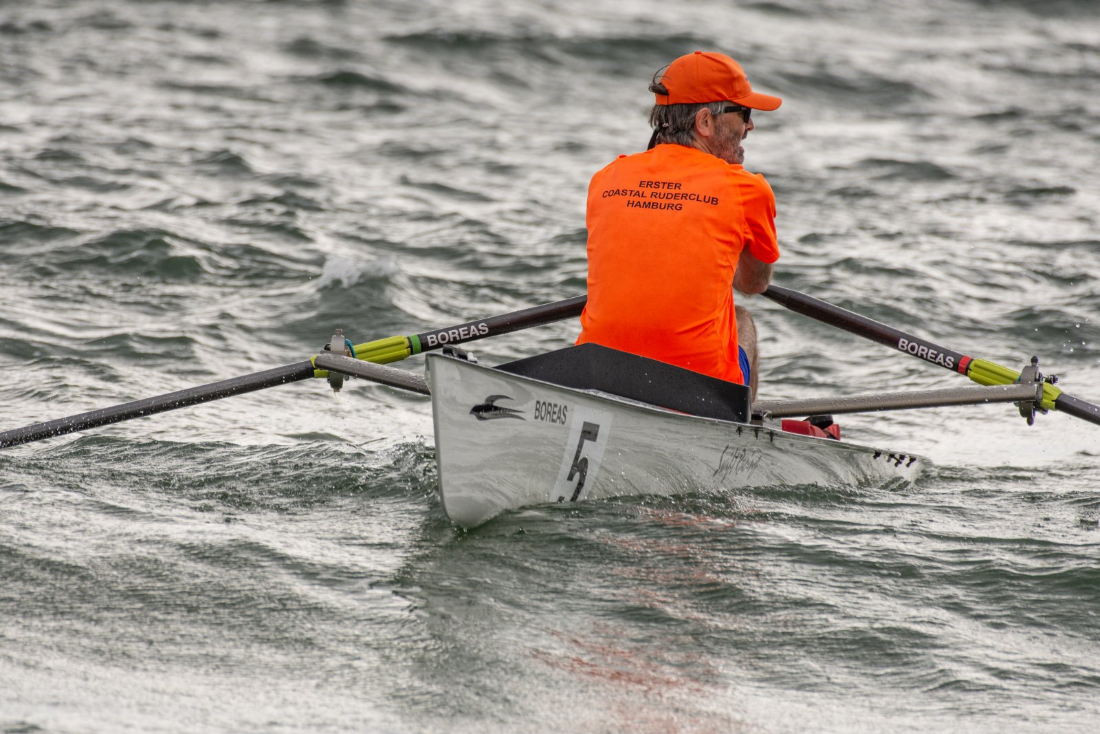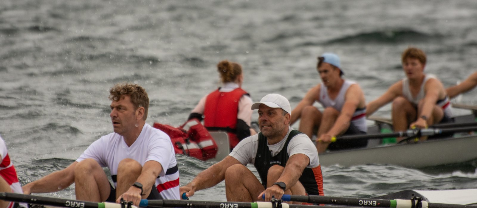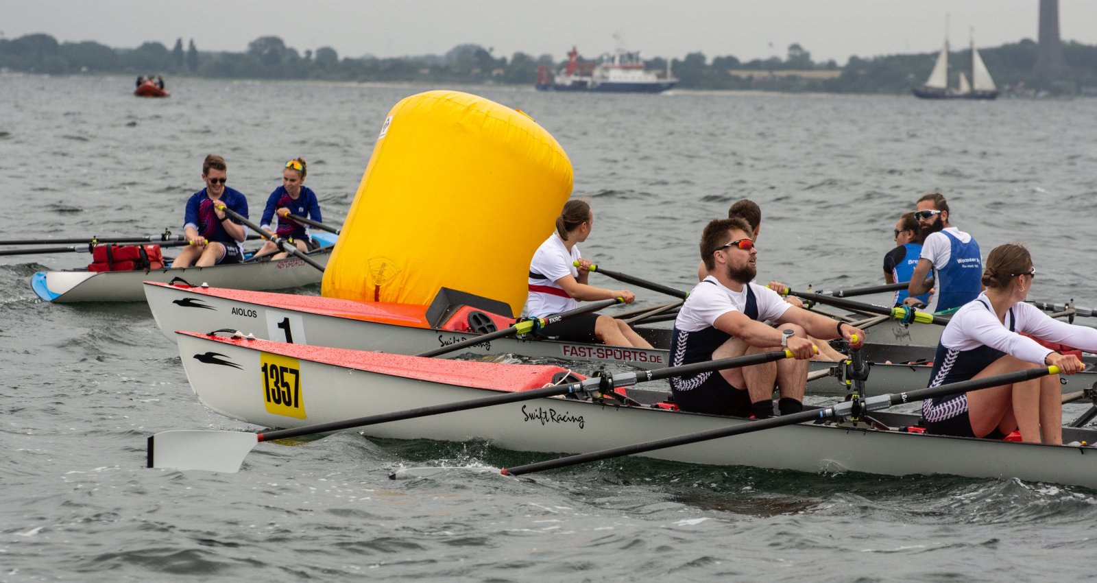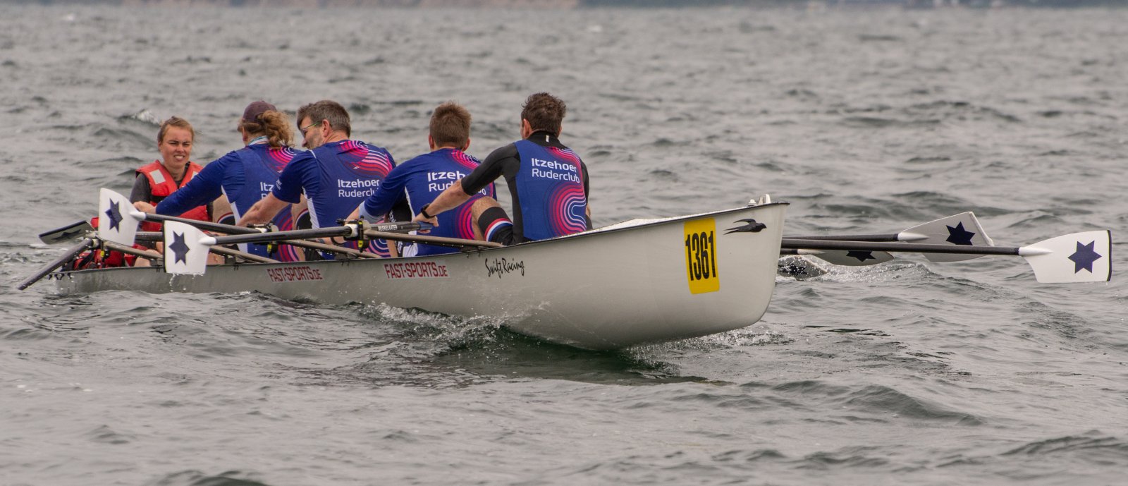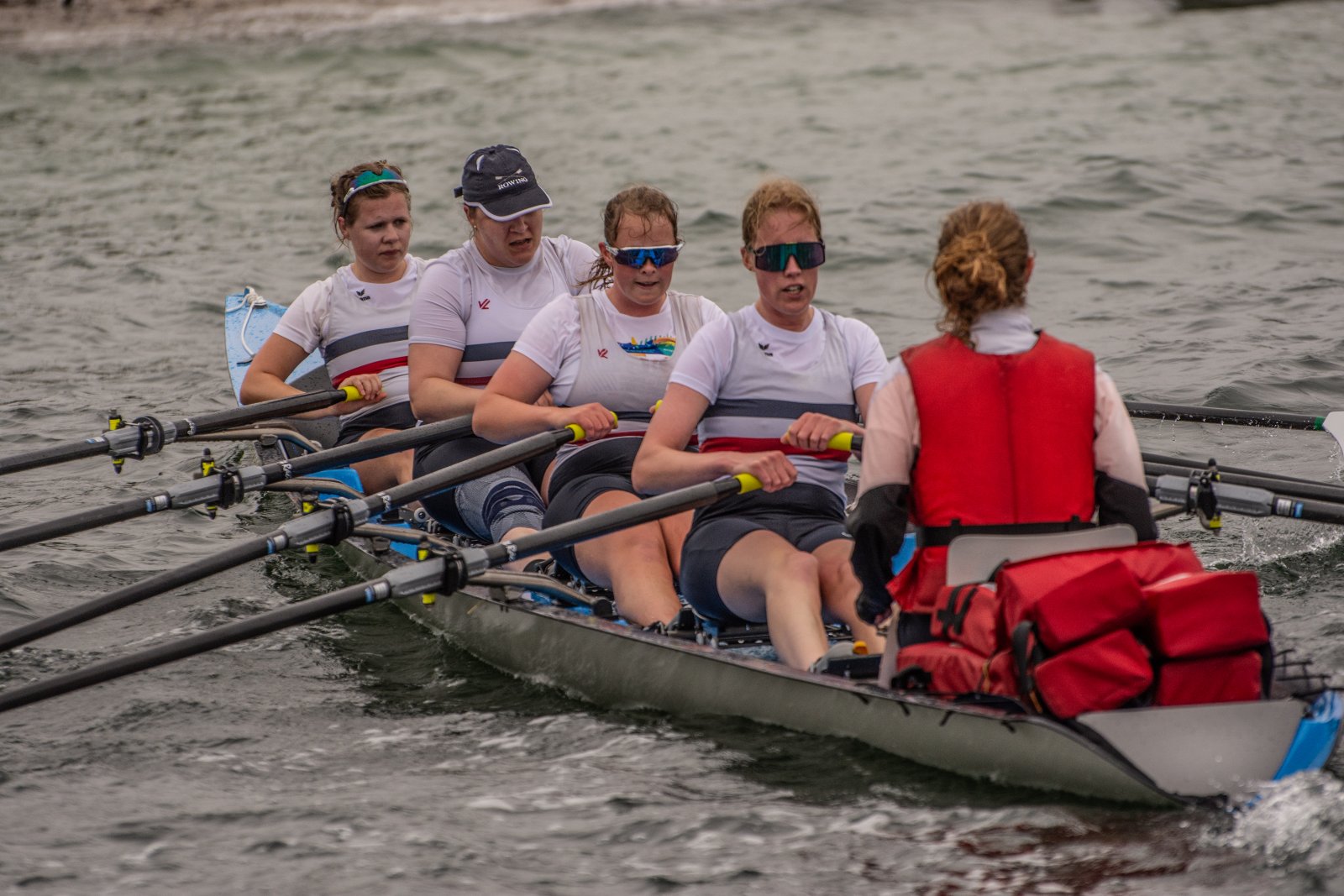 Action oder Abbruch? Diese Frage schwebt am Sonntag über der 4. Kieler Coastal-Regatta, als im Laufe des Tages die Bedingungen von freundlich über zunehmend coastalfreundlich hin zu ungemütlich zu kippen drohen. Ein frischer Ostwind beschert uns Brandung direkt am Strand, welche den Job der Bootshandler am Start zunehmend beschwerlicher werden lassen. Um einen kompletten Abbruch zu umgehen, verkündet die Regattaleitung zum Nachmittag einige Änderungen im Austragungsmodus: Auf den Beachstart wird verzichtet, die Vierrennen werden jeweils auf Zweierfelder gestreckt um das Risiko von Kollisionen zu vermeiden und die Einerstaffeln werden im Vierer ausgefahren – die häufigen Wechsel im Einer bergen zu große Risiken.
