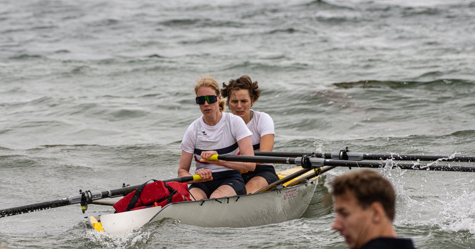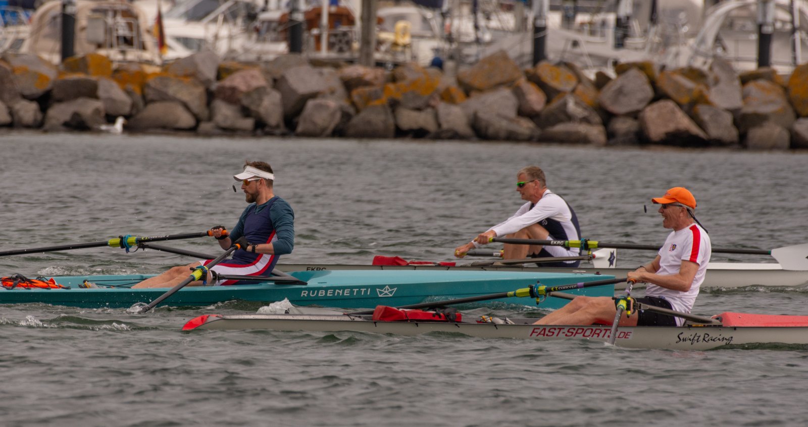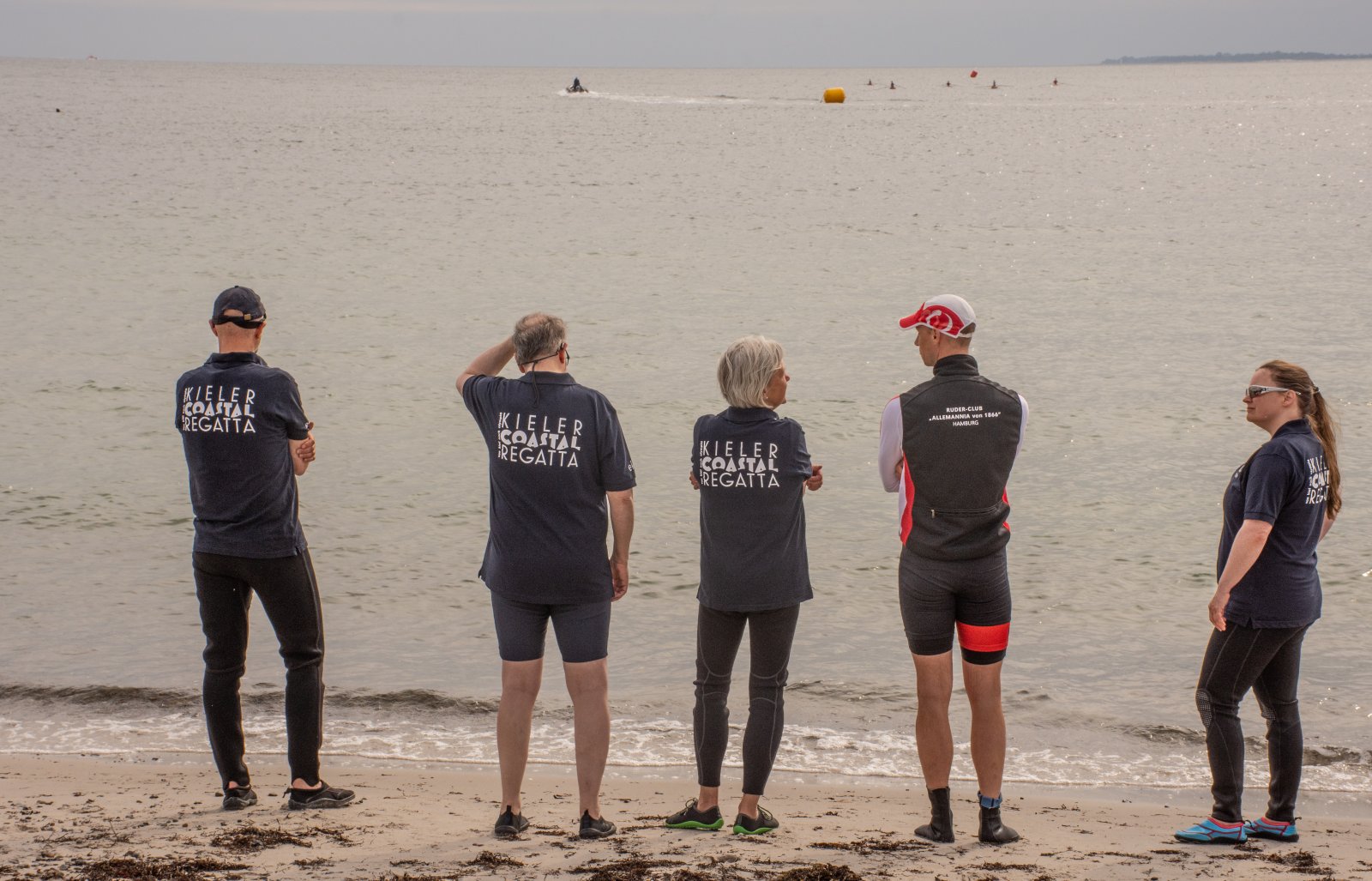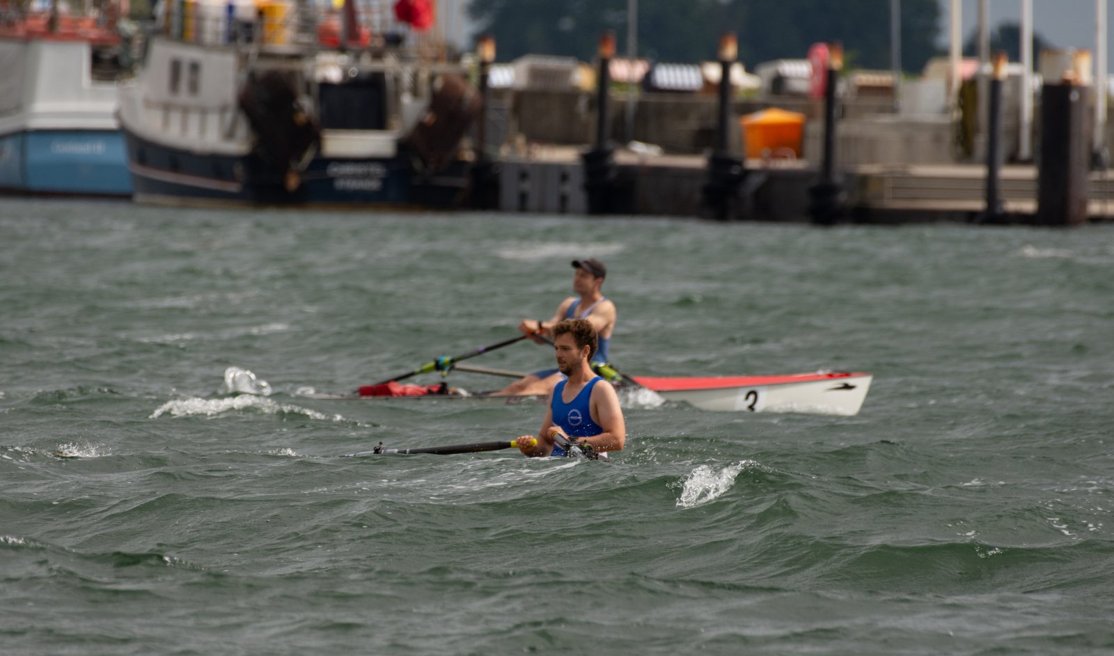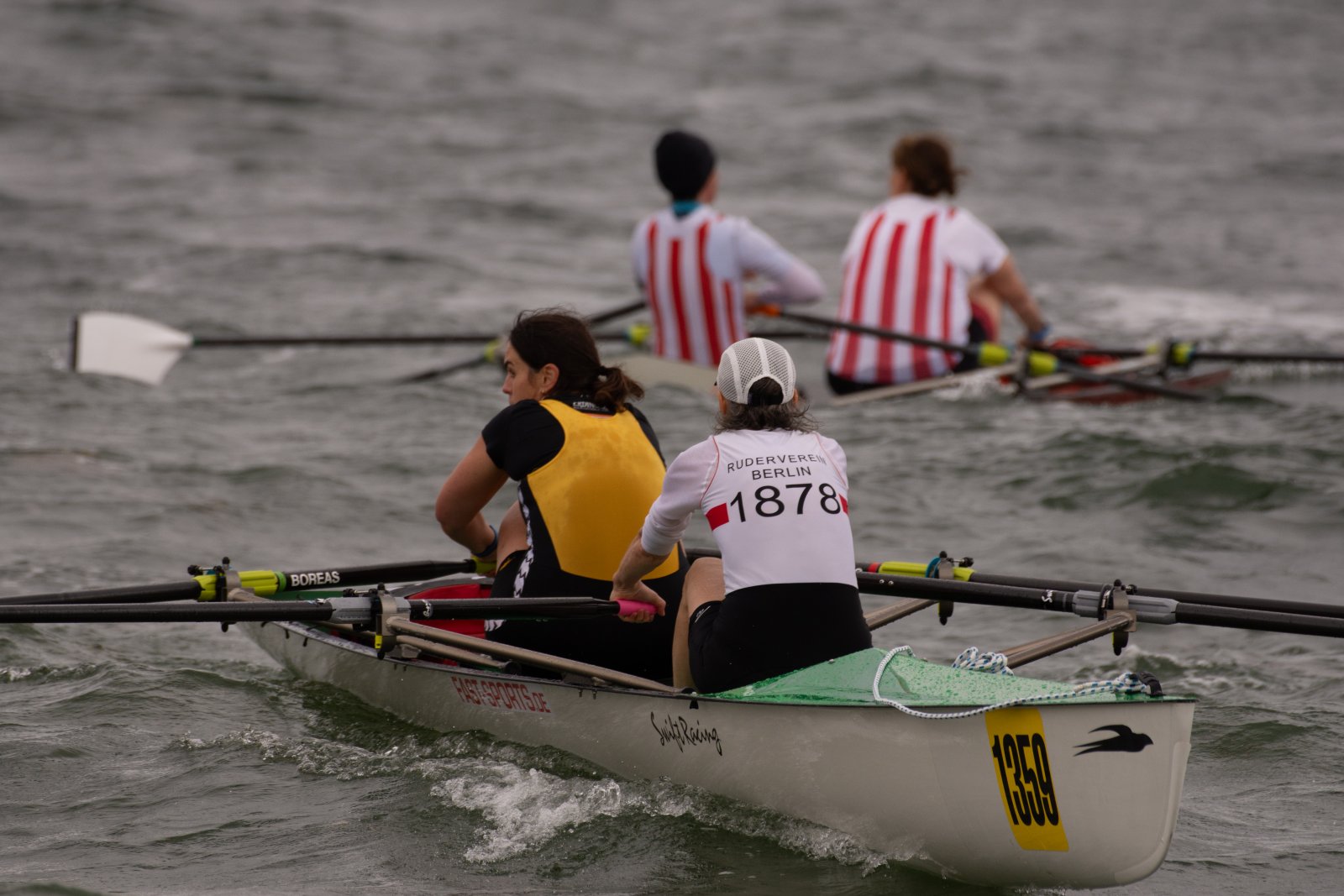 Action oder Abbruch? Diese Frage schwebt am Sonntag über der 4. Kieler Coastal-Regatta, als im Laufe des Tages die Bedingungen von freundlich über zunehmend coastalfreundlich hin zu ungemütlich zu kippen drohen. Ein frischer Ostwind beschert uns Brandung direkt am Strand, welche den Job der Bootshandler am Start zunehmend beschwerlicher werden lassen. Um einen kompletten Abbruch zu umgehen, verkündet die Regattaleitung zum Nachmittag einige Änderungen im Austragungsmodus: Auf den Beachstart wird verzichtet, die Vierrennen werden jeweils auf Zweierfelder gestreckt um das Risiko von Kollisionen zu vermeiden und die Einerstaffeln werden im Vierer ausgefahren – die häufigen Wechsel im Einer bergen zu große Risiken.