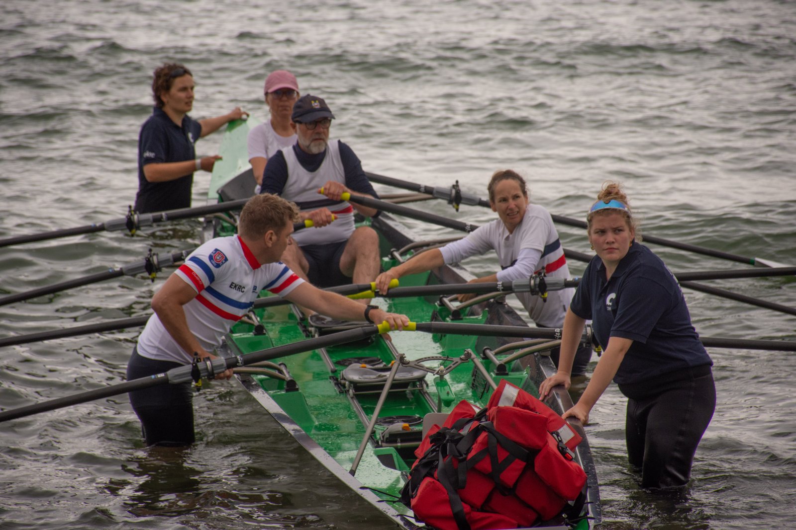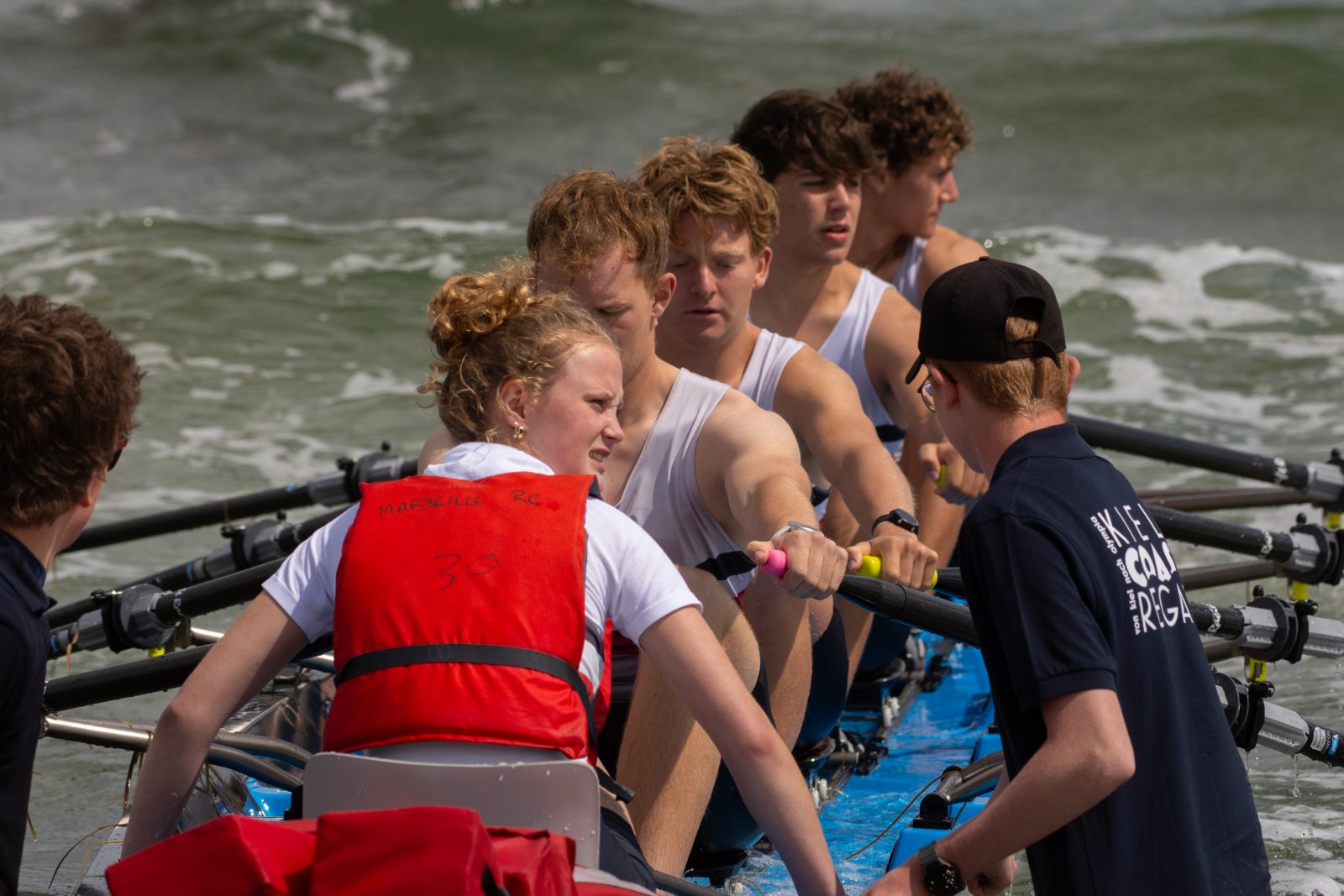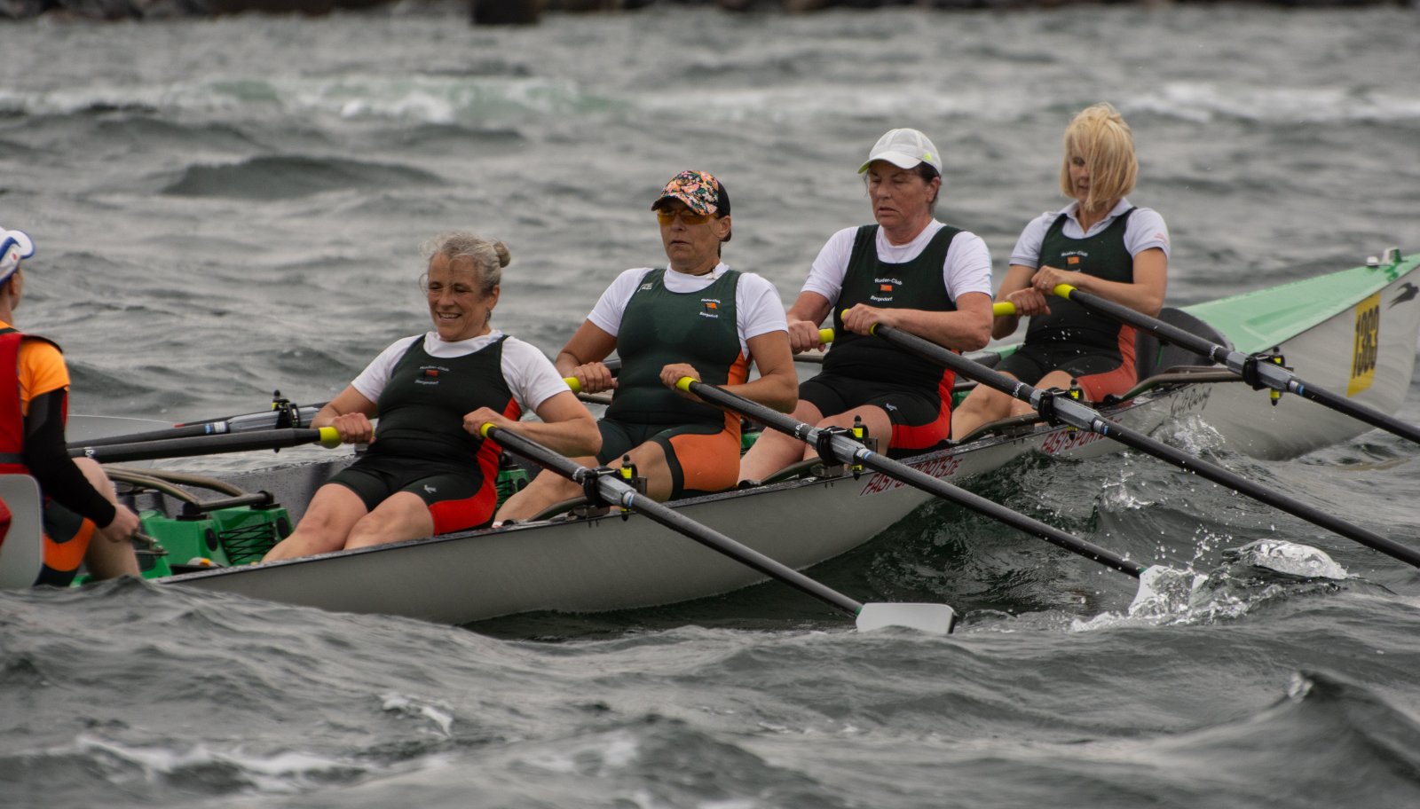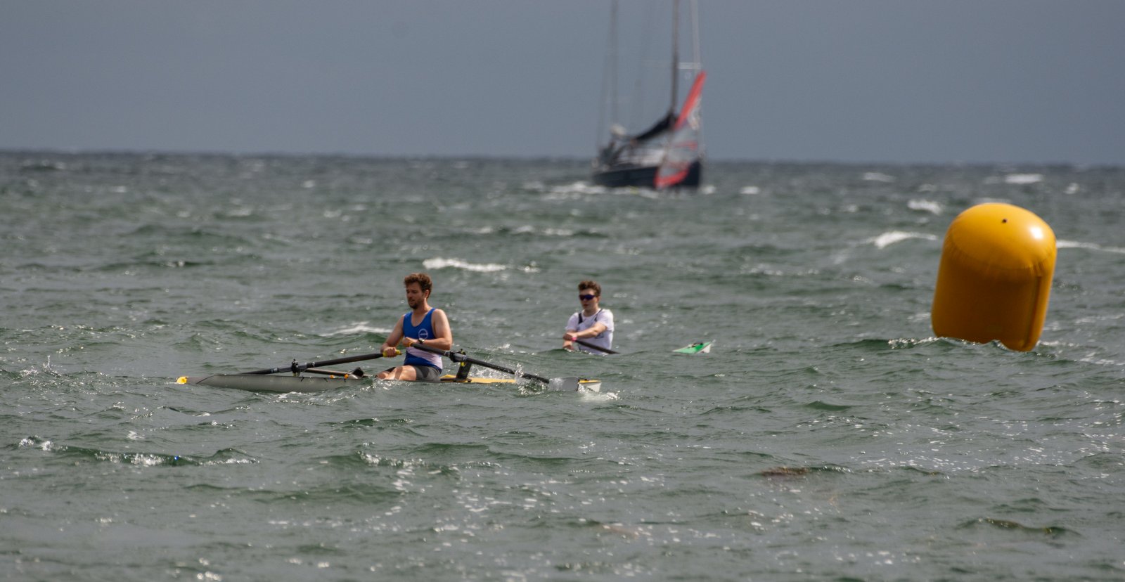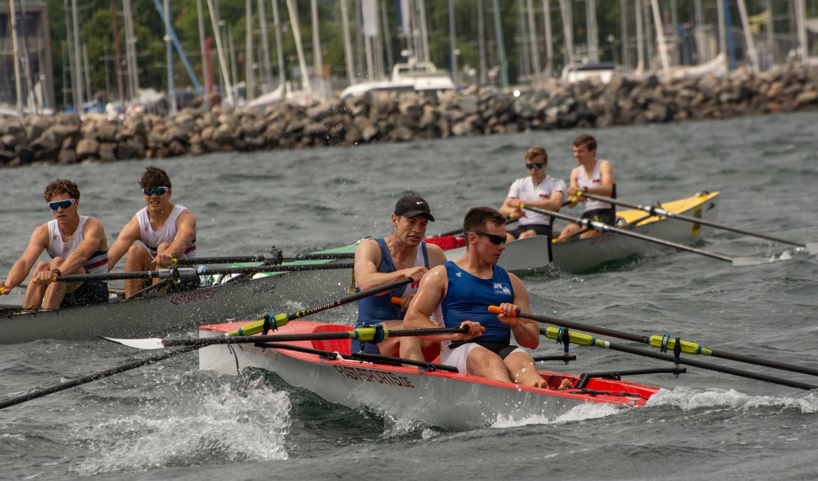 Action oder Abbruch? Diese Frage schwebt am Sonntag über der 4. Kieler Coastal-Regatta, als im Laufe des Tages die Bedingungen von freundlich über zunehmend coastalfreundlich hin zu ungemütlich zu kippen drohen. Ein frischer Ostwind beschert uns Brandung direkt am Strand, welche den Job der Bootshandler am Start zunehmend beschwerlicher werden lassen. Um einen kompletten Abbruch zu umgehen, verkündet die Regattaleitung zum Nachmittag einige Änderungen im Austragungsmodus: Auf den Beachstart wird verzichtet, die Vierrennen werden jeweils auf Zweierfelder gestreckt um das Risiko von Kollisionen zu vermeiden und die Einerstaffeln werden im Vierer ausgefahren – die häufigen Wechsel im Einer bergen zu große Risiken.