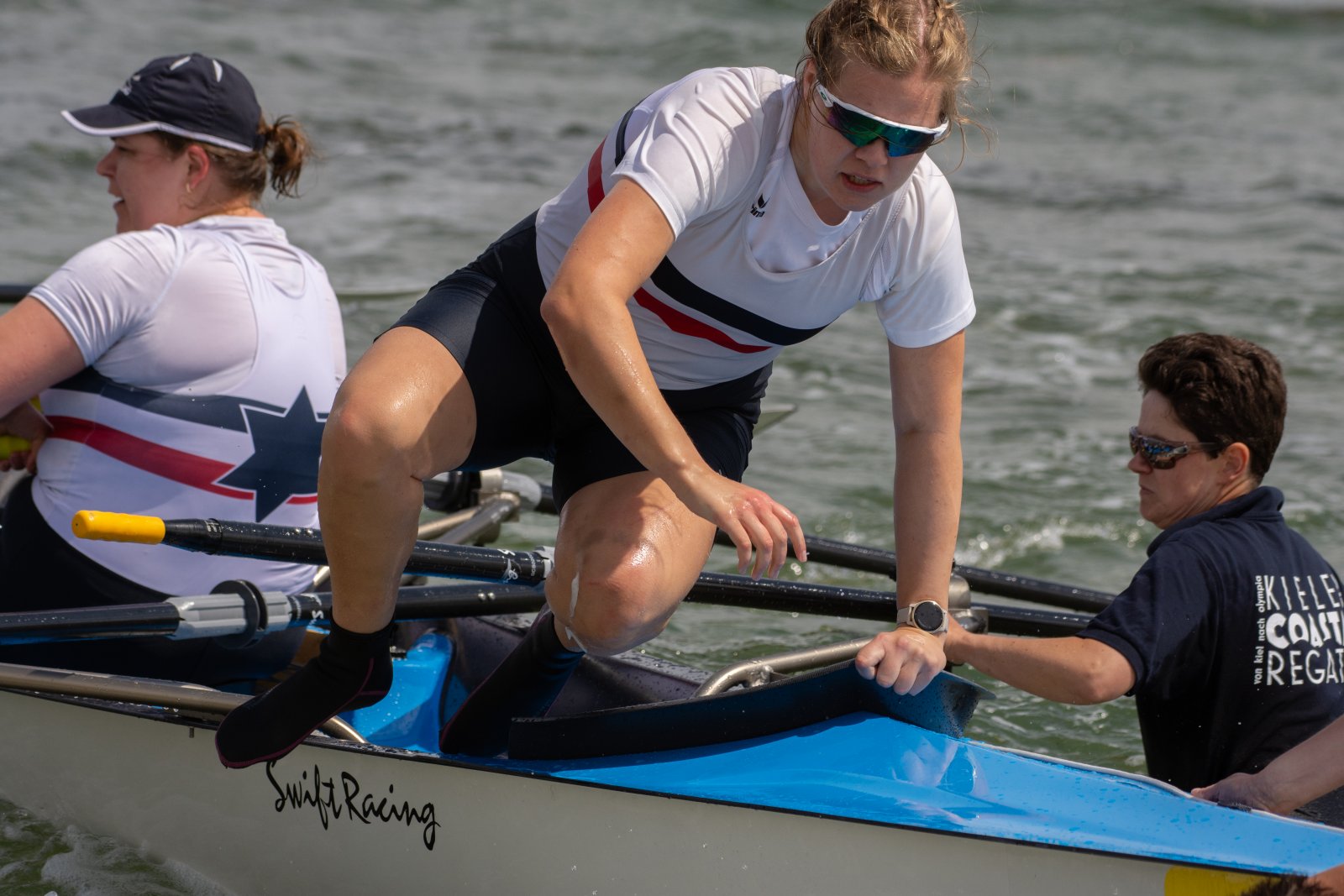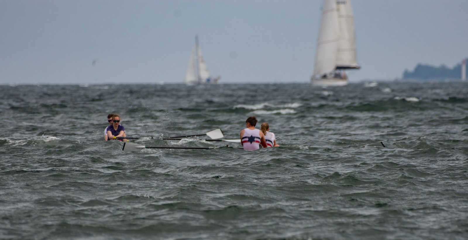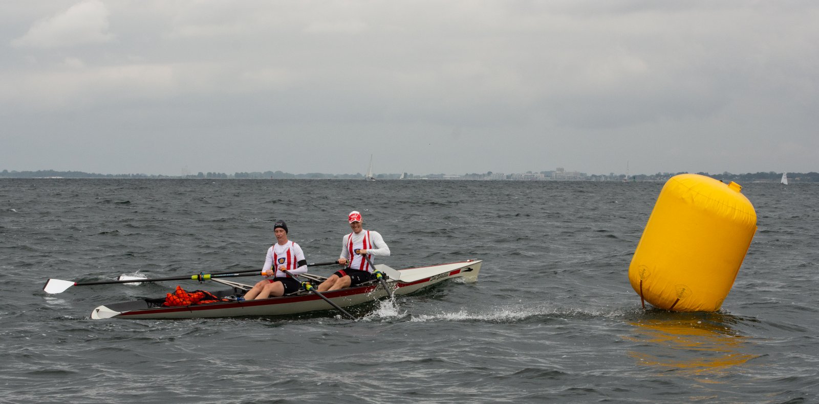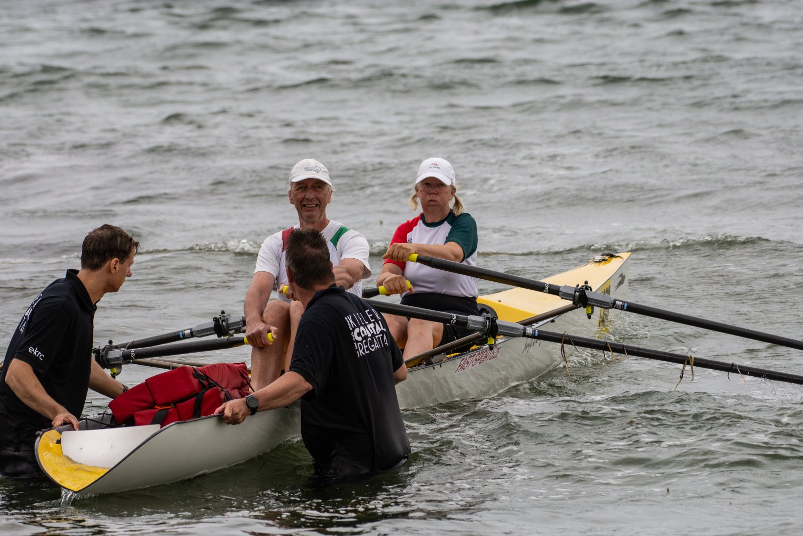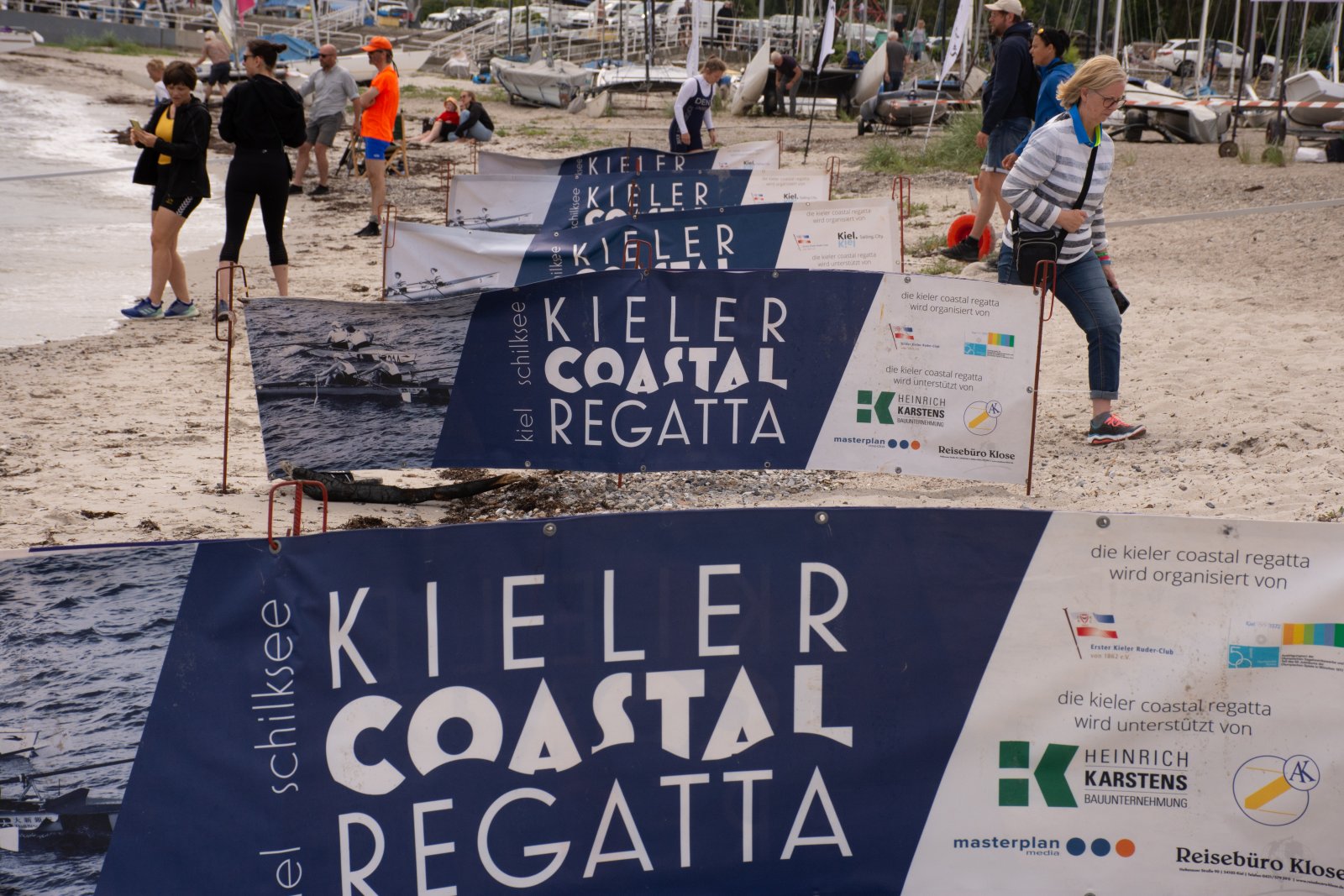Action oder Abbruch? Diese Frage schwebt am Sonntag über der 4. Kieler Coastal-Regatta, als im Laufe des Tages die Bedingungen von freundlich über zunehmend coastalfreundlich hin zu ungemütlich zu kippen drohen. Ein frischer Ostwind beschert uns Brandung direkt am Strand, welche den Job der Bootshandler am Start zunehmend beschwerlicher werden lassen. Um einen kompletten Abbruch zu umgehen, verkündet die Regattaleitung zum Nachmittag einige Änderungen im Austragungsmodus: Auf den Beachstart wird verzichtet, die Vierrennen werden jeweils auf Zweierfelder gestreckt um das Risiko von Kollisionen zu vermeiden und die Einerstaffeln werden im Vierer ausgefahren – die häufigen Wechsel im Einer bergen zu große Risiken.