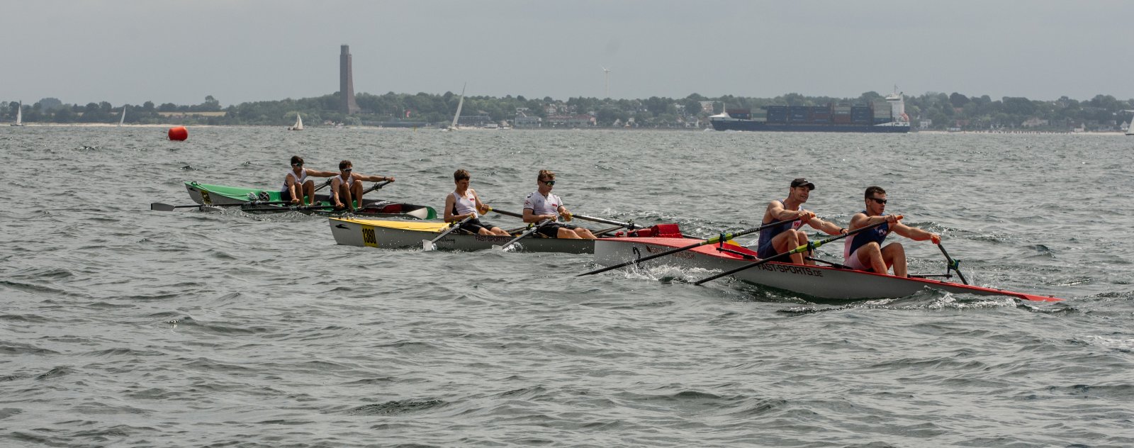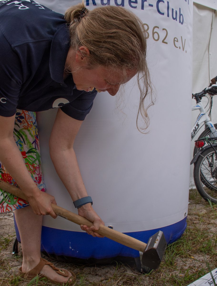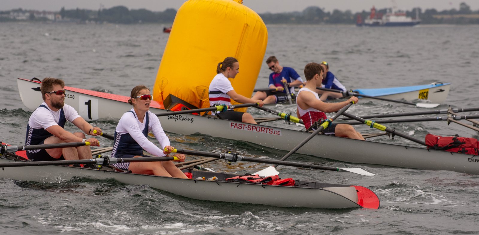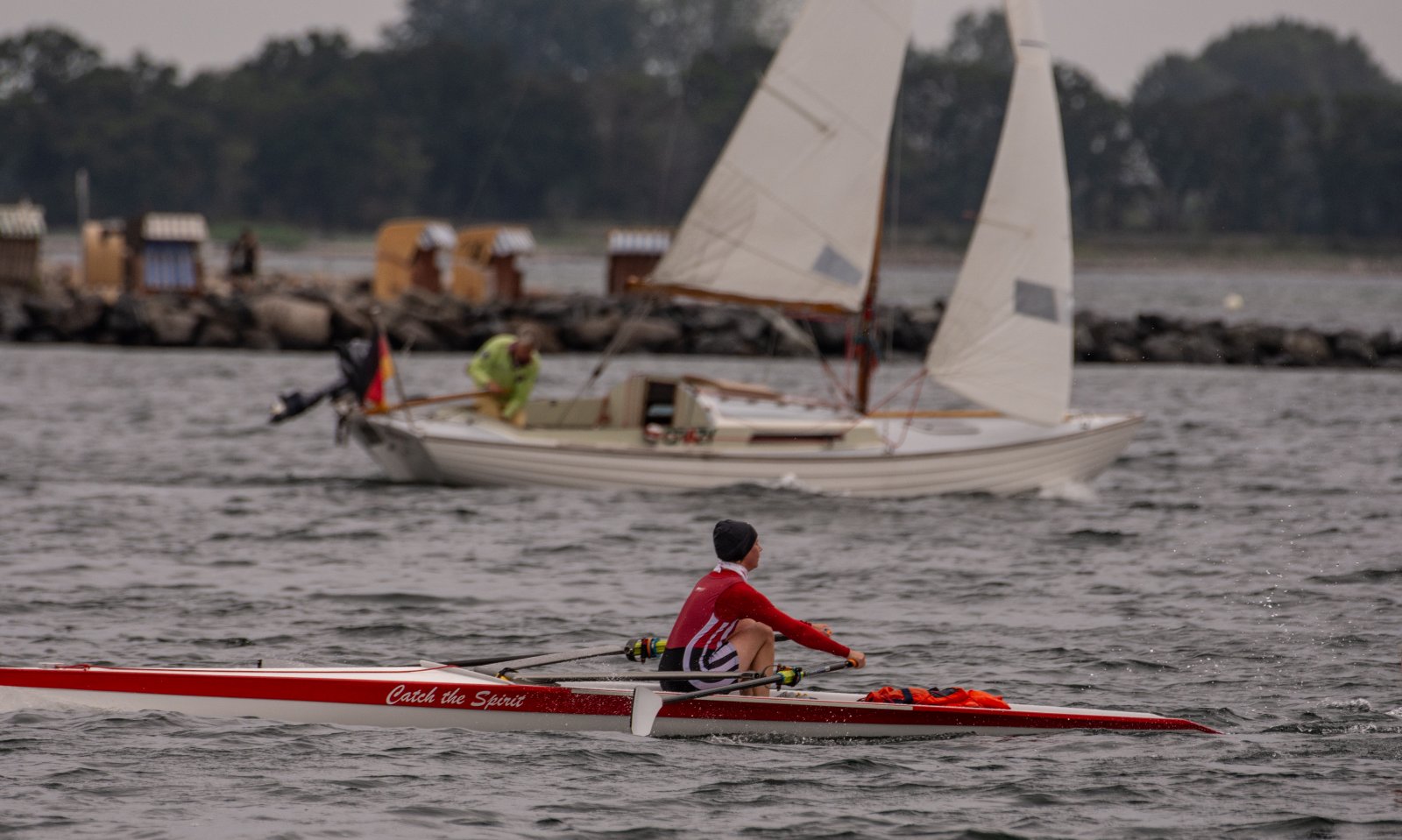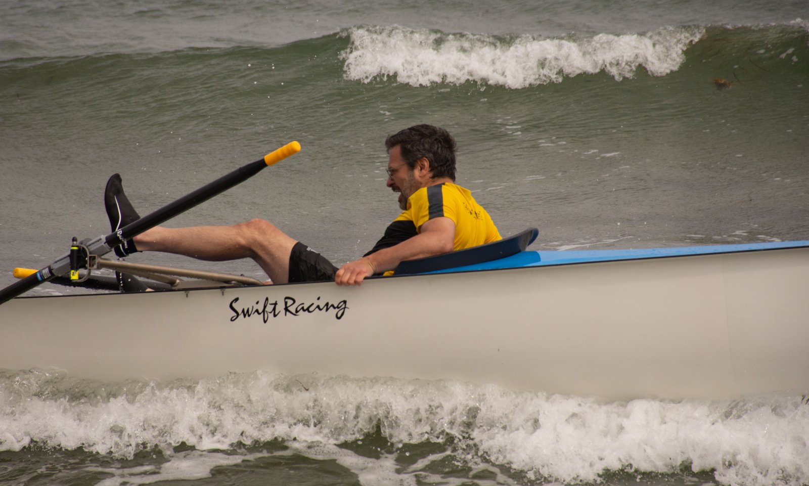 Action oder Abbruch? Diese Frage schwebt am Sonntag über der 4. Kieler Coastal-Regatta, als im Laufe des Tages die Bedingungen von freundlich über zunehmend coastalfreundlich hin zu ungemütlich zu kippen drohen. Ein frischer Ostwind beschert uns Brandung direkt am Strand, welche den Job der Bootshandler am Start zunehmend beschwerlicher werden lassen. Um einen kompletten Abbruch zu umgehen, verkündet die Regattaleitung zum Nachmittag einige Änderungen im Austragungsmodus: Auf den Beachstart wird verzichtet, die Vierrennen werden jeweils auf Zweierfelder gestreckt um das Risiko von Kollisionen zu vermeiden und die Einerstaffeln werden im Vierer ausgefahren – die häufigen Wechsel im Einer bergen zu große Risiken.