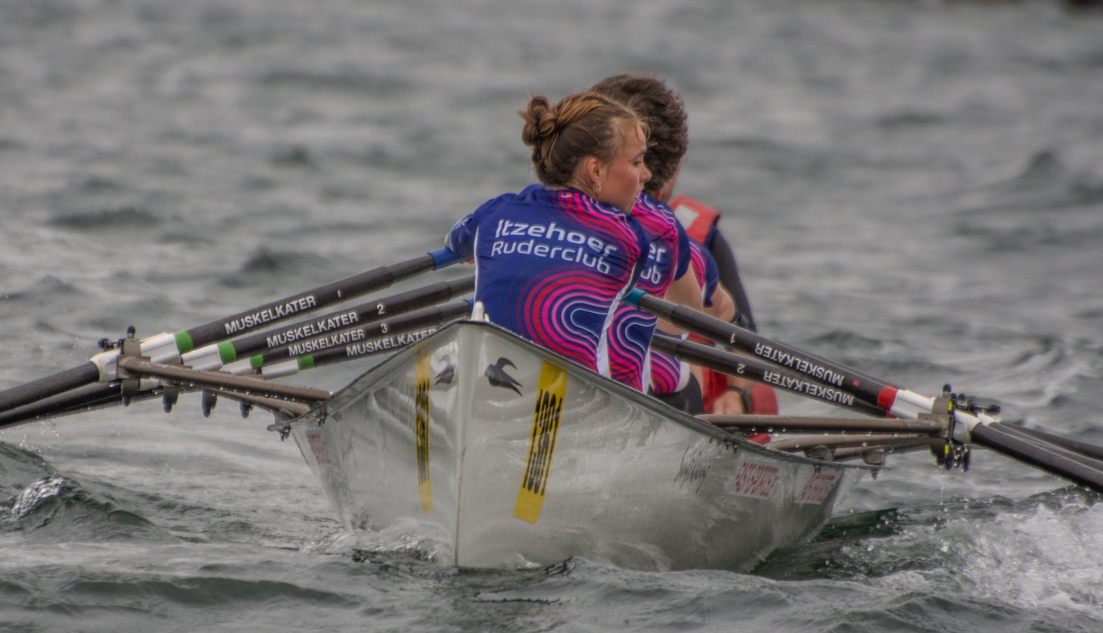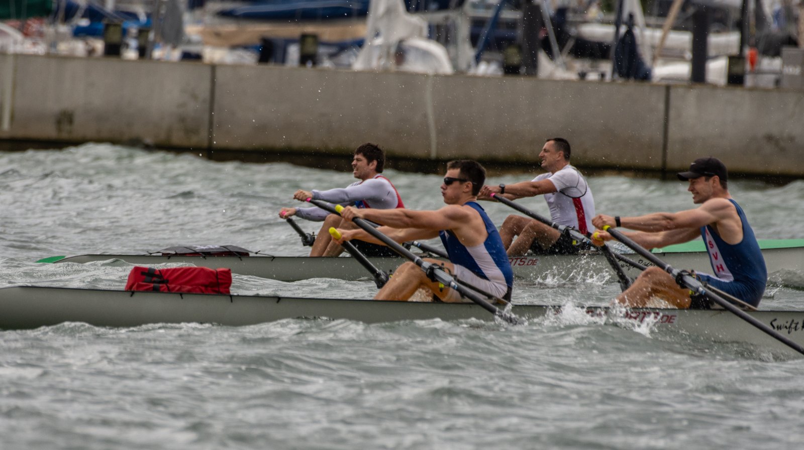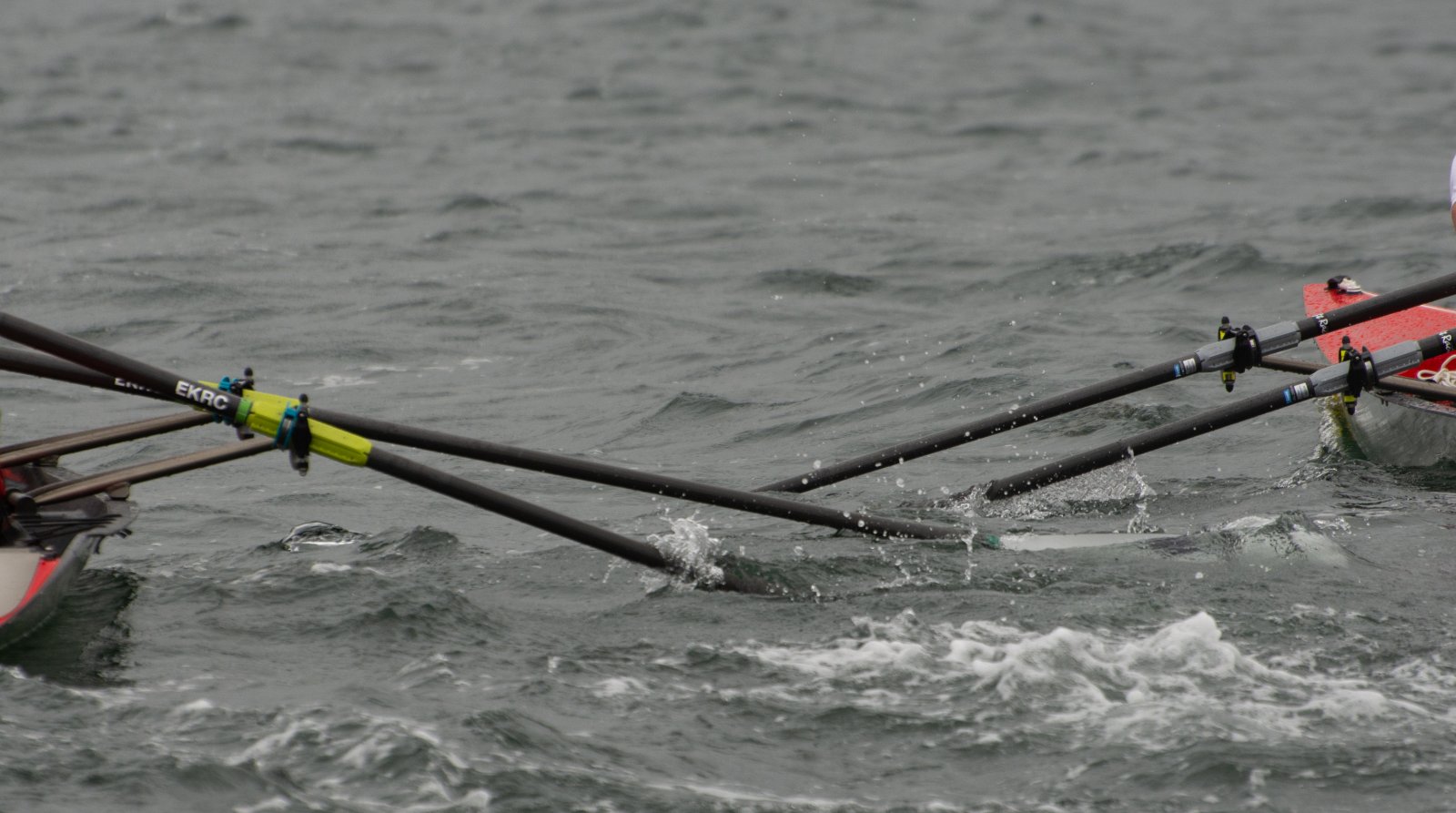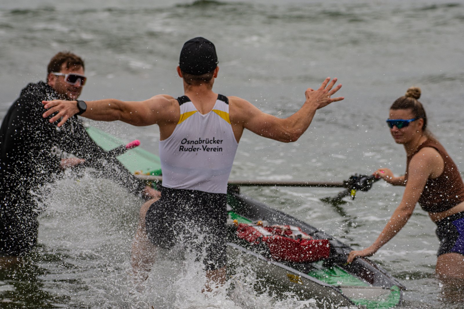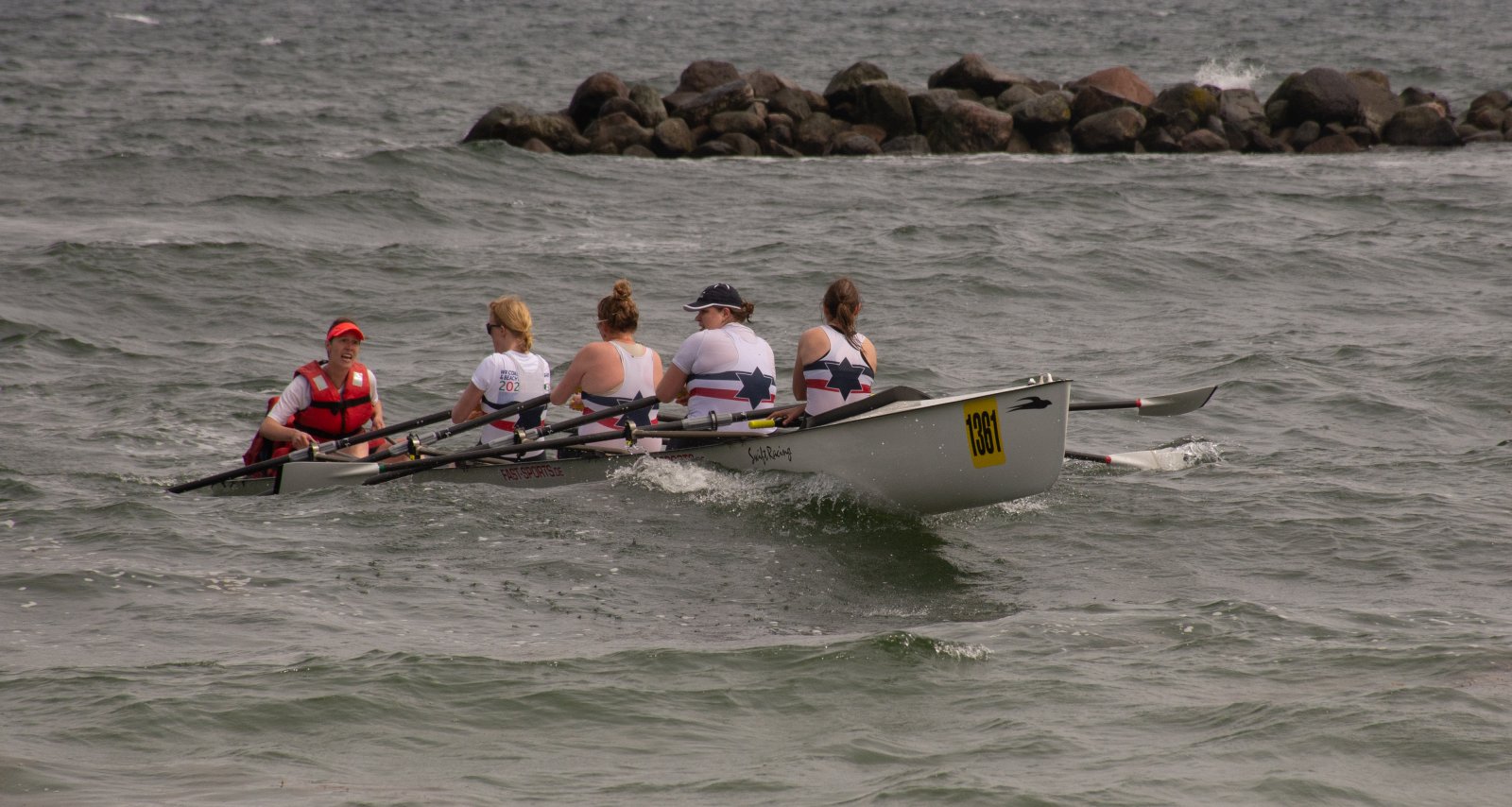 Action oder Abbruch? Diese Frage schwebt am Sonntag über der 4. Kieler Coastal-Regatta, als im Laufe des Tages die Bedingungen von freundlich über zunehmend coastalfreundlich hin zu ungemütlich zu kippen drohen. Ein frischer Ostwind beschert uns Brandung direkt am Strand, welche den Job der Bootshandler am Start zunehmend beschwerlicher werden lassen. Um einen kompletten Abbruch zu umgehen, verkündet die Regattaleitung zum Nachmittag einige Änderungen im Austragungsmodus: Auf den Beachstart wird verzichtet, die Vierrennen werden jeweils auf Zweierfelder gestreckt um das Risiko von Kollisionen zu vermeiden und die Einerstaffeln werden im Vierer ausgefahren – die häufigen Wechsel im Einer bergen zu große Risiken.