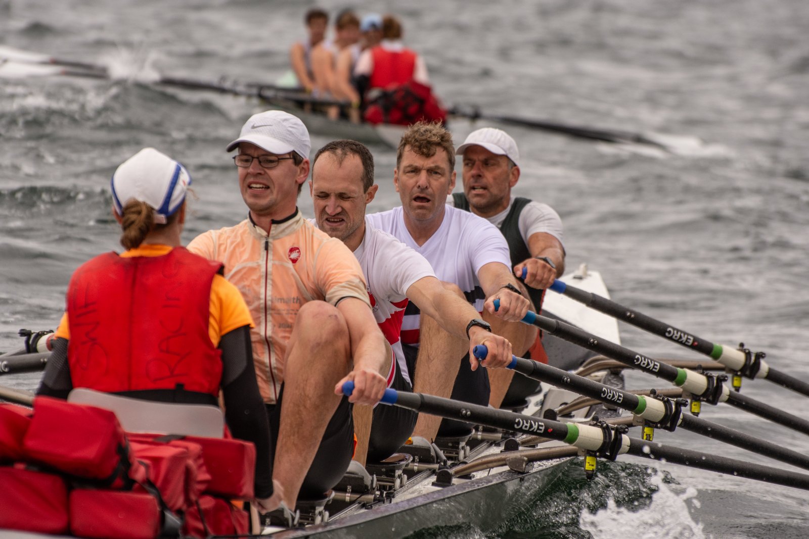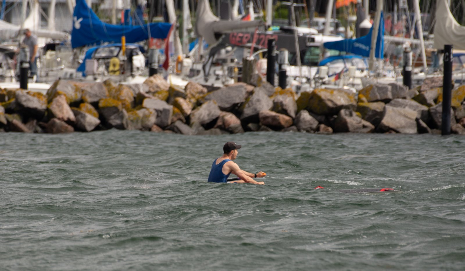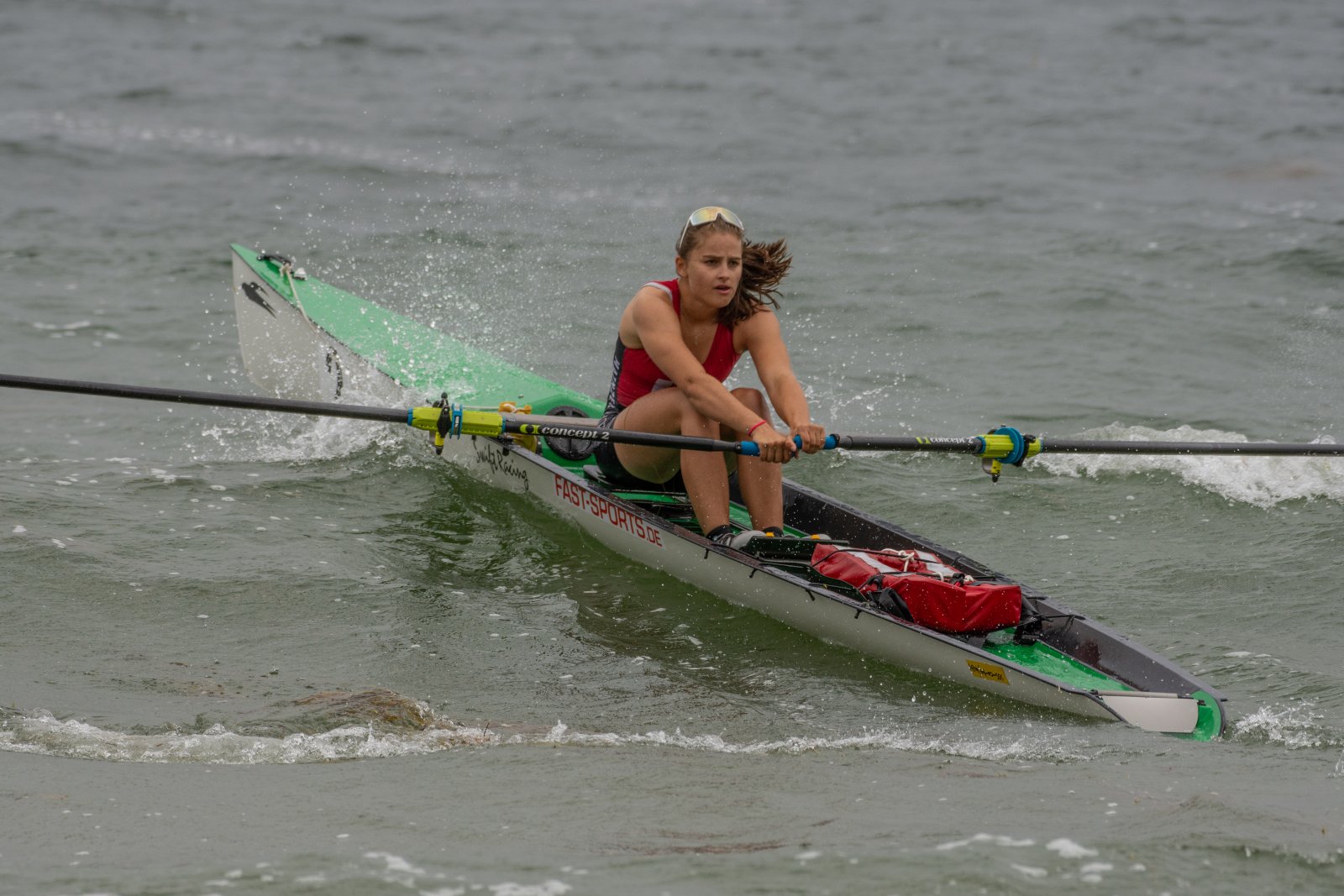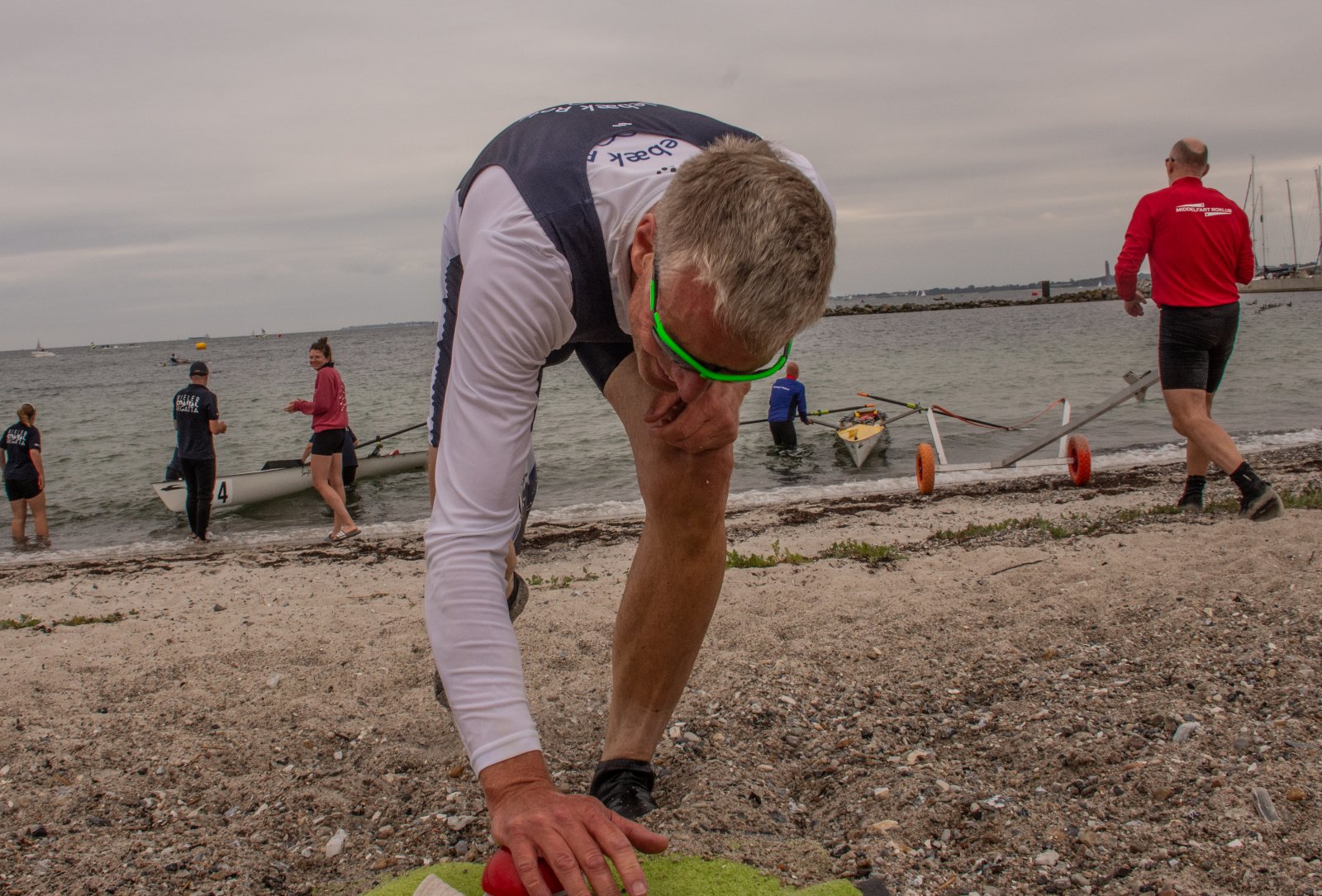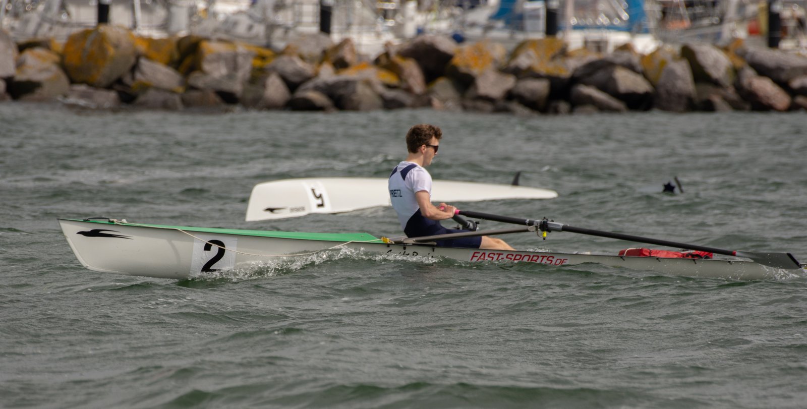 Action oder Abbruch? Diese Frage schwebt am Sonntag über der 4. Kieler Coastal-Regatta, als im Laufe des Tages die Bedingungen von freundlich über zunehmend coastalfreundlich hin zu ungemütlich zu kippen drohen. Ein frischer Ostwind beschert uns Brandung direkt am Strand, welche den Job der Bootshandler am Start zunehmend beschwerlicher werden lassen. Um einen kompletten Abbruch zu umgehen, verkündet die Regattaleitung zum Nachmittag einige Änderungen im Austragungsmodus: Auf den Beachstart wird verzichtet, die Vierrennen werden jeweils auf Zweierfelder gestreckt um das Risiko von Kollisionen zu vermeiden und die Einerstaffeln werden im Vierer ausgefahren – die häufigen Wechsel im Einer bergen zu große Risiken.