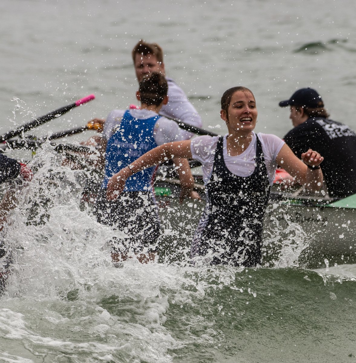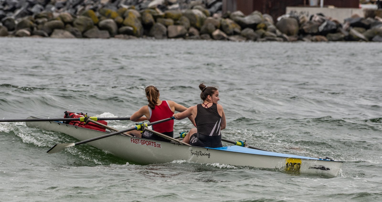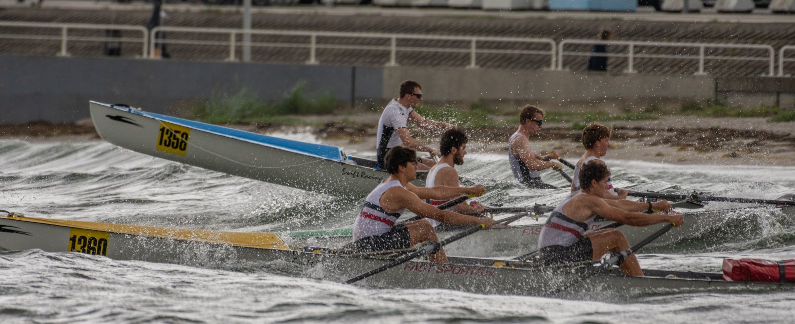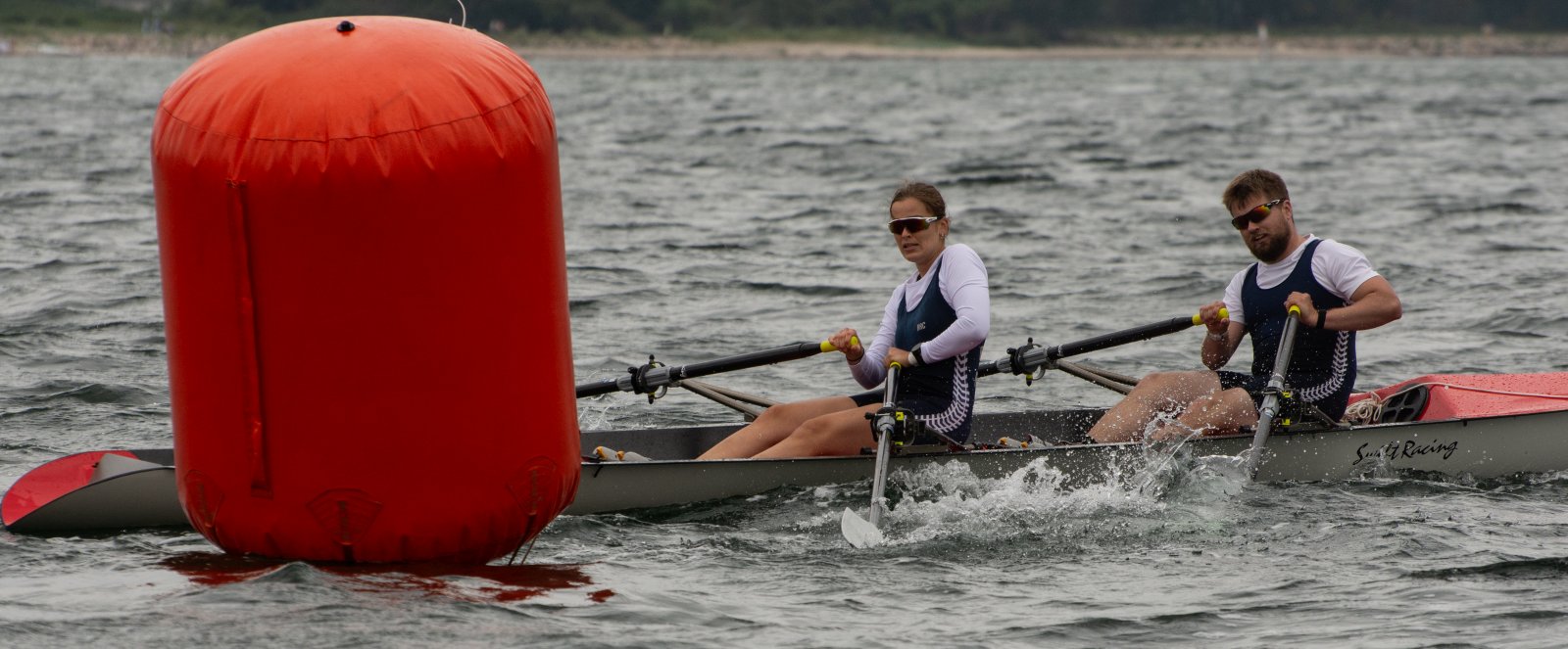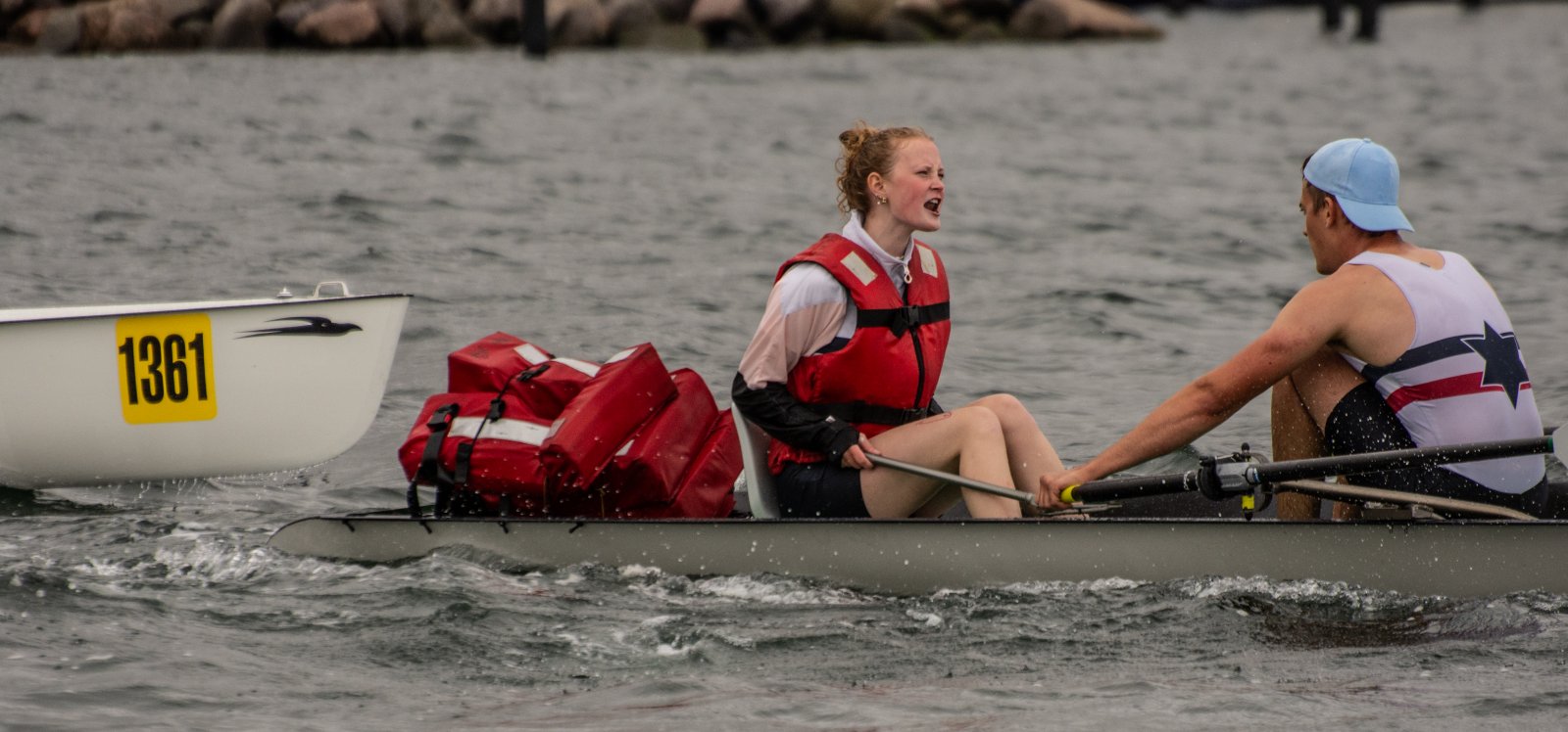 Action oder Abbruch? Diese Frage schwebt am Sonntag über der 4. Kieler Coastal-Regatta, als im Laufe des Tages die Bedingungen von freundlich über zunehmend coastalfreundlich hin zu ungemütlich zu kippen drohen. Ein frischer Ostwind beschert uns Brandung direkt am Strand, welche den Job der Bootshandler am Start zunehmend beschwerlicher werden lassen. Um einen kompletten Abbruch zu umgehen, verkündet die Regattaleitung zum Nachmittag einige Änderungen im Austragungsmodus: Auf den Beachstart wird verzichtet, die Vierrennen werden jeweils auf Zweierfelder gestreckt um das Risiko von Kollisionen zu vermeiden und die Einerstaffeln werden im Vierer ausgefahren – die häufigen Wechsel im Einer bergen zu große Risiken.