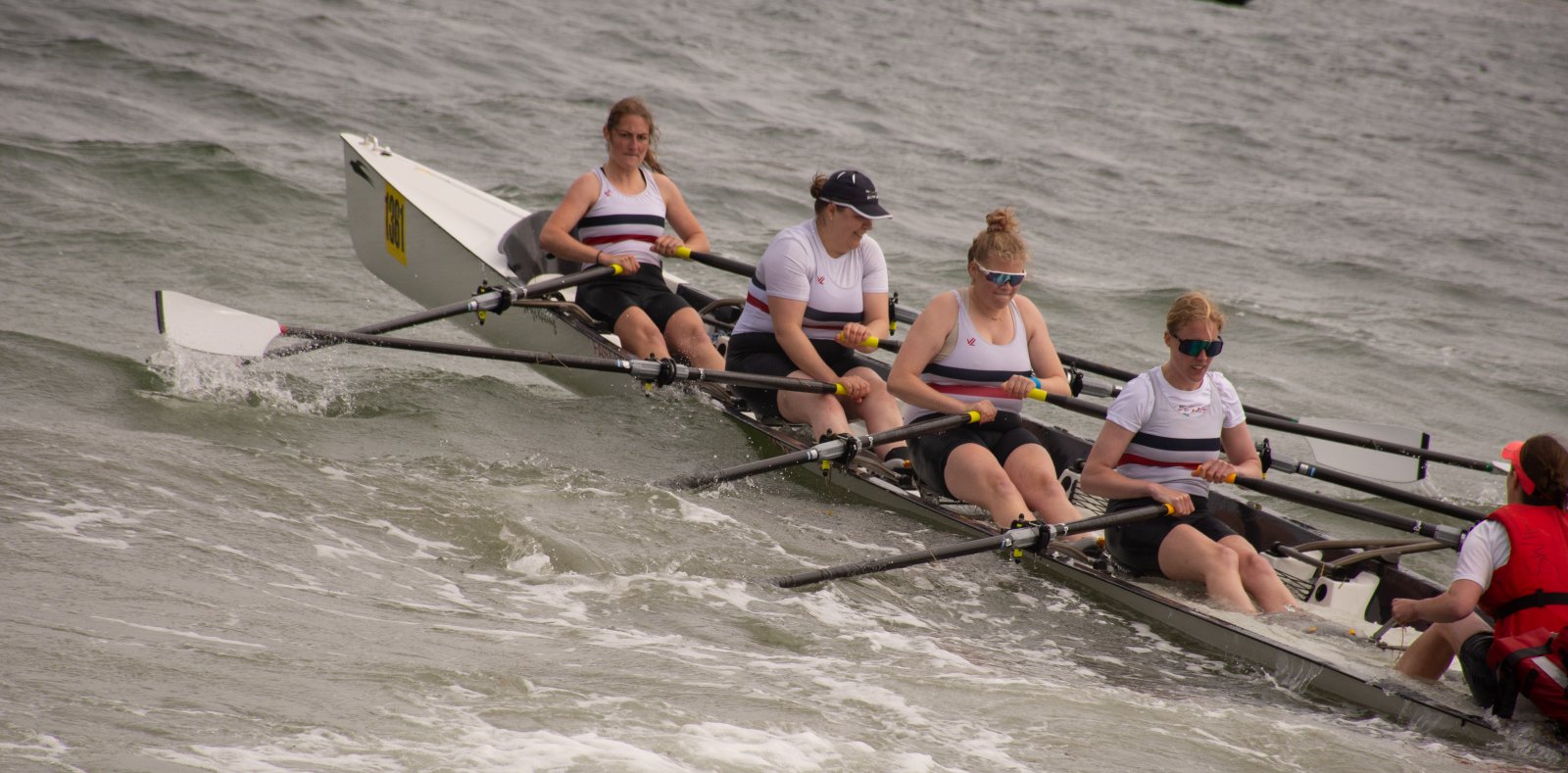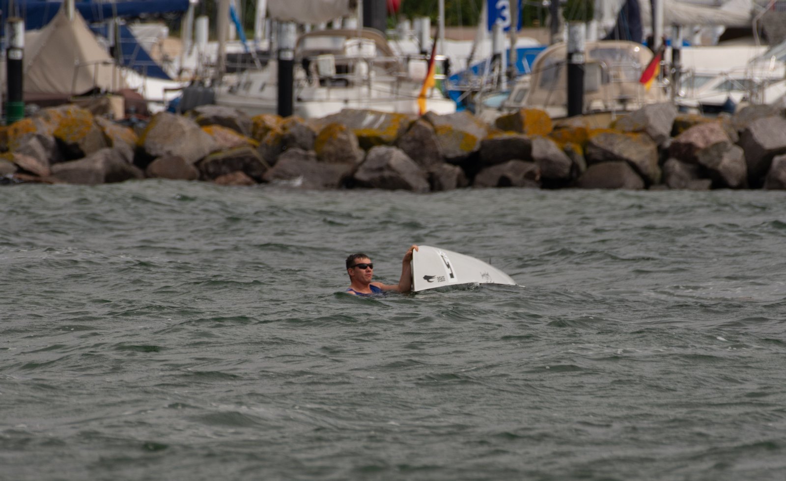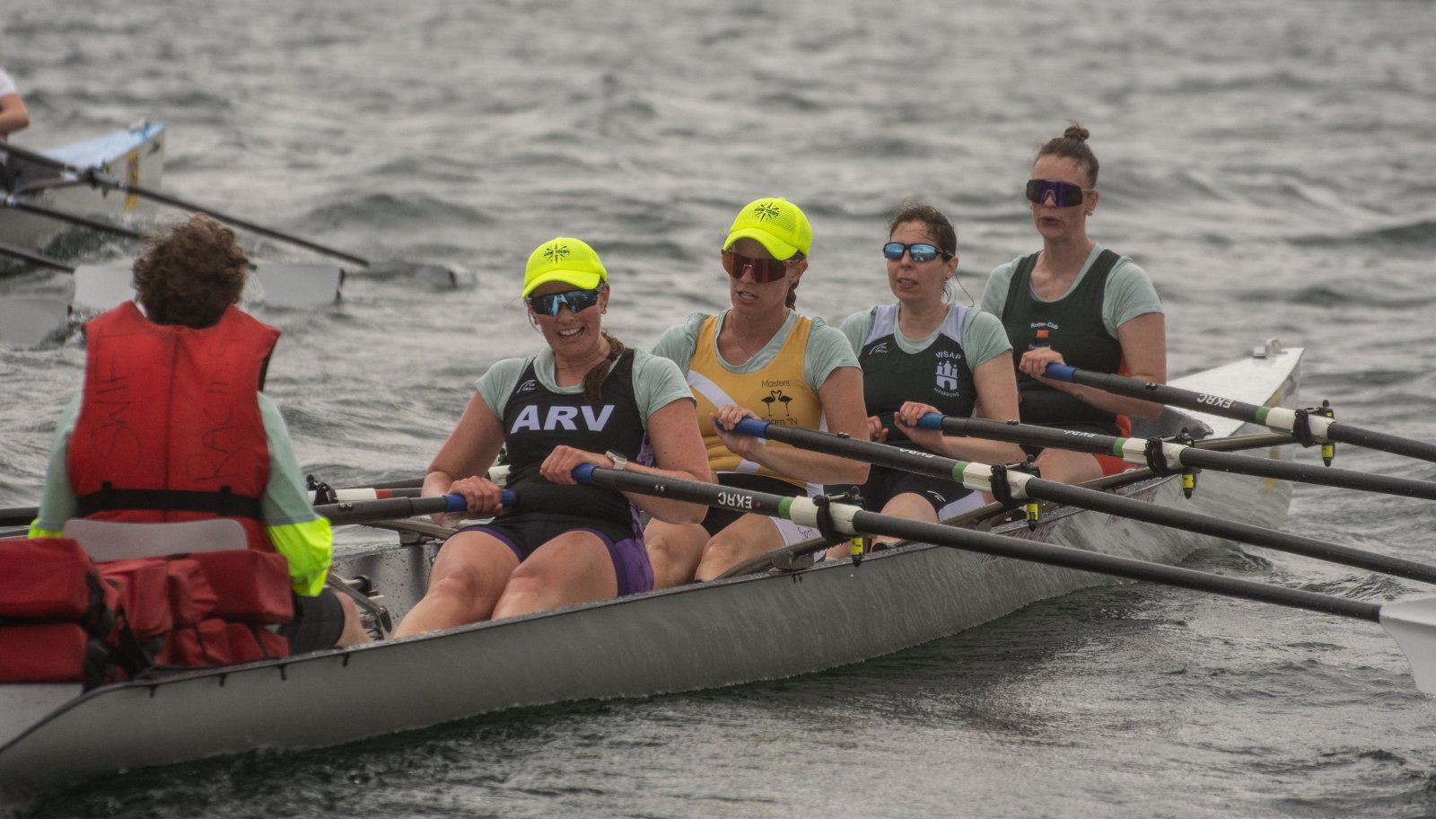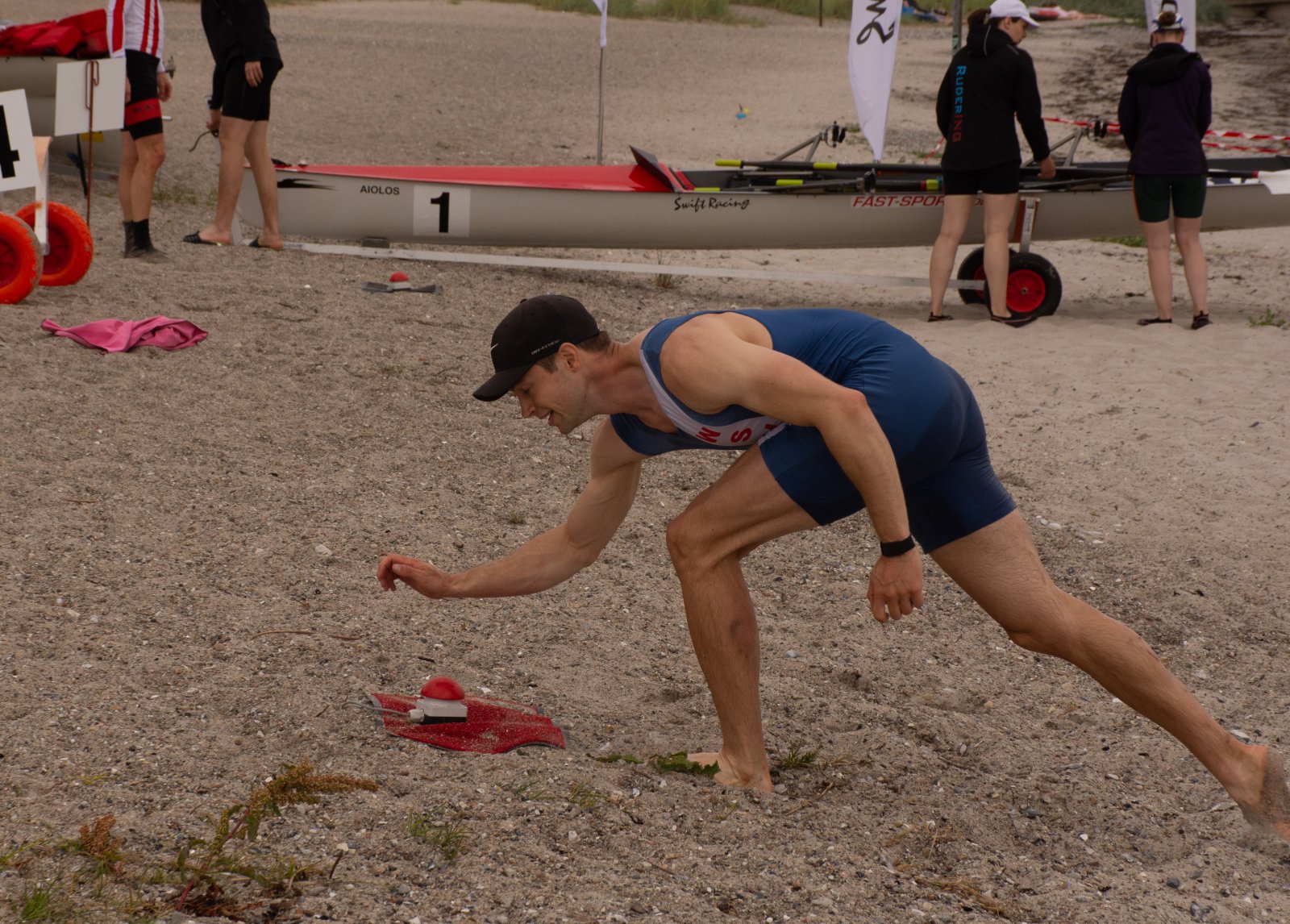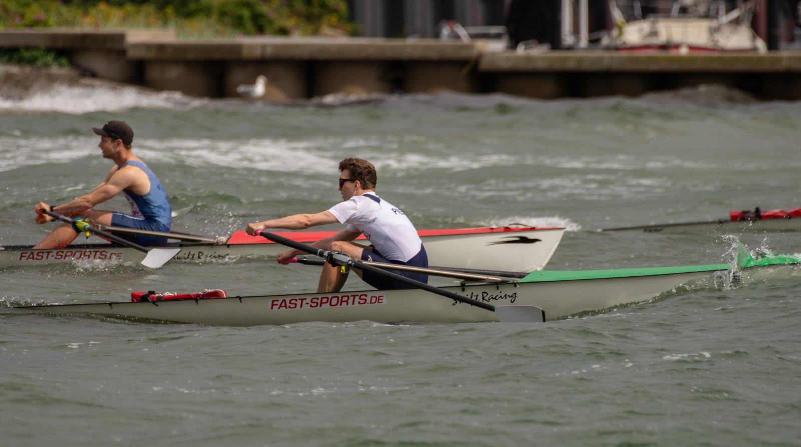 Action oder Abbruch? Diese Frage schwebt am Sonntag über der 4. Kieler Coastal-Regatta, als im Laufe des Tages die Bedingungen von freundlich über zunehmend coastalfreundlich hin zu ungemütlich zu kippen drohen. Ein frischer Ostwind beschert uns Brandung direkt am Strand, welche den Job der Bootshandler am Start zunehmend beschwerlicher werden lassen. Um einen kompletten Abbruch zu umgehen, verkündet die Regattaleitung zum Nachmittag einige Änderungen im Austragungsmodus: Auf den Beachstart wird verzichtet, die Vierrennen werden jeweils auf Zweierfelder gestreckt um das Risiko von Kollisionen zu vermeiden und die Einerstaffeln werden im Vierer ausgefahren – die häufigen Wechsel im Einer bergen zu große Risiken.