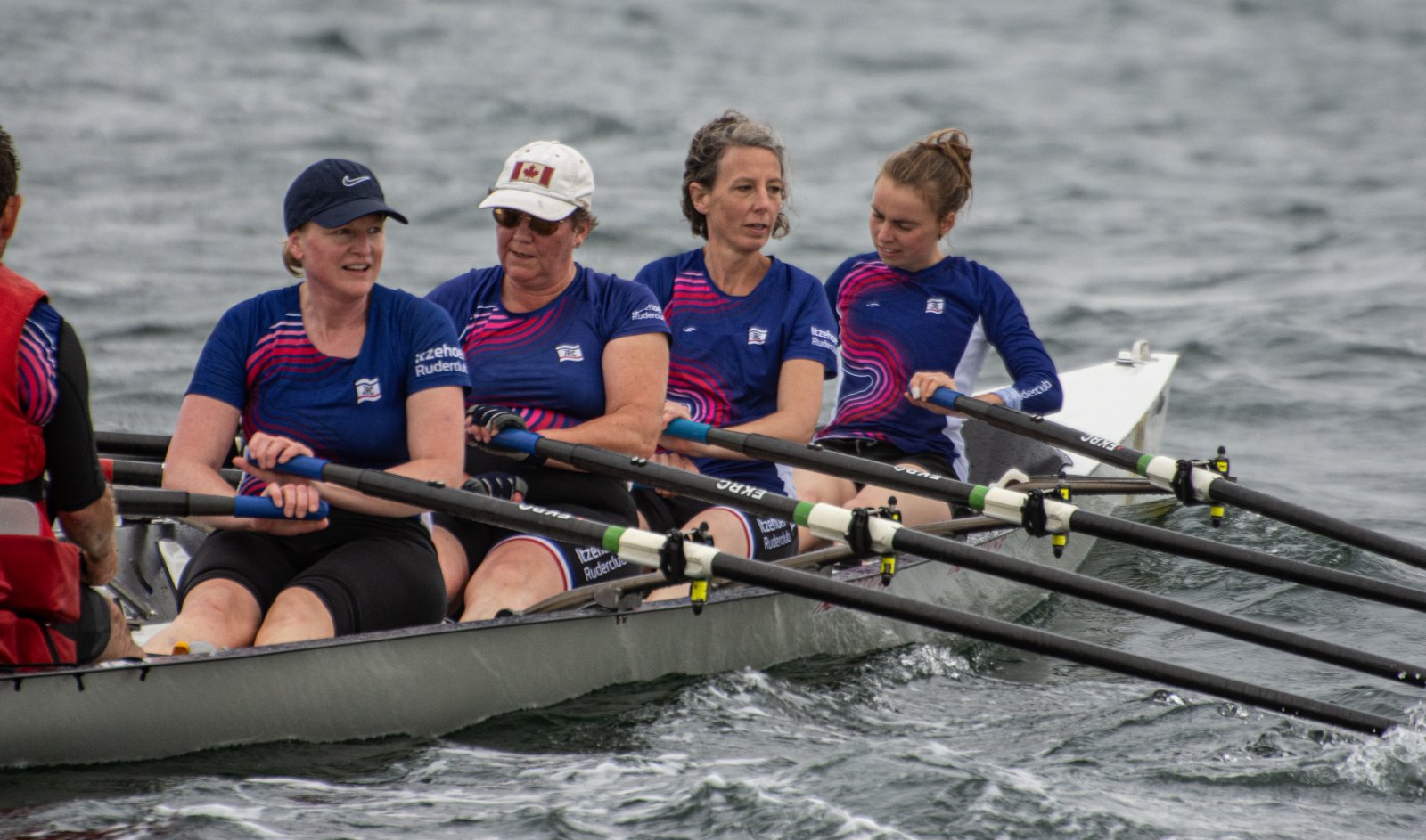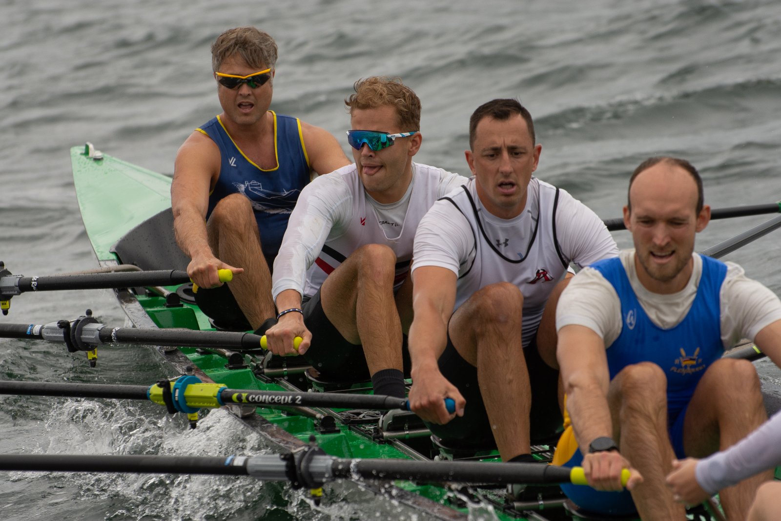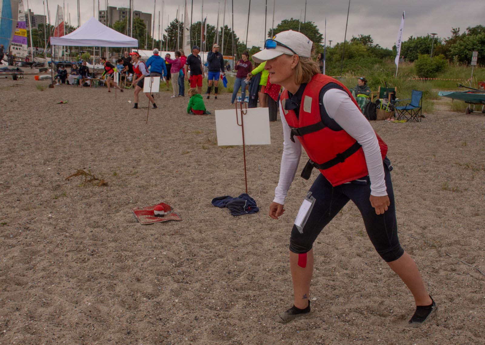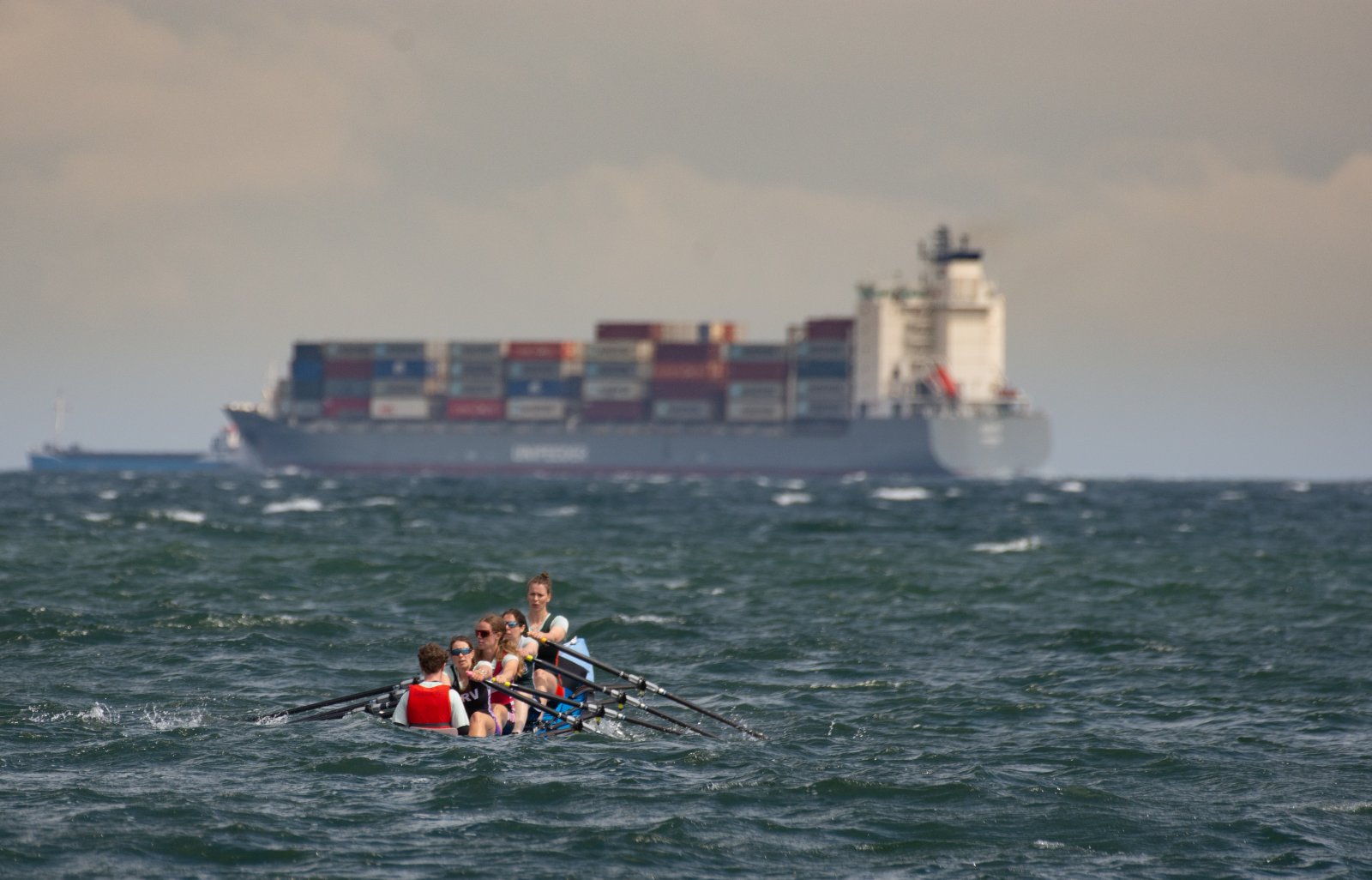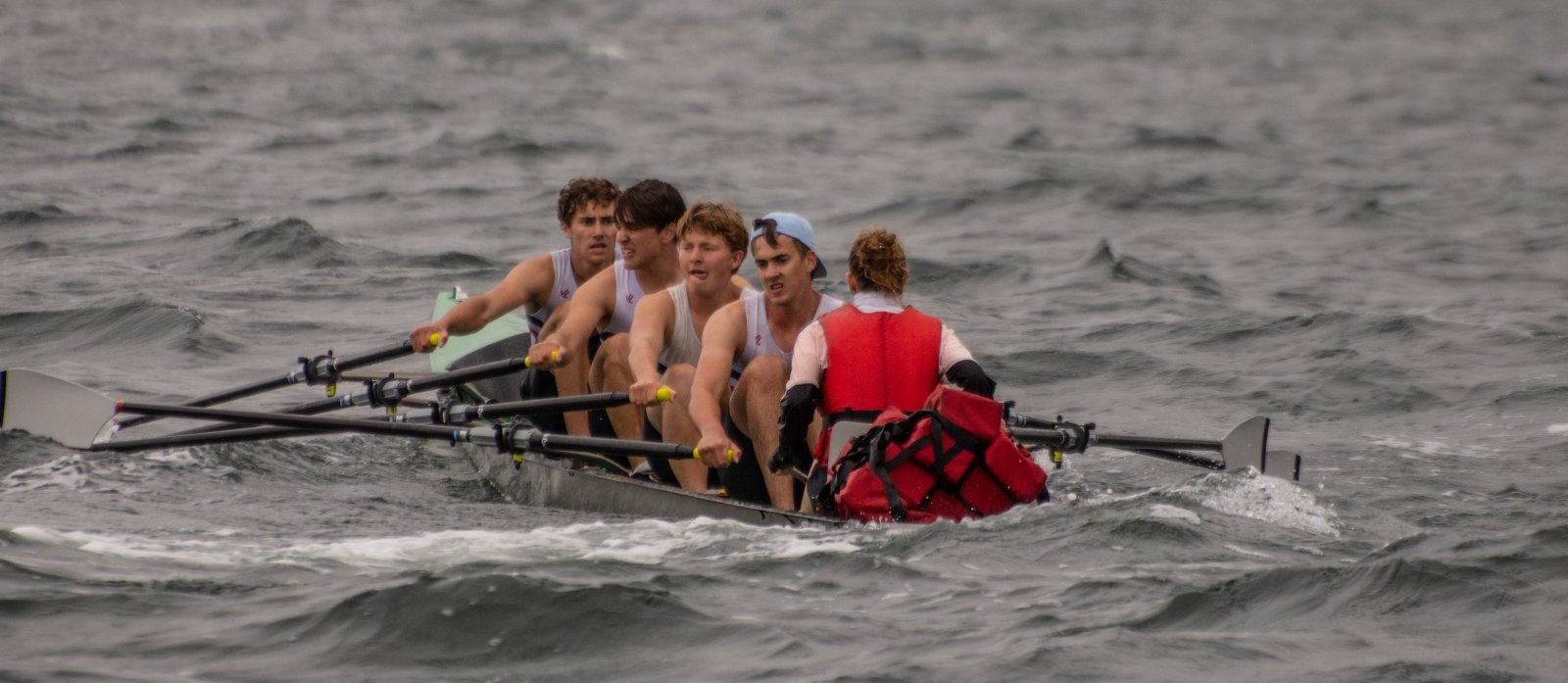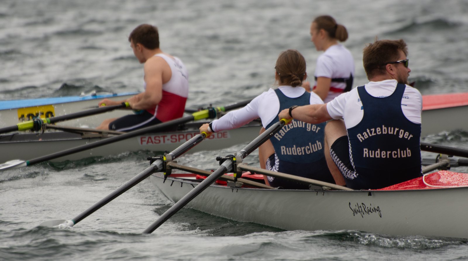 Action oder Abbruch? Diese Frage schwebt am Sonntag über der 4. Kieler Coastal-Regatta, als im Laufe des Tages die Bedingungen von freundlich über zunehmend coastalfreundlich hin zu ungemütlich zu kippen drohen. Ein frischer Ostwind beschert uns Brandung direkt am Strand, welche den Job der Bootshandler am Start zunehmend beschwerlicher werden lassen. Um einen kompletten Abbruch zu umgehen, verkündet die Regattaleitung zum Nachmittag einige Änderungen im Austragungsmodus: Auf den Beachstart wird verzichtet, die Vierrennen werden jeweils auf Zweierfelder gestreckt um das Risiko von Kollisionen zu vermeiden und die Einerstaffeln werden im Vierer ausgefahren – die häufigen Wechsel im Einer bergen zu große Risiken.