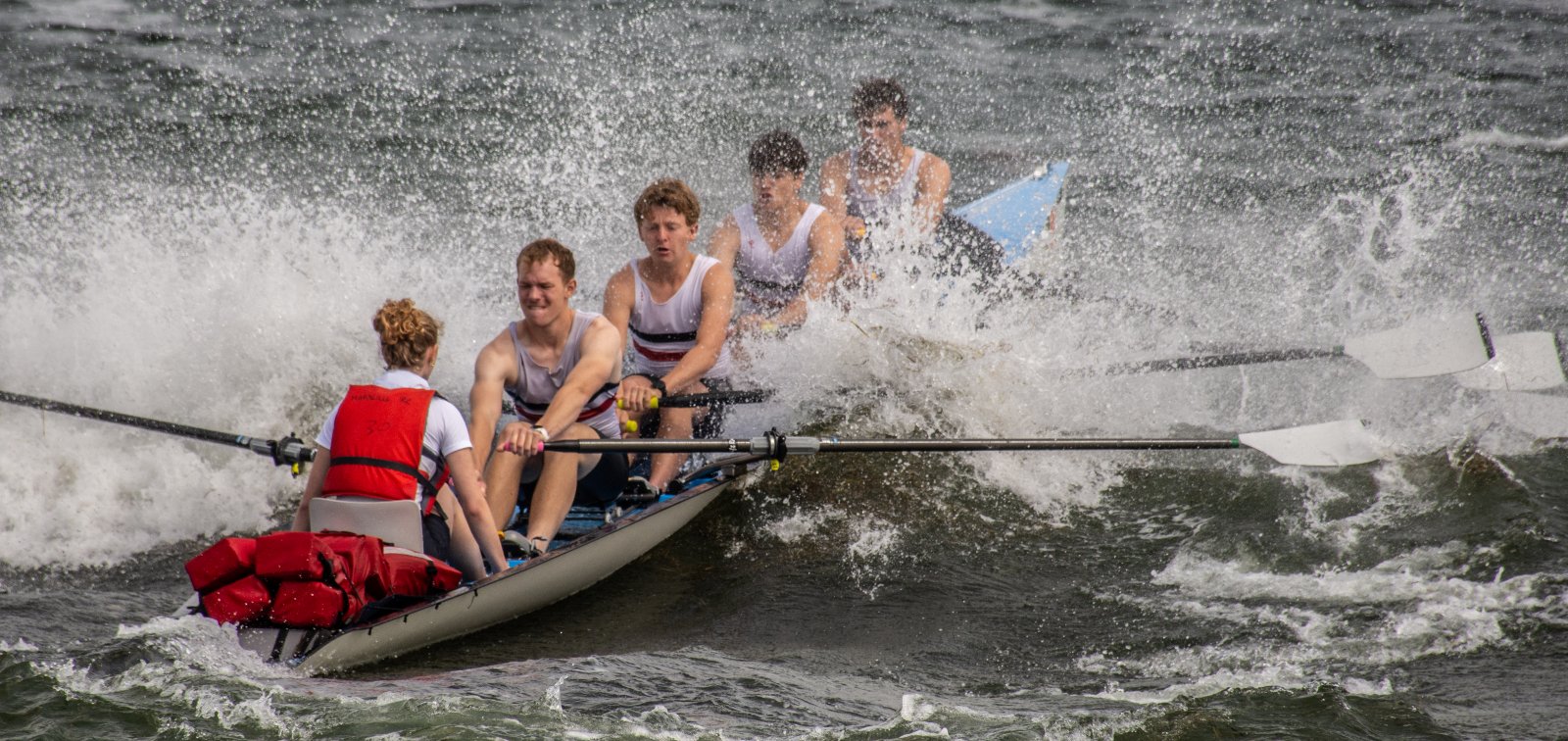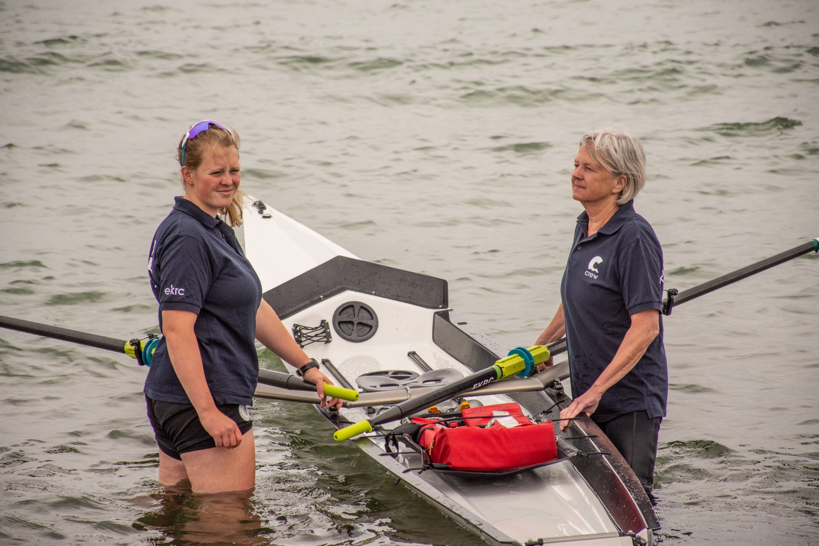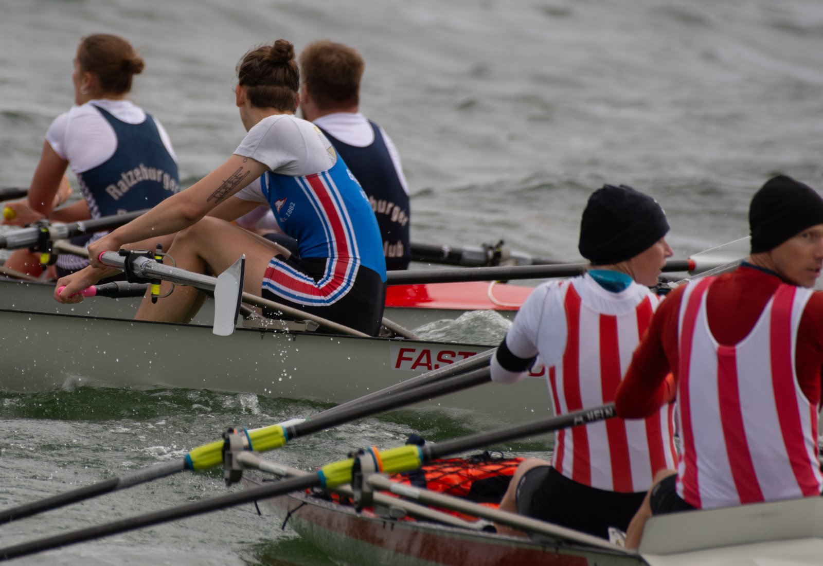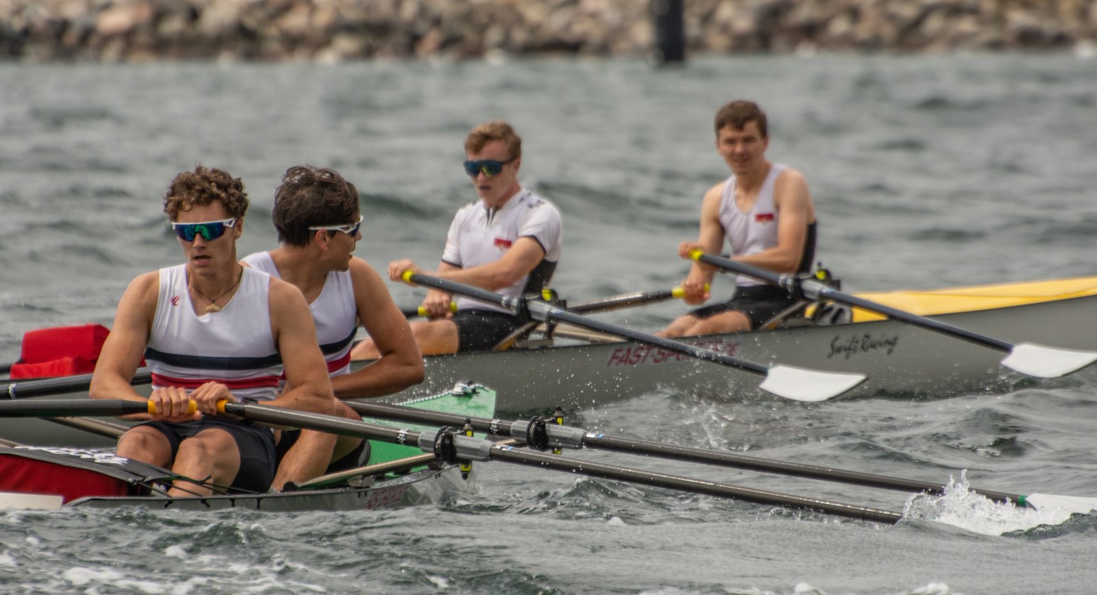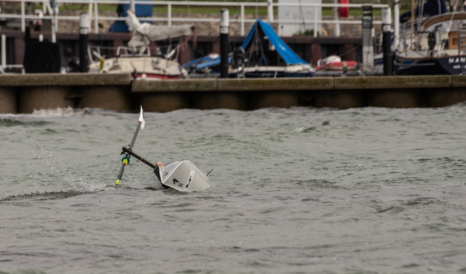 Action oder Abbruch? Diese Frage schwebt am Sonntag über der 4. Kieler Coastal-Regatta, als im Laufe des Tages die Bedingungen von freundlich über zunehmend coastalfreundlich hin zu ungemütlich zu kippen drohen. Ein frischer Ostwind beschert uns Brandung direkt am Strand, welche den Job der Bootshandler am Start zunehmend beschwerlicher werden lassen. Um einen kompletten Abbruch zu umgehen, verkündet die Regattaleitung zum Nachmittag einige Änderungen im Austragungsmodus: Auf den Beachstart wird verzichtet, die Vierrennen werden jeweils auf Zweierfelder gestreckt um das Risiko von Kollisionen zu vermeiden und die Einerstaffeln werden im Vierer ausgefahren – die häufigen Wechsel im Einer bergen zu große Risiken.