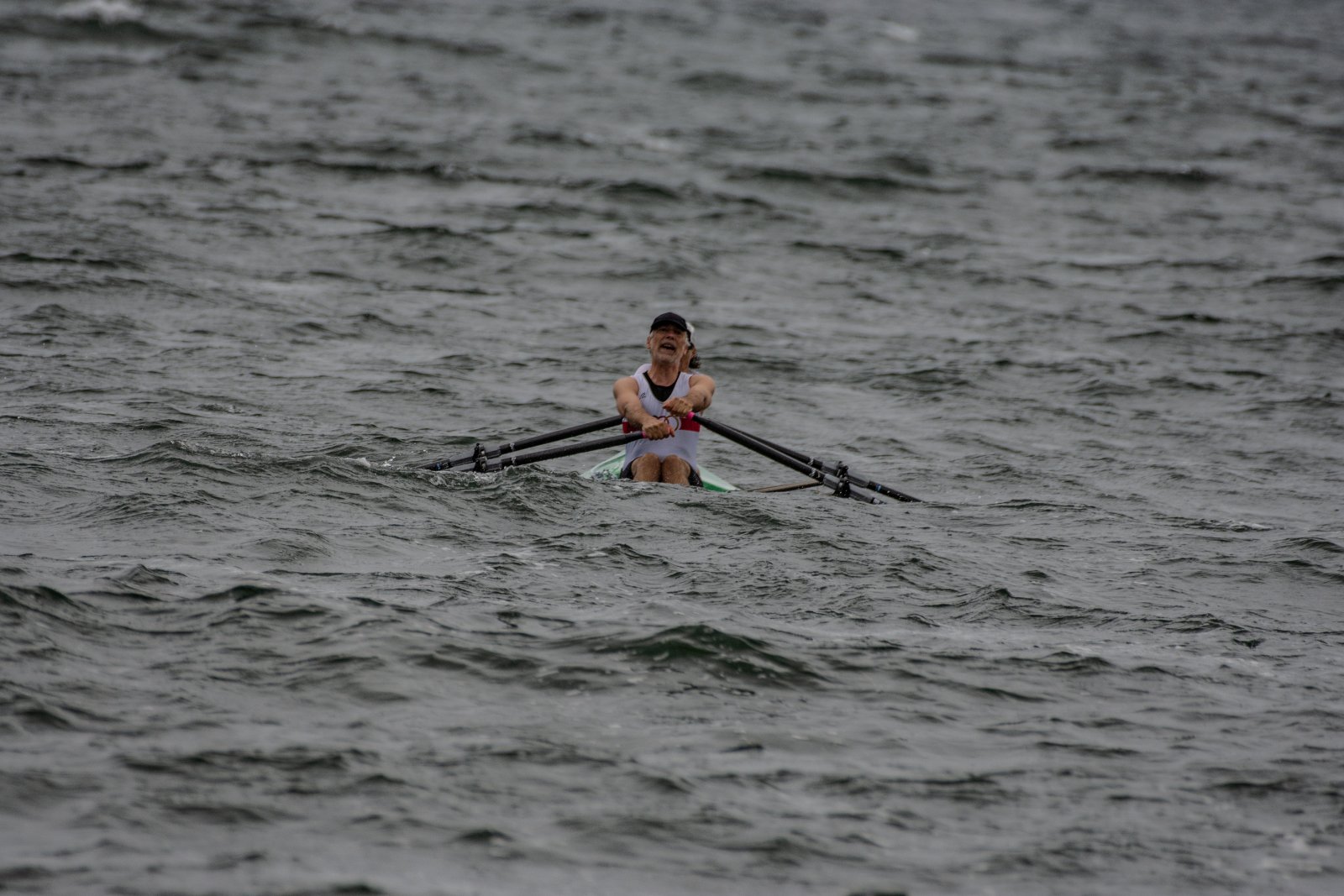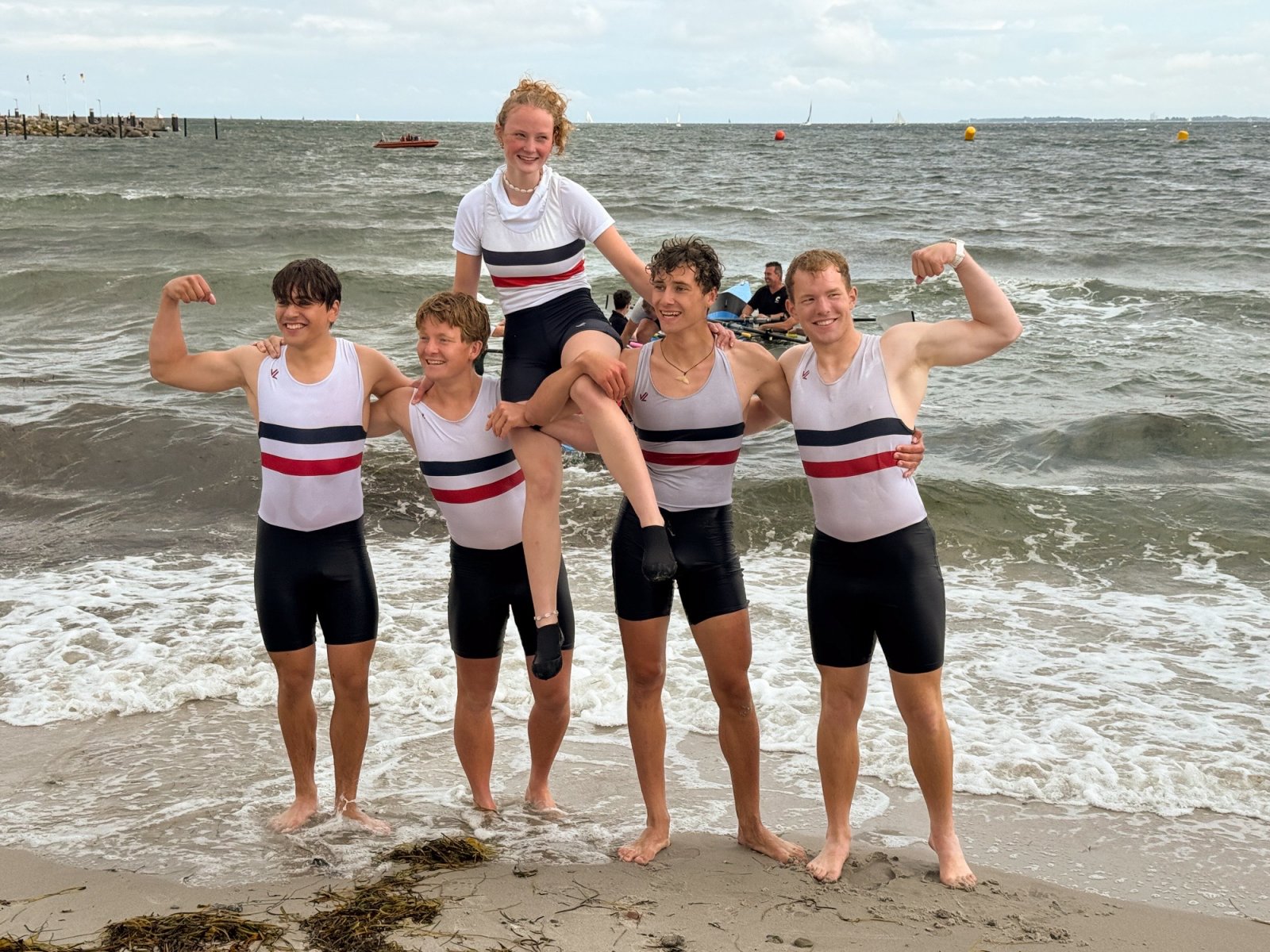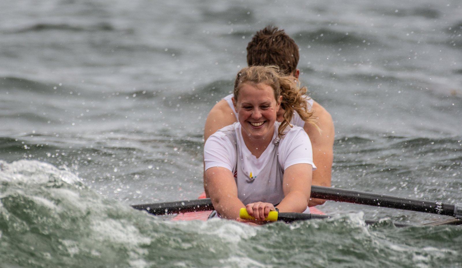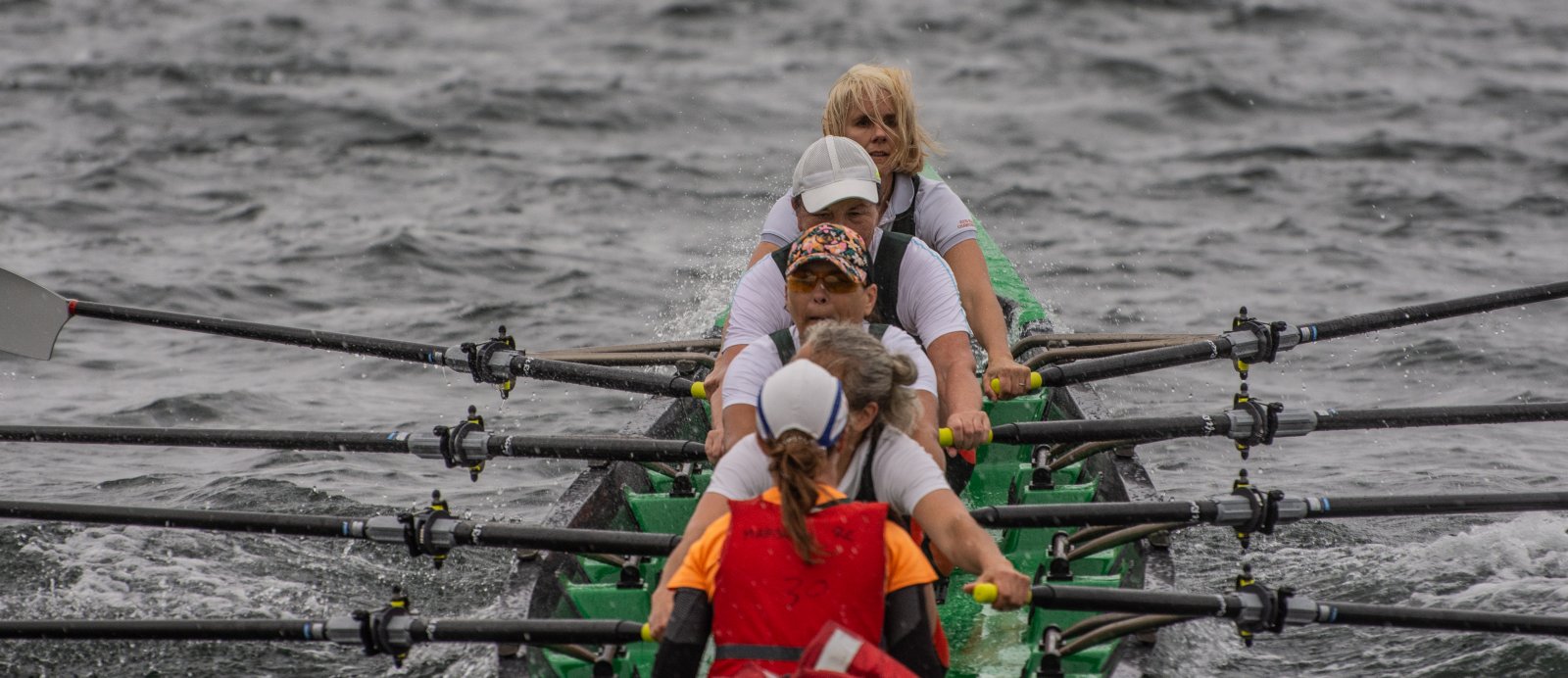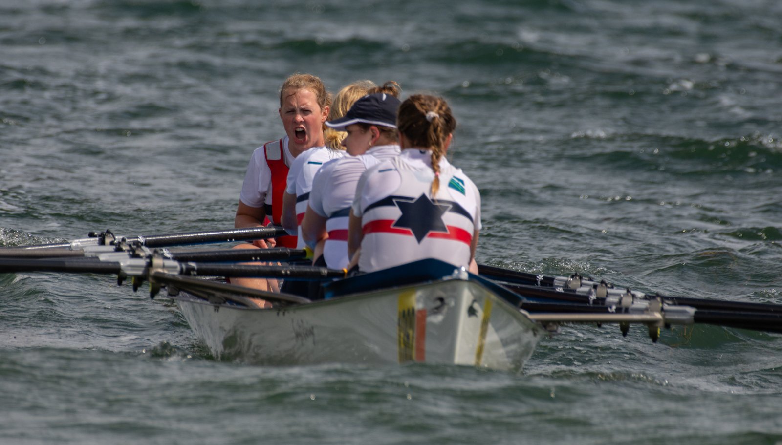 Action oder Abbruch? Diese Frage schwebt am Sonntag über der 4. Kieler Coastal-Regatta, als im Laufe des Tages die Bedingungen von freundlich über zunehmend coastalfreundlich hin zu ungemütlich zu kippen drohen. Ein frischer Ostwind beschert uns Brandung direkt am Strand, welche den Job der Bootshandler am Start zunehmend beschwerlicher werden lassen. Um einen kompletten Abbruch zu umgehen, verkündet die Regattaleitung zum Nachmittag einige Änderungen im Austragungsmodus: Auf den Beachstart wird verzichtet, die Vierrennen werden jeweils auf Zweierfelder gestreckt um das Risiko von Kollisionen zu vermeiden und die Einerstaffeln werden im Vierer ausgefahren – die häufigen Wechsel im Einer bergen zu große Risiken.