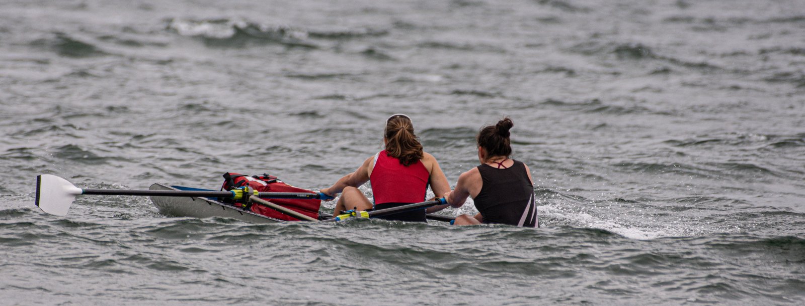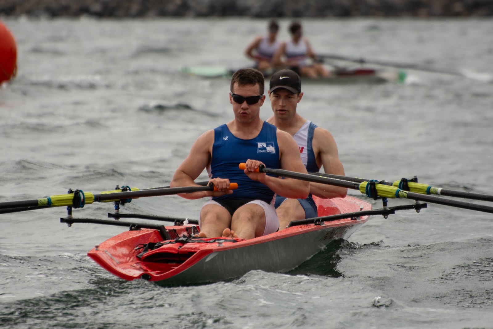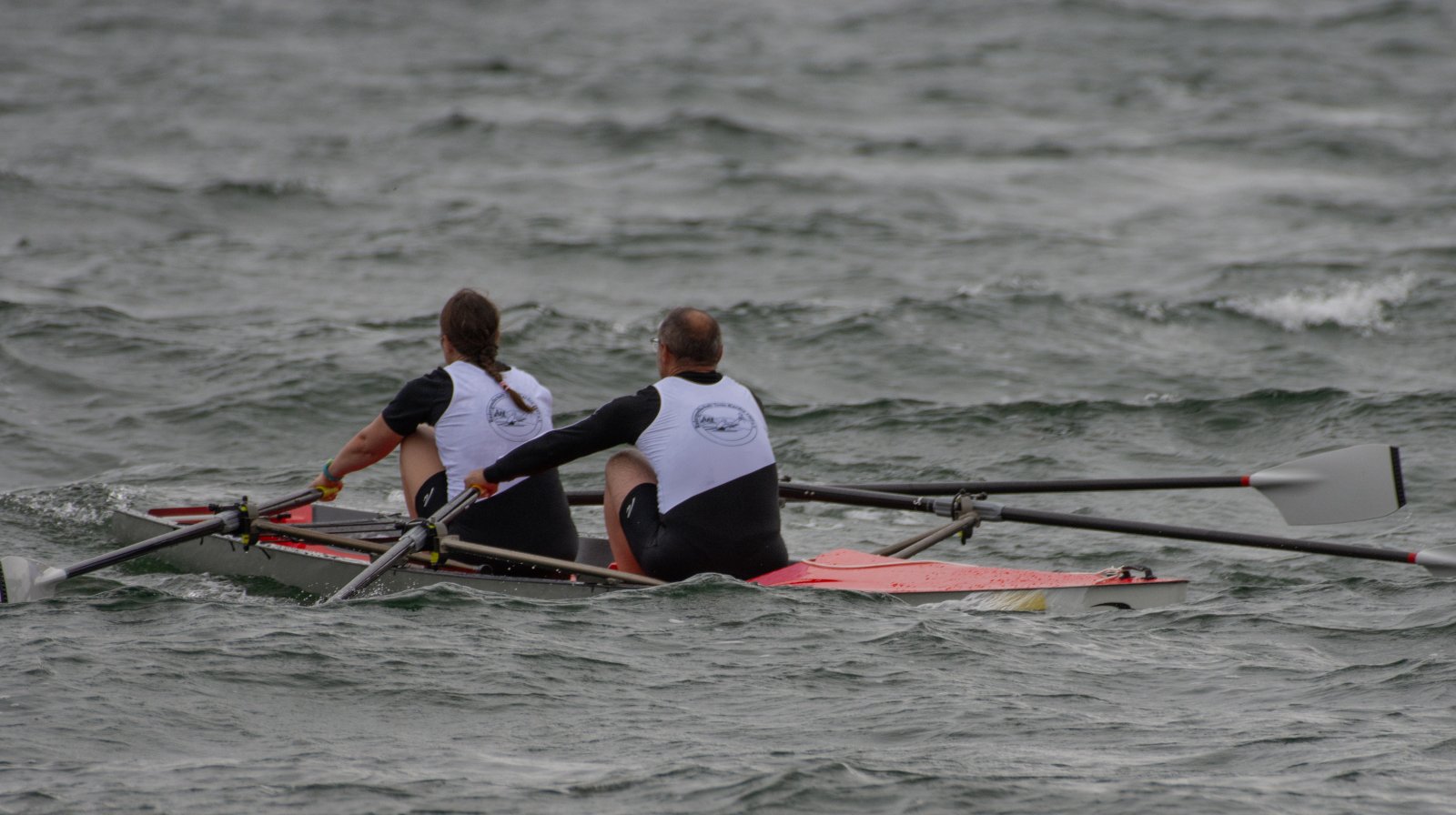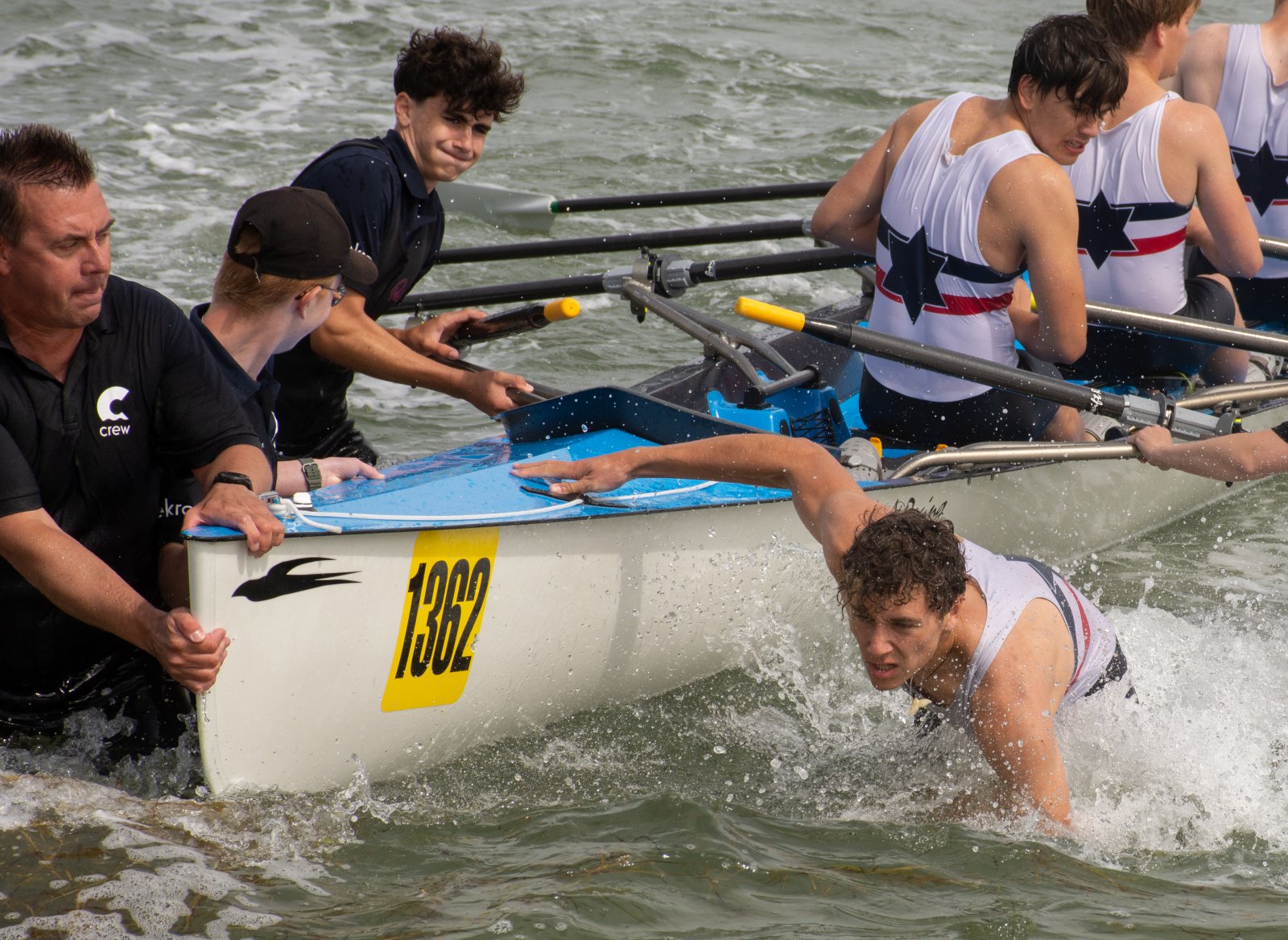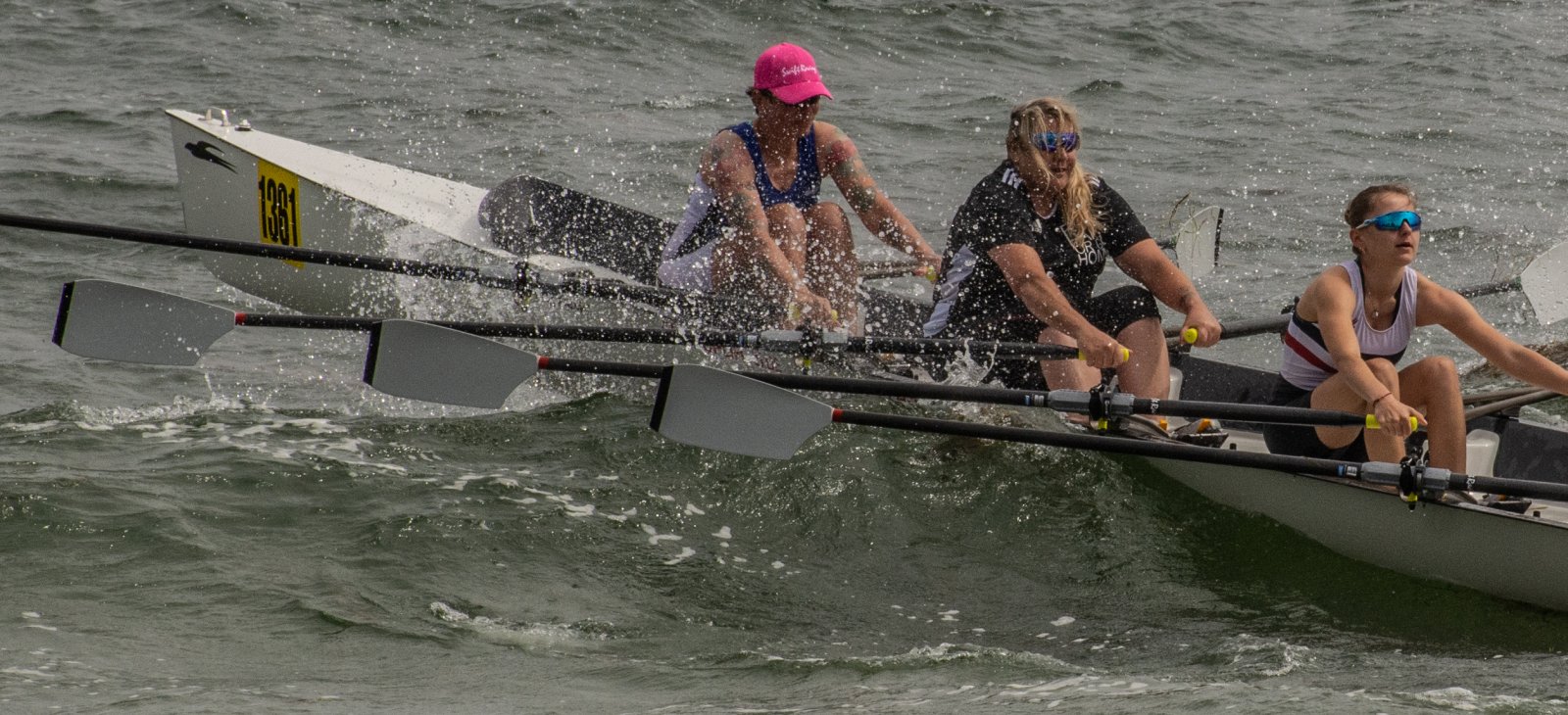 Action oder Abbruch? Diese Frage schwebt am Sonntag über der 4. Kieler Coastal-Regatta, als im Laufe des Tages die Bedingungen von freundlich über zunehmend coastalfreundlich hin zu ungemütlich zu kippen drohen. Ein frischer Ostwind beschert uns Brandung direkt am Strand, welche den Job der Bootshandler am Start zunehmend beschwerlicher werden lassen. Um einen kompletten Abbruch zu umgehen, verkündet die Regattaleitung zum Nachmittag einige Änderungen im Austragungsmodus: Auf den Beachstart wird verzichtet, die Vierrennen werden jeweils auf Zweierfelder gestreckt um das Risiko von Kollisionen zu vermeiden und die Einerstaffeln werden im Vierer ausgefahren – die häufigen Wechsel im Einer bergen zu große Risiken.