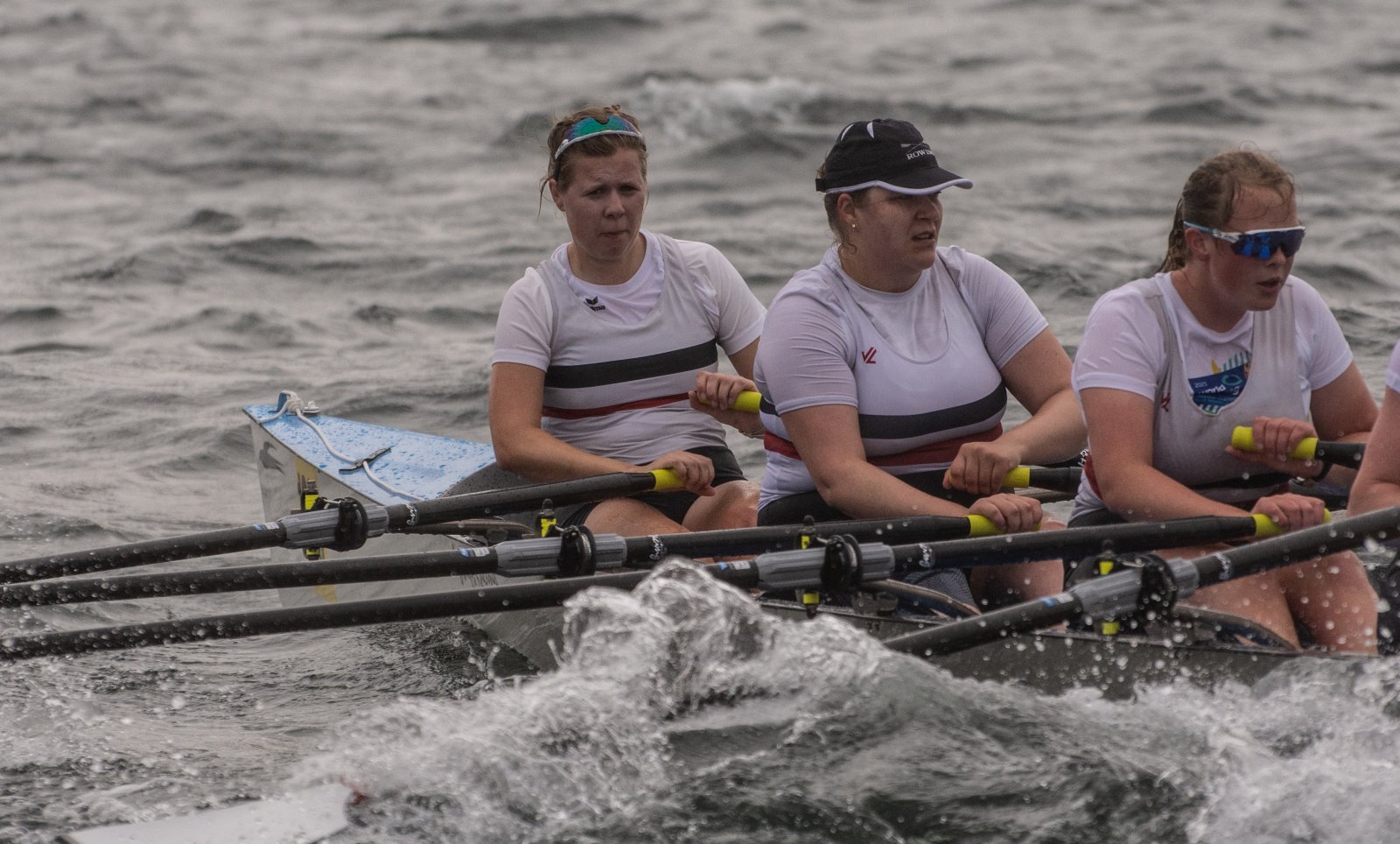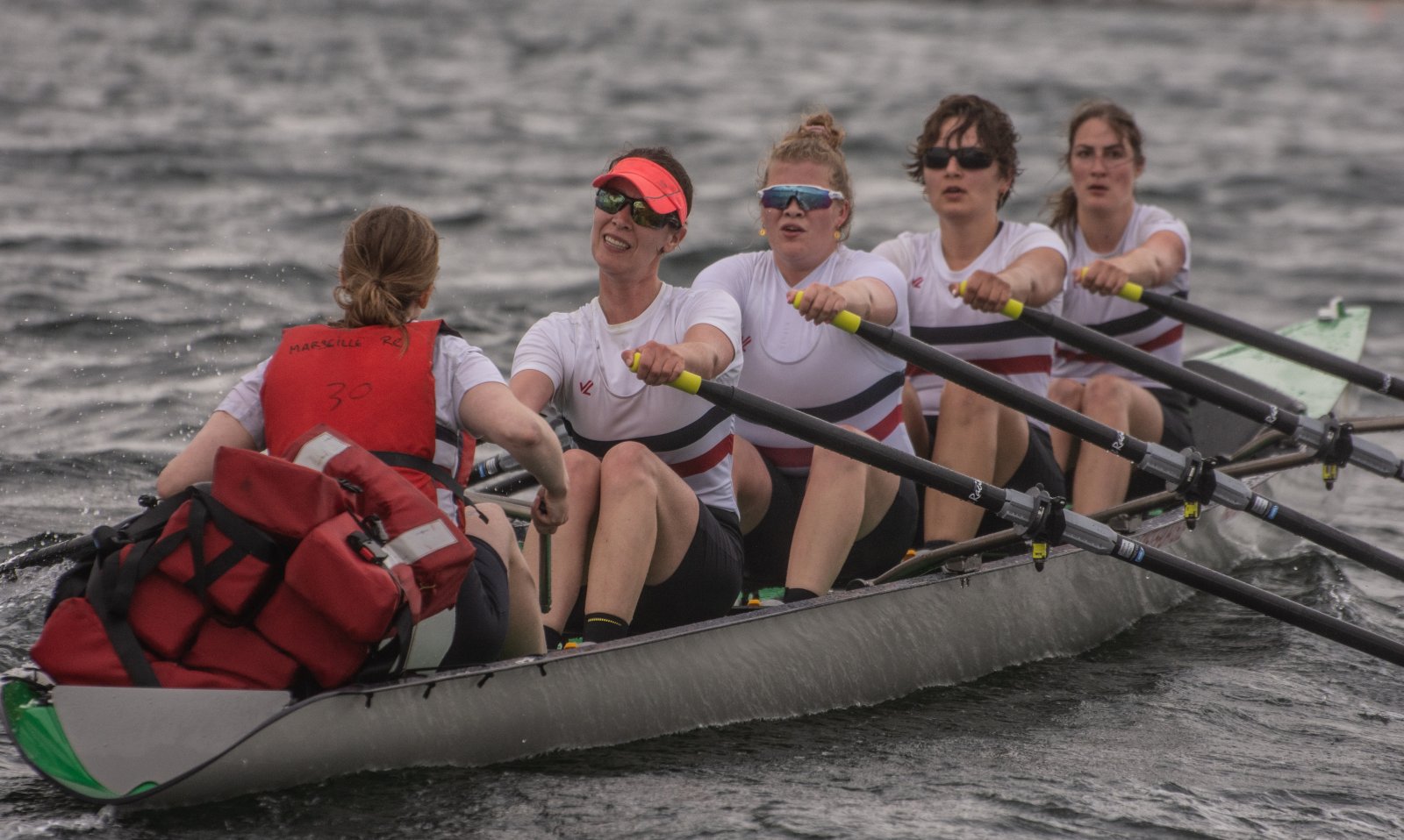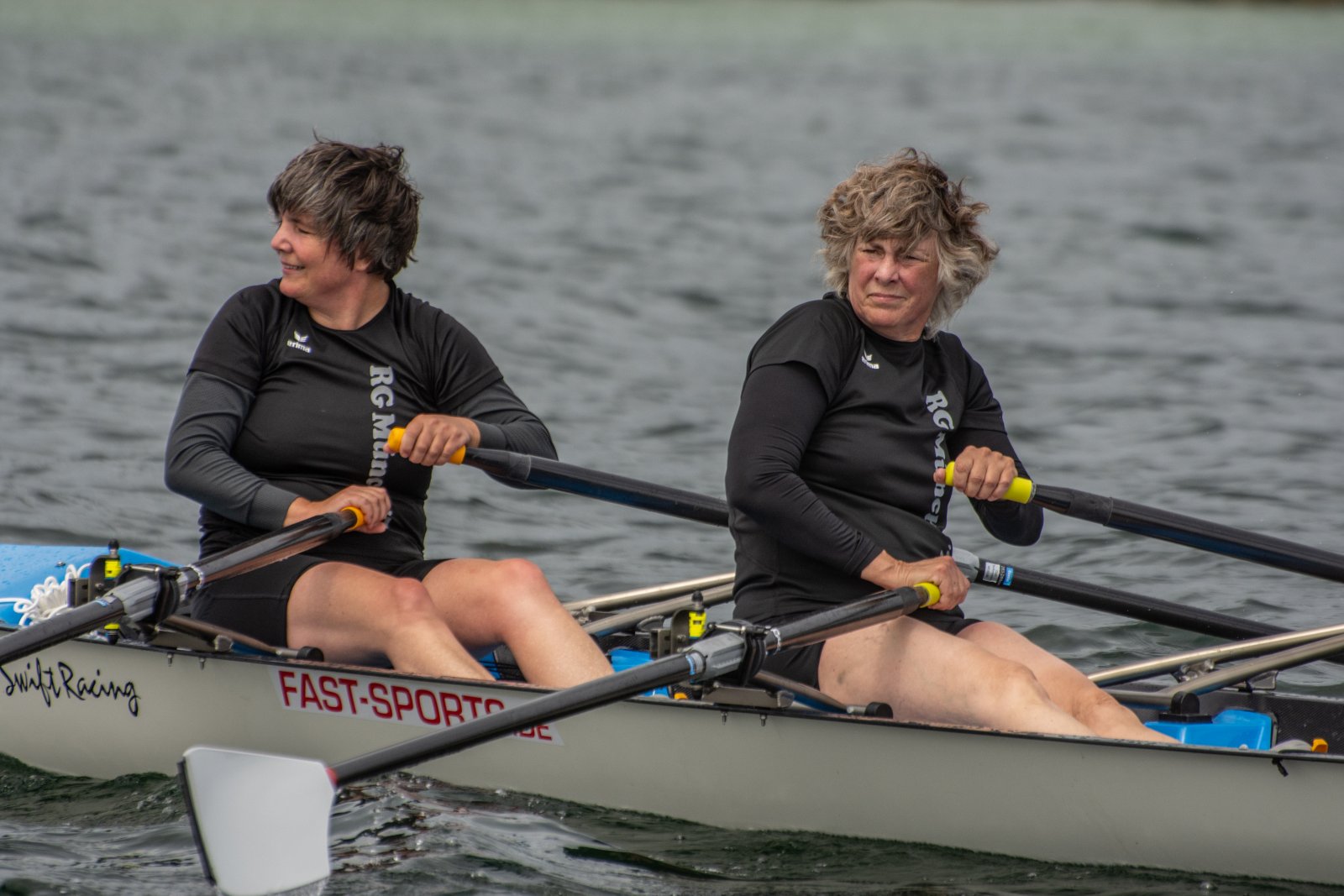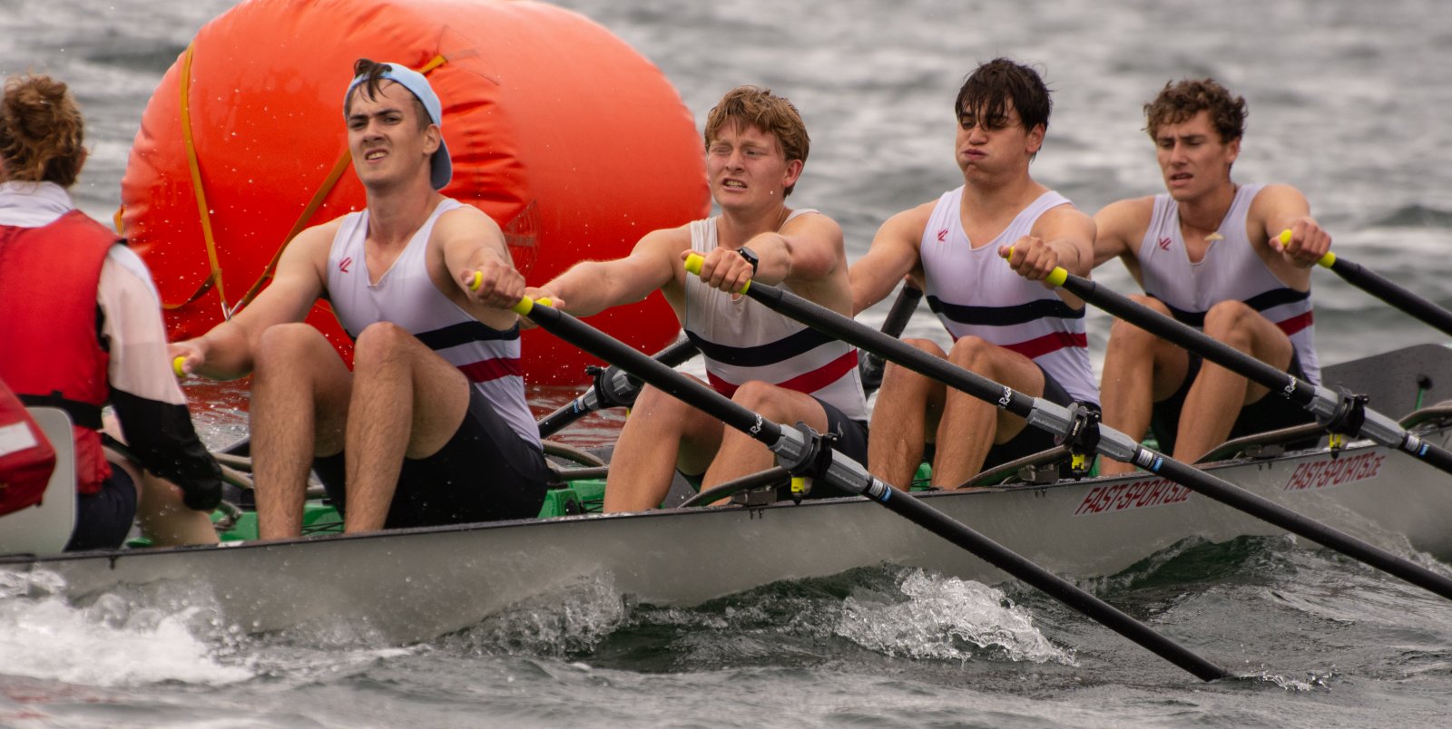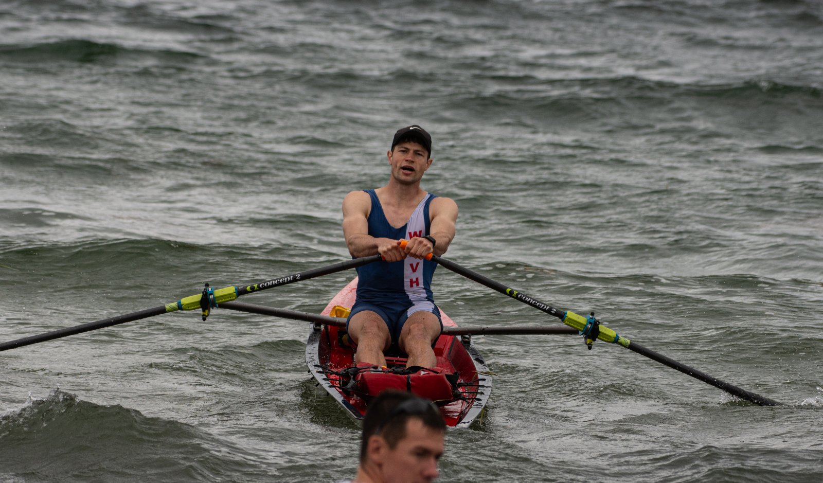 Action oder Abbruch? Diese Frage schwebt am Sonntag über der 4. Kieler Coastal-Regatta, als im Laufe des Tages die Bedingungen von freundlich über zunehmend coastalfreundlich hin zu ungemütlich zu kippen drohen. Ein frischer Ostwind beschert uns Brandung direkt am Strand, welche den Job der Bootshandler am Start zunehmend beschwerlicher werden lassen. Um einen kompletten Abbruch zu umgehen, verkündet die Regattaleitung zum Nachmittag einige Änderungen im Austragungsmodus: Auf den Beachstart wird verzichtet, die Vierrennen werden jeweils auf Zweierfelder gestreckt um das Risiko von Kollisionen zu vermeiden und die Einerstaffeln werden im Vierer ausgefahren – die häufigen Wechsel im Einer bergen zu große Risiken.