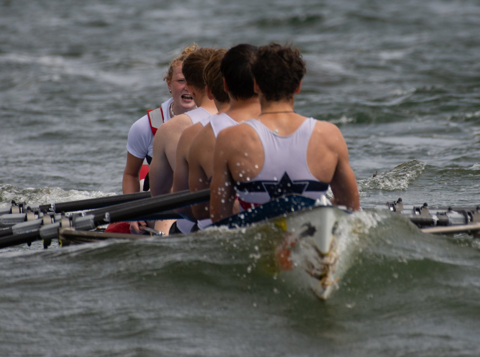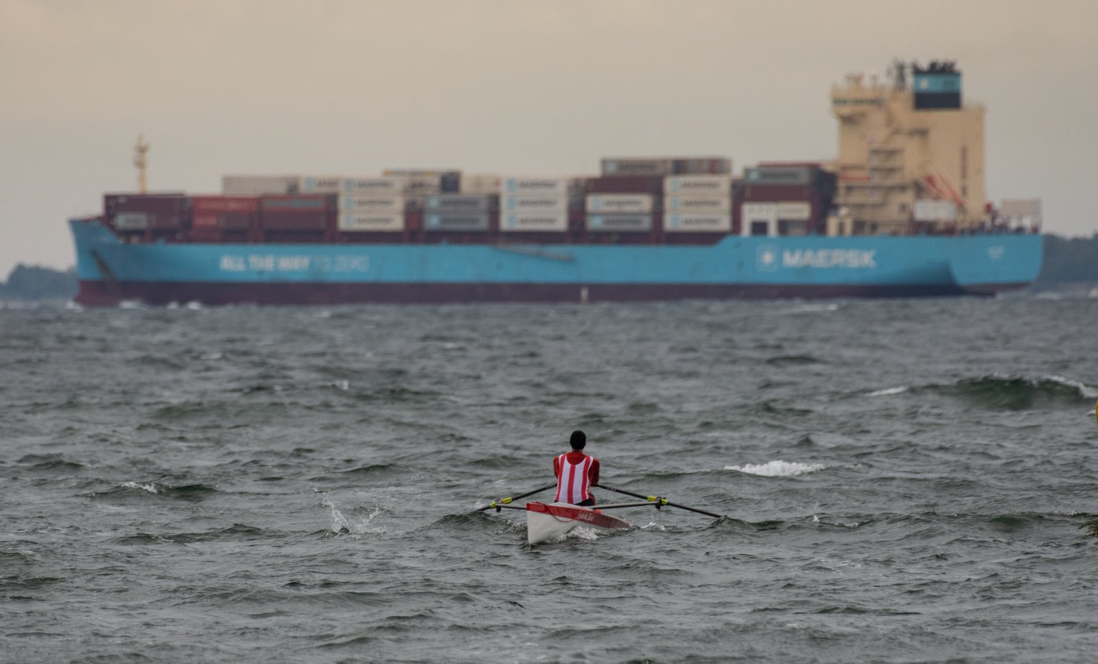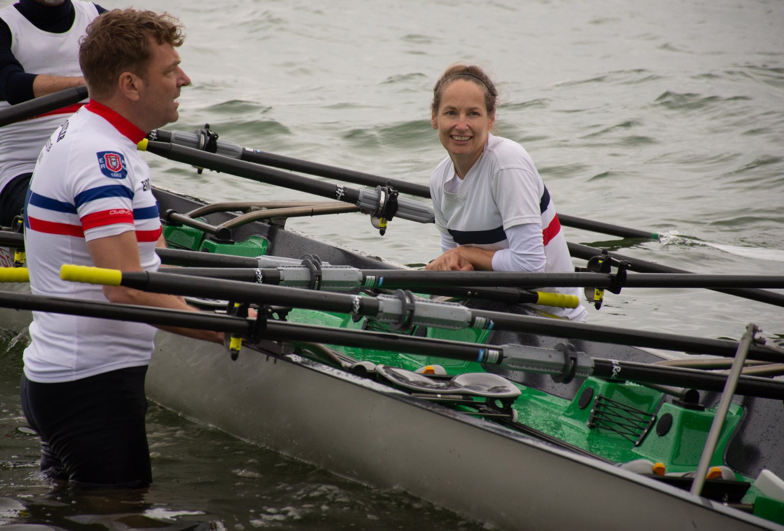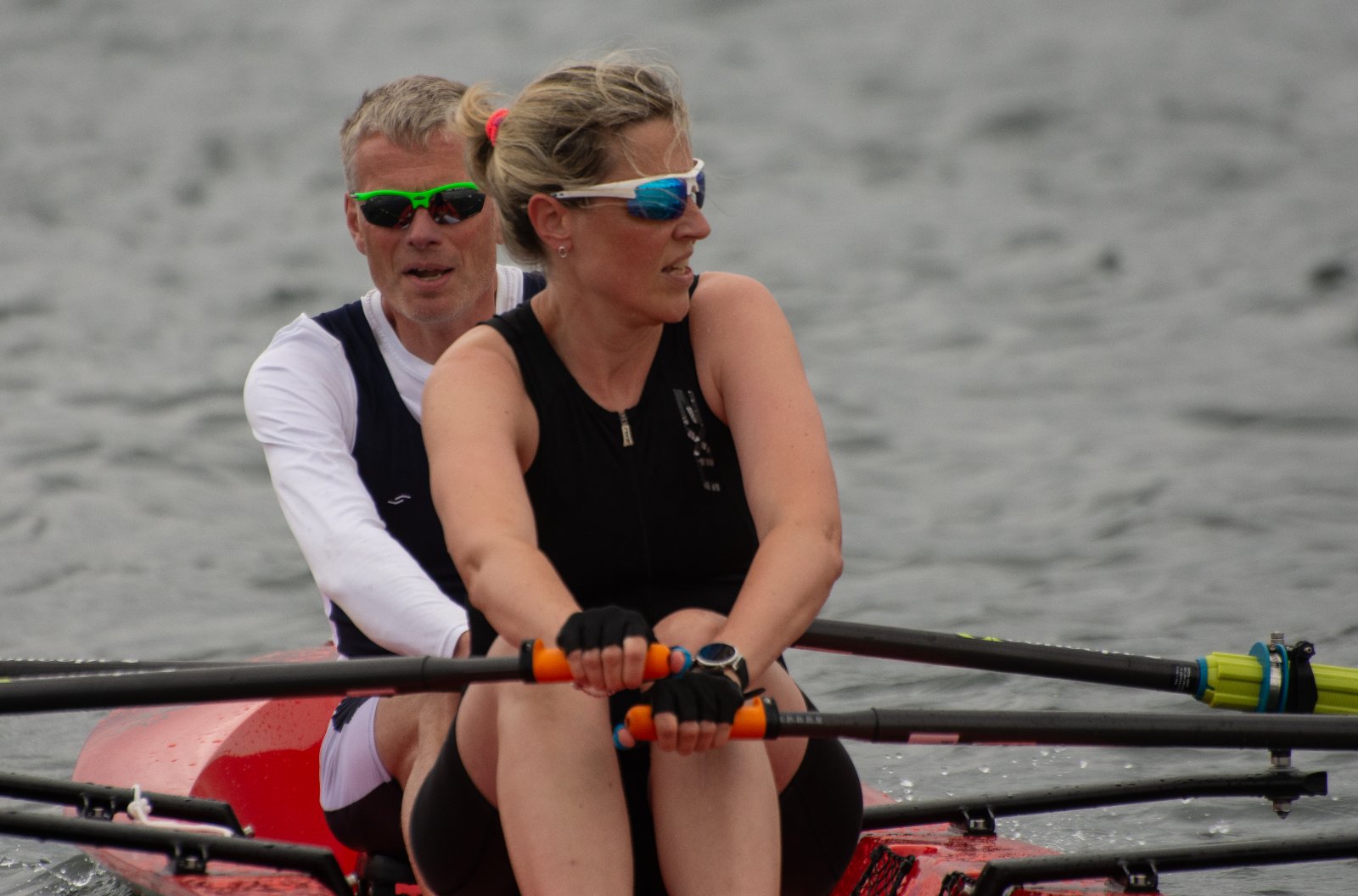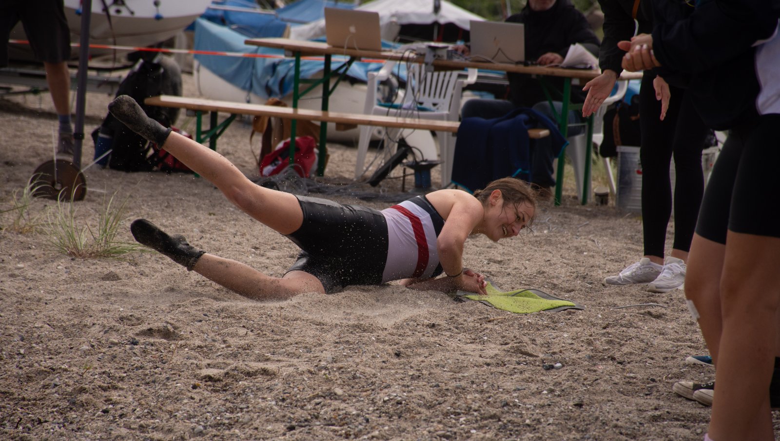 Action oder Abbruch? Diese Frage schwebt am Sonntag über der 4. Kieler Coastal-Regatta, als im Laufe des Tages die Bedingungen von freundlich über zunehmend coastalfreundlich hin zu ungemütlich zu kippen drohen. Ein frischer Ostwind beschert uns Brandung direkt am Strand, welche den Job der Bootshandler am Start zunehmend beschwerlicher werden lassen. Um einen kompletten Abbruch zu umgehen, verkündet die Regattaleitung zum Nachmittag einige Änderungen im Austragungsmodus: Auf den Beachstart wird verzichtet, die Vierrennen werden jeweils auf Zweierfelder gestreckt um das Risiko von Kollisionen zu vermeiden und die Einerstaffeln werden im Vierer ausgefahren – die häufigen Wechsel im Einer bergen zu große Risiken.