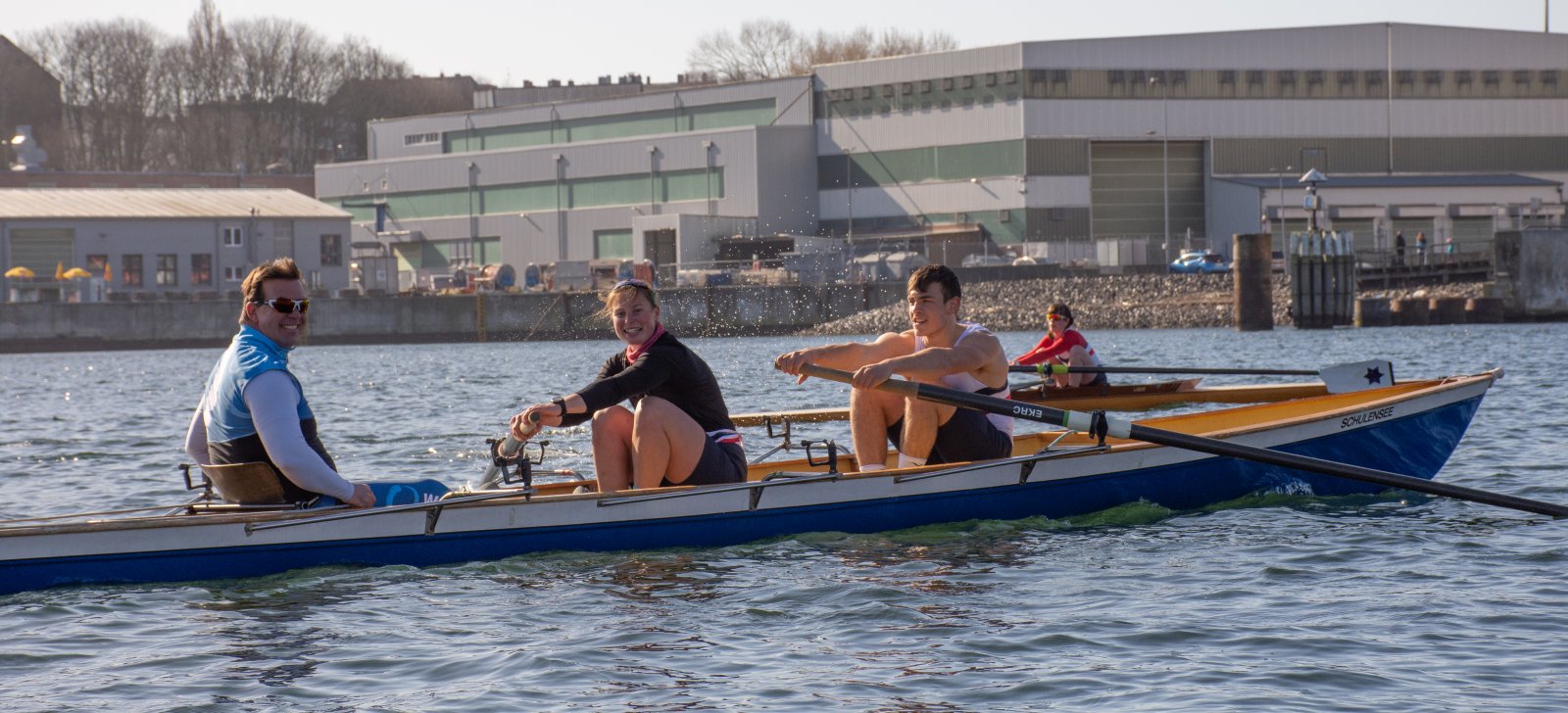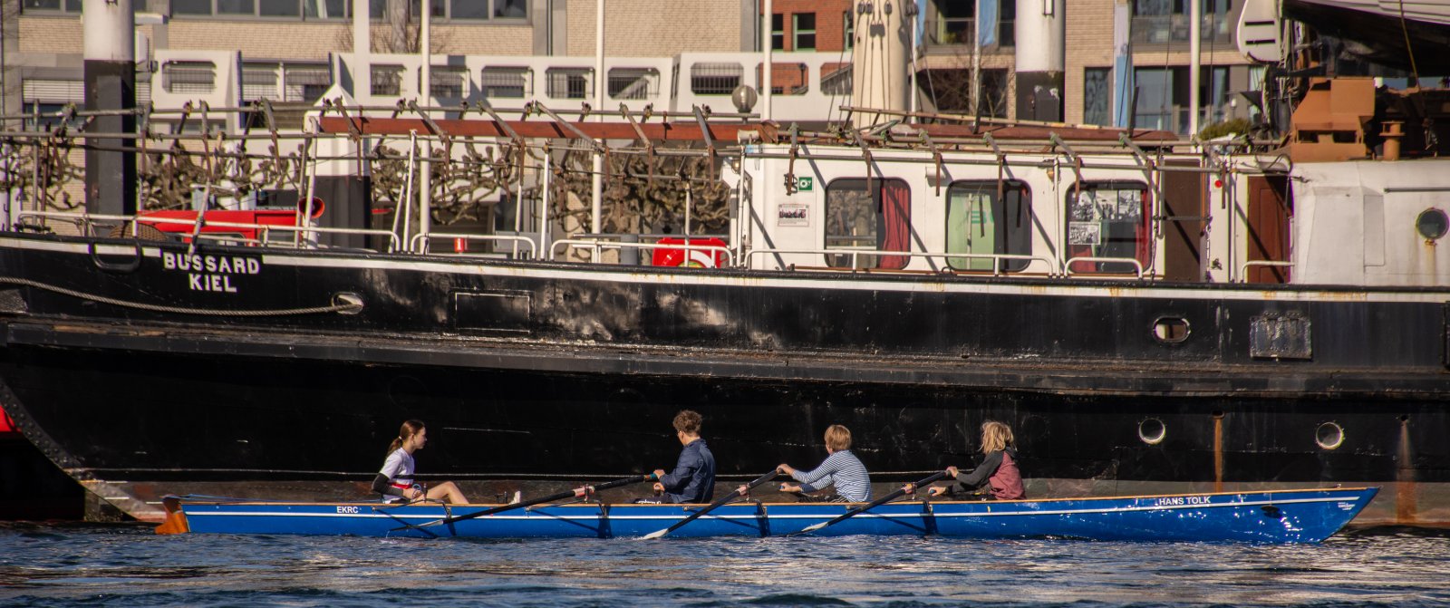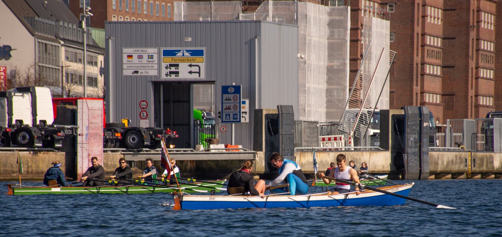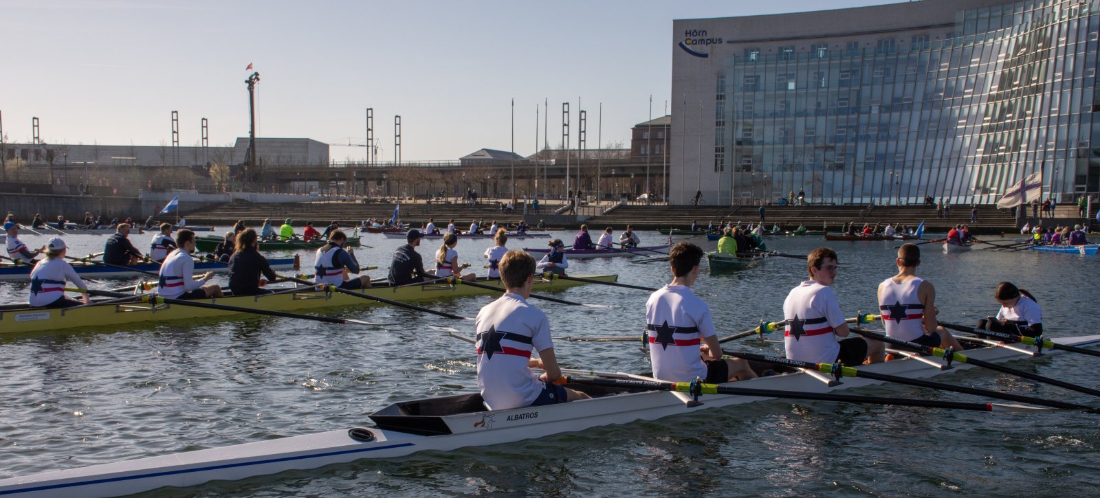 …und so ist zum diesjährigen Anrudern einmal wieder Hochbetrieb in der Hörn! Hochbetrieb auf allen Stegen, 35-40 Boote aller Rudervereine strömen Richtung Innenförde, um dort die neue Saison zu begrüßen – endlich einmal wieder wie in alten Zeiten! Sonniges, mildes Frühlingswetter tut das seine und so herrscht entspannte, freudige Stimmung in allen Booten.
