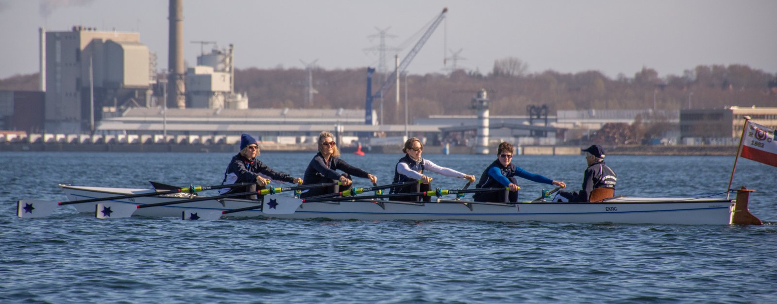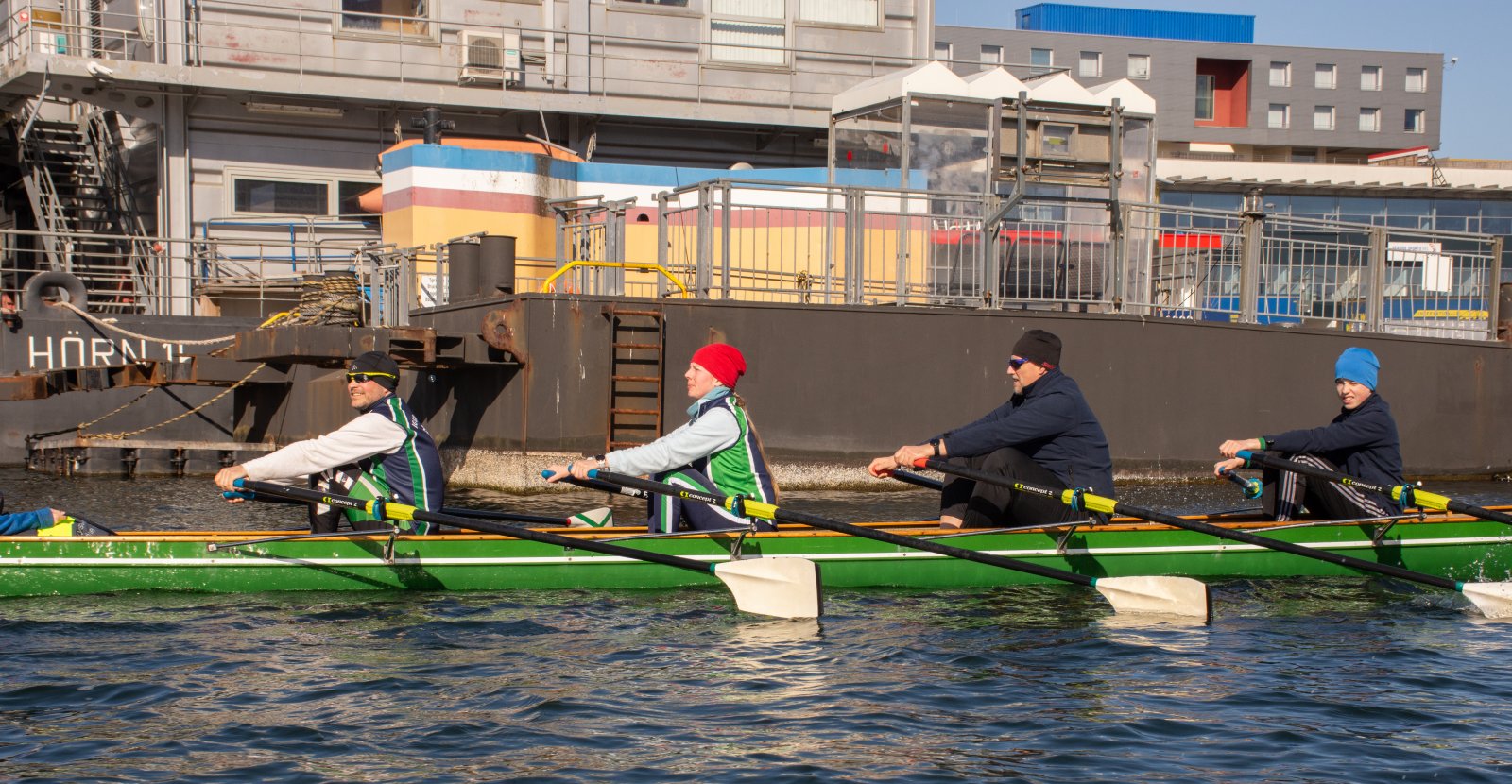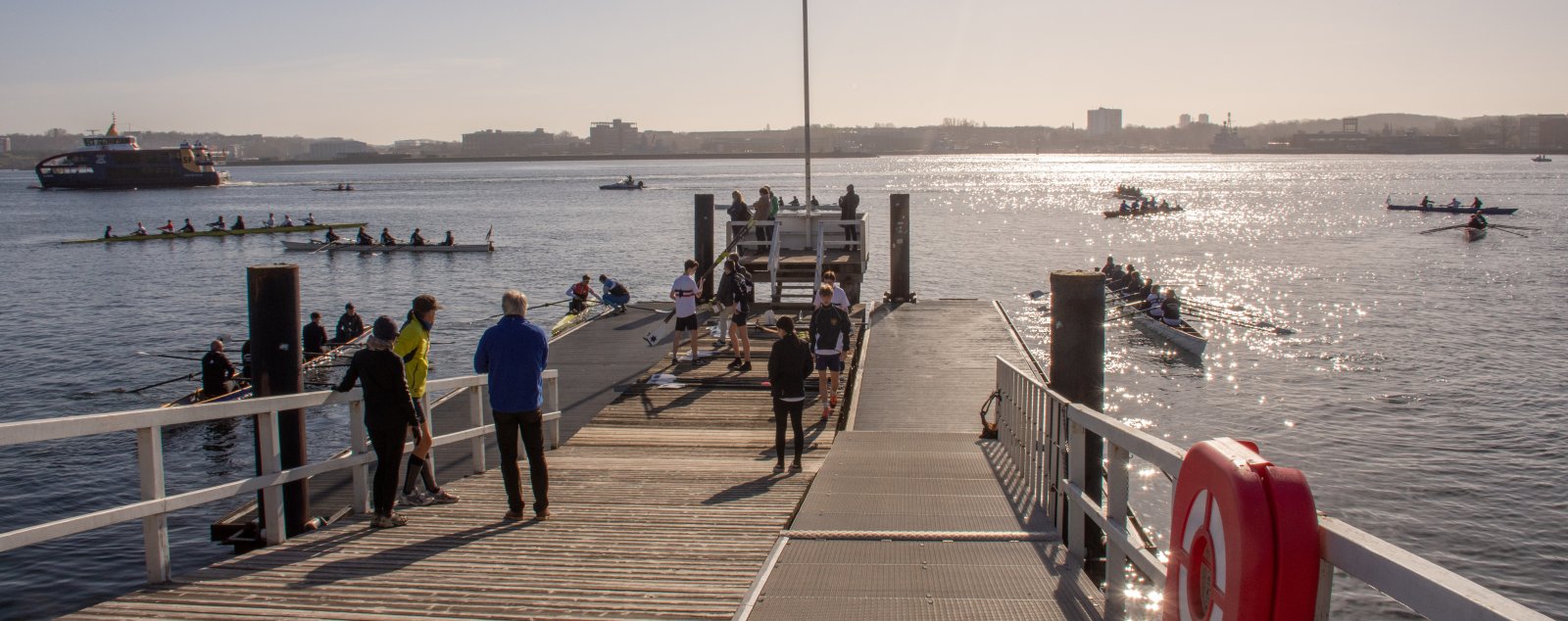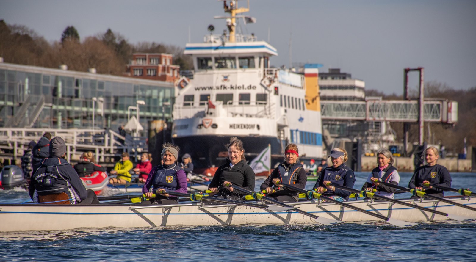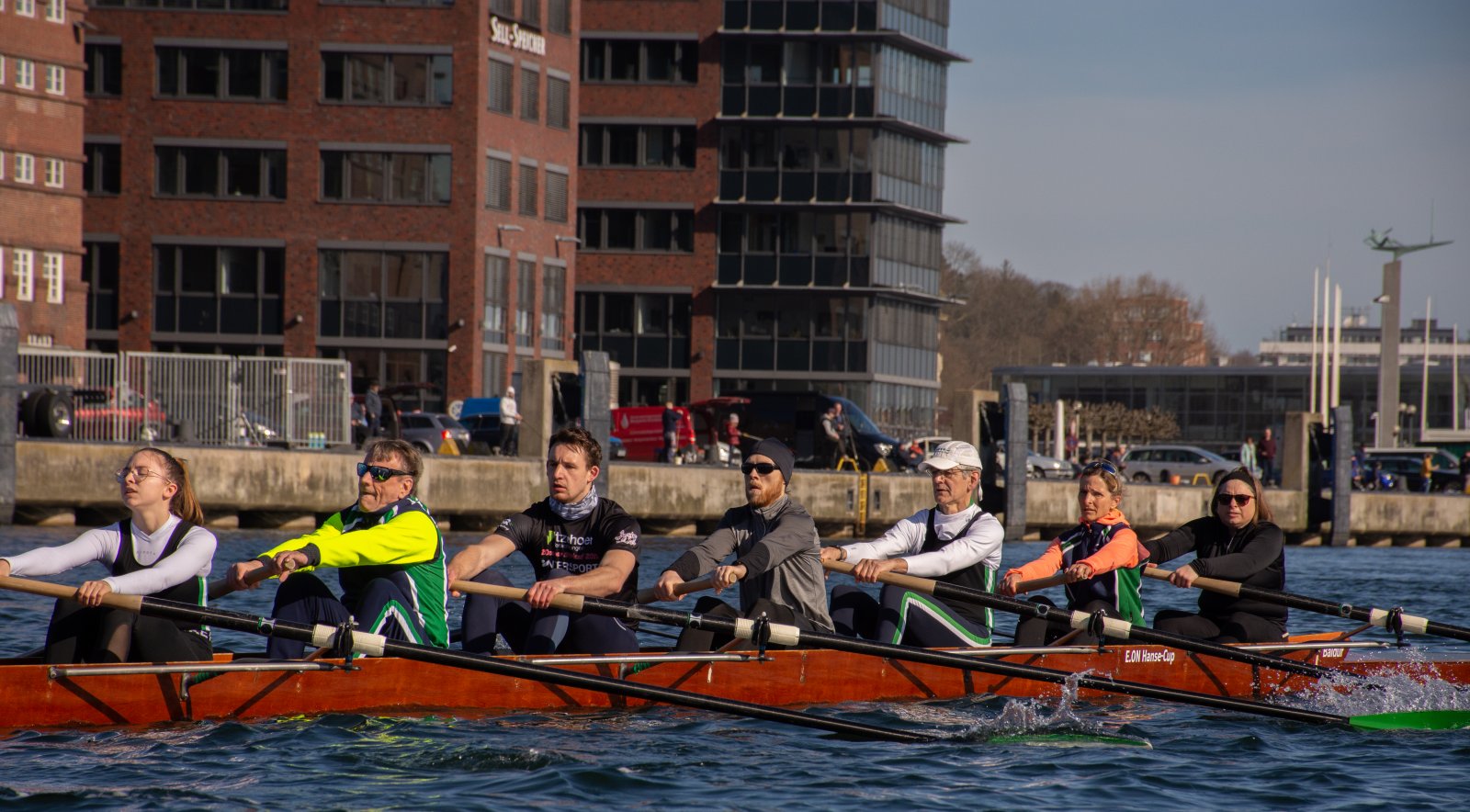 …und so ist zum diesjährigen Anrudern einmal wieder Hochbetrieb in der Hörn! Hochbetrieb auf allen Stegen, 35-40 Boote aller Rudervereine strömen Richtung Innenförde, um dort die neue Saison zu begrüßen – endlich einmal wieder wie in alten Zeiten! Sonniges, mildes Frühlingswetter tut das seine und so herrscht entspannte, freudige Stimmung in allen Booten.