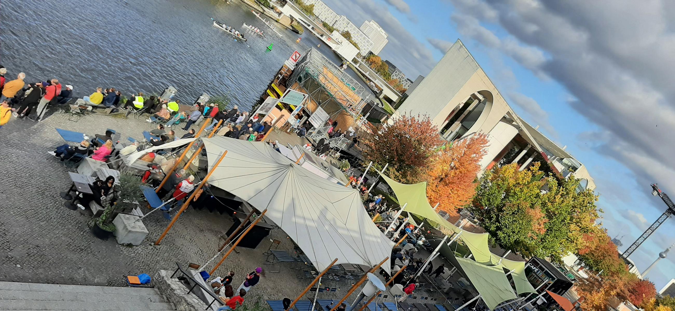 Wir sind noch eine ganze Weile auf dem Wasser, da die provisorischen Steganlagen bei Quer durch Berlin gerade zwei Achter gleichzeitig anlegen lassen. Das dauert. Es ist schönes Wetter, so dass sich die Wartezeit nicht zu lang anfühlt. Irgendwann sind wir dran. Meine Ruderkameraden versuchen (wenn auch unabsichtlich) mich noch beim Boot raus nehmen in die Spree zu schubsen. Der Behelfssteg ist wirklich recht schmal. Aber wir bleiben dann doch alle trocken.