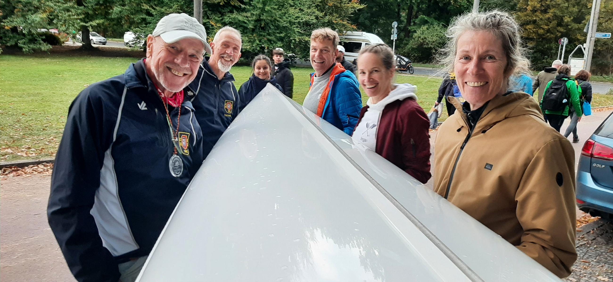 Weiter geht es mit einem Bier!!! Dann abriggern. Teile zum Hänger bringen, schon mal verladen was geht. Die Location im Zielbereich direkt an der „Schwangeren Auster“ ist echt schön und das Wetter spielt mit. Manche von uns fahren noch zum Duschen ins Hostel, da es heute noch nach Kiel zurück geht. Die anderen schauen die Zielankünfte der anderen EKRC Boote, helfen beim Ausheben und Tragen, schnacken, genießen die Stimmung. Zu Siegerehrung sind wir alle wieder da und ausgelassen.