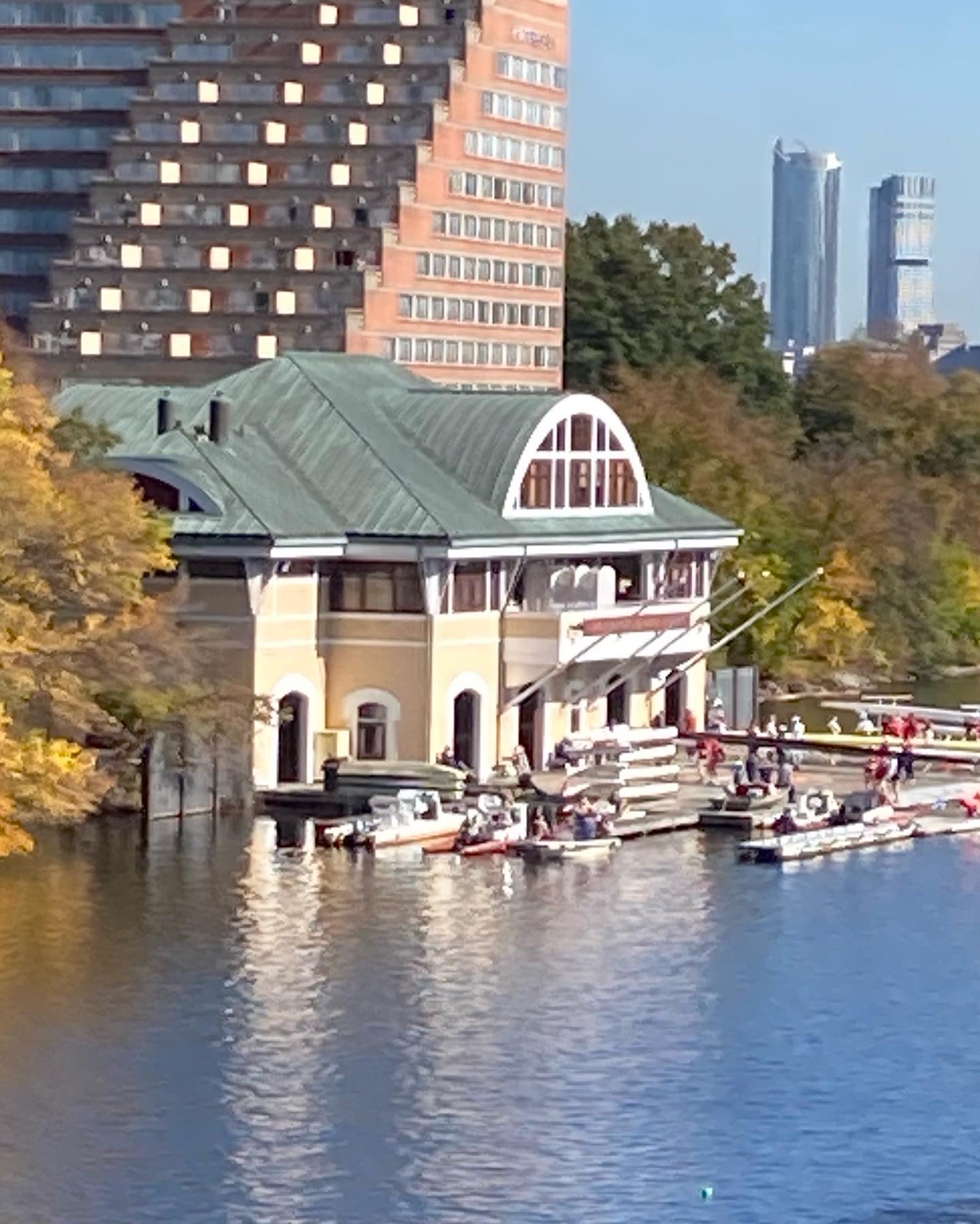 Nach dem berühmten und immer schön anzusehenden Charles River Boat House ging es durch die Elliot Bridge mit ihrer sehr berüchtigten Kurve, in der schon manche Mannschaften strauchelten. Danach dann nur Augen zu und Endspurt. Erschöpft und eigentlich zufrieden trieben wie am wunderschönen Henderson Boathouse der Northwestern University vorbei (auch mal „eben so“ gespendet) zum Wendepunkt. Danach mühevoll und im Entenmarsch mit anderen zurückkehrenden und zum Start fahrenden Mannschaften zu unserem Boathouse zurück. Eine Zeitlang ruderten wir nur mit halber Mannschaft, denn es durfte wegen der Enge des Flusses nicht überholt werden –
