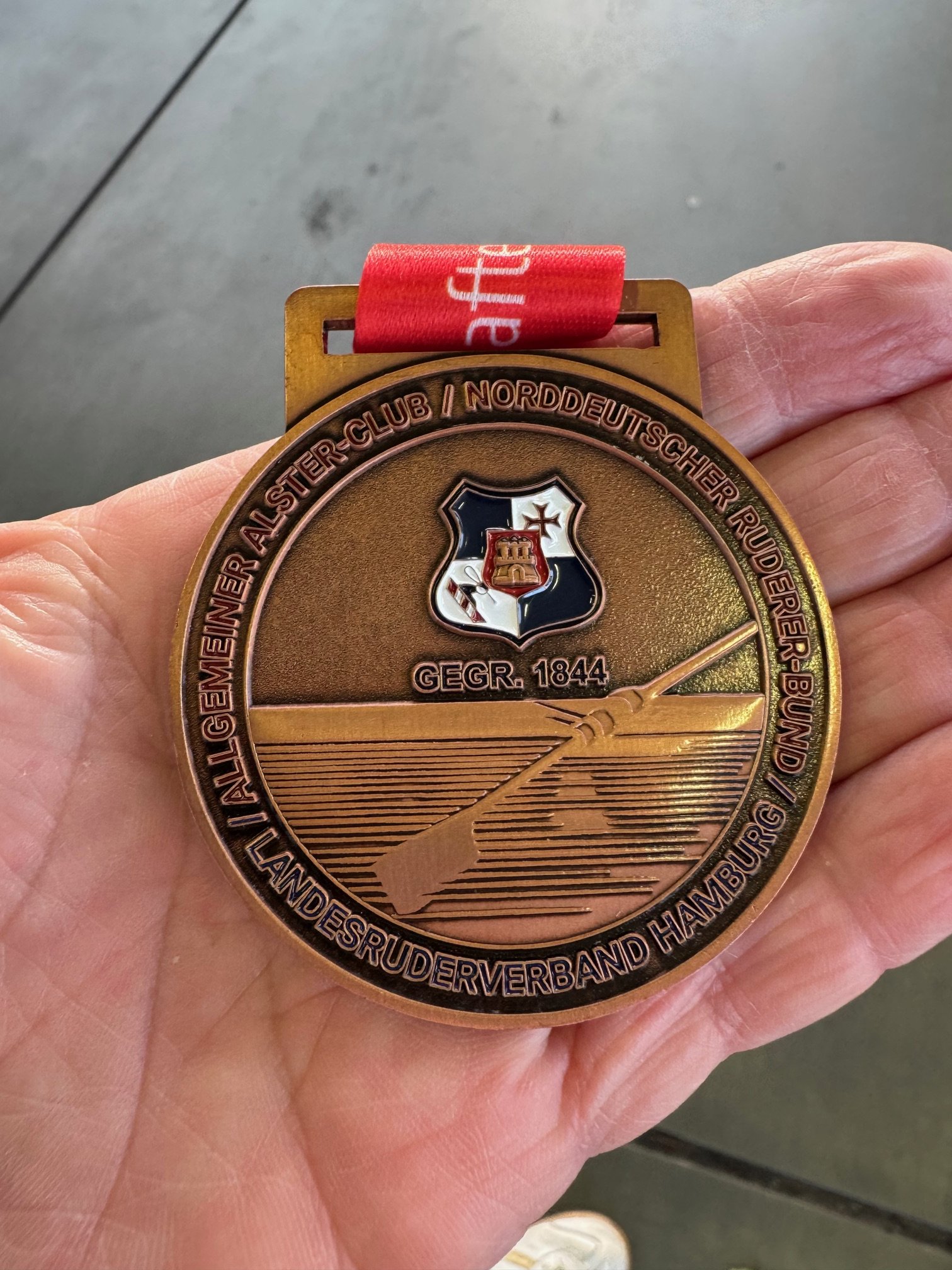 Die Boote sind ausgerichtet und los geht es. Der Start ist nicht optimal, aber wir liegen mit vorne. Schnell zeichnet sich ab, daß Hansa raus ist und die Allemania führt. Dazwischen die Fari, DHuGRC und wir. Unsere Renntaktik, dort Nadelstiche zu setzen, wo die anderen leichte Pausen machen, verfängt. Trotzdem liegen wir bei 500 Metern erst knapp auf Platz 4. Doch langsam, Schlag um Schlag kommen wir auf die anderen beiden Boote auf. Unser Spurt bei 750 Metern gibt uns das notwendige Momentum und bei 140 Metern vor dem Ziel erreichen wir Platz 3, den wir bis zum Ziel verteidigen. Allemania gewinnt. Danach kommen die Fari, wir und DHuGRC innerhalb von einer Sekunde ins Ziel. Wir haben die zweitschnellste Zeit auf den letzten 500 Metern. Unsere Taktik, dort das Rennen in unsere Richtung zu entscheiden, ist also aufgegangen. Wir haben Bronze gewonnen und an Silber geschnuppert. Nächstes Jahr mehr?