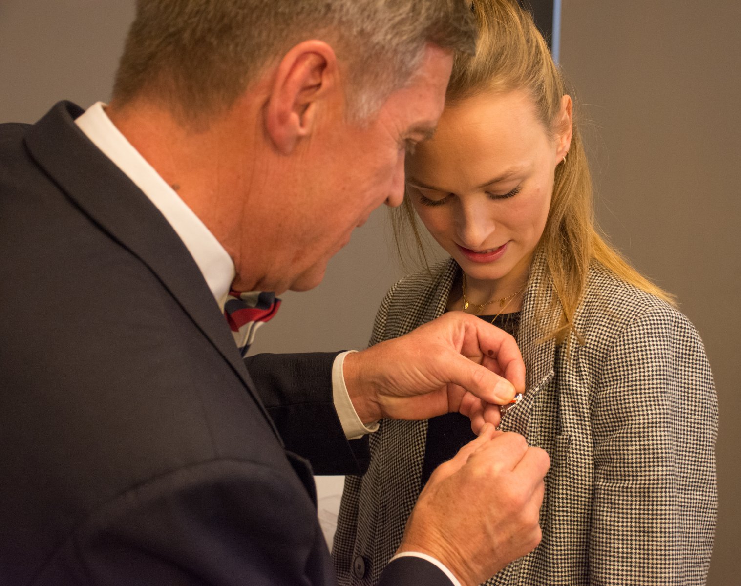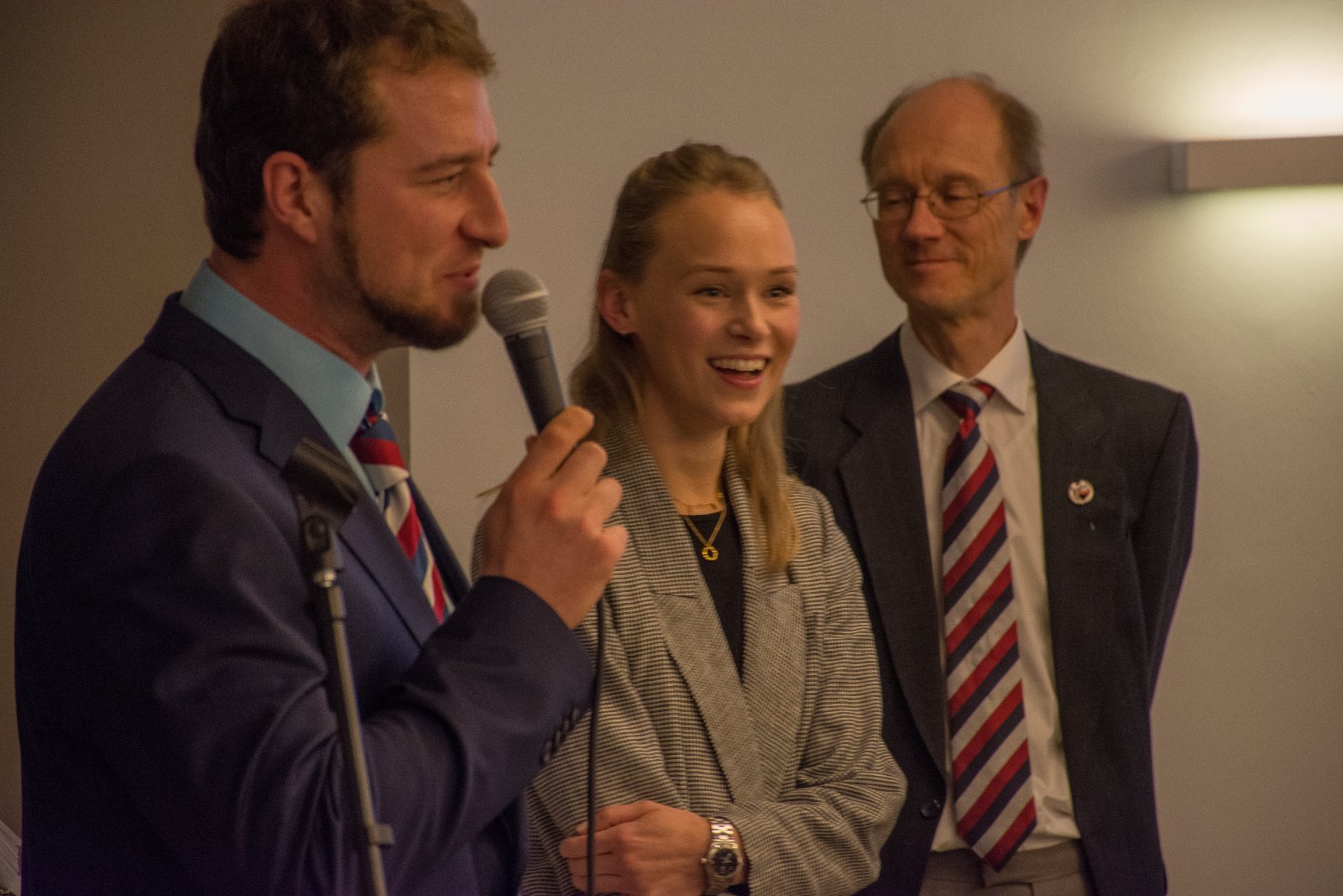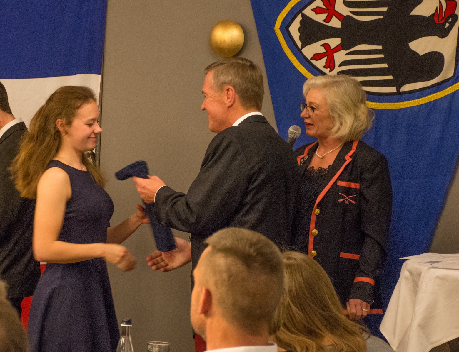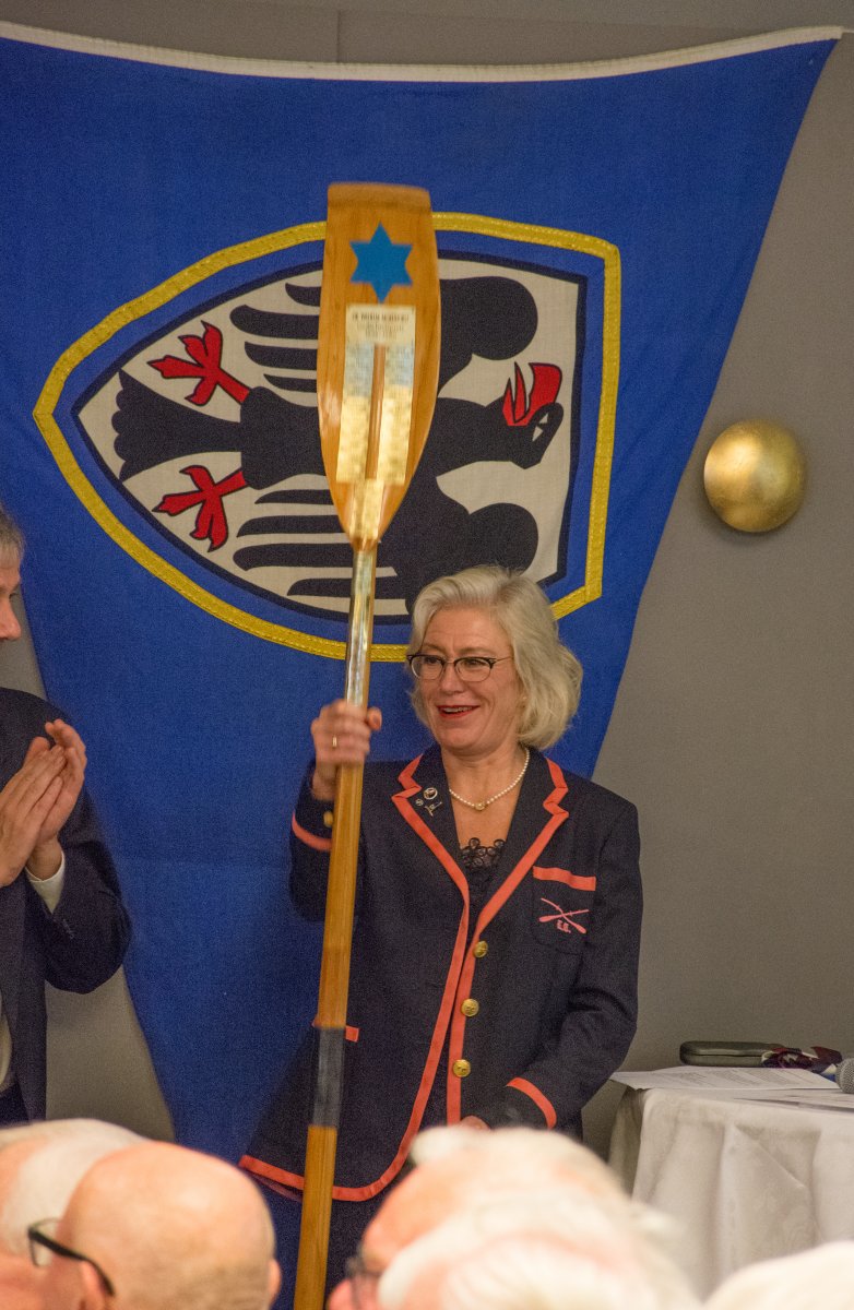 Auch erfahren wir, dass eine erfolgreiche Strategie der mentalen Regattavorbereitung darin bestehen kann, drei Stunden vor dem entscheidenden Rennen den Trainer loszuschicken, eine bestimmte Handtasche zu kaufen – Rona Schulz. Rona ist es dann auch, der Bernd neben der traditionellen Ehrennadel etwas ganz Besonderes überreichen kann: Eine Ausgabe der EKRC Clubmitteilungen von Januar 1993 mit einer Geburtsanzeige von Rona, zufällig genau 25 Jahre zurück. Wohl kaum jemand im EKRC wird sich sein Eintrittsdatum so einfach merken können, wie Rona!