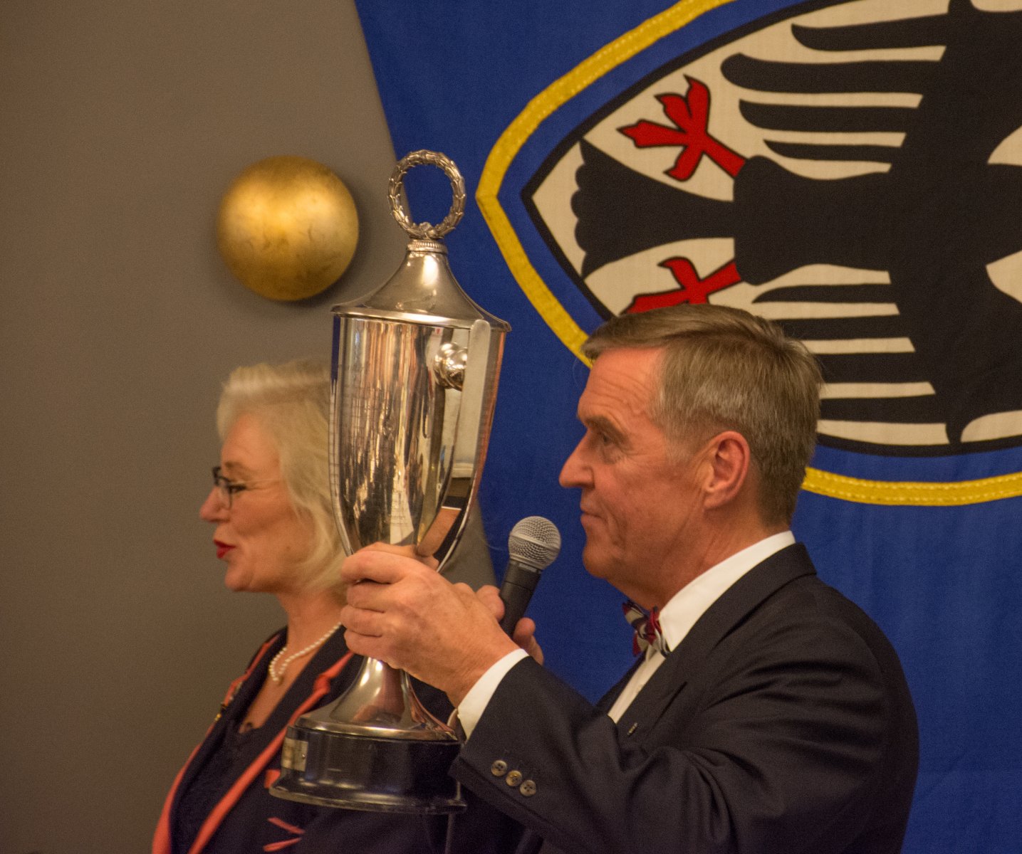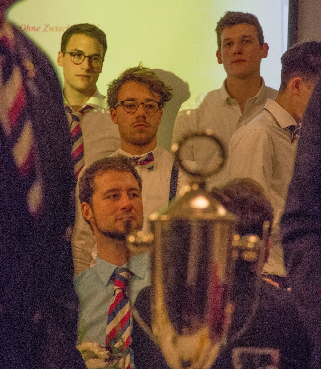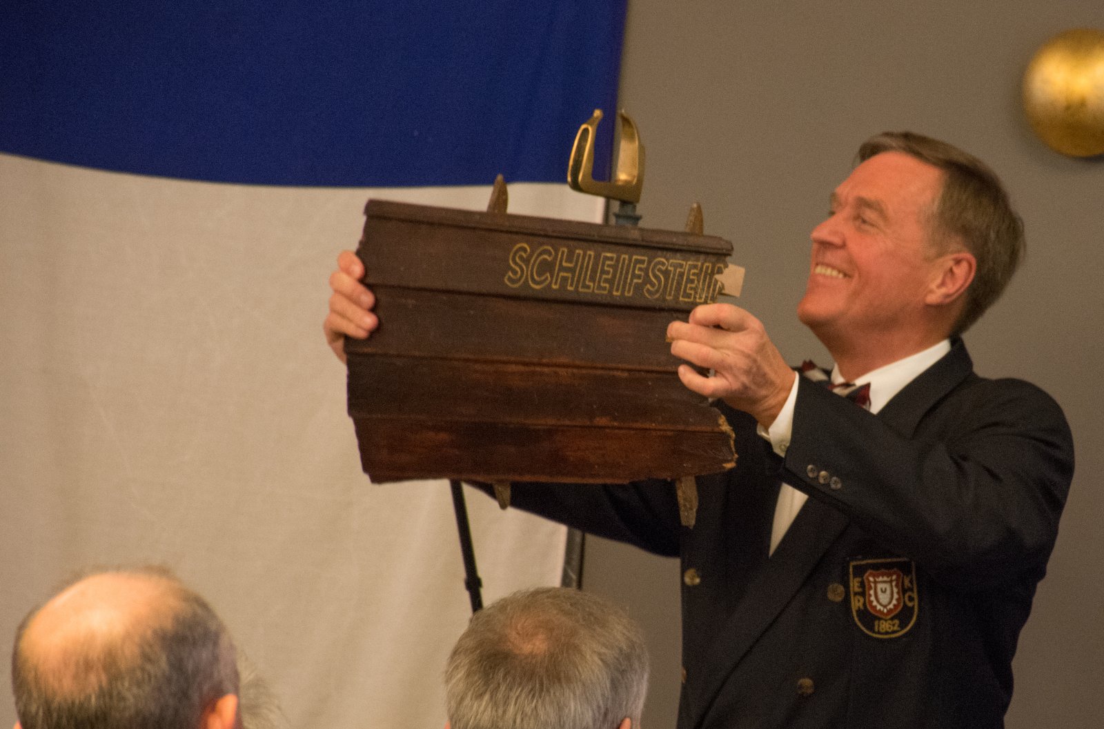 Und dann kommen die Sieger! Den Anfang macht Simon Kempf als Dritter bei den Deutschen Jugendmeisterschaften und zugleich Gewinner des Werner Droege Gedächtnispreises sowie als Sieger des EKRC-Clubeiners. Und als Motivation für die Jugend stiftet Grommeck auch in diesem Jahr wieder die Füllung des zugehörigen Pokales – »Aber an beiden Henkeln anfassen – wir mussten letztes Jahr mit viel Mühe einen wieder anbringen lassen!« ermahnt Bernd den neuen Gewinner. Und mehr als eine Füllung verschwindet im Laufe des Abends im Bauch des Gefäßes und anschließen in den Kehlen der Jugend.