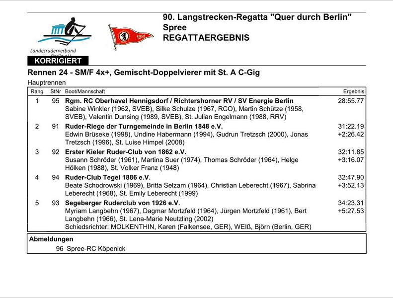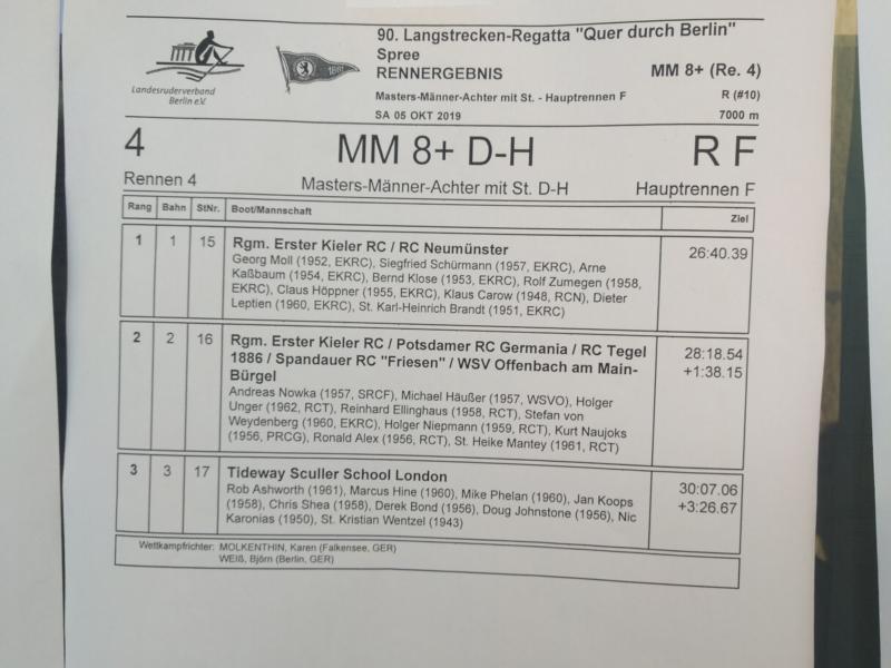Dieser erste Platz war mittlerweile der vierte Sieg eines Kieler Masters-Männerachters bei „Quer durch Berlin“, zweimal als Renngemeinschaft und zweimal als reiner Vereinsachter. Darüber freuen wir uns natürlich sehr.