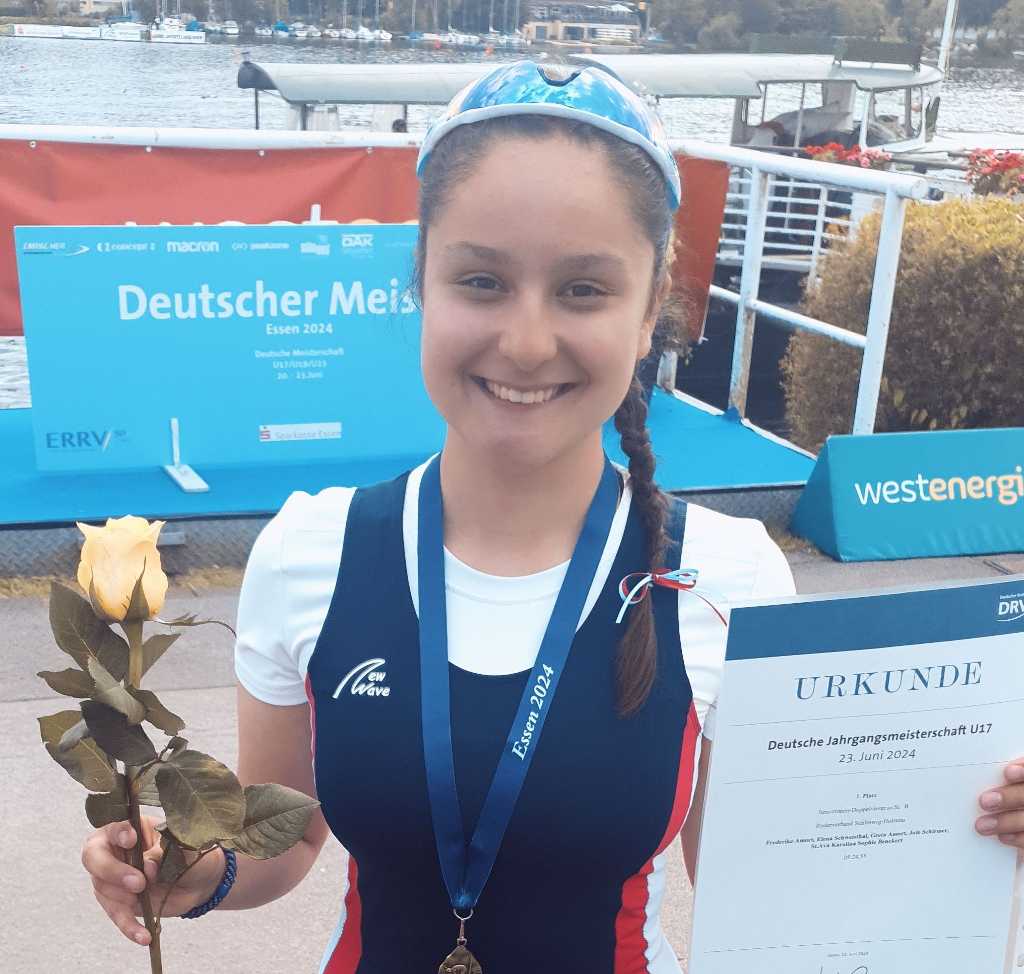 Eine weitere Goldmedaille gab es für Steuerfrau Ava Benckert, die das Auswahlboot der Landes-Ruder-Verbandes Schleswig-Holstein zu einem klaren Start-Ziel Sieg steuerte.