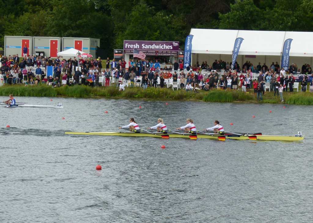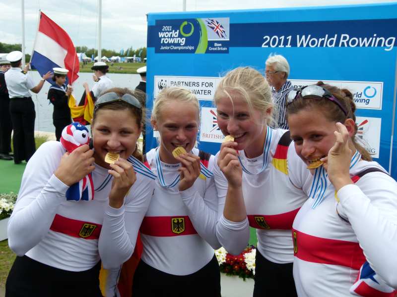 Von Hauke Hinz. Eton am 6. August 2011 um 16 Uhr. Der Deutsche Juniorinnen-Doppelvierer mit Rona Schulz vom EKRC, Anne Marie Kroll (Ratzeburg), Franziska Kreutzer und Shirin Brockmann (beide aus Potsdam) hat an der Startanlage angelegt. Nach dem Sieg im Halbfinale hat das Boot die Bahn 4 und startet damit direkt neben Roumänien, dem siegreichen Boot des anderen Halbfinals. Beide Boote trennen im Zeitvergleich nur 0,6 Sekunden.