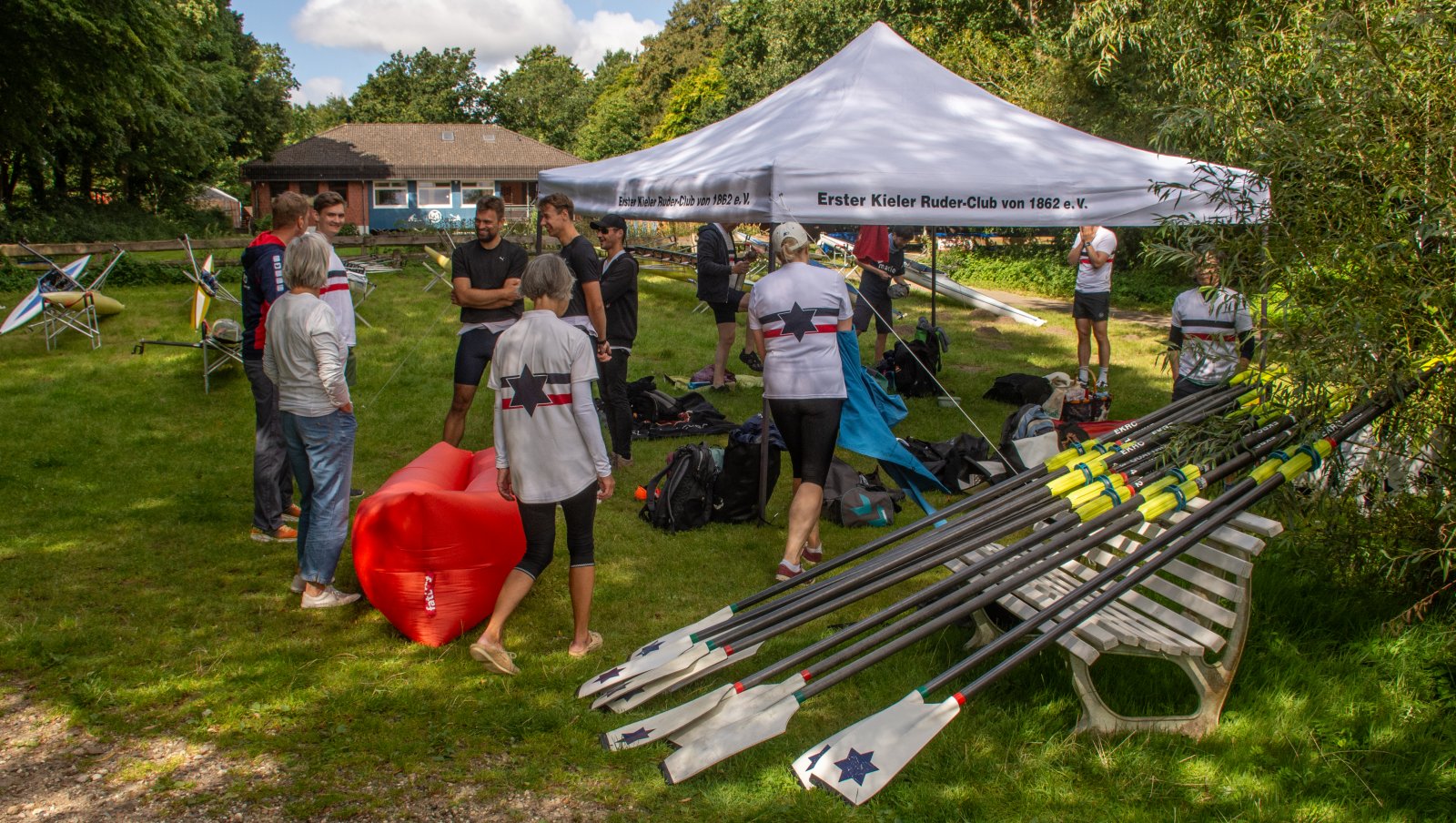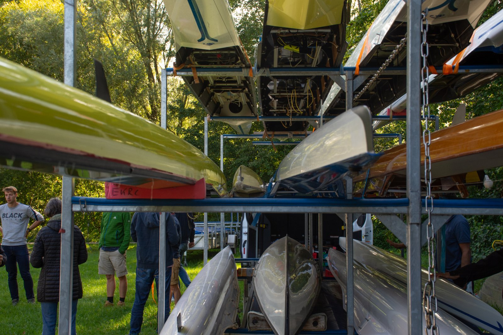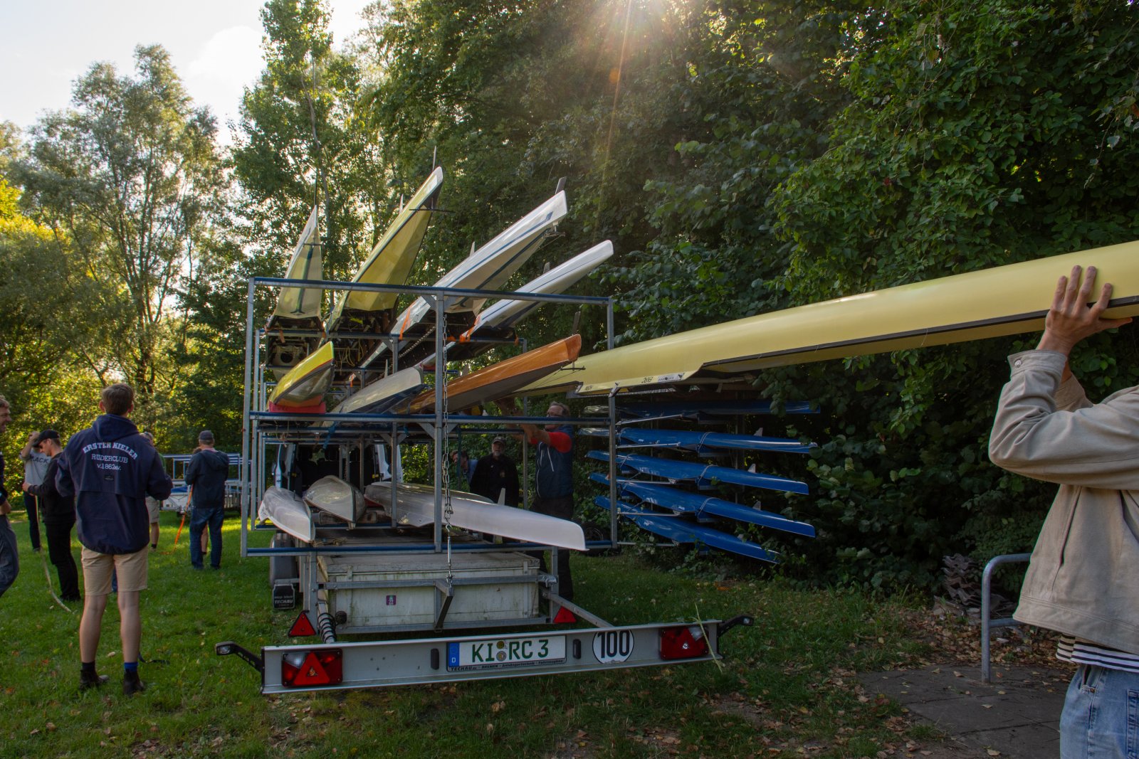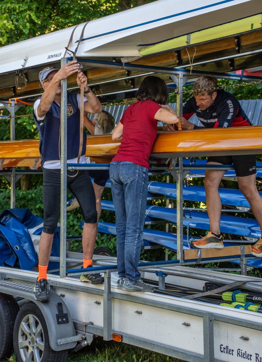 Der Ausflug nach Preetz beginnt eigentlich bereits am Vortag: Am Freitagabend werden Boote und Skulls (und Riemen), ein paar Böcke und ein Pavillon auf den Bootshänger geladen, damit es am Sonnabend gleich losgehen kann; die abmontierten Rollsitze und Ausleger müssen natürlich auch mit, alles ordentlich beschriftet. Am Ende warten 14 Boote, vom Einer bis zum Vierer, eng verschachtelt auf ihren Einsatz in Preetz – ein neuer Laderekord!