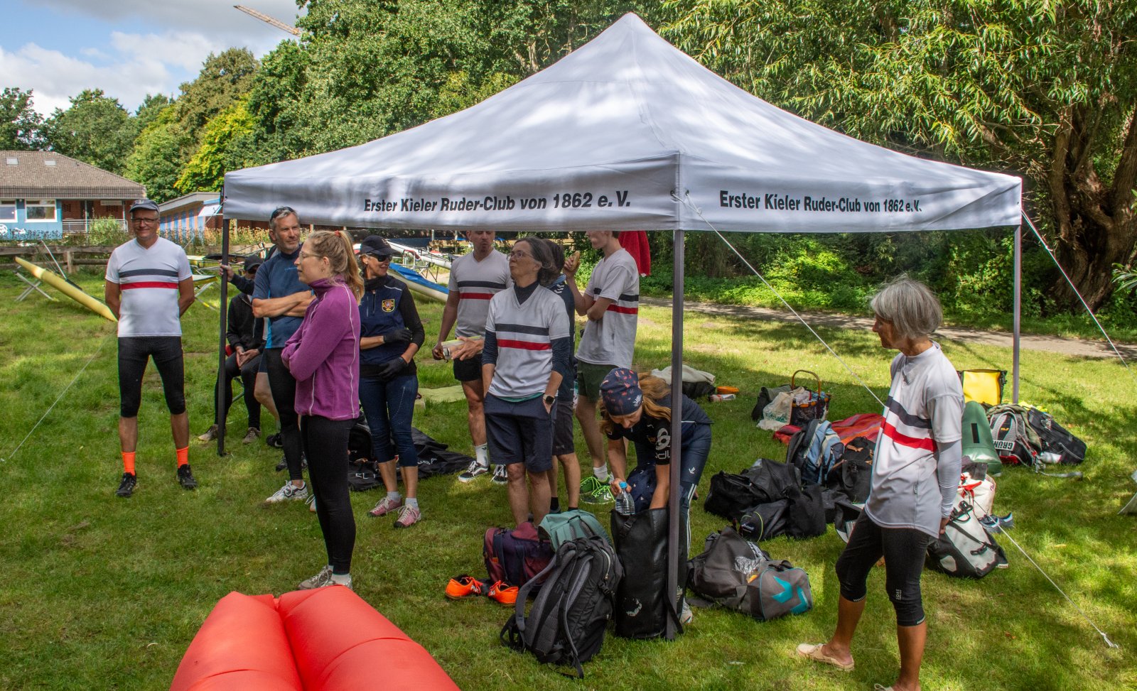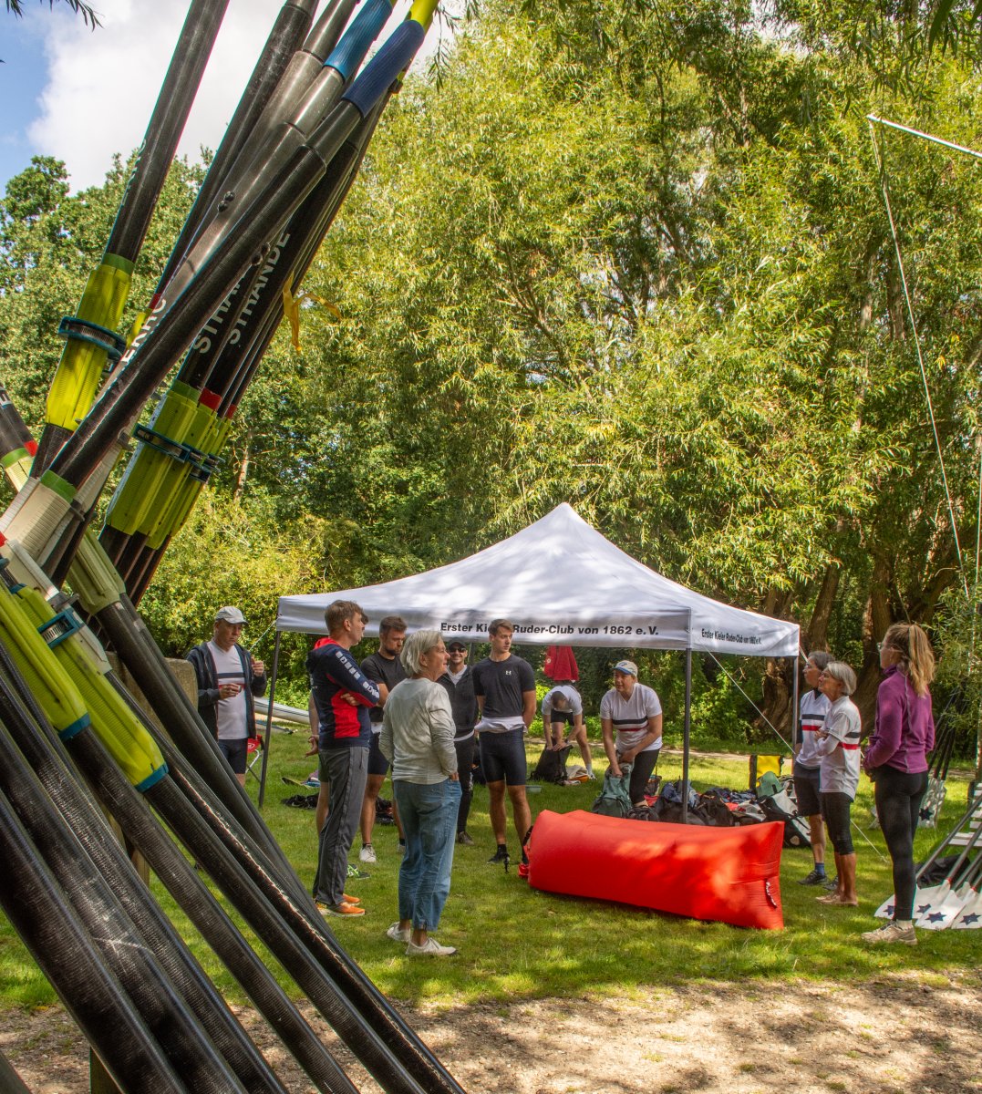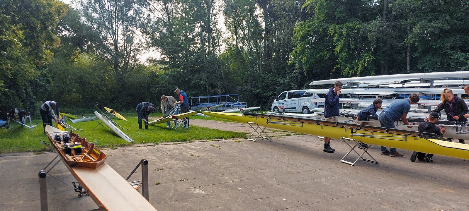 Der Ausflug nach Preetz beginnt eigentlich bereits am Vortag: Am Freitagabend werden Boote und Skulls (und Riemen), ein paar Böcke und ein Pavillon auf den Bootshänger geladen, damit es am Sonnabend gleich losgehen kann; die abmontierten Rollsitze und Ausleger müssen natürlich auch mit, alles ordentlich beschriftet. Am Ende warten 14 Boote, vom Einer bis zum Vierer, eng verschachtelt auf ihren Einsatz in Preetz – ein neuer Laderekord!