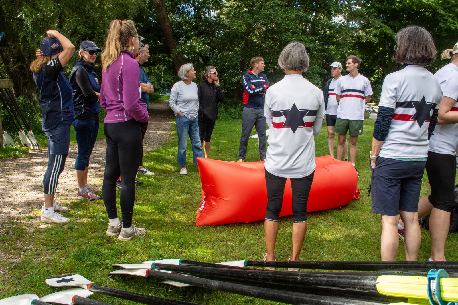 Nachdem alle Boote und Skulls/Riemen wieder ordentlich aufgeräumt sind, gibt’s noch Fritten und ein kühles Getränk, dazu gemütlicher Plausch, während es dämmert.