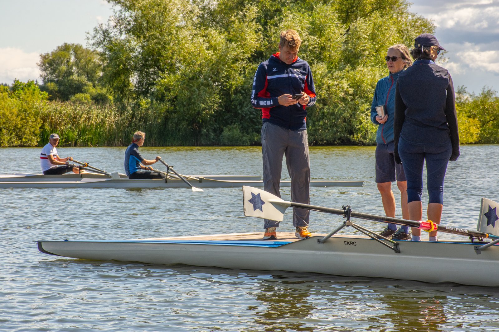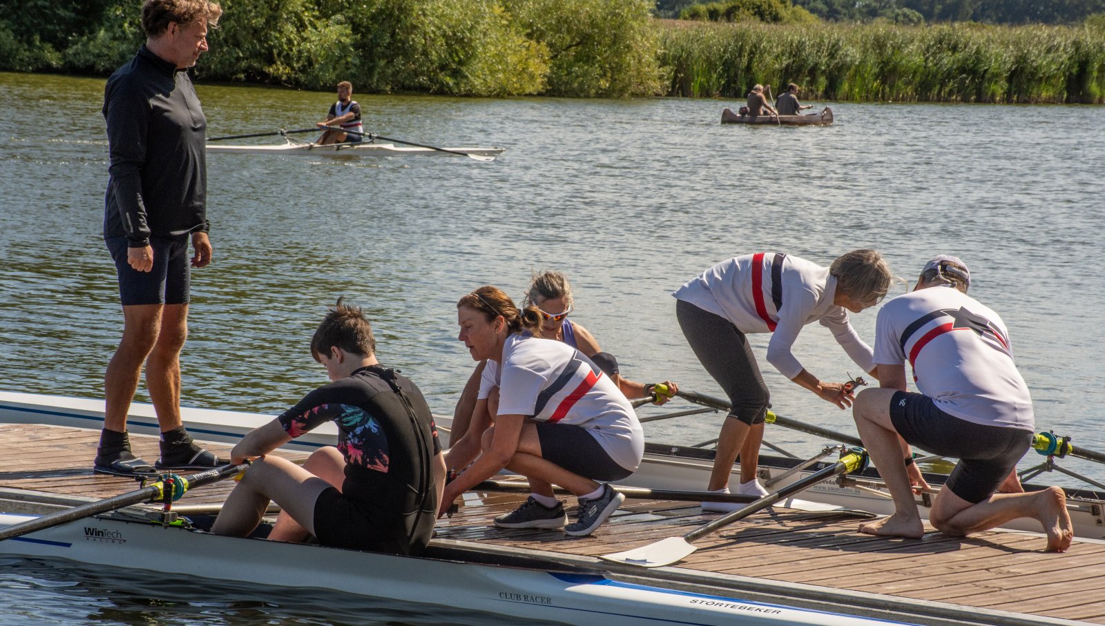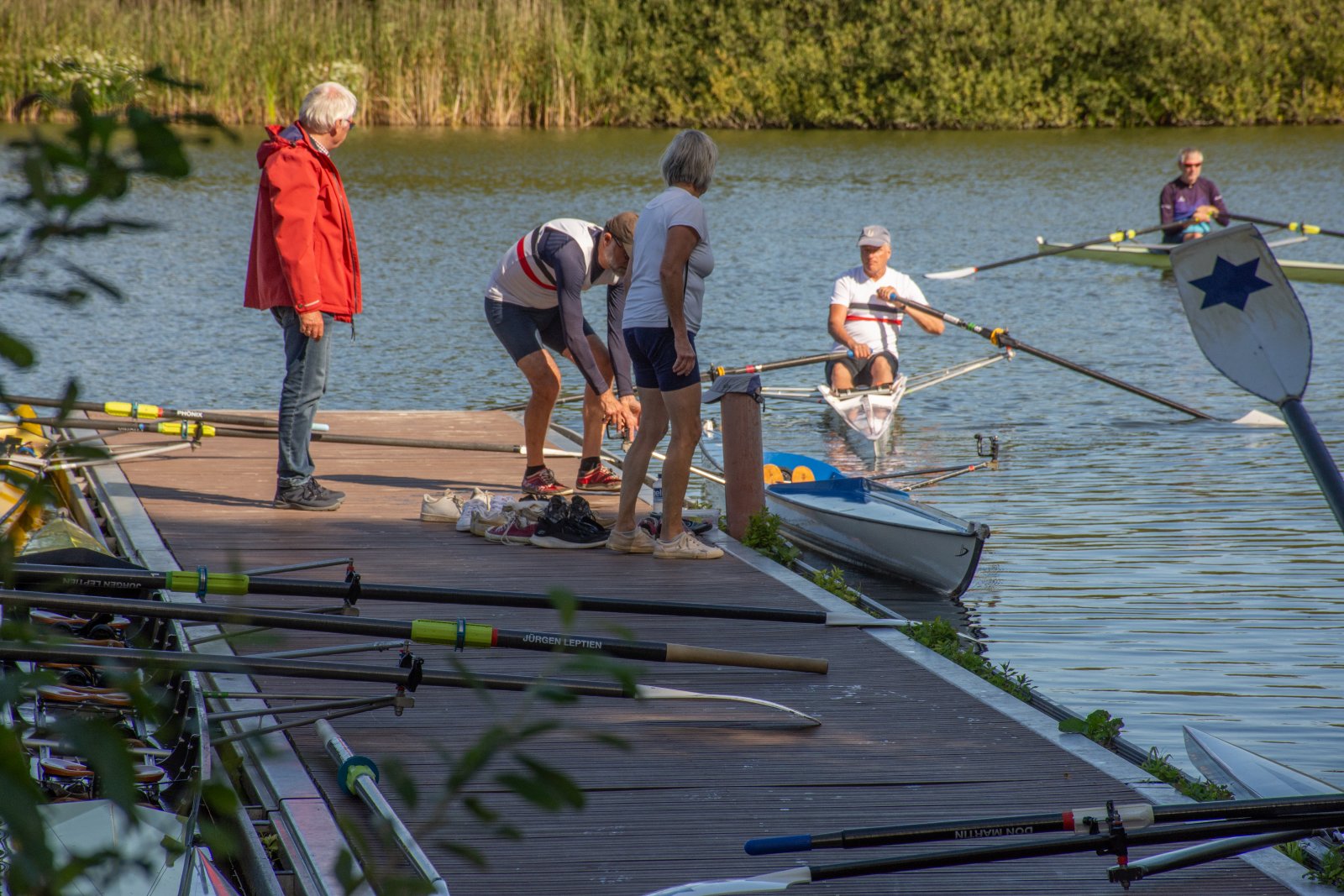 Ab und an frischt der Wind etwas auf und erschwert so manches Anlegemanöver, aber die Sonne scheint, und wer gerade nicht rudert, macht es sich auf dem sonnigen Steg gemütlich und beobachtet und kommentiert (fachkundig!) das rege Treiben auf dem Wasser. Dazu gibt es mitgebrachte Brote, Kekse und sogar Kaffee und Kuchen.