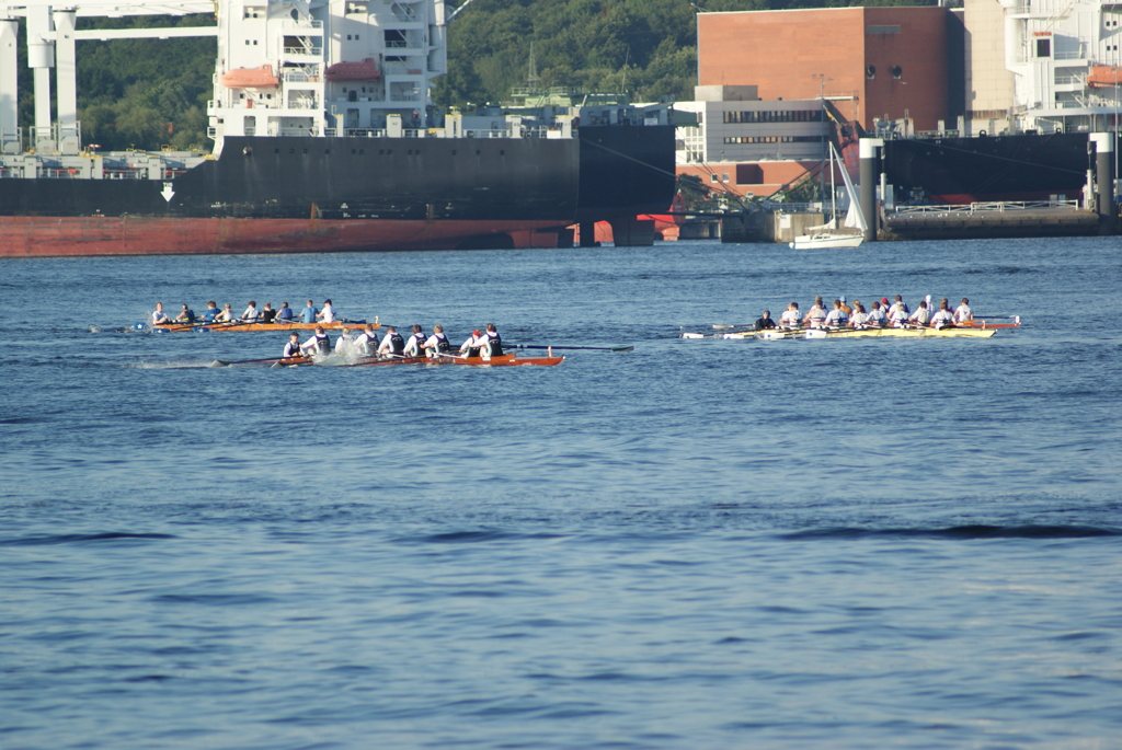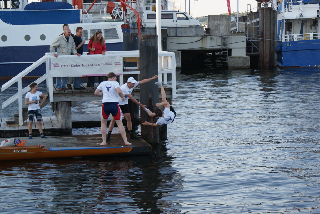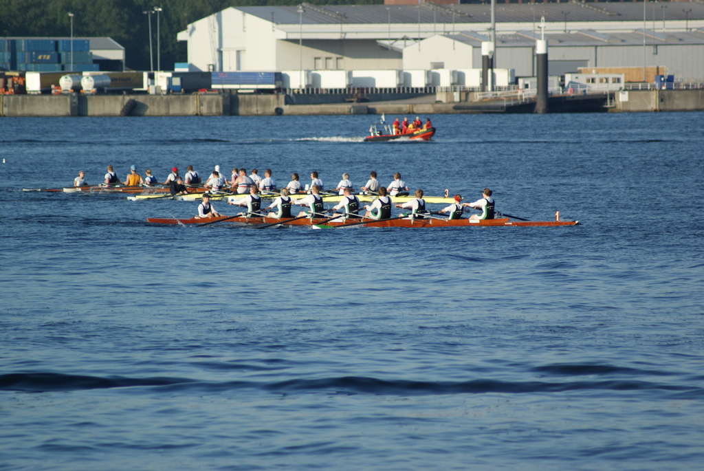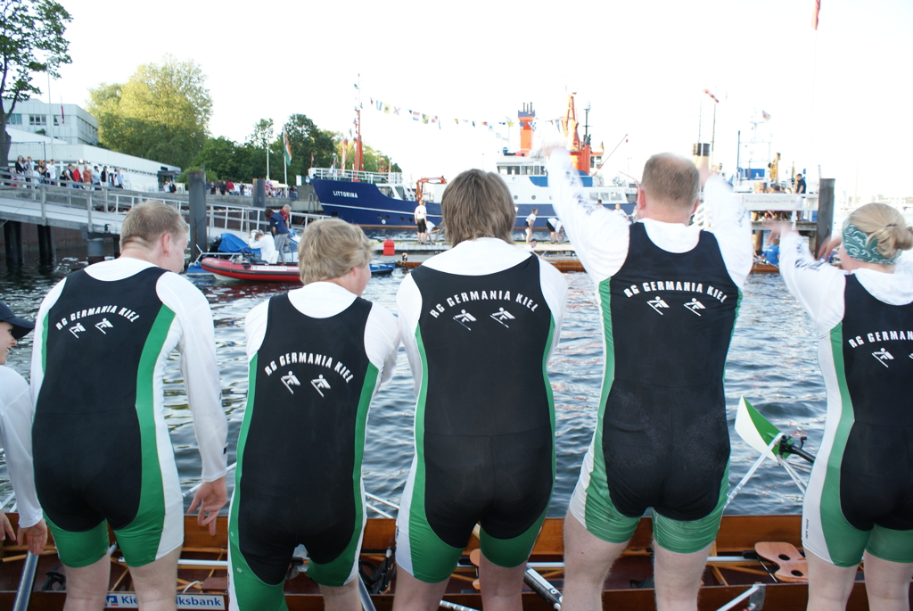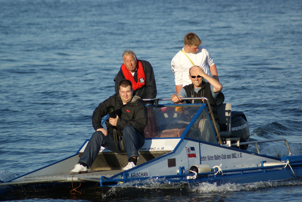 Unabhängig davon, dass Germania gut war (besser als wir gehofft hatten) und den Sieg verdient hat, bleibt zu erwähnen, dass wir und der ARV nach 300 m mit einer Riesenwelle des roten Monsters (Fahrradfähre) zu kämpfen hatte, die Germania auf der Innenbahn jedoch verschohnte. Christina fing einen kapitalen Krebs wobei die 5. Strebe abbrach. Das ging alles so schnell, dass wir auf Schlag (natürlich sehr konzentriert was ungewöhnlich für uns beide ist) das überhaupt nicht mitbekamen – scheinbar auch nicht das Presseboot.
