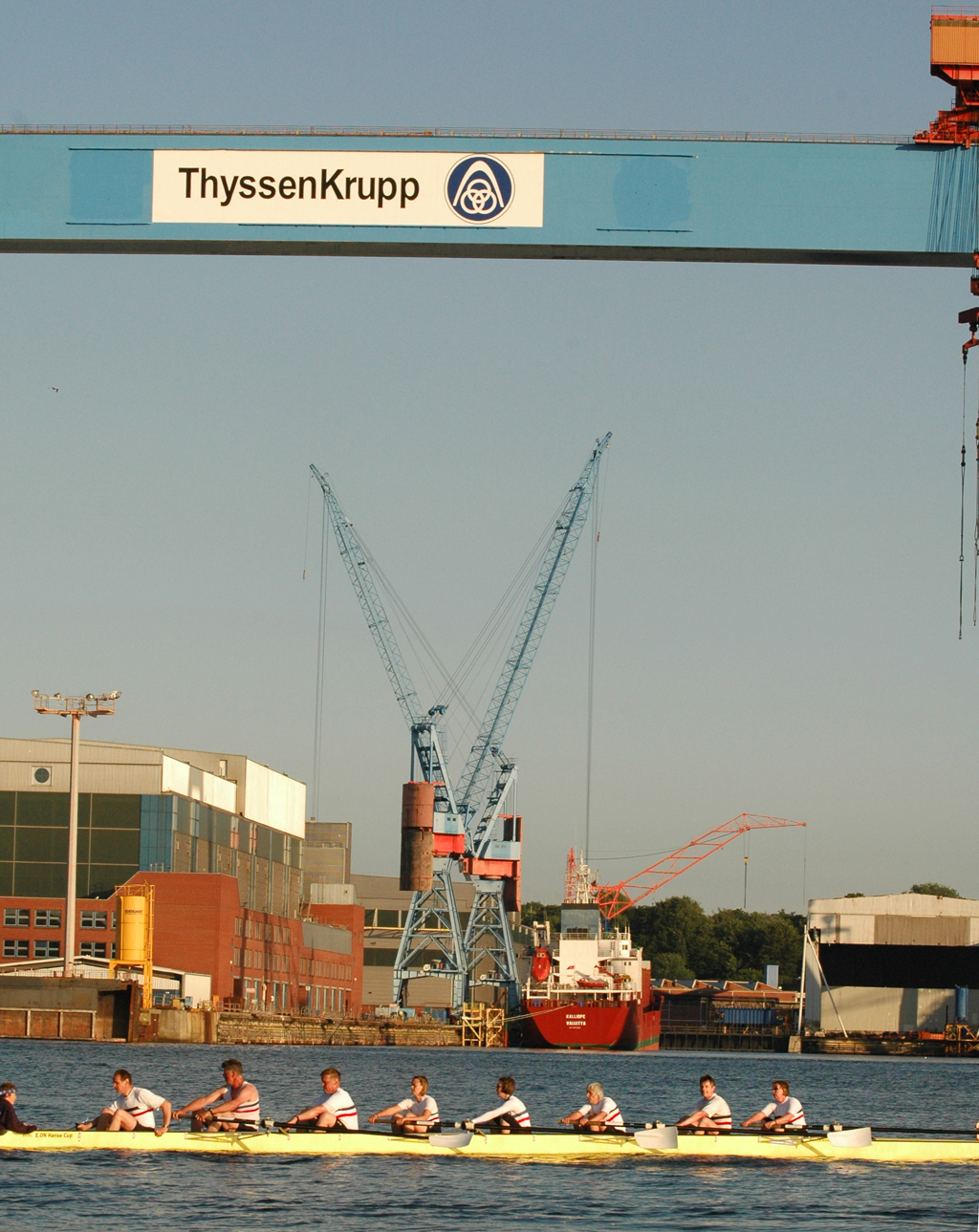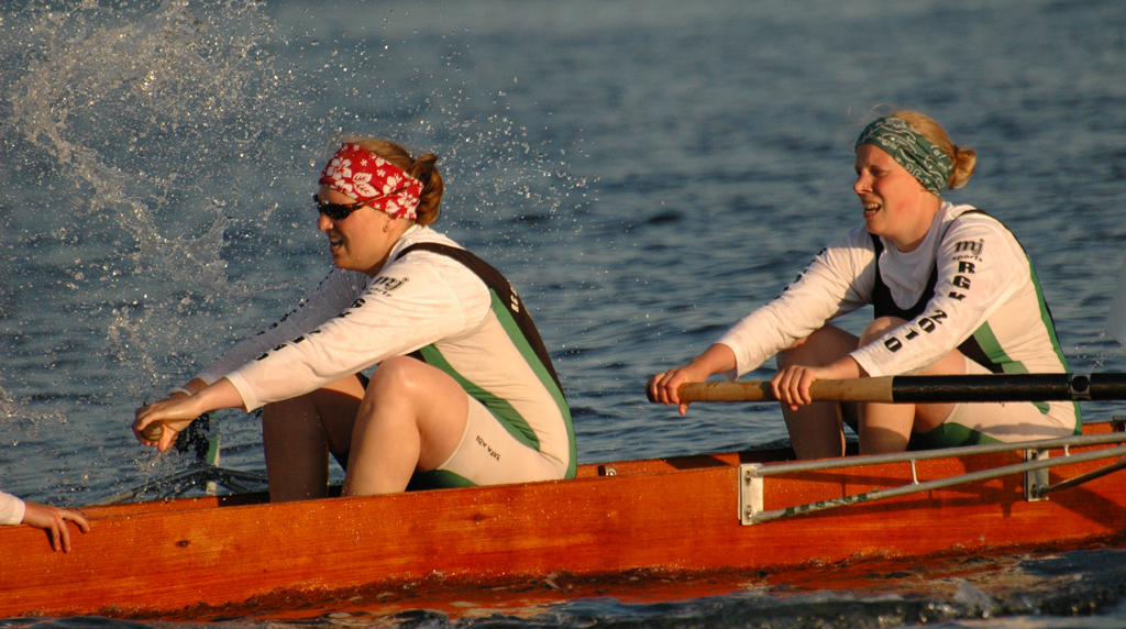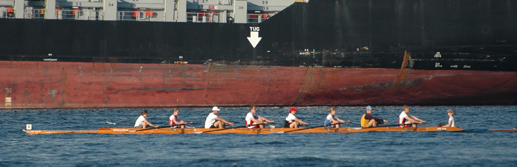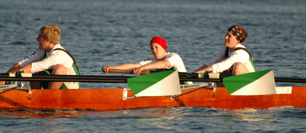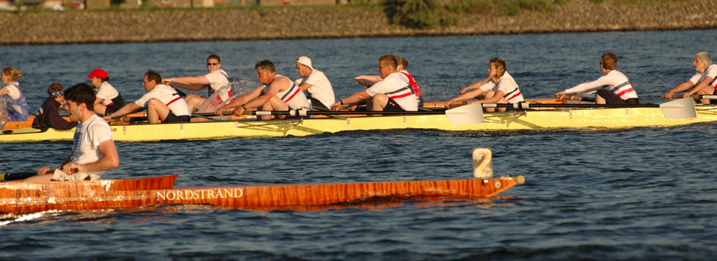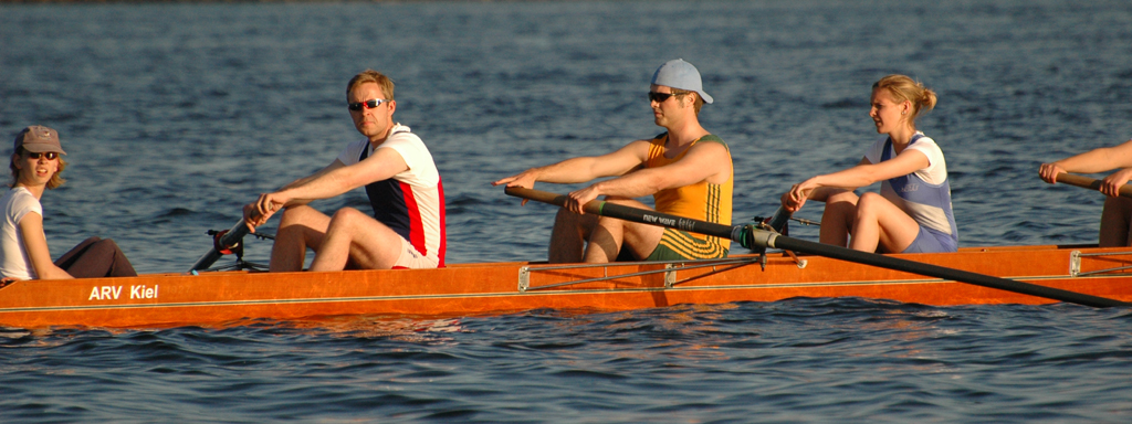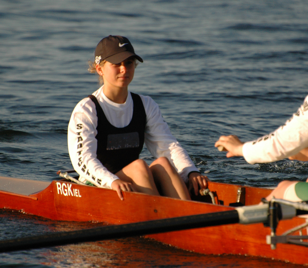 Unabhängig davon, dass Germania gut war (besser als wir gehofft hatten) und den Sieg verdient hat, bleibt zu erwähnen, dass wir und der ARV nach 300 m mit einer Riesenwelle des roten Monsters (Fahrradfähre) zu kämpfen hatte, die Germania auf der Innenbahn jedoch verschohnte. Christina fing einen kapitalen Krebs wobei die 5. Strebe abbrach. Das ging alles so schnell, dass wir auf Schlag (natürlich sehr konzentriert was ungewöhnlich für uns beide ist) das überhaupt nicht mitbekamen – scheinbar auch nicht das Presseboot.