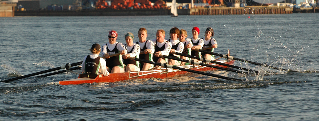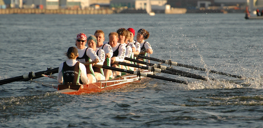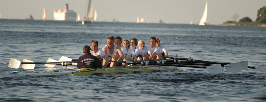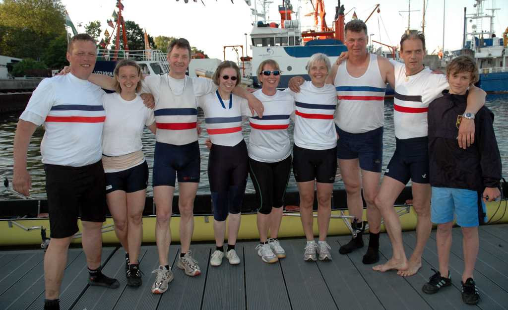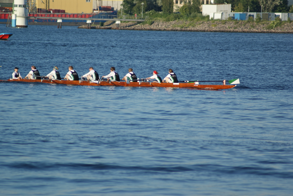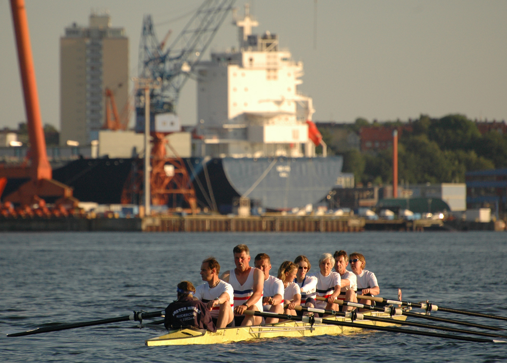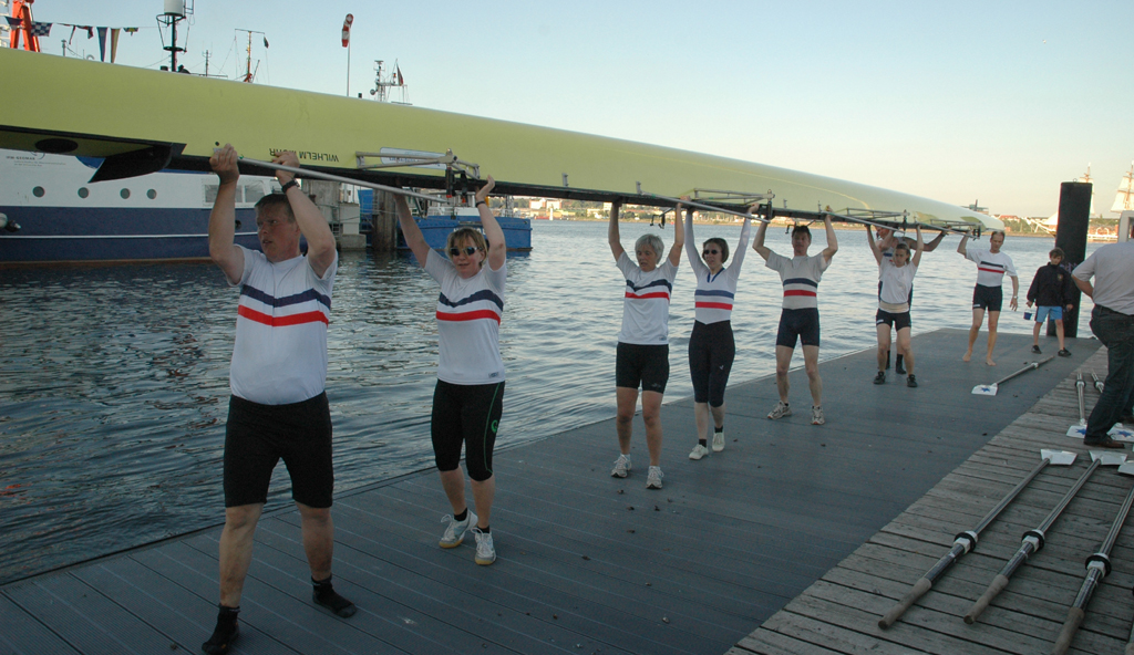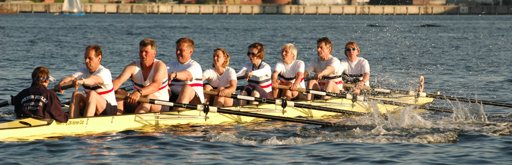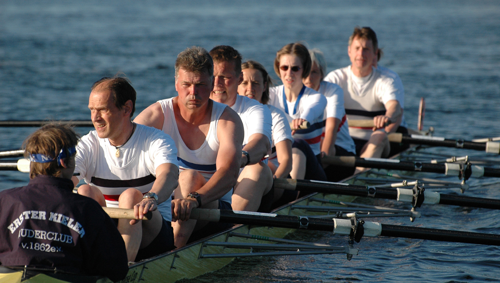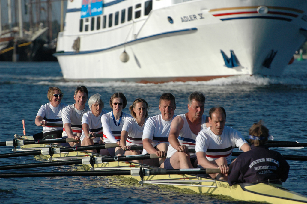 Ganz anders die Mannschaft des EKRC-Achters um die Obfrau Christina Dunsing mit Leon Schulz an den Steuerseilen und seinem Vater Harald »Grommek« Schulz auf Schlag. Mit dabei noch Martin Lorenzen, Bernhard Kaczenski (kurzfristig für den erkrankten Justus Tolk eingespriungen), Siegfried Schürmann, Ulrike Zumegen, Dorit von Weydenberg und Maja Darmstadt. Mehrmals wurde trainiert, die Taktik häufig besprochen und auch an der Motivation hat es nicht gelegen.