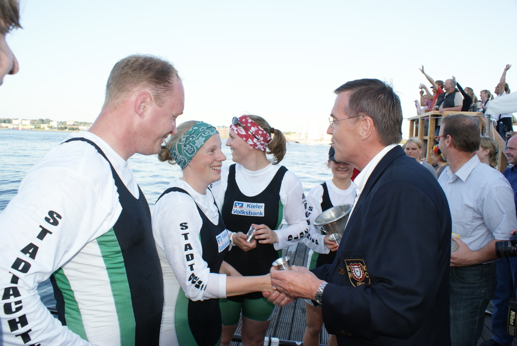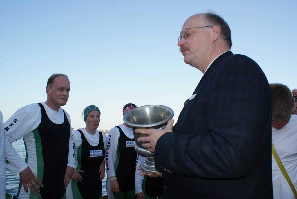 Der Ratsherr der Landeshauptstadt Kiel Stephan Ehmke übernahm wieder gern die Siegerehrung. Der EKRC-Vorsitzende Bernd Klose überreichte die kleinen Zinn-Becher.