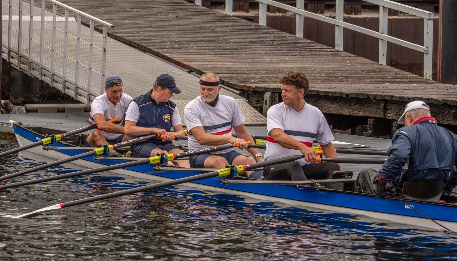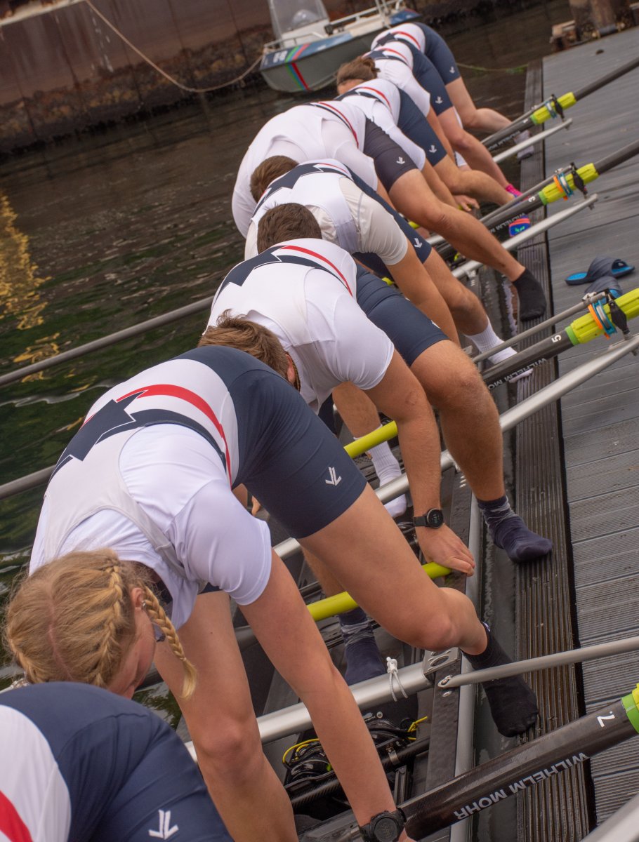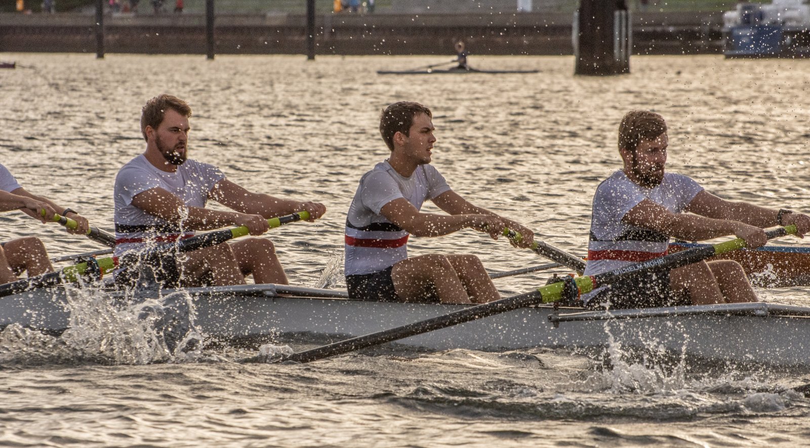 Gleich nach dem Start eine Schrecksekunde. Ein Motorboot kreuzt die Regattabahn. Anstatt aber schnell das Weite zu suchen, verfällt der Bootsführer angesichts der auf ihn zueilenden Achter in Schockstarre und blockiert die Regattabahn. Der Steuermann des ARV beschließt, nach Backbord auszuweichen. Damit kommt er Felix bedrohlich nahe. Der behält als erfahrener Steuermann die Nerven: „Ich musste etwas nach Backbord korrigieren und hatte gehofft, der ARV weicht nach Steuerbord aus. Die sind jedoch auch nach BB ausgewichen und etwas in die Riemen reingefahren. Ich wollte denen aber nicht zu viel Raum geben und bin auf meiner Spur geblieben. Meine Steuerborder haben die Riemenkollisionen gut gemeistert.“ Als Außenstehender Beobachter sehe ich schon Protest, Abbruch und Neustart vor meinem geistigen Auge vorüberziehen, bis unser Boot in der zweiten Hälfte des Rennens schließlich so weit davonzieht, dass sich der Knoten von alleine auflöst.