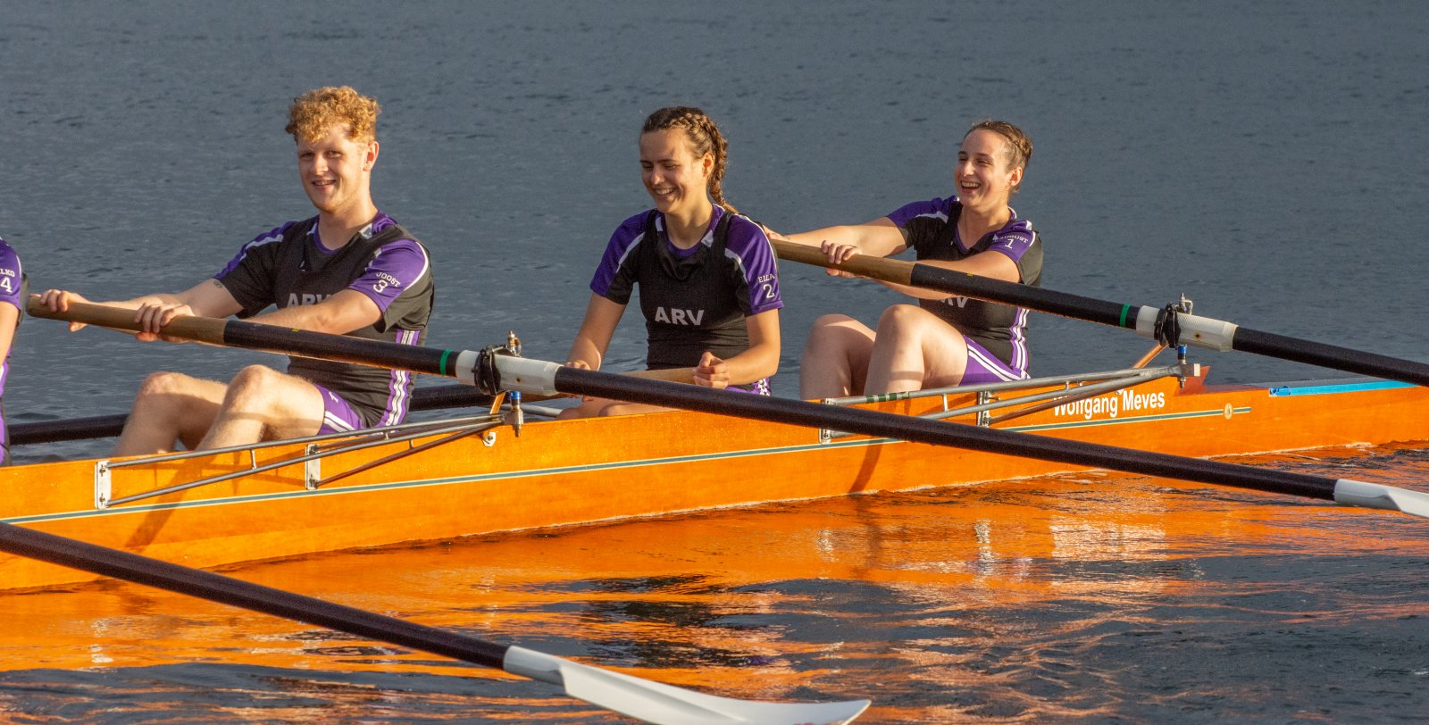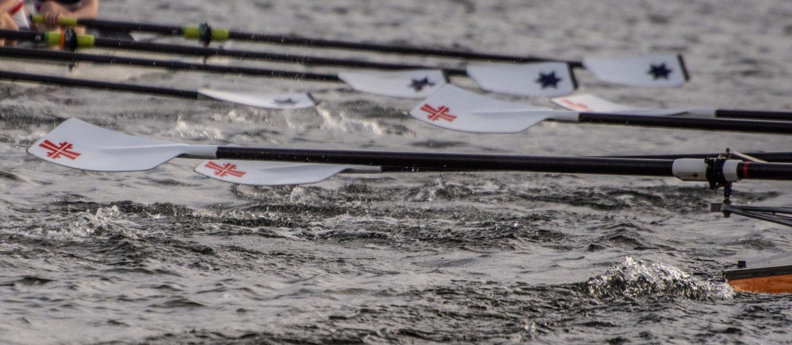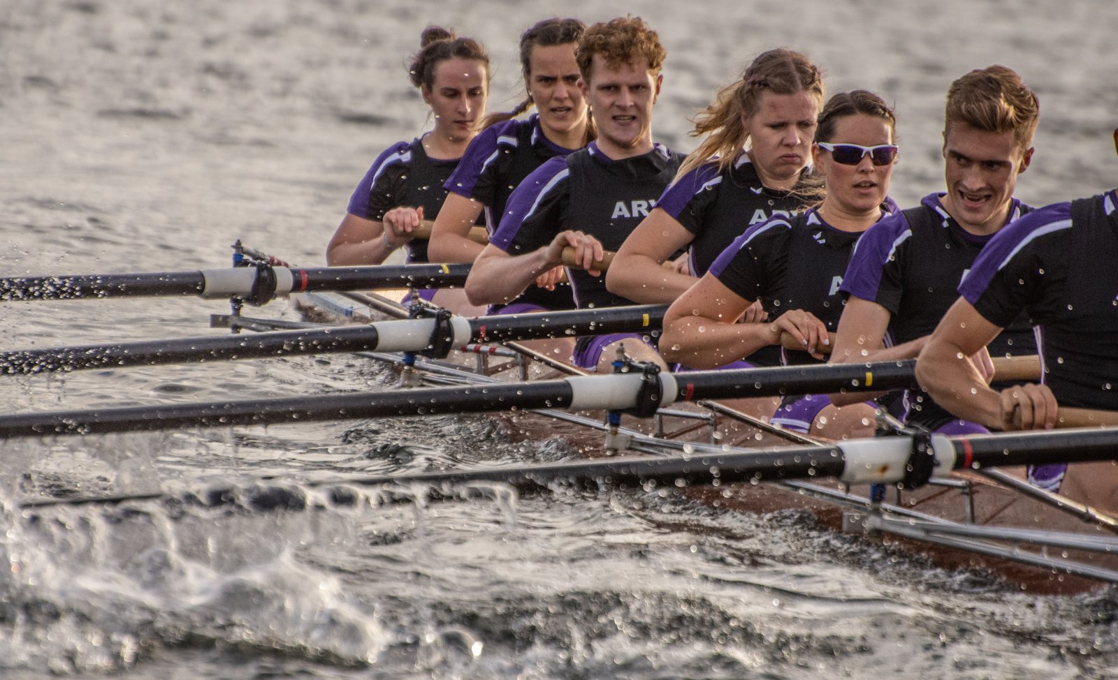 Gleich nach dem Start eine Schrecksekunde. Ein Motorboot kreuzt die Regattabahn. Anstatt aber schnell das Weite zu suchen, verfällt der Bootsführer angesichts der auf ihn zueilenden Achter in Schockstarre und blockiert die Regattabahn. Der Steuermann des ARV beschließt, nach Backbord auszuweichen. Damit kommt er Felix bedrohlich nahe. Der behält als erfahrener Steuermann die Nerven: „Ich musste etwas nach Backbord korrigieren und hatte gehofft, der ARV weicht nach Steuerbord aus. Die sind jedoch auch nach BB ausgewichen und etwas in die Riemen reingefahren. Ich wollte denen aber nicht zu viel Raum geben und bin auf meiner Spur geblieben. Meine Steuerborder haben die Riemenkollisionen gut gemeistert.“ Als Außenstehender Beobachter sehe ich schon Protest, Abbruch und Neustart vor meinem geistigen Auge vorüberziehen, bis unser Boot in der zweiten Hälfte des Rennens schließlich so weit davonzieht, dass sich der Knoten von alleine auflöst.